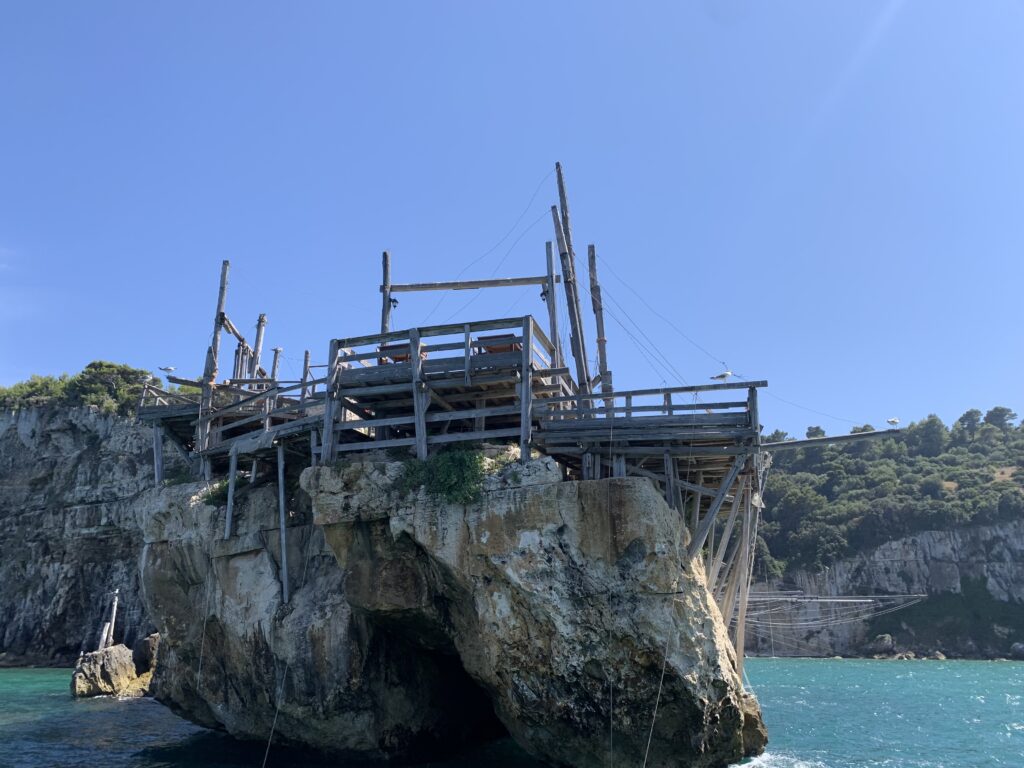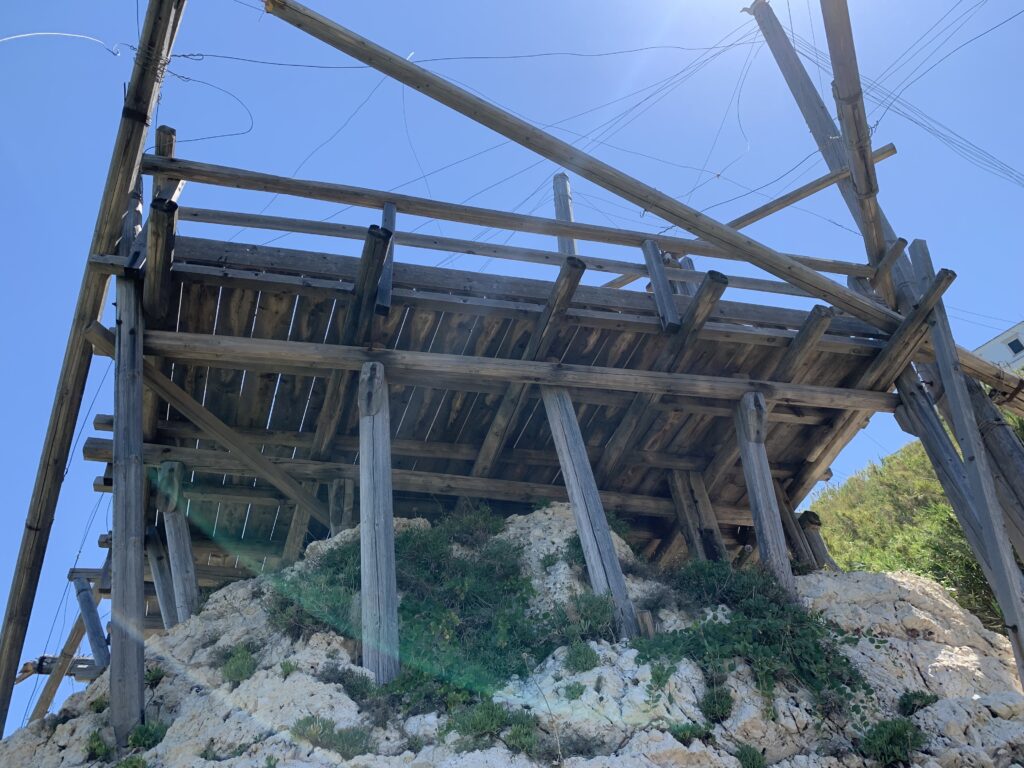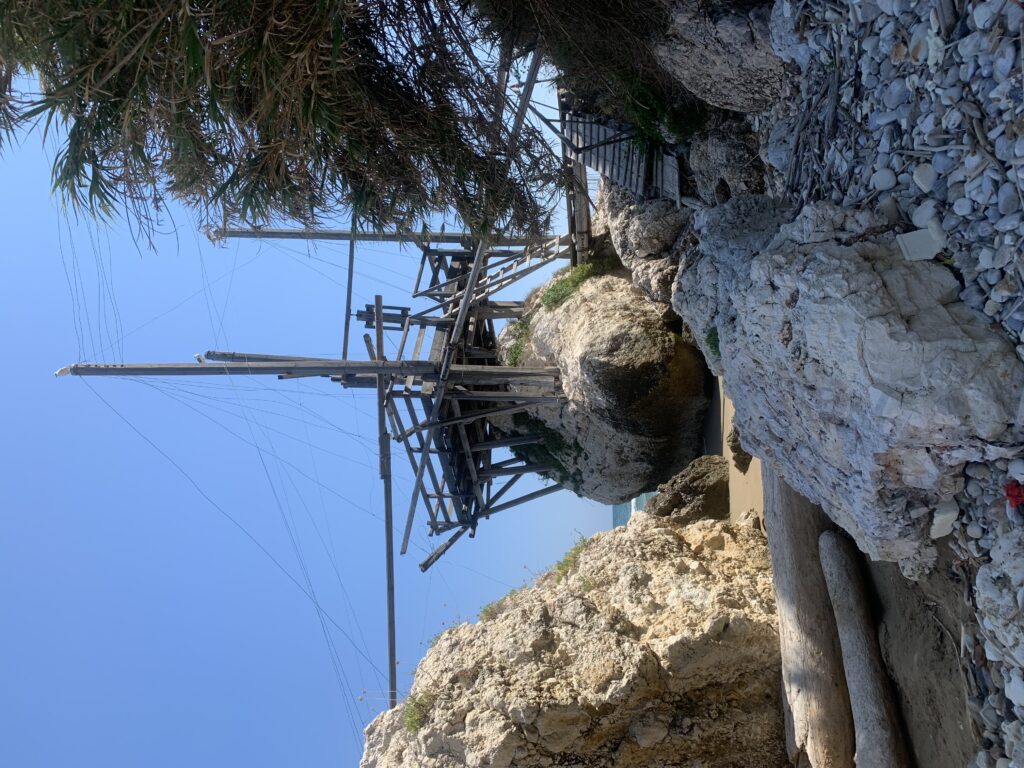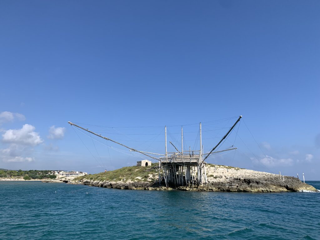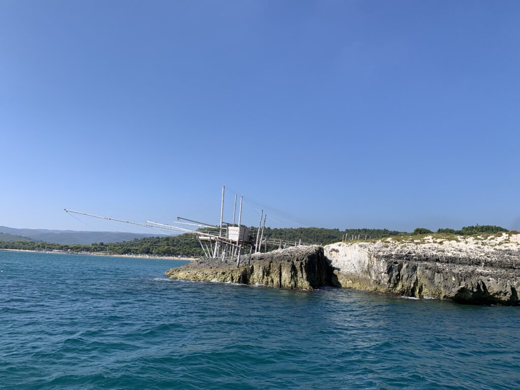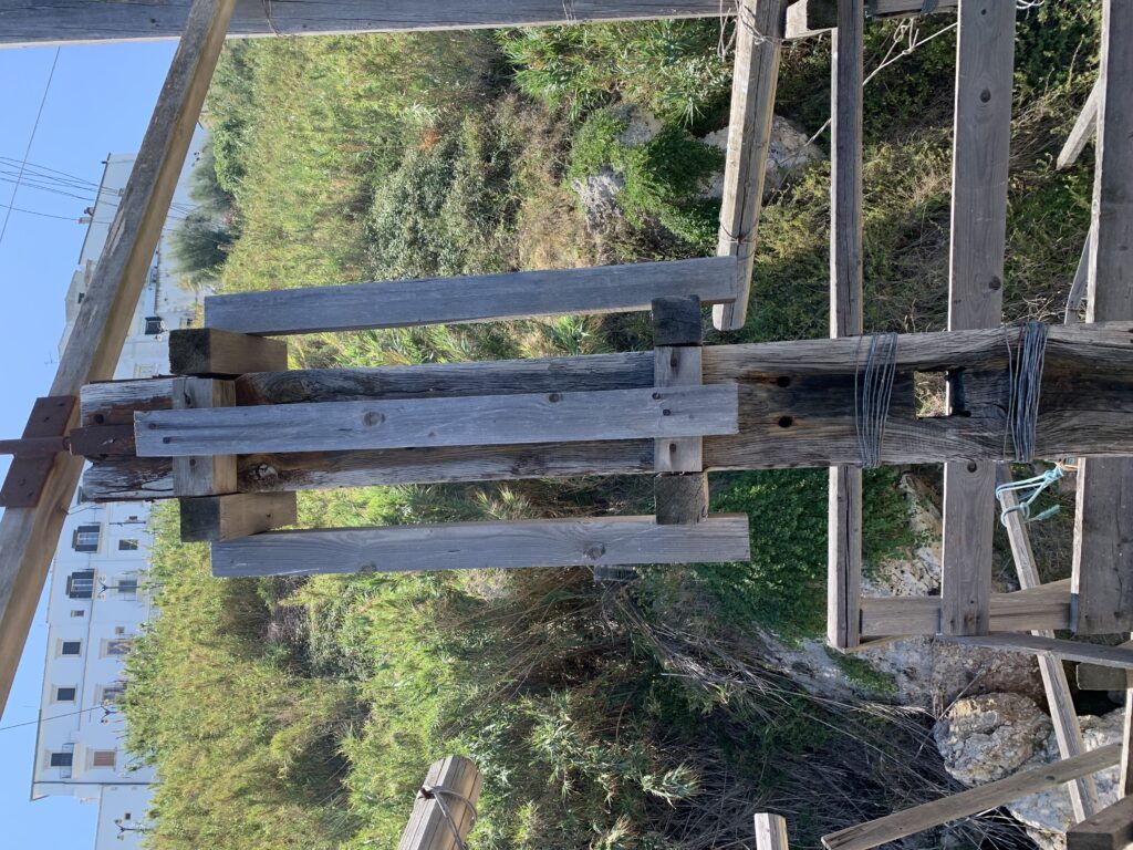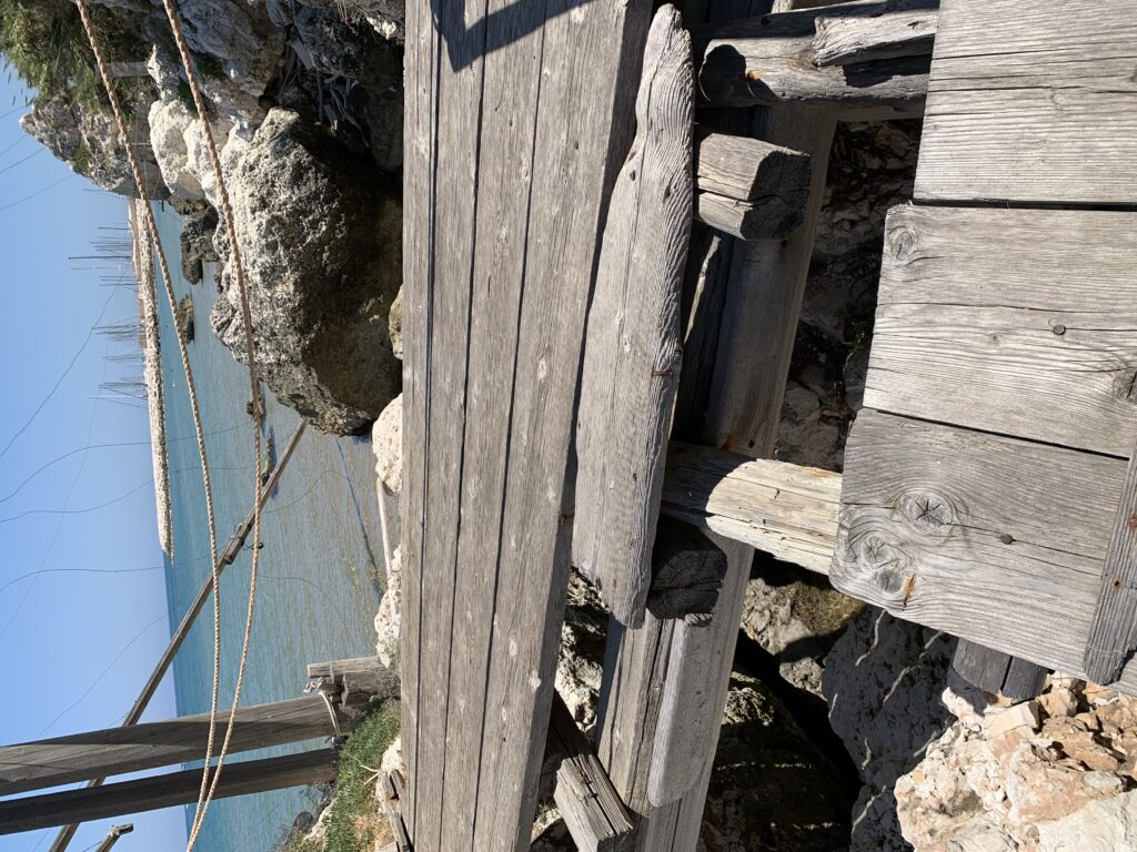 “La fissità” visiva della macchina da pesca in legno con dei tiranti metallici è il capoverso, l’inizio di un racconto di una storia dell’economia familiare di scambio e baratto, un tempo, dei pescatori in attesa sul trabocco… L’attesa, lo sguardo su mare per osservare le formazioni dei pesci forse in avvicinamento, si può definire così la pesca stanziale che aspetta le colonie dei pesci, si muovono queste lungo la costa e si riuniscono a volte sotto i trabocchi. Le reti scendono in verticale, la fauna ittica viene imprigionata, e con la stessa rete portate sulla piattaforma in legno. Far cadere dall’alto, questo il significato del “trabucco”. E’ una la rete quadrangolare che scende tenuta ai vertici da lunghi pali che disegnano una forma una crociera. Il trabocco è una architettura spontanea sorta lungo le scogliere, con pali a volte infissi sulle concrezioni rocciose scavate per l’alloggiamento degli stessi pali, e tiranti in ferro per l’iniziale piattaforma che viene ancorata alle rocce, poi è la volta dei lunghi pali detti bracci lignei alla cui estremità è fissata la rete a bilancia. Al centro della piattaforma in legno di pino d’ aleppo, l’argano comanda la discesa della rete a maglie strette con un moto di rotazione intorno al proprio asse verticale. Ponti, pedane, camminamenti e scale di accesso collegano il trabocco alla terra ferma. Nei promontori oppure nelle formazioni rocciose della costa sporgenti verso il mare, in particolare così adatta la morfologia della costa rocciosa del Gargano, i trabocchi trovavano una loro collocazione strutturale ideale. In una economia di sussistenza, scambio e baratto con i prodotti agricoli dell’entroterra, il trabocco ha sostenuto le famiglie dei pescatori stanziali…