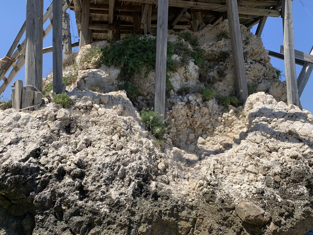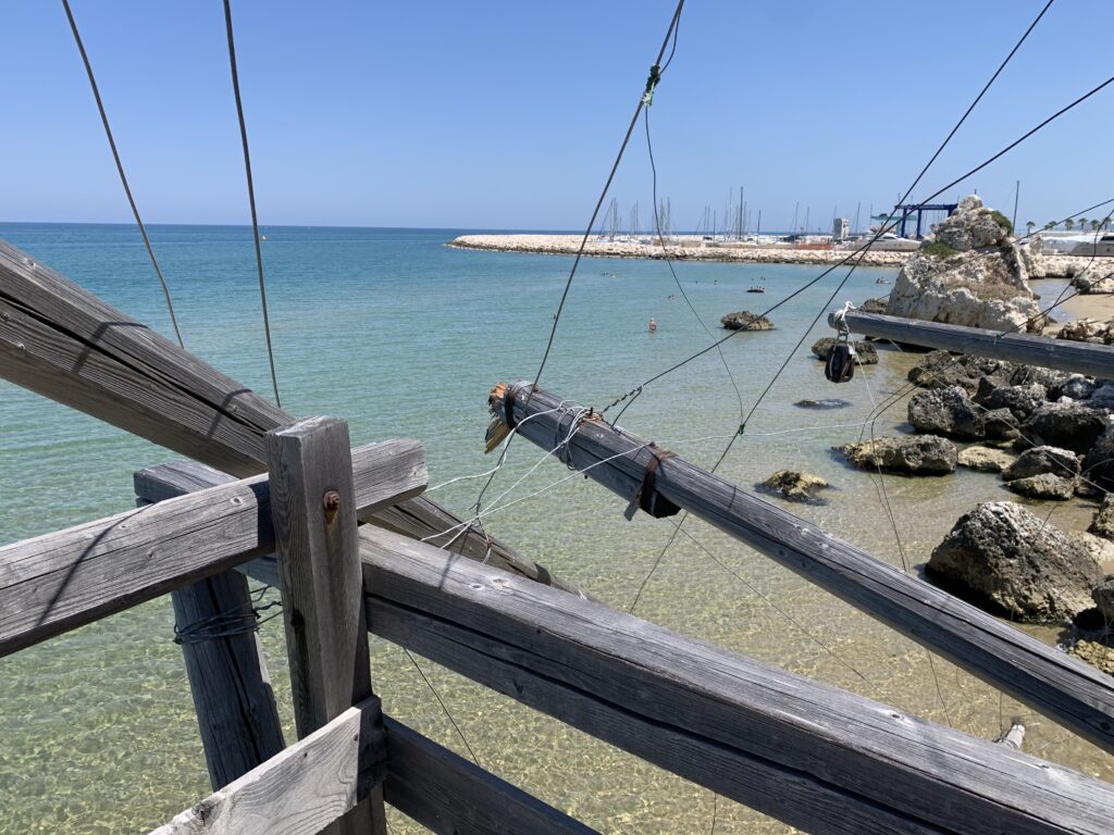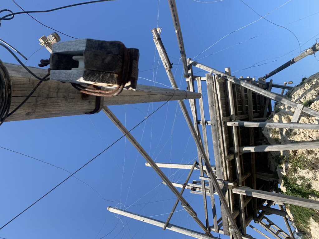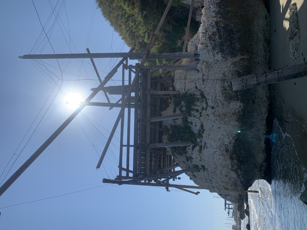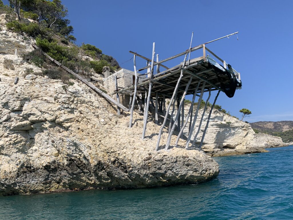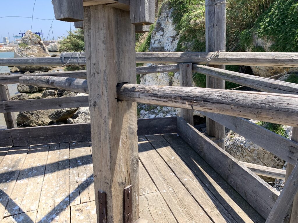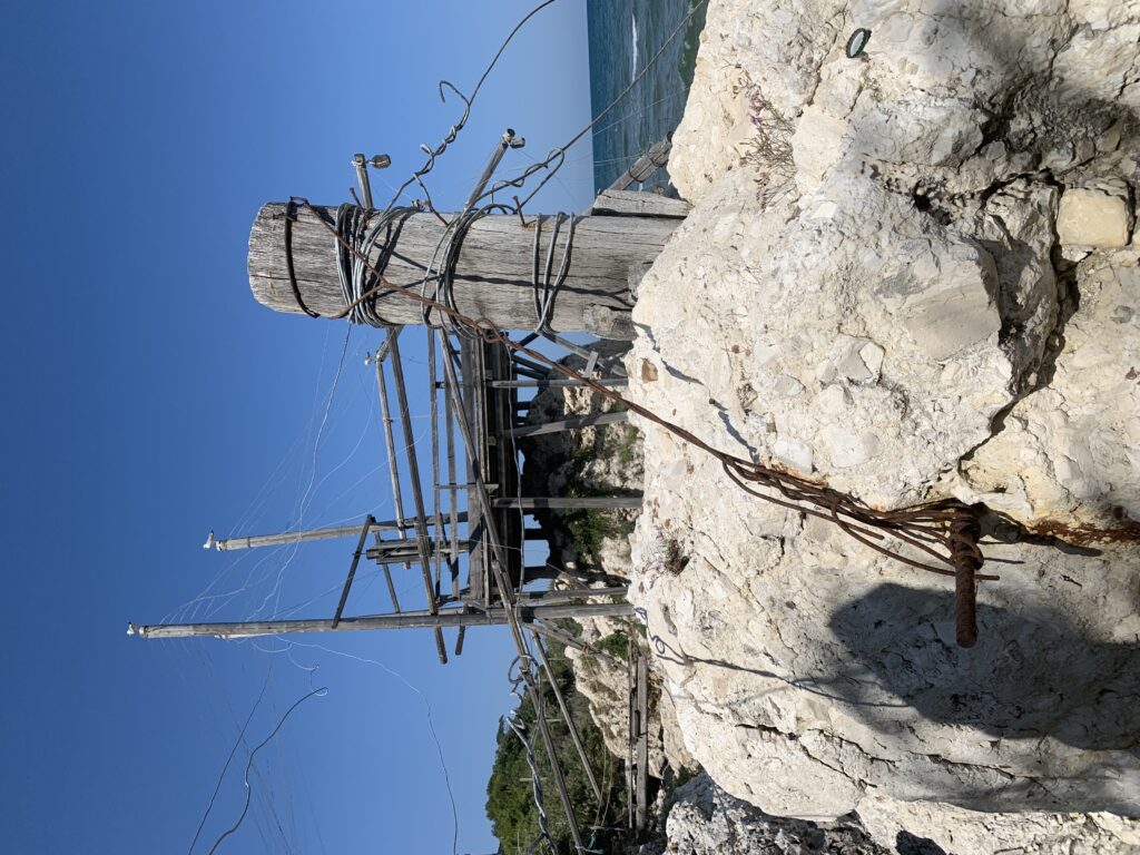 “La fissità” visiva della macchina da pesca in legno con dei tiranti metallici è il capoverso, l’inizio di un racconto di una storia dell’economia familiare di scambio e baratto, un tempo, dei pescatori in attesa sul trabocco… L’attesa, lo sguardo su mare per osservare le formazioni dei pesci forse in avvicinamento, si può definire così la pesca stanziale che aspetta le colonie dei pesci, si muovono queste lungo la costa e si riuniscono a volte sotto i trabocchi. Le reti scendono in verticale, la fauna ittica viene imprigionata, e con la stessa rete portate sulla piattaforma in legno. Far cadere dall’alto, questo il significato del “trabucco”. E’ una la rete quadrangolare che scende tenuta ai vertici da lunghi pali che disegnano una forma una crociera. Il trabocco è una architettura spontanea sorta lungo le scogliere, con pali a volte infissi sulle concrezioni rocciose scavate per l’alloggiamento degli stessi pali, e tiranti in ferro per l’iniziale piattaforma che viene ancorata alle rocce, poi è la volta dei lunghi pali detti bracci lignei alla cui estremità è fissata la rete a bilancia. Al centro della piattaforma in legno di pino d’ aleppo, l’argano comanda la discesa della rete a maglie strette con un moto di rotazione intorno al proprio asse verticale. Ponti, pedane, camminamenti e scale di accesso collegano il trabocco alla terra ferma. Nei promontori oppure nelle formazioni rocciose della costa sporgenti verso il mare, in particolare così adatta la morfologia della costa rocciosa del Gargano, i trabocchi trovavano una loro collocazione strutturale ideale. In una economia di sussistenza, scambio e baratto con i prodotti agricoli dell’entroterra, il trabocco ha sostenuto le famiglie dei pescatori stanziali…