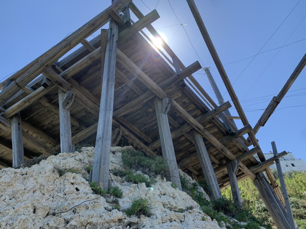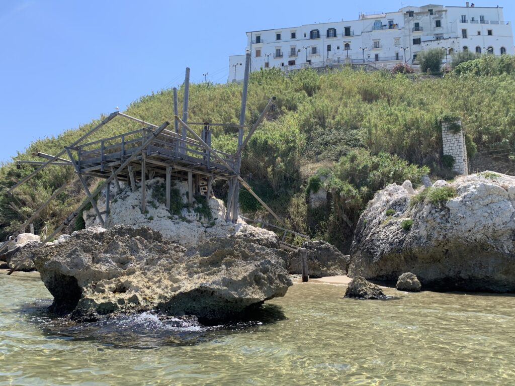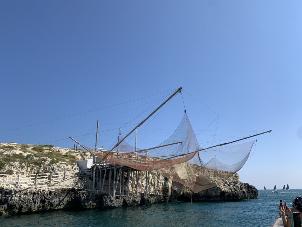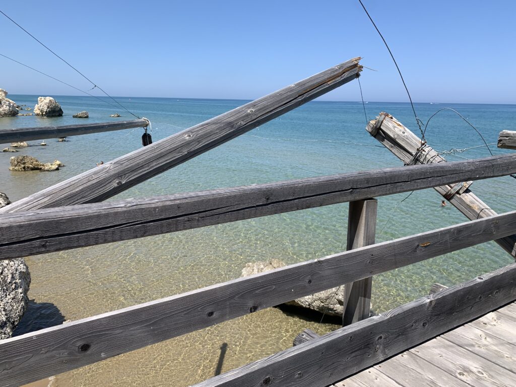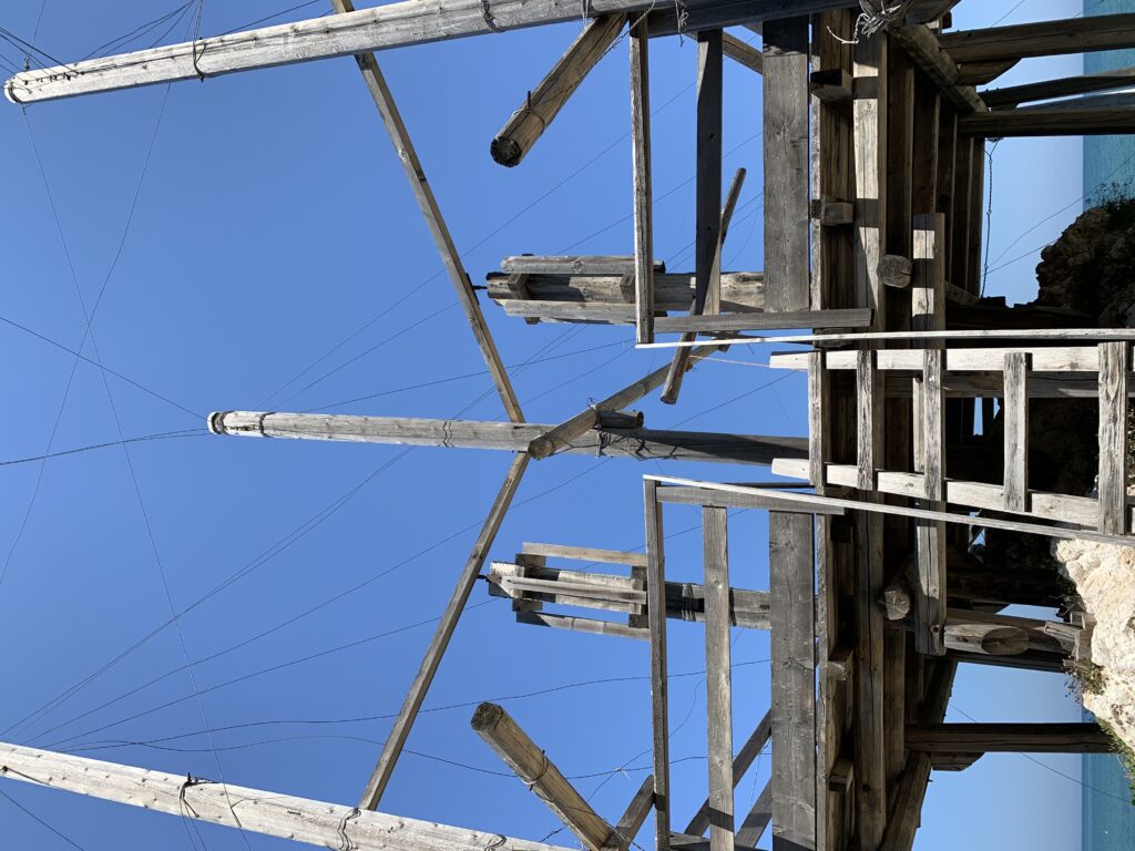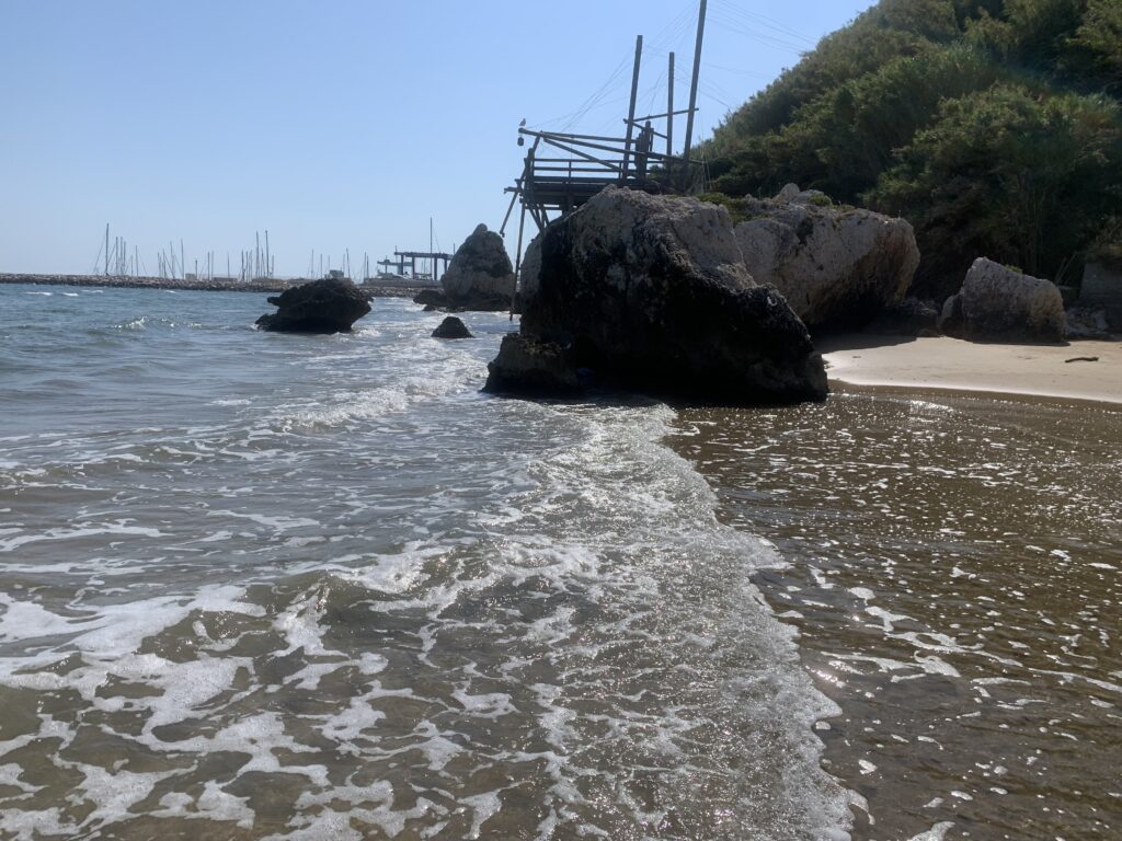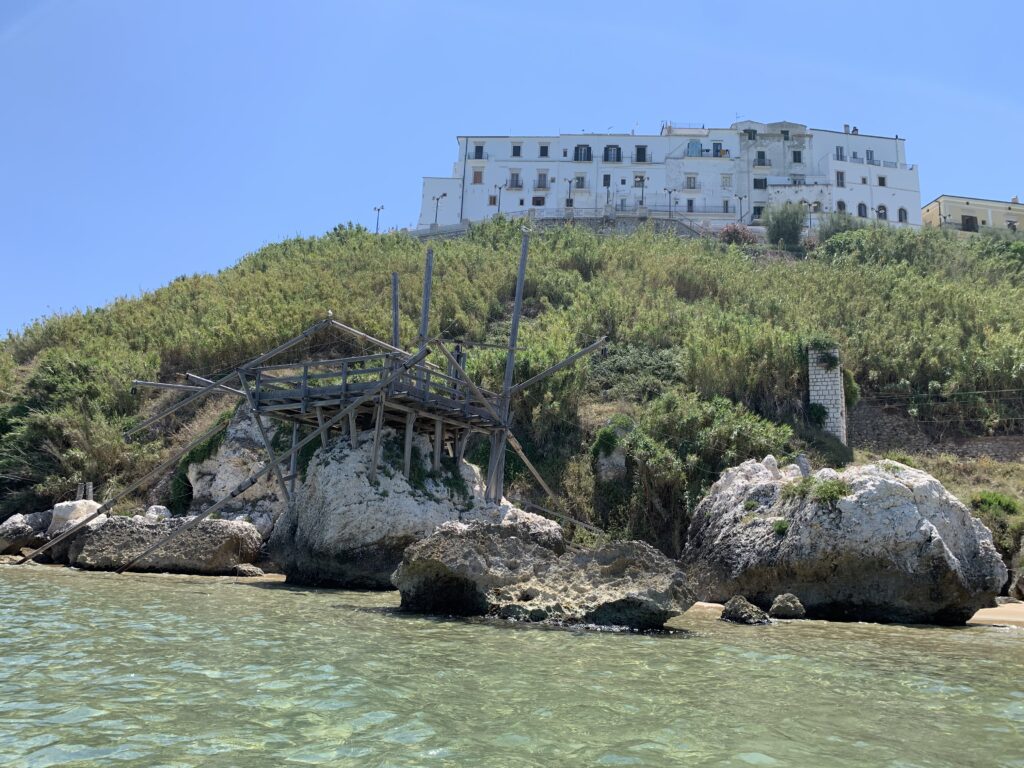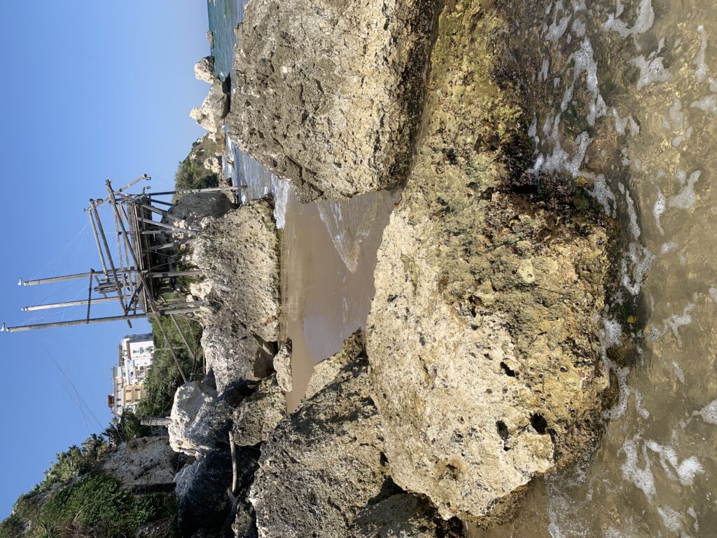 “La fissità” visiva della macchina da pesca in legno con dei tiranti metallici è il capoverso, l’inizio di un racconto di una storia dell’economia familiare di scambio e baratto, un tempo, dei pescatori in attesa sul trabocco… L’attesa, lo sguardo su mare per osservare le formazioni dei pesci forse in avvicinamento, si può definire così la pesca stanziale che aspetta le colonie dei pesci, si muovono queste lungo la costa e si riuniscono a volte sotto i trabocchi. Le reti scendono in verticale, la fauna ittica viene imprigionata, e con la stessa rete portate sulla piattaforma in legno. Far cadere dall’alto, questo il significato del “trabucco”. E’ una la rete quadrangolare che scende tenuta ai vertici da lunghi pali che disegnano una forma una crociera. Il trabocco è una architettura spontanea sorta lungo le scogliere, con pali a volte infissi sulle concrezioni rocciose scavate per l’alloggiamento degli stessi pali, e tiranti in ferro per l’iniziale piattaforma che viene ancorata alle rocce, poi è la volta dei lunghi pali detti bracci lignei alla cui estremità è fissata la rete a bilancia. Al centro della piattaforma in legno di pino d’ aleppo, l’argano comanda la discesa della rete a maglie strette con un moto di rotazione intorno al proprio asse verticale. Ponti, pedane, camminamenti e scale di accesso collegano il trabocco alla terra ferma. Nei promontori oppure nelle formazioni rocciose della costa sporgenti verso il mare, in particolare così adatta la morfologia della costa rocciosa del Gargano, i trabocchi trovavano una loro collocazione strutturale ideale. In una economia di sussistenza, scambio e baratto con i prodotti agricoli dell’entroterra, il trabocco ha sostenuto le famiglie dei pescatori stanziali…