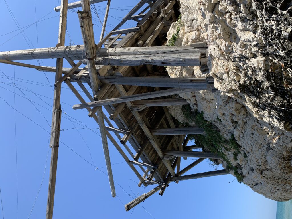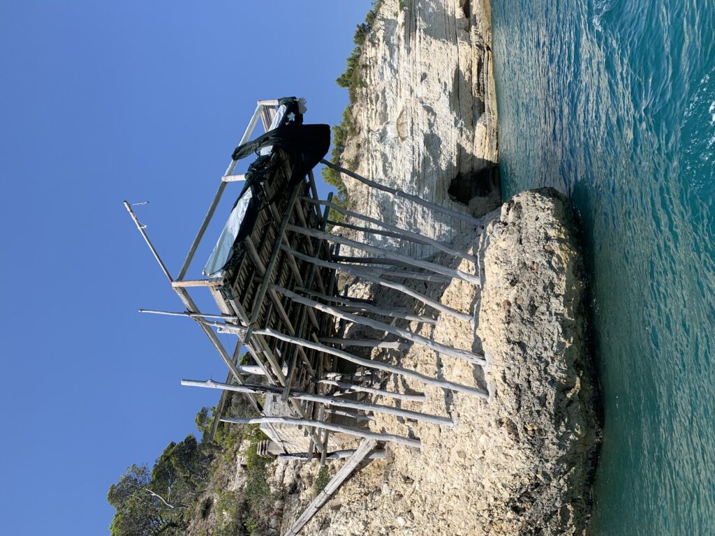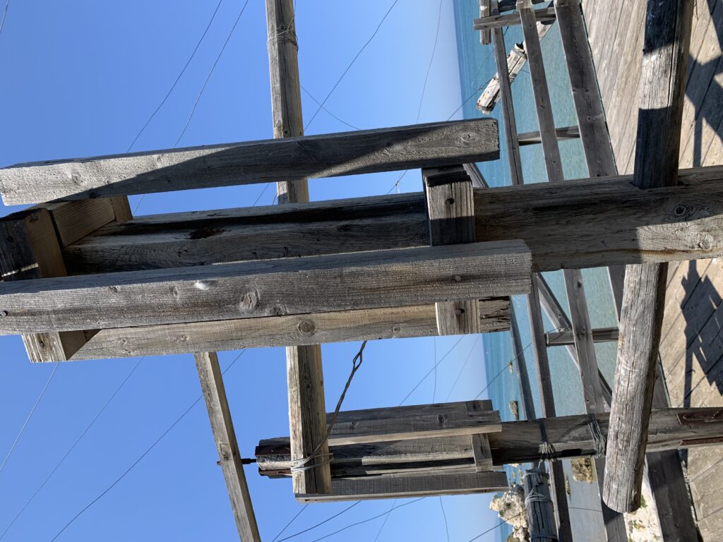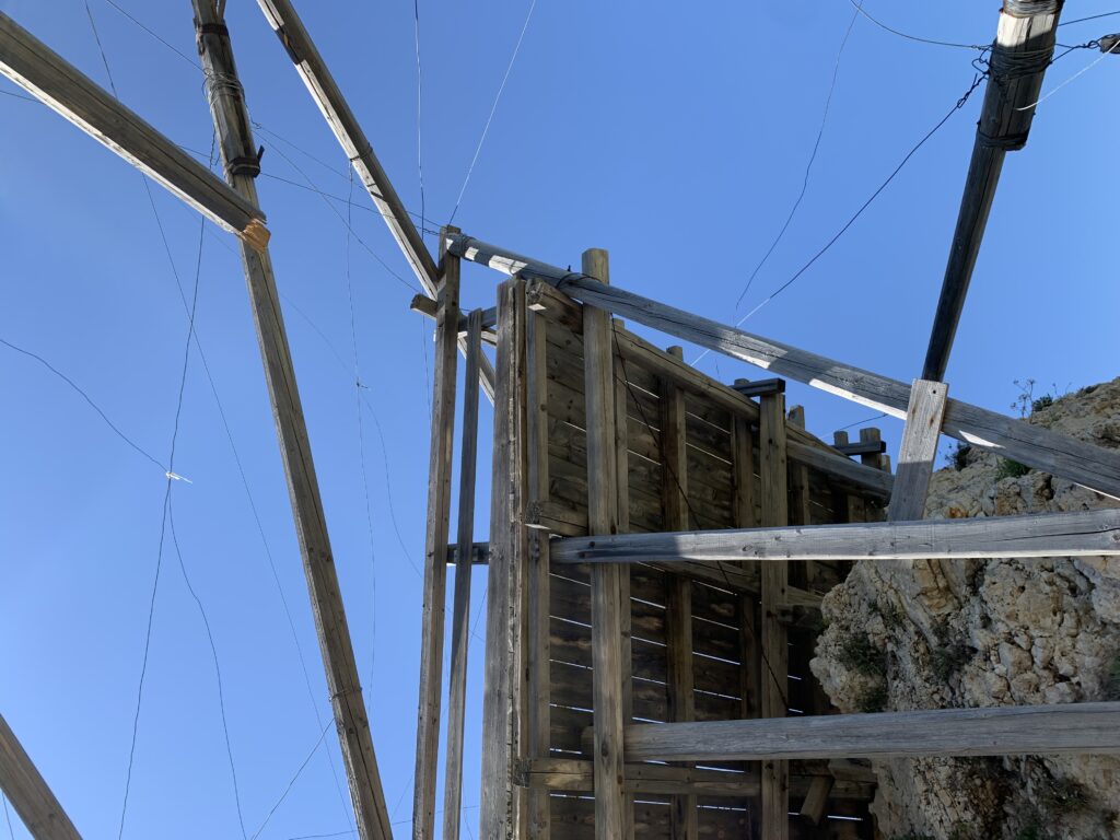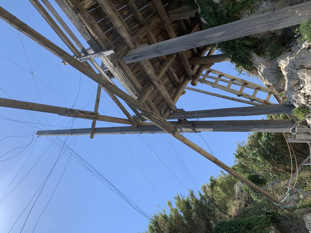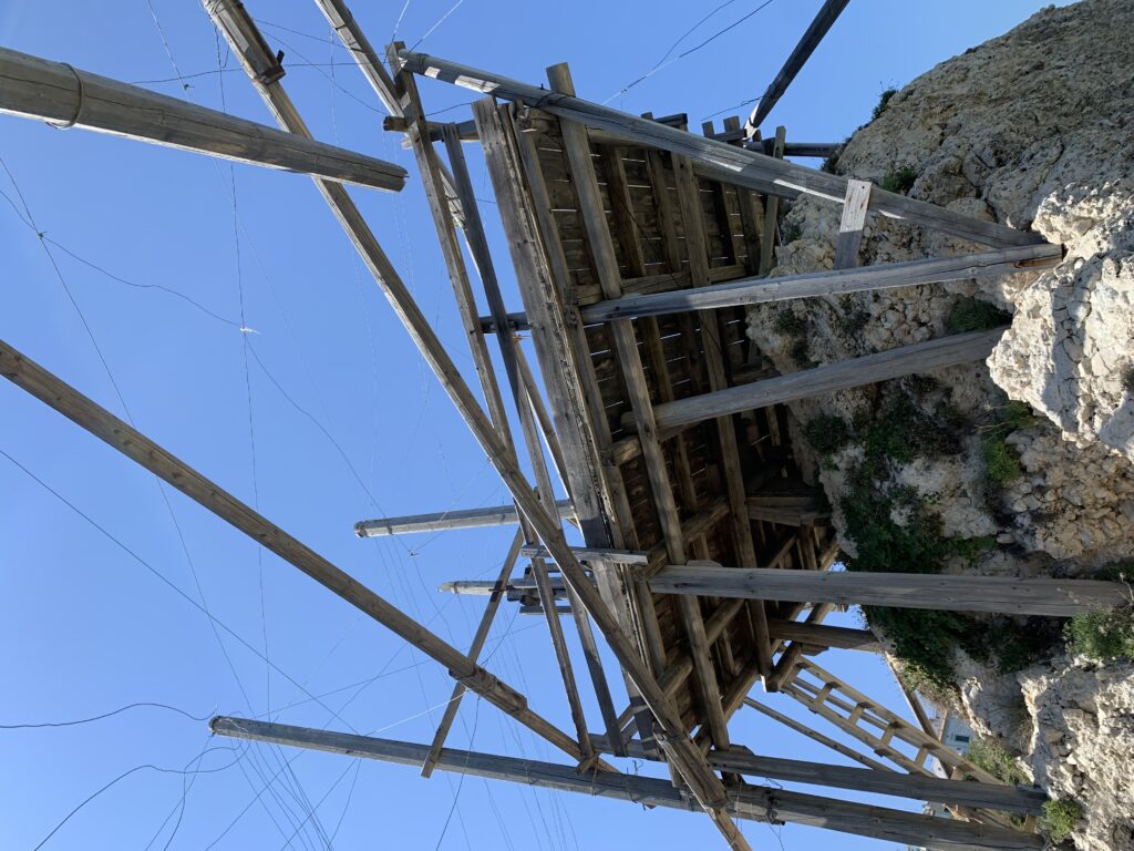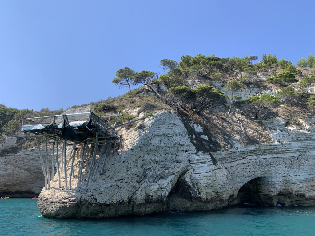 “La fissità” visiva della macchina da pesca in legno con dei tiranti metallici è il capoverso, l’inizio di un racconto di una storia dell’economia familiare di scambio e baratto, un tempo, dei pescatori in attesa sul trabocco… L’attesa, lo sguardo su mare per osservare le formazioni dei pesci forse in avvicinamento, si può definire così la pesca stanziale che aspetta le colonie dei pesci, si muovono queste lungo la costa e si riuniscono a volte sotto i trabocchi. Le reti scendono in verticale, la fauna ittica viene imprigionata, e con la stessa rete portate sulla piattaforma in legno. Far cadere dall’alto, questo il significato del “trabucco”. E’ una la rete quadrangolare che scende tenuta ai vertici da lunghi pali che disegnano una forma una crociera. Il trabocco è una architettura spontanea sorta lungo le scogliere, con pali a volte infissi sulle concrezioni rocciose scavate per l’alloggiamento degli stessi pali, e tiranti in ferro per l’iniziale piattaforma che viene ancorata alle rocce, poi è la volta dei lunghi pali detti bracci lignei alla cui estremità è fissata la rete a bilancia. Al centro della piattaforma in legno di pino d’ aleppo, l’argano comanda la discesa della rete a maglie strette con un moto di rotazione intorno al proprio asse verticale. Ponti, pedane, camminamenti e scale di accesso collegano il trabocco alla terra ferma. Nei promontori oppure nelle formazioni rocciose della costa sporgenti verso il mare, in particolare così adatta la morfologia della costa rocciosa del Gargano, i trabocchi trovavano una loro collocazione strutturale ideale. In una economia di sussistenza, scambio e baratto con i prodotti agricoli dell’entroterra, il trabocco ha sostenuto le famiglie dei pescatori stanziali…