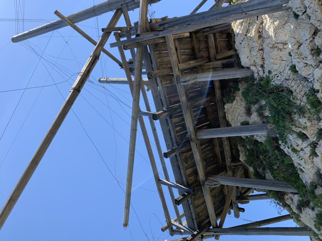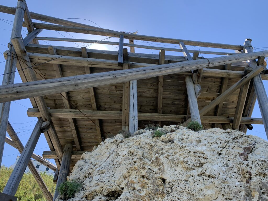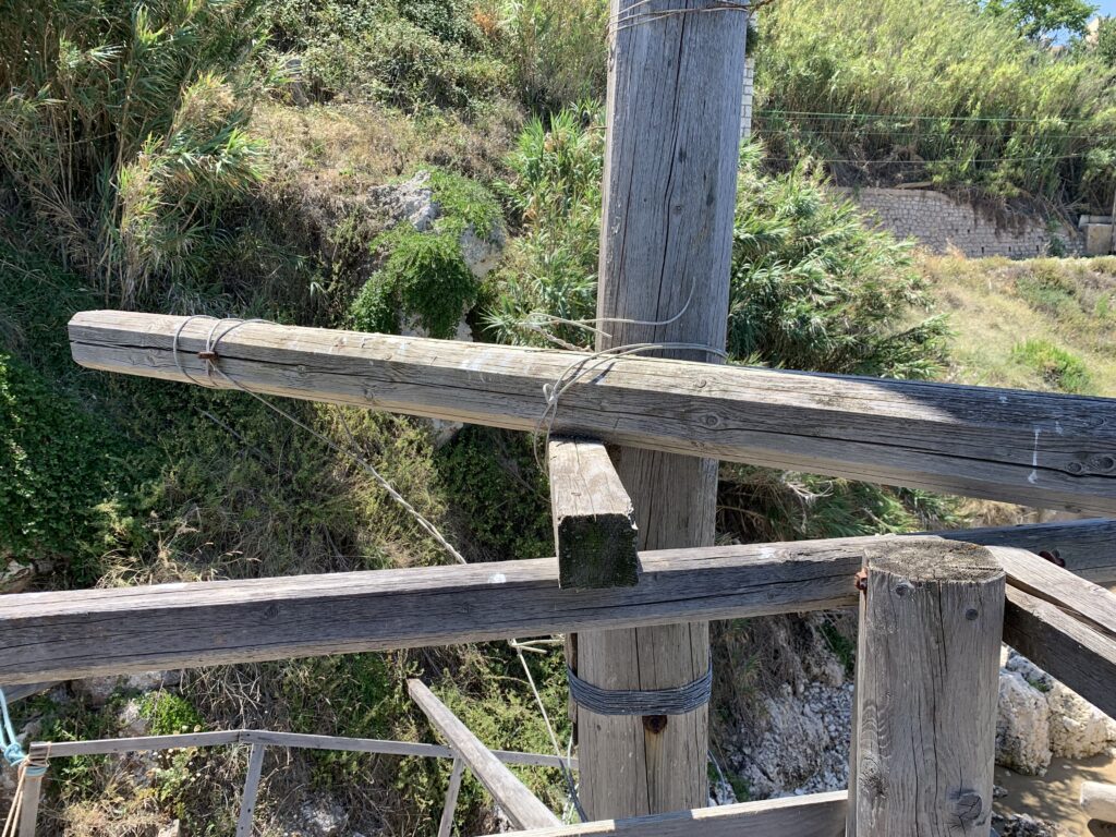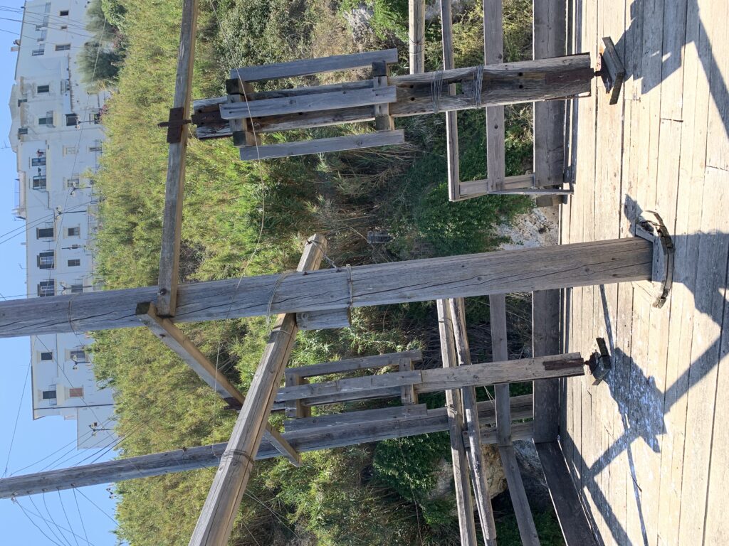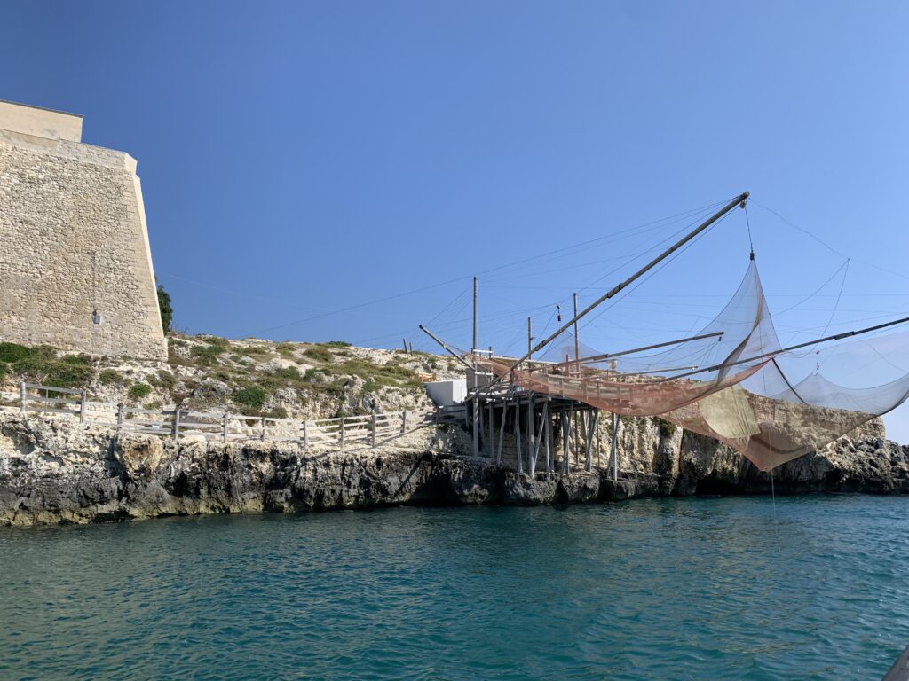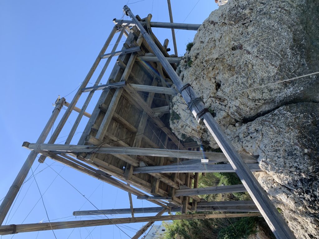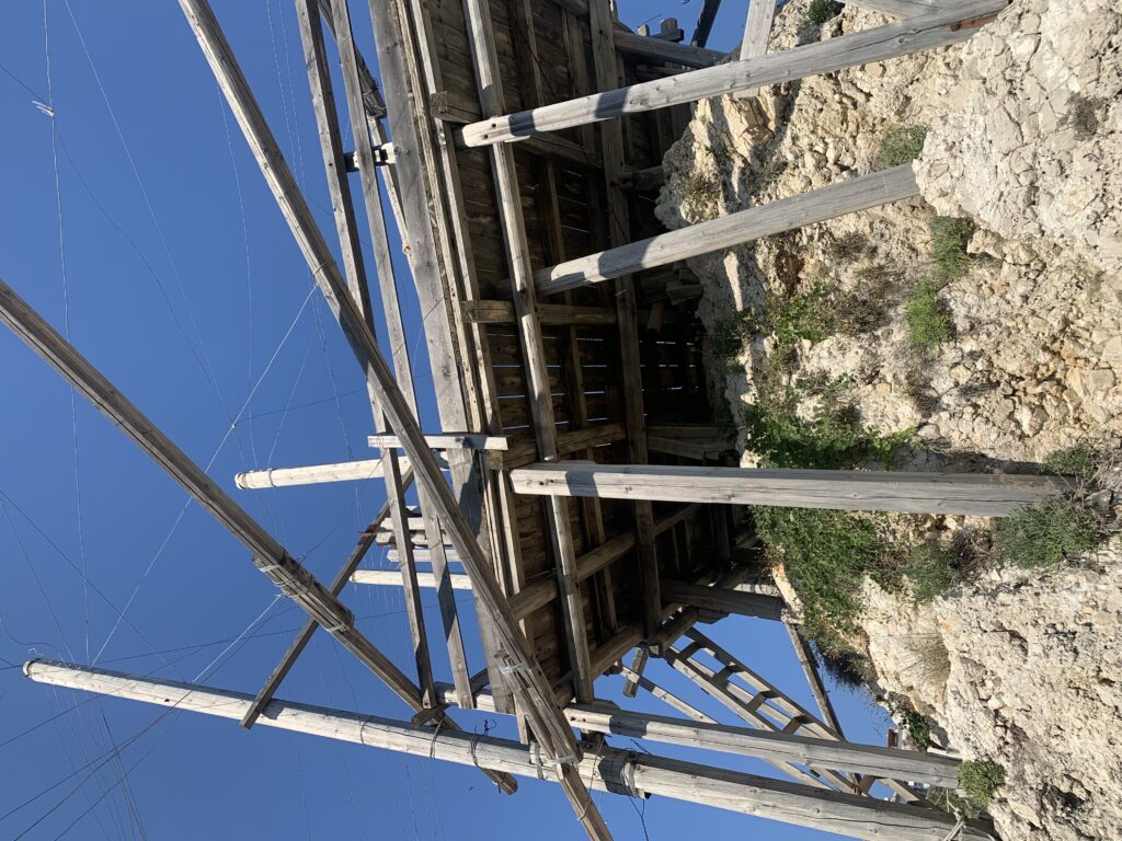“La fissità” visiva della macchina da pesca in legno con dei tiranti metallici è il capoverso, l’inizio di un racconto di una storia dell’economia familiare di scambio e baratto, un tempo, dei pescatori in attesa sul trabocco… L’attesa, lo sguardo su mare per osservare le formazioni dei pesci forse in avvicinamento, si può definire così la pesca stanziale che aspetta le colonie dei pesci, si muovono queste lungo la costa e si riuniscono a volte sotto i trabocchi. Le reti scendono in verticale, la fauna ittica viene imprigionata, e con la stessa rete portate sulla piattaforma in legno. Far cadere dall’alto, questo il significato del “trabucco”. E’ una la rete quadrangolare che scende tenuta ai vertici da lunghi pali che disegnano una forma una crociera. Il trabocco è una architettura spontanea sorta lungo le scogliere, con pali a volte infissi sulle concrezioni rocciose scavate per l’alloggiamento degli stessi pali, e tiranti in ferro per l’iniziale piattaforma che viene ancorata alle rocce, poi è la volta dei lunghi pali detti bracci lignei alla cui estremità è fissata la rete a bilancia. Al centro della piattaforma in legno di pino d’ aleppo, l’argano comanda la discesa della rete a maglie strette con un moto di rotazione intorno al proprio asse verticale. Ponti, pedane, camminamenti e scale di accesso collegano il trabocco alla terra ferma. Nei promontori oppure nelle formazioni rocciose della costa sporgenti verso il mare, in particolare così adatta la morfologia della costa rocciosa del Gargano, i trabocchi trovavano una loro collocazione strutturale ideale. In una economia di sussistenza, scambio e baratto con i prodotti agricoli dell’entroterra, il trabocco ha sostenuto le famiglie dei pescatori stanziali…