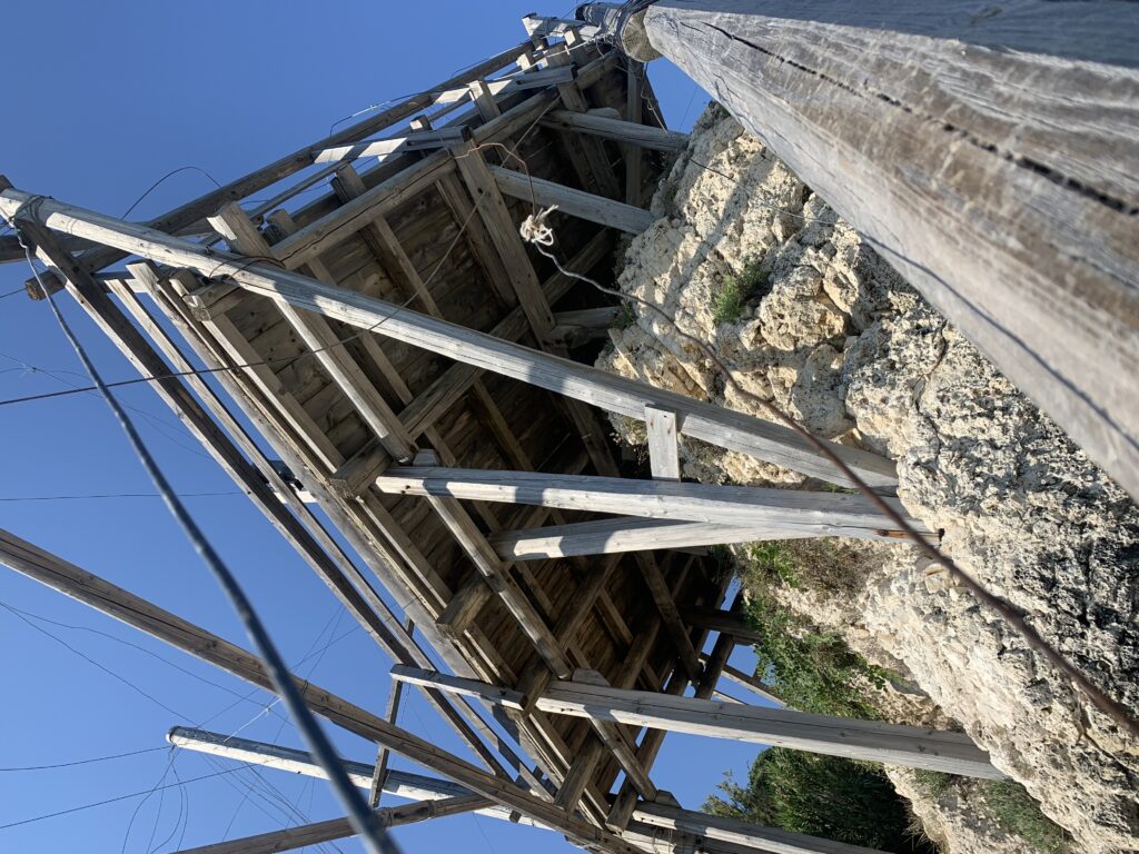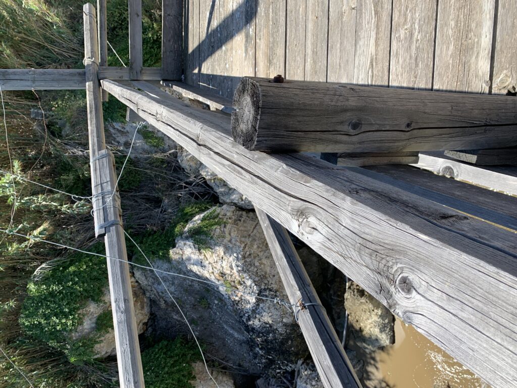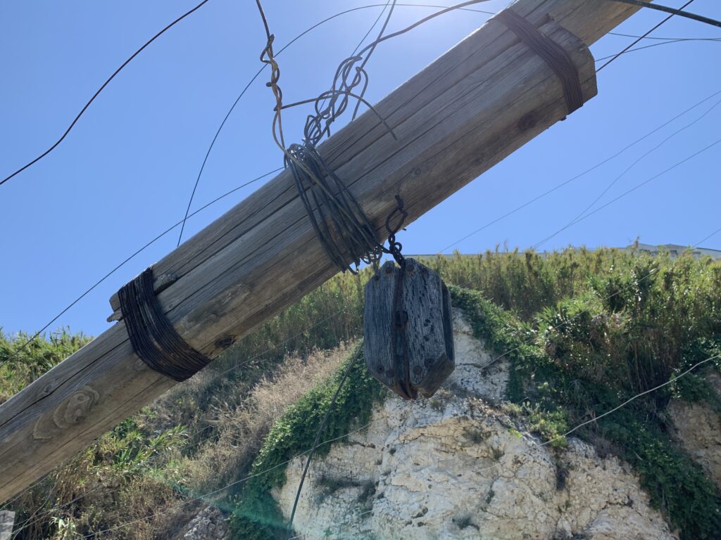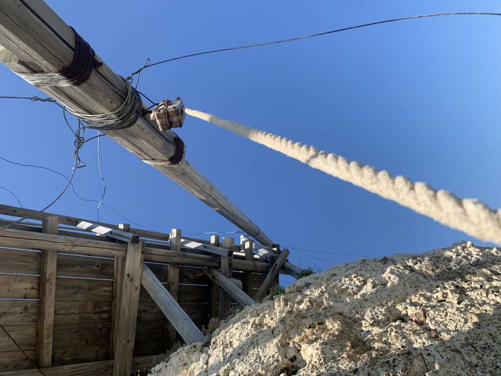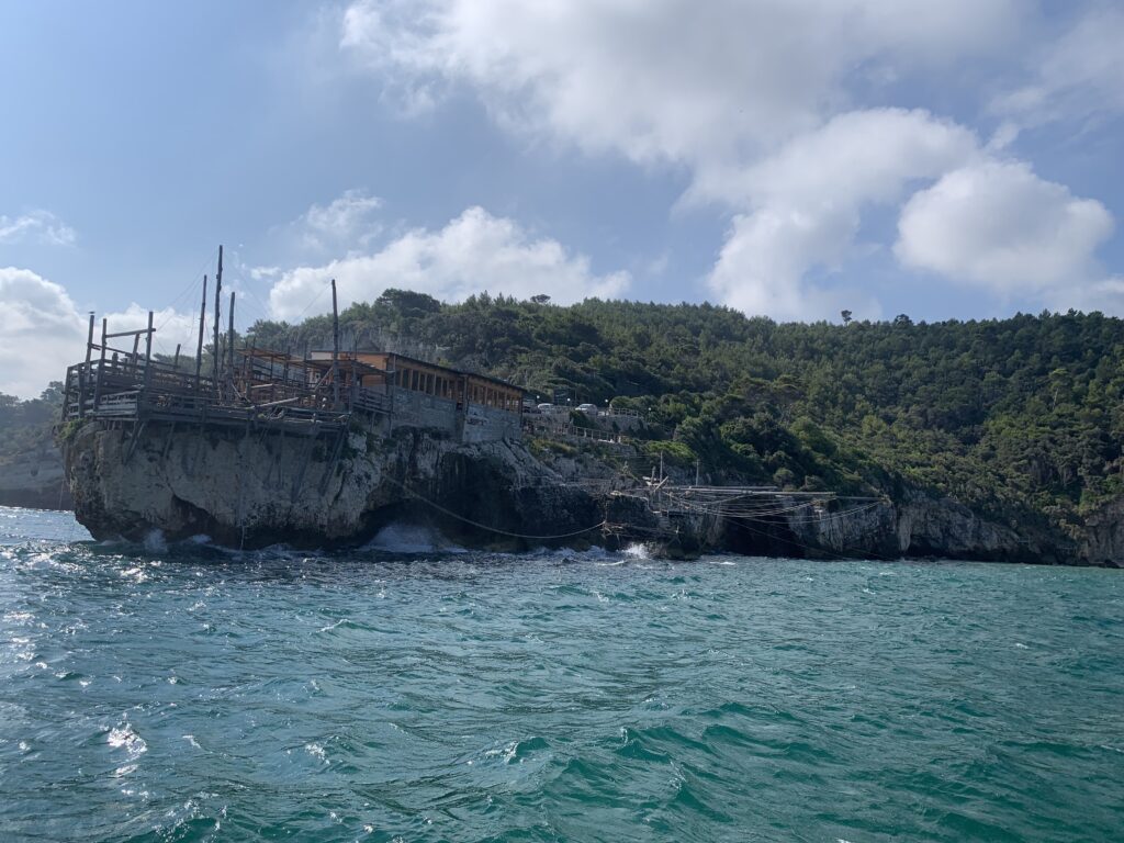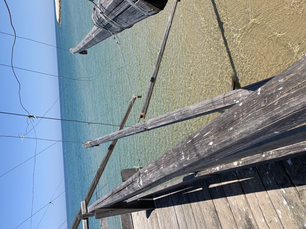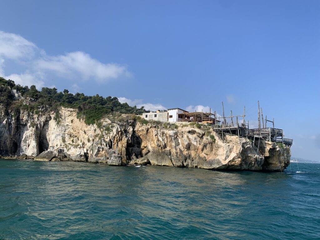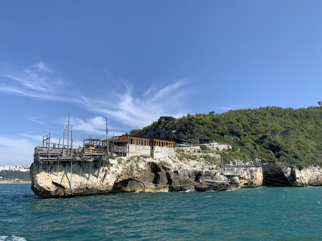 “La fissità” visiva della macchina da pesca in legno con dei tiranti metallici è il capoverso, l’inizio di un racconto di una storia dell’economia familiare di scambio e baratto, un tempo, dei pescatori in attesa sul trabocco… L’attesa, lo sguardo su mare per osservare le formazioni dei pesci forse in avvicinamento, si può definire così la pesca stanziale che aspetta le colonie dei pesci, si muovono queste lungo la costa e si riuniscono a volte sotto i trabocchi. Le reti scendono in verticale, la fauna ittica viene imprigionata, e con la stessa rete portate sulla piattaforma in legno. Far cadere dall’alto, questo il significato del “trabucco”. E’ una la rete quadrangolare che scende tenuta ai vertici da lunghi pali che disegnano una forma una crociera. Il trabocco è una architettura spontanea sorta lungo le scogliere, con pali a volte infissi sulle concrezioni rocciose scavate per l’alloggiamento degli stessi pali, e tiranti in ferro per l’iniziale piattaforma che viene ancorata alle rocce, poi è la volta dei lunghi pali detti bracci lignei alla cui estremità è fissata la rete a bilancia. Al centro della piattaforma in legno di pino d’ aleppo, l’argano comanda la discesa della rete a maglie strette con un moto di rotazione intorno al proprio asse verticale. Ponti, pedane, camminamenti e scale di accesso collegano il trabocco alla terra ferma. Nei promontori oppure nelle formazioni rocciose della costa sporgenti verso il mare, in particolare così adatta la morfologia della costa rocciosa del Gargano, i trabocchi trovavano una loro collocazione strutturale ideale. In una economia di sussistenza, scambio e baratto con i prodotti agricoli dell’entroterra, il trabocco ha sostenuto le famiglie dei pescatori stanziali…