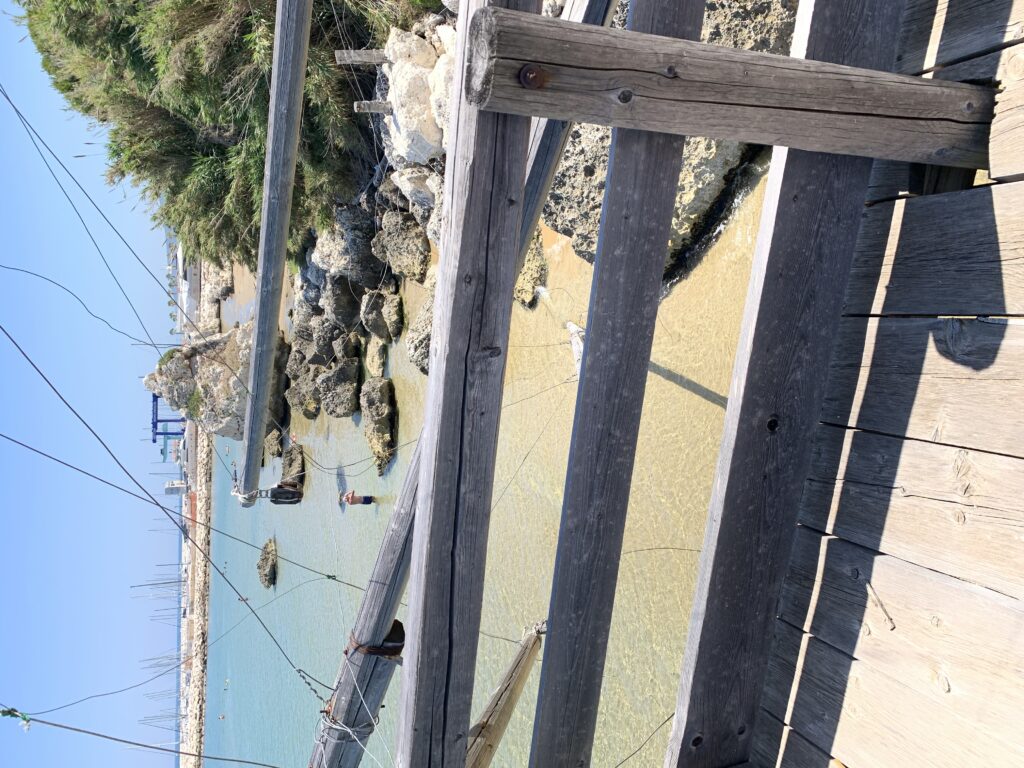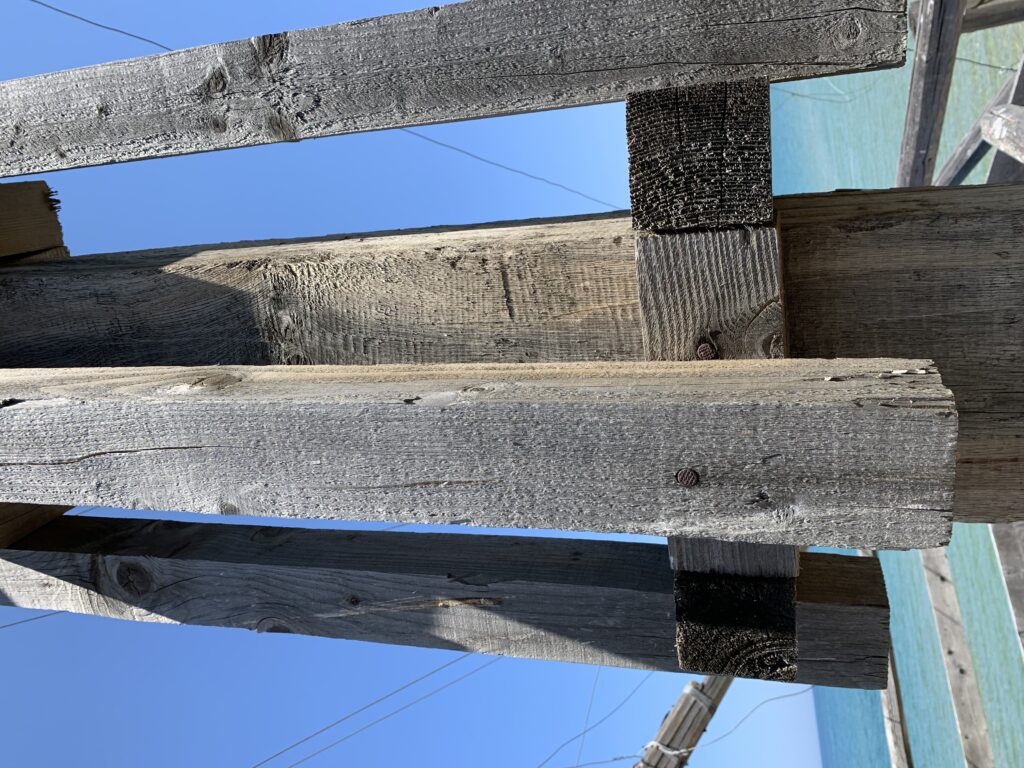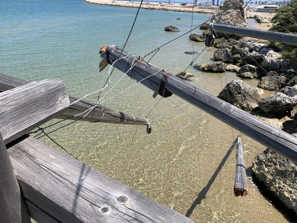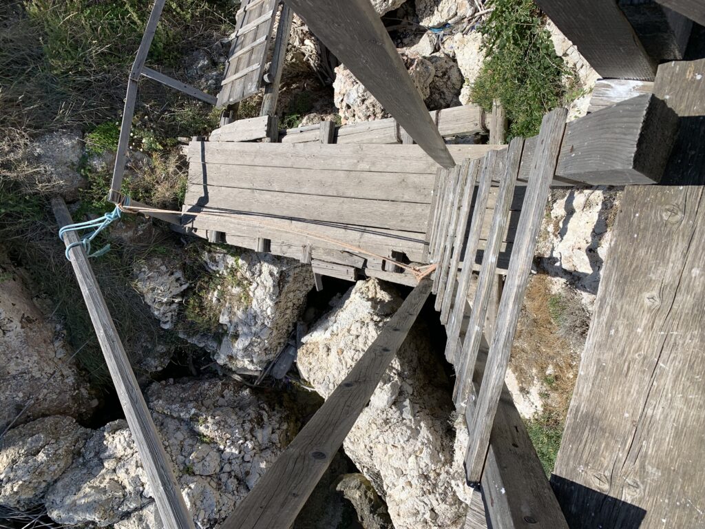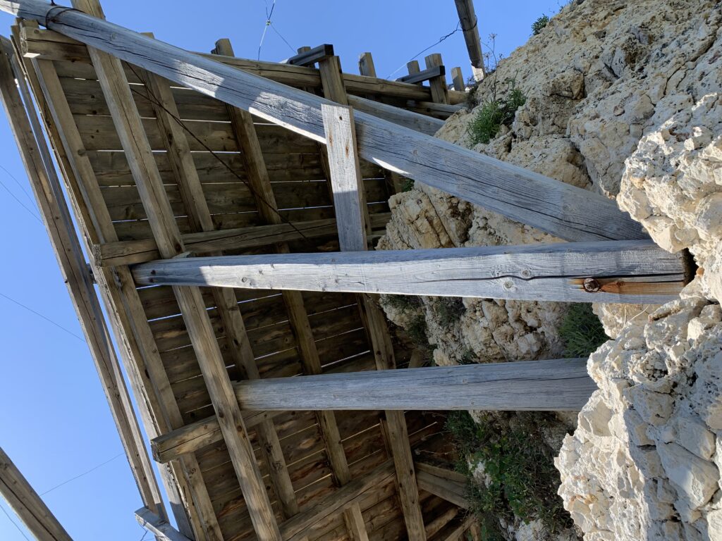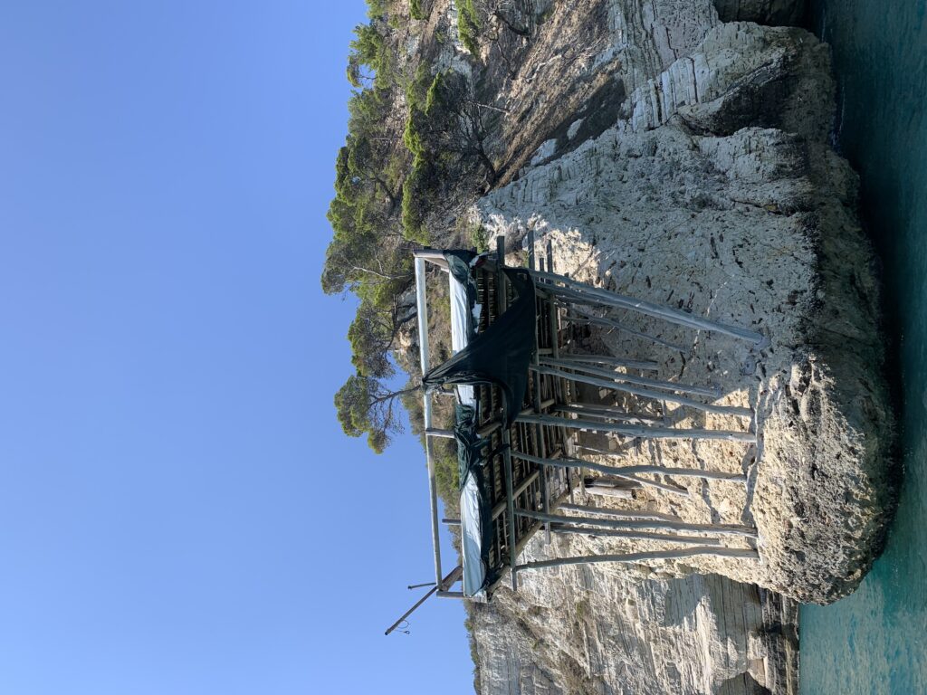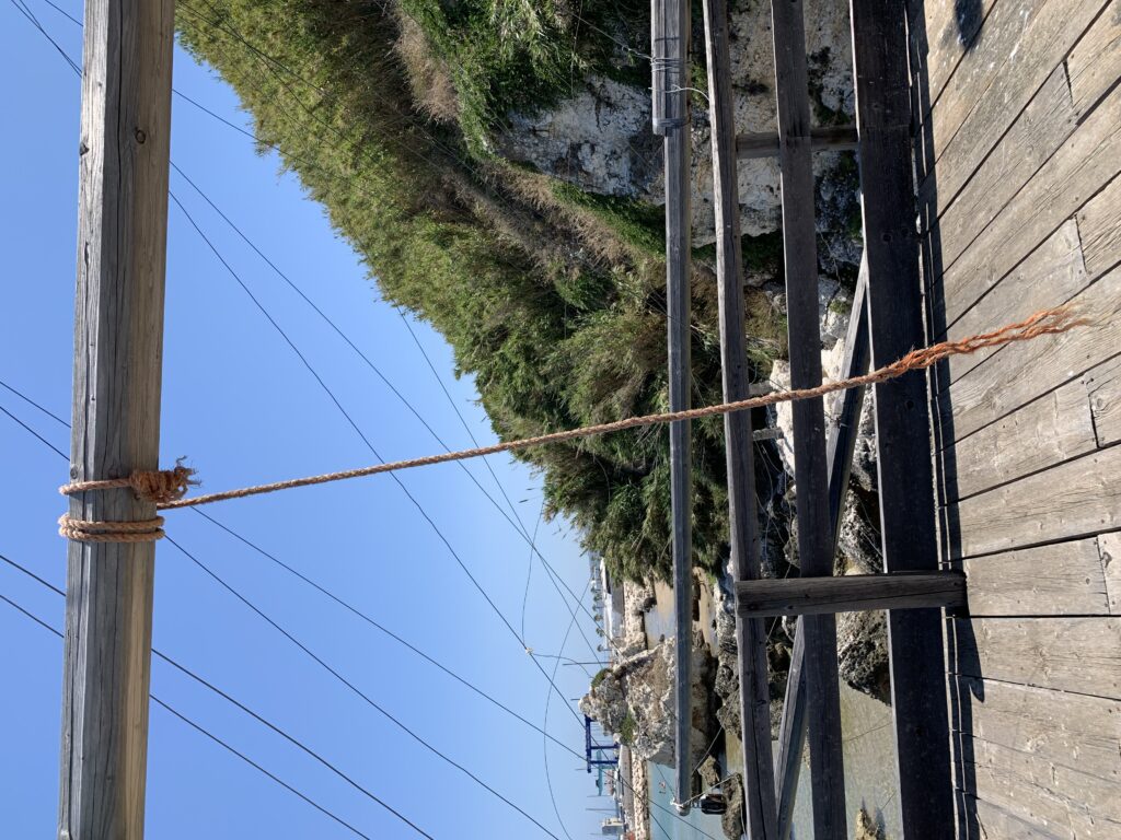 “La fissità” visiva della macchina da pesca in legno con dei tiranti metallici è il capoverso, l’inizio di un racconto di una storia dell’economia familiare di scambio e baratto, un tempo, dei pescatori in attesa sul trabocco… L’attesa, lo sguardo su mare per osservare le formazioni dei pesci forse in avvicinamento, si può definire così la pesca stanziale che aspetta le colonie dei pesci, si muovono queste lungo la costa e si riuniscono a volte sotto i trabocchi. Le reti scendono in verticale, la fauna ittica viene imprigionata, e con la stessa rete portate sulla piattaforma in legno. Far cadere dall’alto, questo il significato del “trabucco”. E’ una la rete quadrangolare che scende tenuta ai vertici da lunghi pali che disegnano una forma una crociera. Il trabocco è una architettura spontanea sorta lungo le scogliere, con pali a volte infissi sulle concrezioni rocciose scavate per l’alloggiamento degli stessi pali, e tiranti in ferro per l’iniziale piattaforma che viene ancorata alle rocce, poi è la volta dei lunghi pali detti bracci lignei alla cui estremità è fissata la rete a bilancia. Al centro della piattaforma in legno di pino d’ aleppo, l’argano comanda la discesa della rete a maglie strette con un moto di rotazione intorno al proprio asse verticale. Ponti, pedane, camminamenti e scale di accesso collegano il trabocco alla terra ferma. Nei promontori oppure nelle formazioni rocciose della costa sporgenti verso il mare, in particolare così adatta la morfologia della costa rocciosa del Gargano, i trabocchi trovavano una loro collocazione strutturale ideale. In una economia di sussistenza, scambio e baratto con i prodotti agricoli dell’entroterra, il trabocco ha sostenuto le famiglie dei pescatori stanziali…