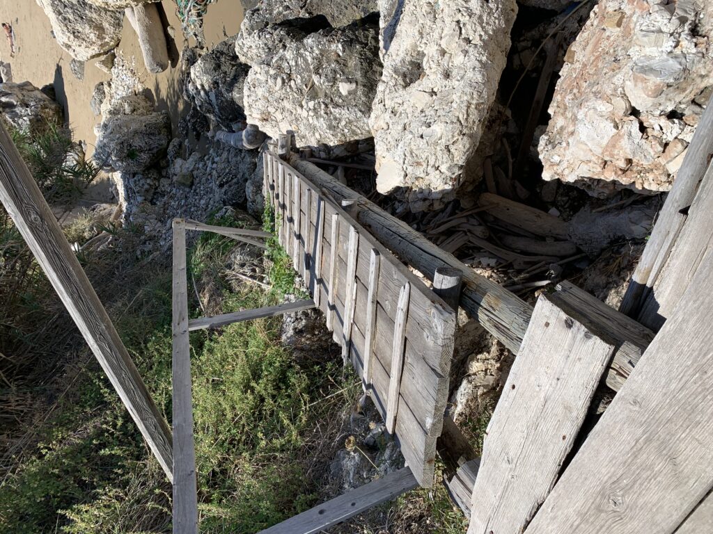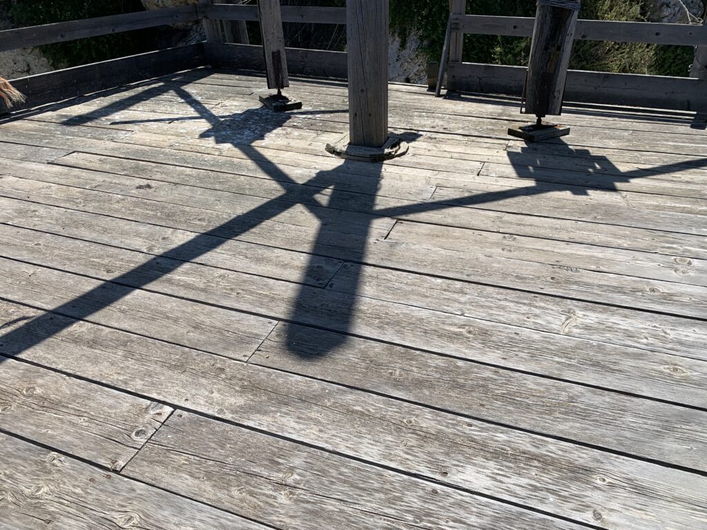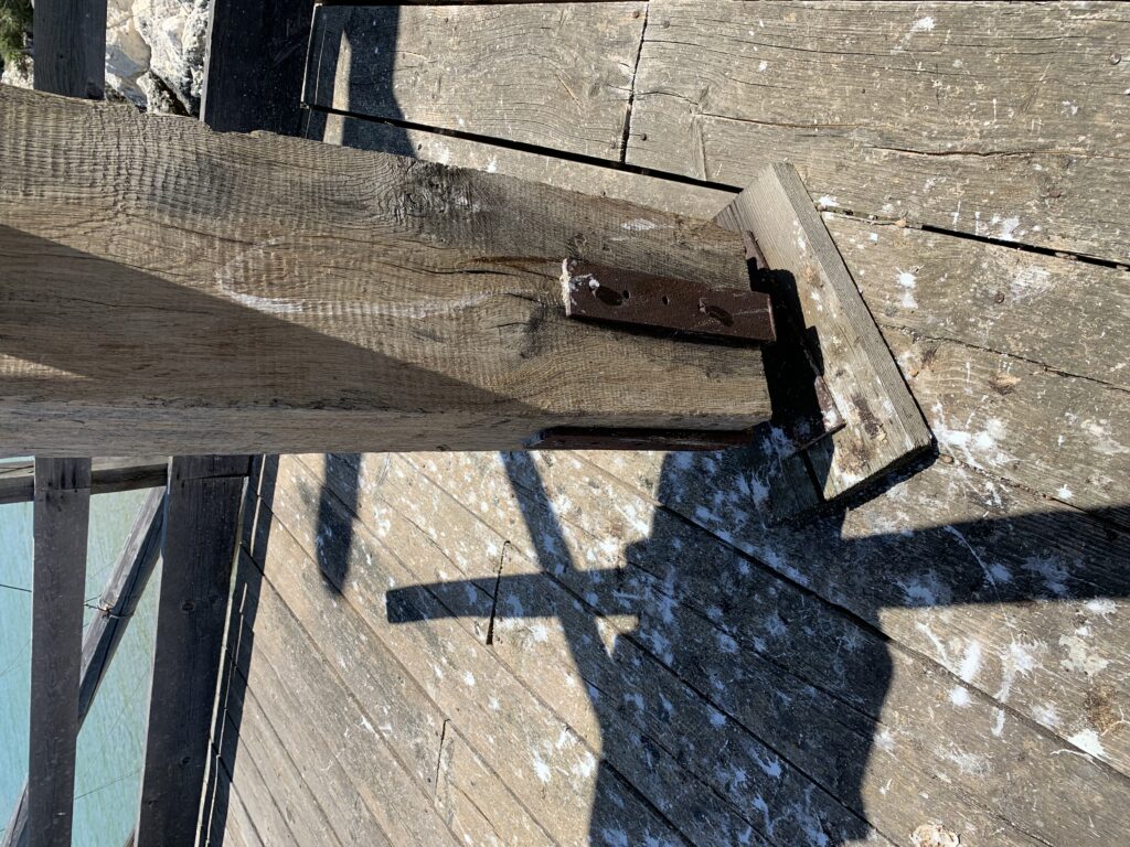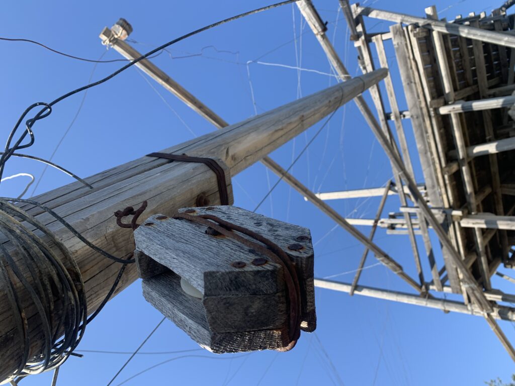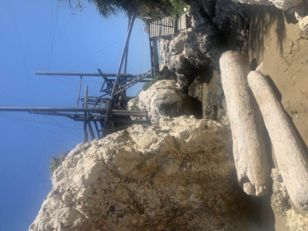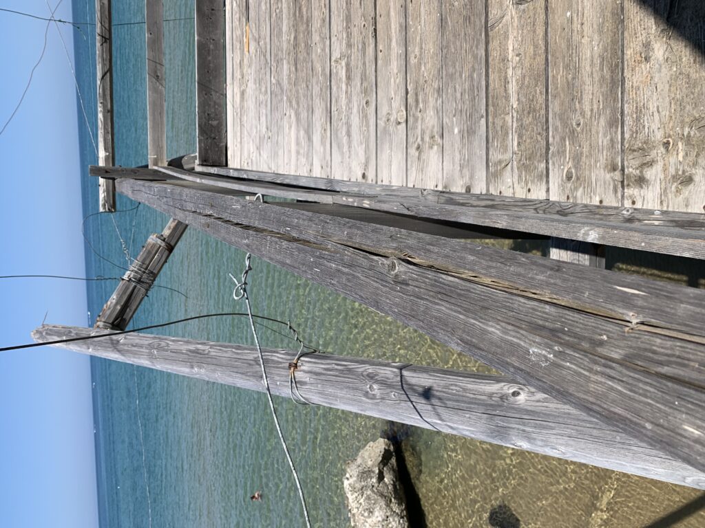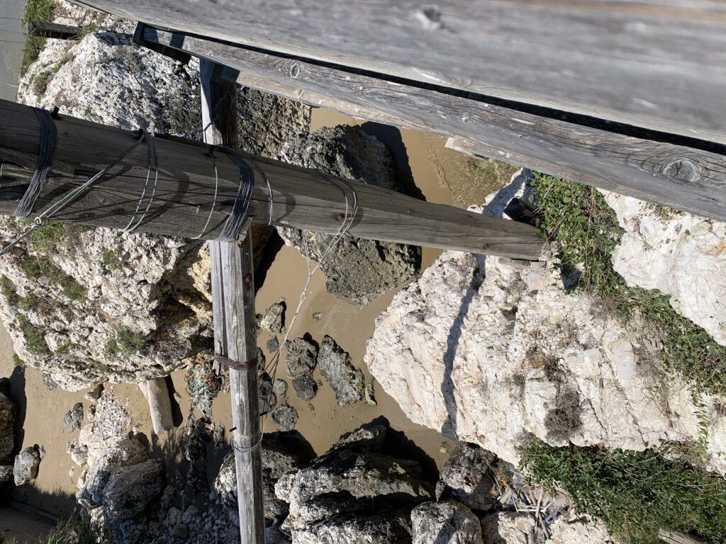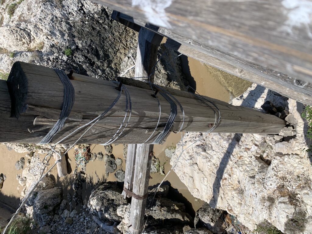“La fissità” visiva della macchina da pesca in legno con dei tiranti metallici è il capoverso, l’inizio di un racconto di una storia dell’economia familiare di scambio e baratto, un tempo, dei pescatori in attesa sul trabocco… L’attesa, lo sguardo su mare per osservare le formazioni dei pesci forse in avvicinamento, si può definire così la pesca stanziale che aspetta le colonie dei pesci, si muovono queste lungo la costa e si riuniscono a volte sotto i trabocchi. Le reti scendono in verticale, la fauna ittica viene imprigionata, e con la stessa rete portate sulla piattaforma in legno. Far cadere dall’alto, questo il significato del “trabucco”. E’ una la rete quadrangolare che scende tenuta ai vertici da lunghi pali che disegnano una forma una crociera. Il trabocco è una architettura spontanea sorta lungo le scogliere, con pali a volte infissi sulle concrezioni rocciose scavate per l’alloggiamento degli stessi pali, e tiranti in ferro per l’iniziale piattaforma che viene ancorata alle rocce, poi è la volta dei lunghi pali detti bracci lignei alla cui estremità è fissata la rete a bilancia. Al centro della piattaforma in legno di pino d’ aleppo, l’argano comanda la discesa della rete a maglie strette con un moto di rotazione intorno al proprio asse verticale. Ponti, pedane, camminamenti e scale di accesso collegano il trabocco alla terra ferma. Nei promontori oppure nelle formazioni rocciose della costa sporgenti verso il mare, in particolare così adatta la morfologia della costa rocciosa del Gargano, i trabocchi trovavano una loro collocazione strutturale ideale. In una economia di sussistenza, scambio e baratto con i prodotti agricoli dell’entroterra, il trabocco ha sostenuto le famiglie dei pescatori stanziali…