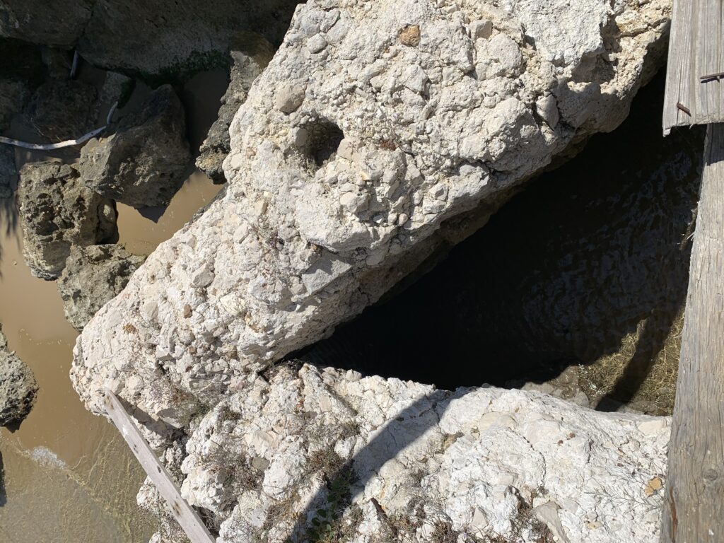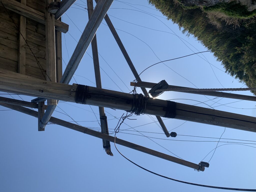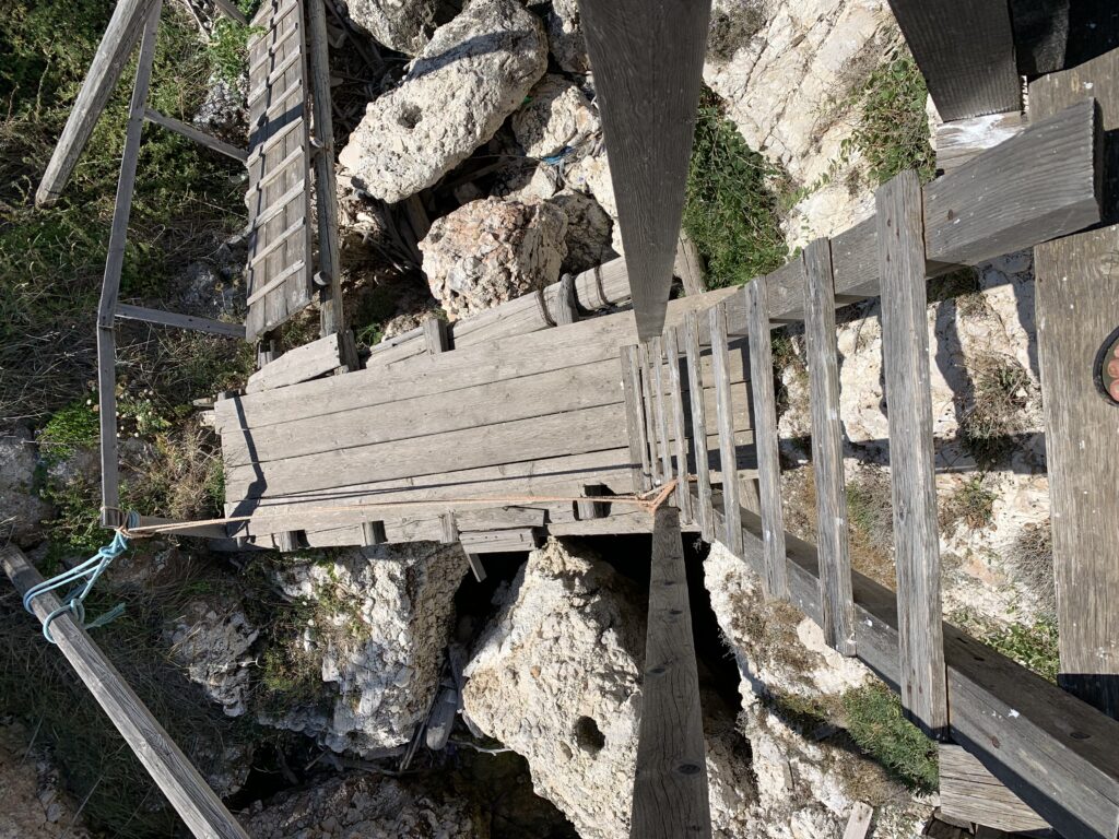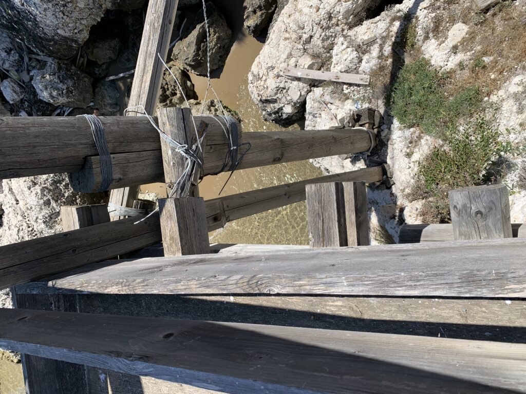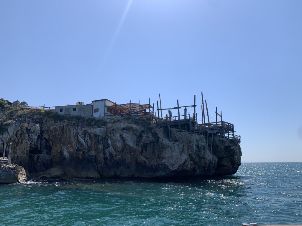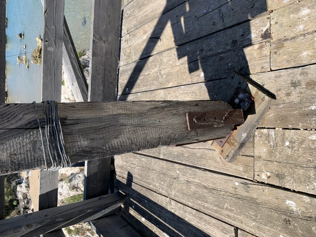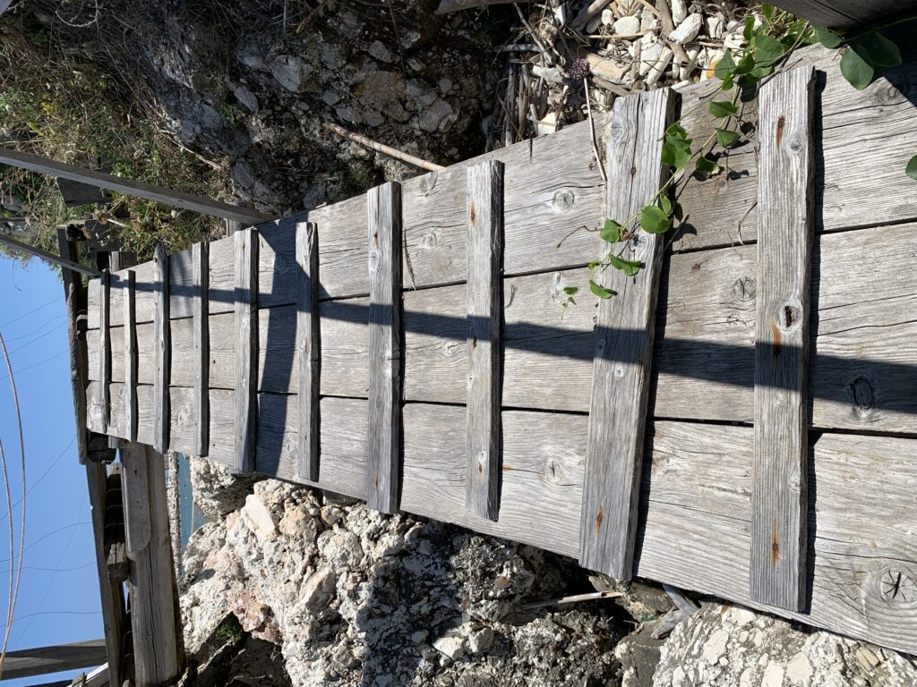 “La fissità” visiva della macchina da pesca in legno con dei tiranti metallici è il capoverso, l’inizio di un racconto di una storia dell’economia familiare di scambio e baratto, un tempo, dei pescatori in attesa sul trabocco… L’attesa, lo sguardo su mare per osservare le formazioni dei pesci forse in avvicinamento, si può definire così la pesca stanziale che aspetta le colonie dei pesci, si muovono queste lungo la costa e si riuniscono a volte sotto i trabocchi. Le reti scendono in verticale, la fauna ittica viene imprigionata, e con la stessa rete portate sulla piattaforma in legno. Far cadere dall’alto, questo il significato del “trabucco”. E’ una la rete quadrangolare che scende tenuta ai vertici da lunghi pali che disegnano una forma una crociera. Il trabocco è una architettura spontanea sorta lungo le scogliere, con pali a volte infissi sulle concrezioni rocciose scavate per l’alloggiamento degli stessi pali, e tiranti in ferro per l’iniziale piattaforma che viene ancorata alle rocce, poi è la volta dei lunghi pali detti bracci lignei alla cui estremità è fissata la rete a bilancia. Al centro della piattaforma in legno di pino d’ aleppo, l’argano comanda la discesa della rete a maglie strette con un moto di rotazione intorno al proprio asse verticale. Ponti, pedane, camminamenti e scale di accesso collegano il trabocco alla terra ferma. Nei promontori oppure nelle formazioni rocciose della costa sporgenti verso il mare, in particolare così adatta la morfologia della costa rocciosa del Gargano, i trabocchi trovavano una loro collocazione strutturale ideale. In una economia di sussistenza, scambio e baratto con i prodotti agricoli dell’entroterra, il trabocco ha sostenuto le famiglie dei pescatori stanziali…