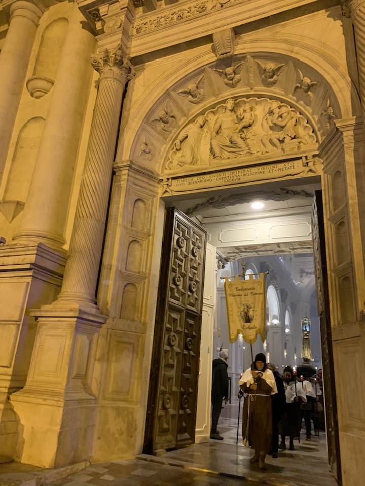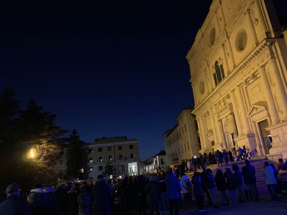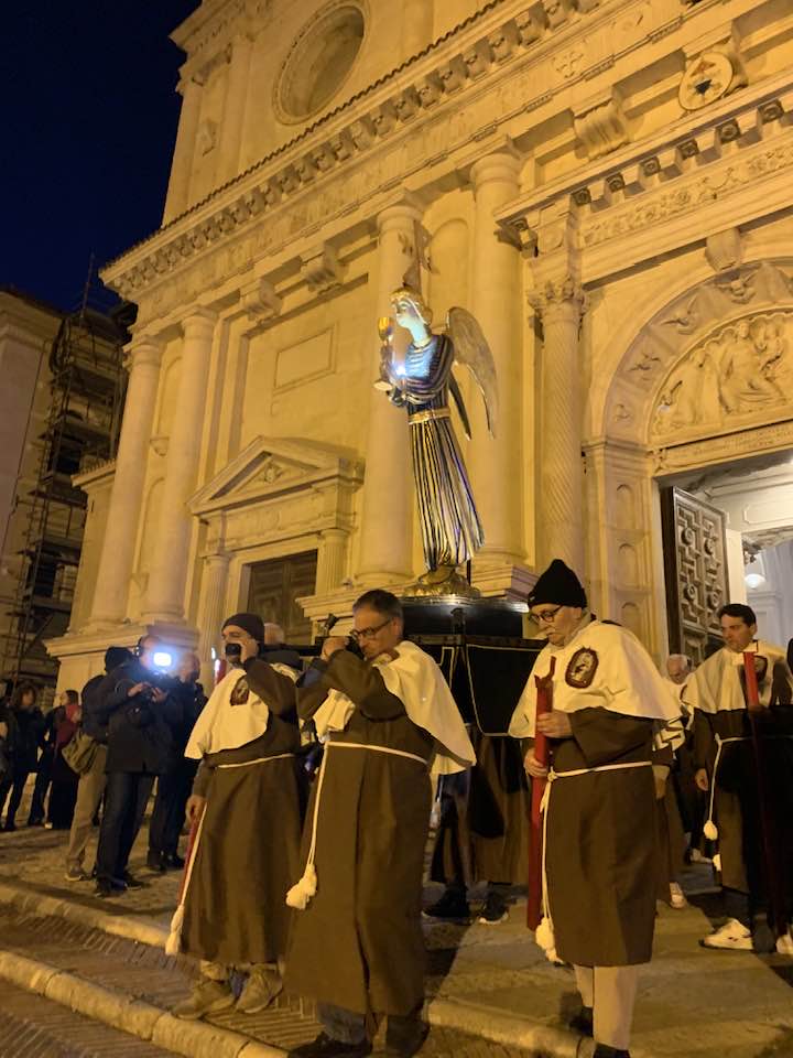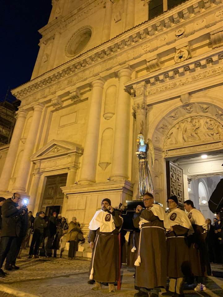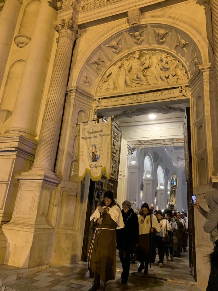 Umiltà, penitenza e devozione – sembra di leggere le Laudi di San Francesco –, il cordone ai fianchi é povertà, il nascondimento di sé è il prerequisito. Si muoveva, la confraternita, a piedi scalzi, molto tempo fa, con stendardi, croci, torce e fiaccole, ma di questo non abbiamo più memoria: Aquila buia e tetra nel suo salmo penitenziale possiamo solo immaginarla. Adesso tutto nella Basilica è scenario nella crudeltà dell’espiazione, tortura e morte nella Processione che si prepara, e che la avvolge con il salmo del Miserere di Saverio Selecchy, cantato o recitato, il dolore pubblico o privato, lamentazione, anche del rammarico…, ma ormai è troppo tardi….