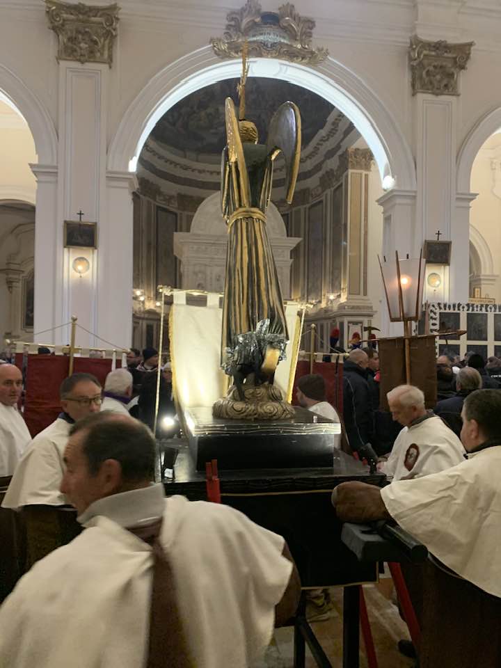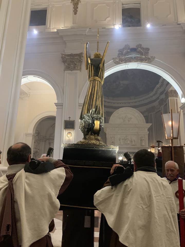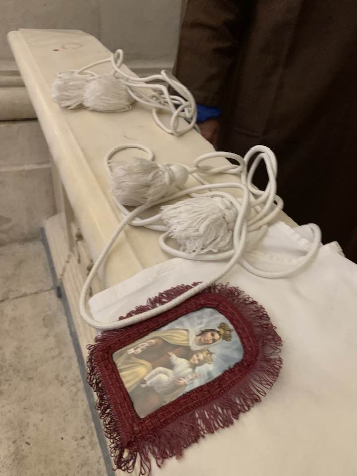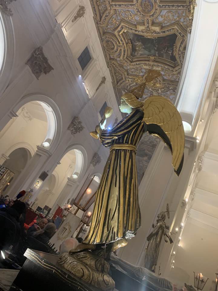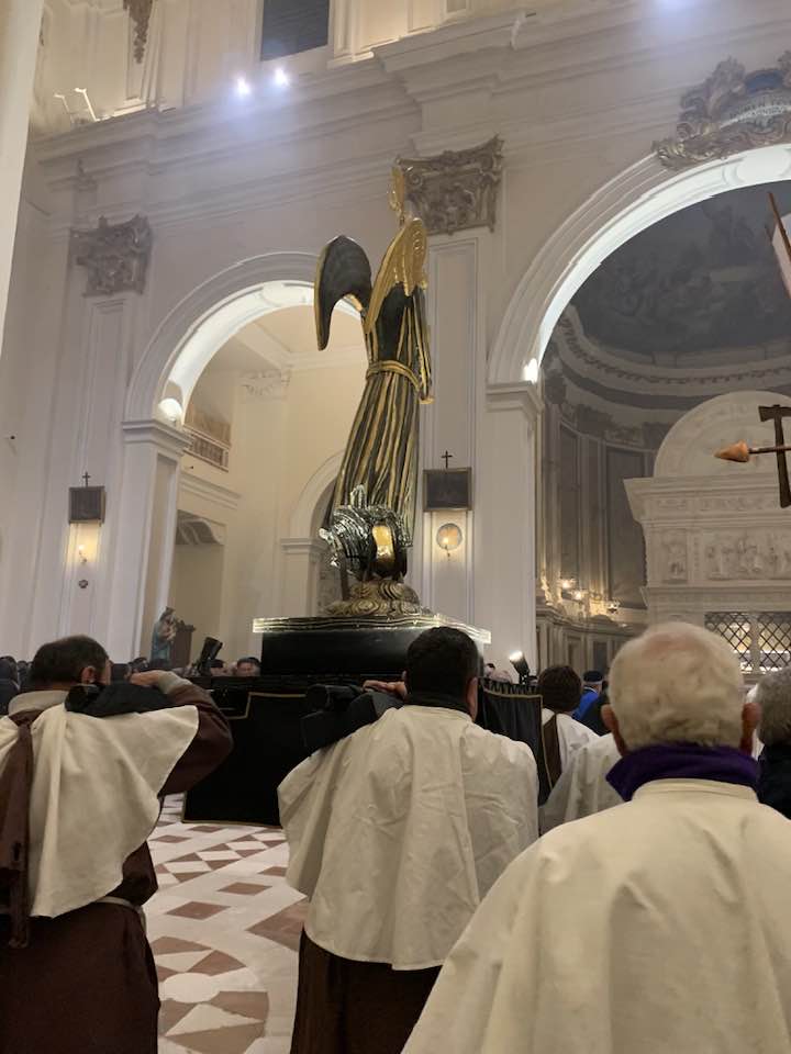 Umiltà, penitenza e devozione – sembra di leggere le Laudi di San Francesco –, il cordone ai fianchi é povertà, il nascondimento di sé è il prerequisito. Si muoveva, la confraternita, a piedi scalzi, molto tempo fa, con stendardi, croci, torce e fiaccole, ma di questo non abbiamo più memoria: Aquila buia e tetra nel suo salmo penitenziale possiamo solo immaginarla. Adesso tutto nella Basilica è scenario nella crudeltà dell’espiazione, tortura e morte nella Processione che si prepara, e che la avvolge con il salmo del Miserere di Saverio Selecchy, cantato o recitato, il dolore pubblico o privato, lamentazione, anche del rammarico…, ma ormai è troppo tardi….
