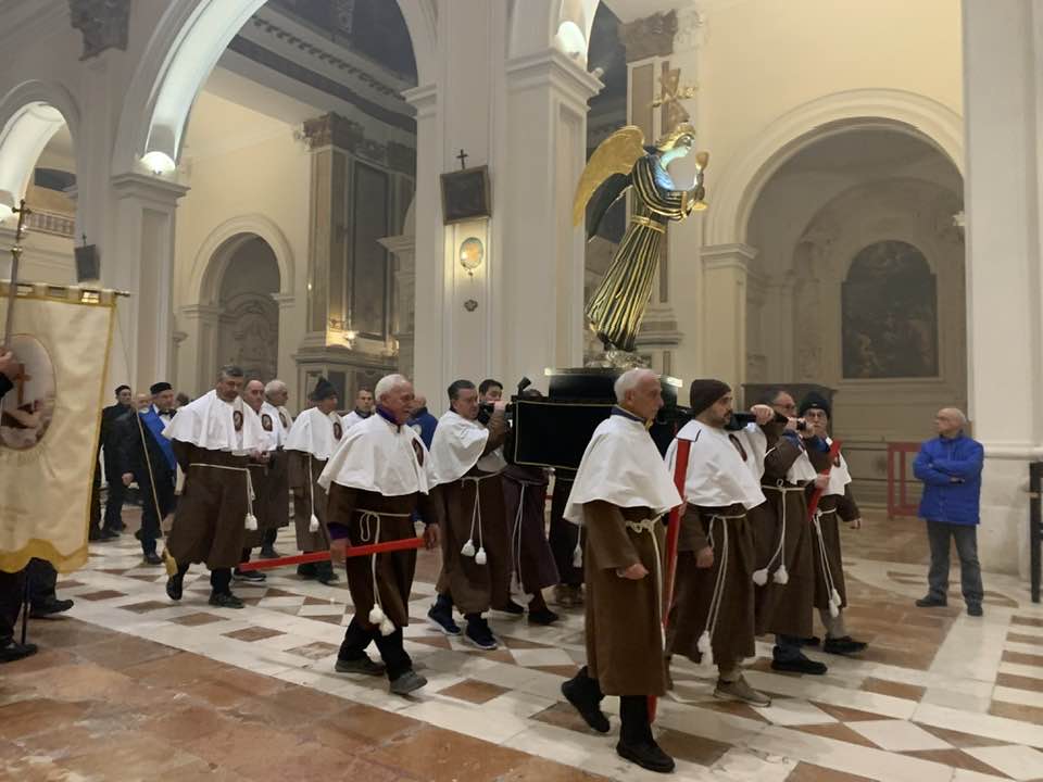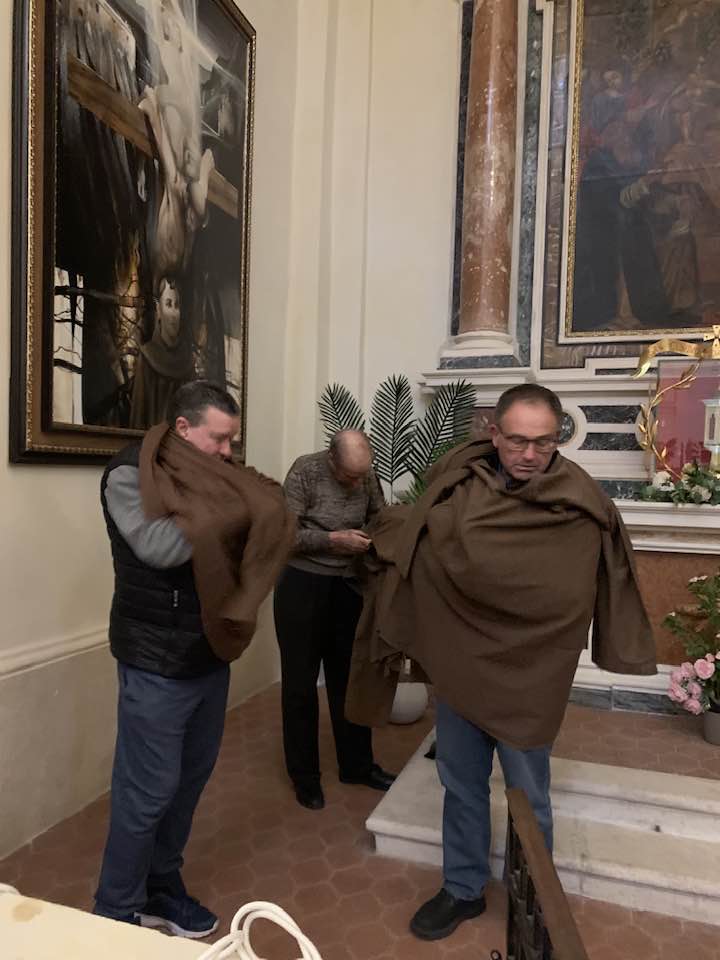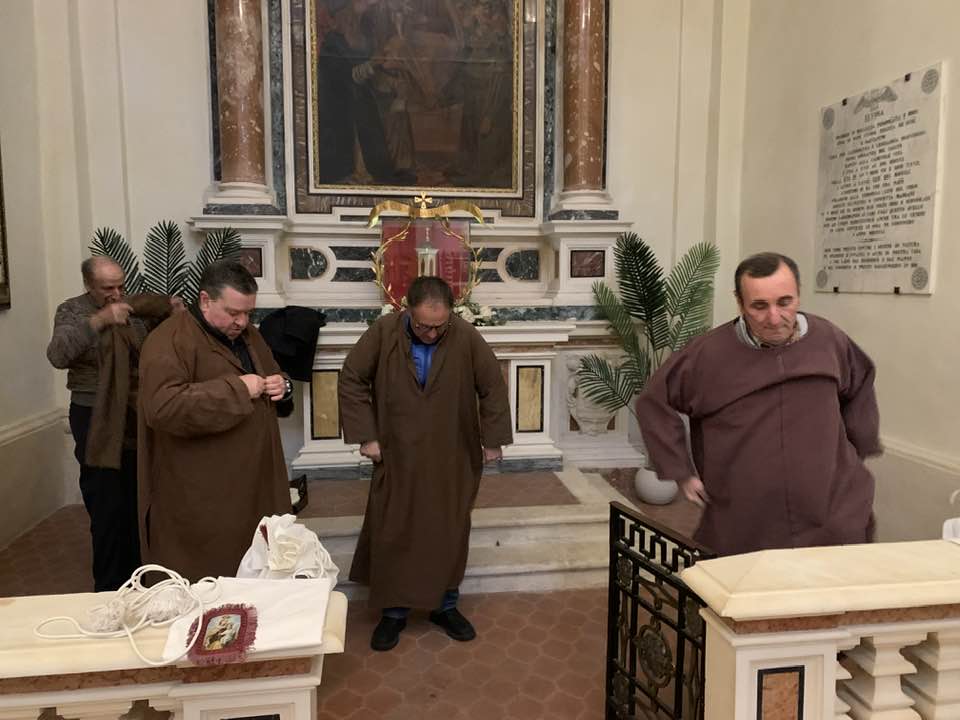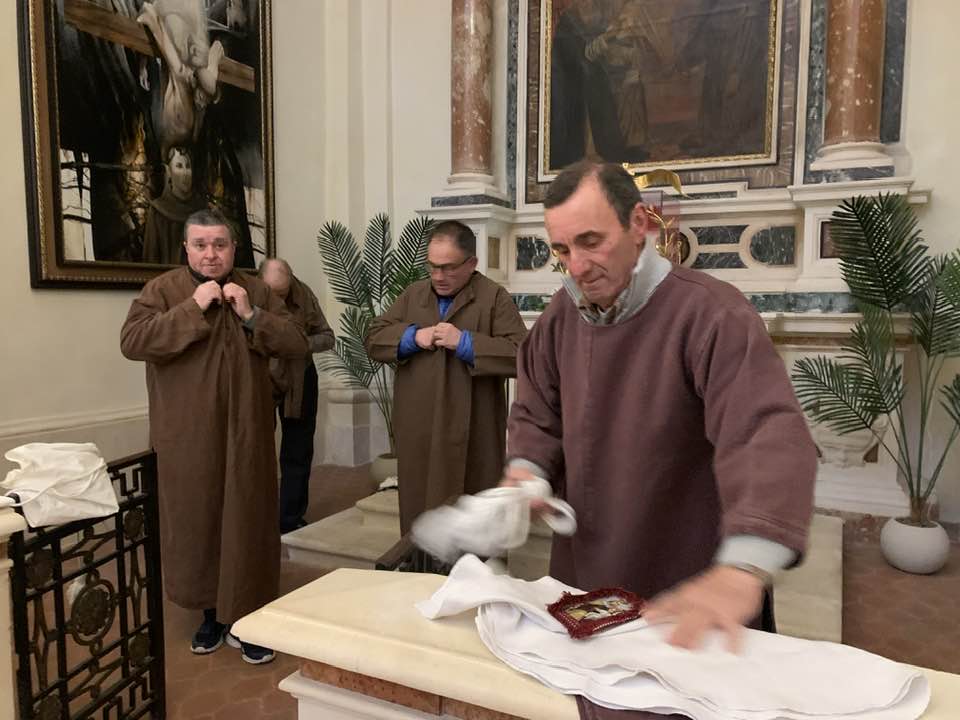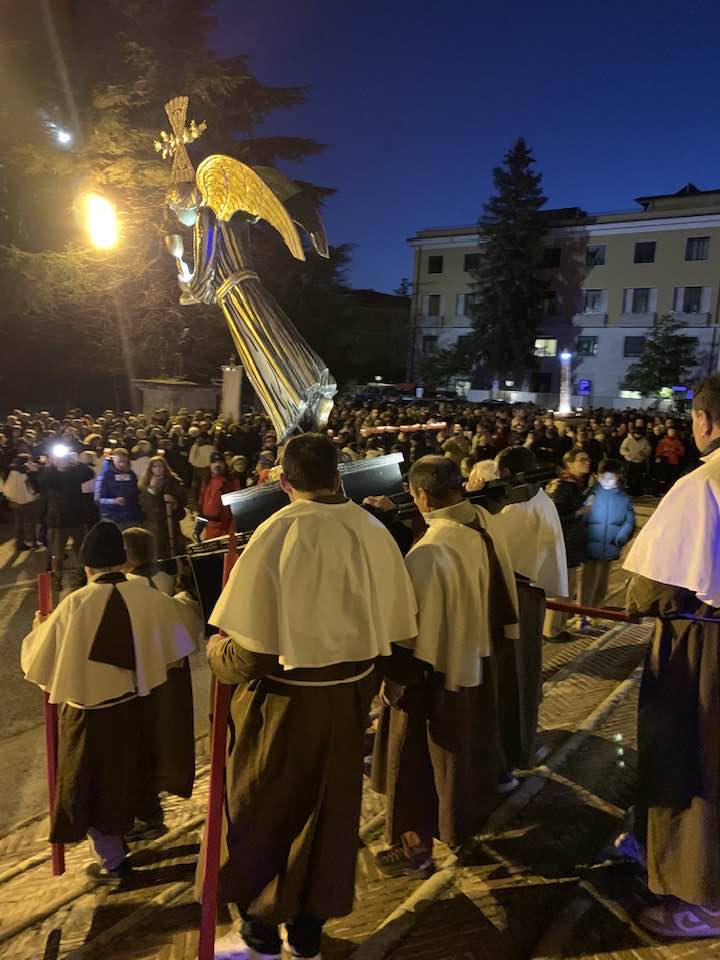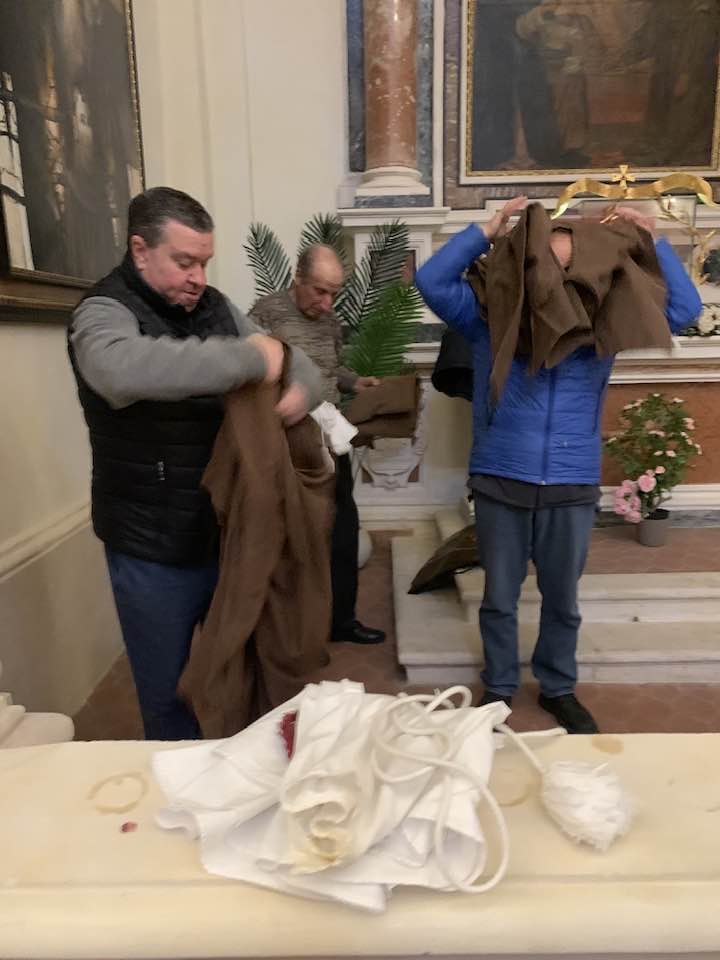 La vestizione, ancora da sottolineare, un rito quindi a sé, indossa il cordoglio e l’identità della penitenza, un principio della “distanza” che accomuna le confraternite con la società conosciuta, un rito che resta “altro” e misterico: è il valore culturale e spirituale non negoziabile della tradizione cristiana che protegge il perimetro della processione dove, nell’oltre, non c’è nulla, non c’è salvezza, se non nella “Passione”. L’abito del “sacco” e della mozzetta, quindi, i gesti lenti nella tunica, il cordone, l’emblema simbolo della confraternita: separazione sociale, il dogma per l’espiazione, e loro, i contadini, i poveri e gli esclusi, i mendicanti e gli emarginati – venivano accettati dalla confraternita senza porre requisiti – gli artigiani, i lavoratori della terra ma molti decenni fa, mentre il censo aquilano, la nobiltà molto vicina alla Chiesa della Curia, distinta e distante da quel mondo del popolo minore, sceglieva di portare il catafalco ligneo dipinto di nero del Cristo Morto, coperto da un velo, come peso della loro penitenza, ma forse non dei loro peccati…