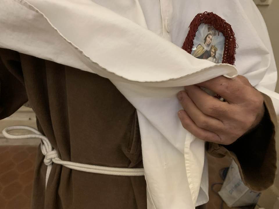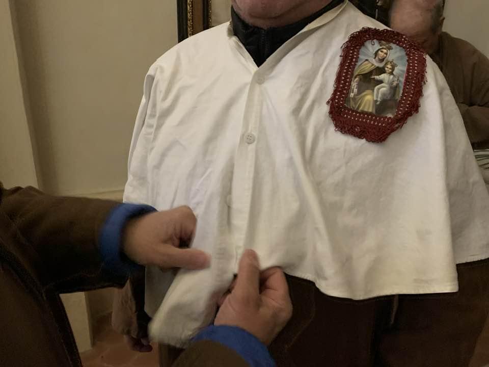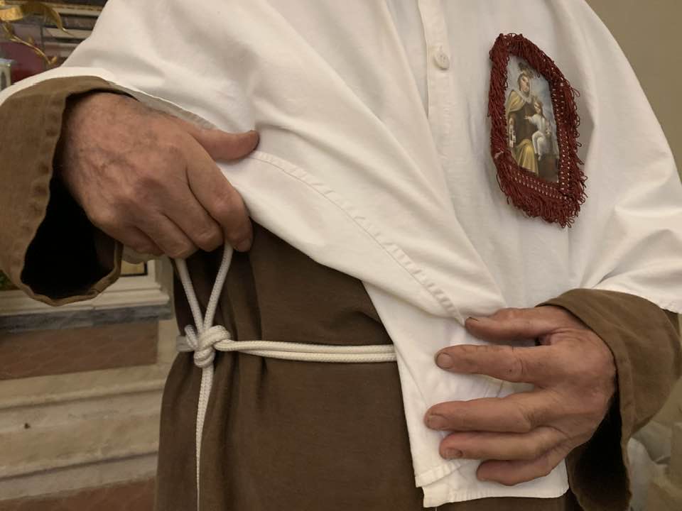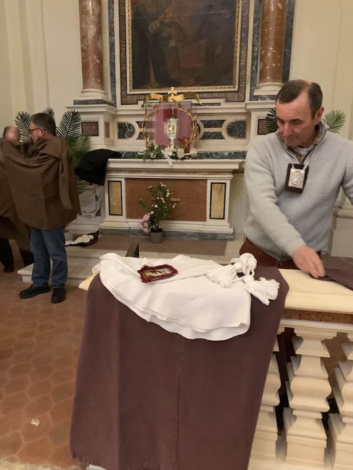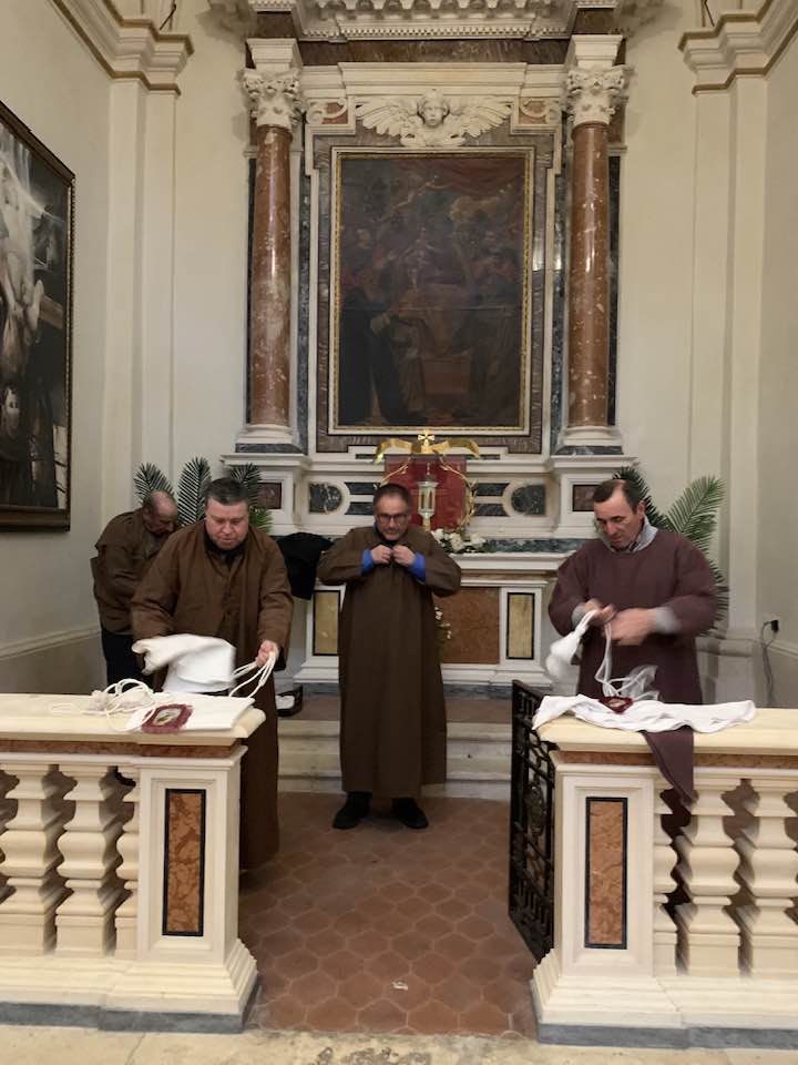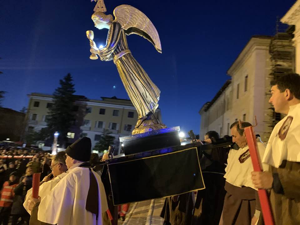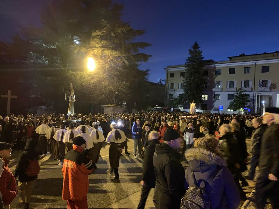 La vestizione, ancora da sottolineare, un rito quindi a sé, indossa il cordoglio e l’identità della penitenza, un principio della “distanza” che accomuna le confraternite con la società conosciuta, un rito che resta “altro” e misterico: è il valore culturale e spirituale non negoziabile della tradizione cristiana che protegge il perimetro della processione dove, nell’oltre, non c’è nulla, non c’è salvezza, se non nella “Passione”. L’abito del “sacco” e della mozzetta, quindi, i gesti lenti nella tunica, il cordone, l’emblema simbolo della confraternita: separazione sociale, il dogma per l’espiazione, e loro, i contadini, i poveri e gli esclusi, i mendicanti e gli emarginati – venivano accettati dalla confraternita senza porre requisiti – gli artigiani, i lavoratori della terra ma molti decenni fa, mentre il censo aquilano, la nobiltà molto vicina alla Chiesa della Curia, distinta e distante da quel mondo del popolo minore, sceglieva di portare il catafalco ligneo dipinto di nero del Cristo Morto, coperto da un velo, come peso della loro penitenza, ma forse non dei loro peccati…