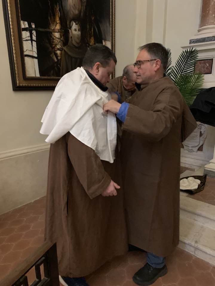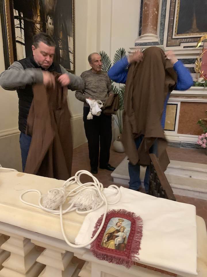La “Vestizione” della Confraternita della Madonna del Carmine nella Basilica di San Bernardino, prima della Processione del Venerdì Santo a L’Aquila. Tra le navate laterali ci si spoglia degli abiti dell’identità civile, un atto che declina nel rito della “Vestizione”, e si compie, con il “passaggio” in quella “appartenenza” della missione laica, solenne, poiché le origini risalgono alle prime comunità cristiane sviluppatesi nel Medioevo. Rito intimo, carico di simbolismo, atto di fede, la “Vestizione” della confraternita: la soglia è varcata, il “passaggio” quindi è adesso. La mozzetta, il medaglione del culto, il cappuccio – immaginiamo – che un tempo lasciava solo i fori per gli occhi, simboleggia il nascondimento. Carità e umiltà si confrontano in una “sostanza” senza volto, ma solo “ombre” che si uniscono, illuminate, a tratti, dalle fiaccole. I visi coperti, quindi, poiché quel tipo di umanità è il cardine della Misericordia che non può avere sembianze, ma solo il principio dell’unità dietro i Misteri portati a spalla.