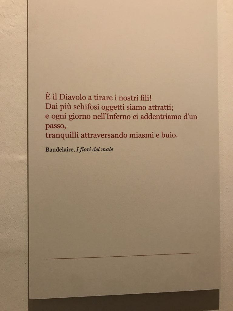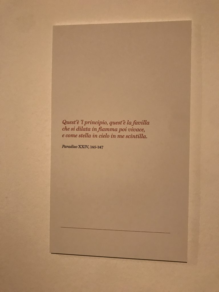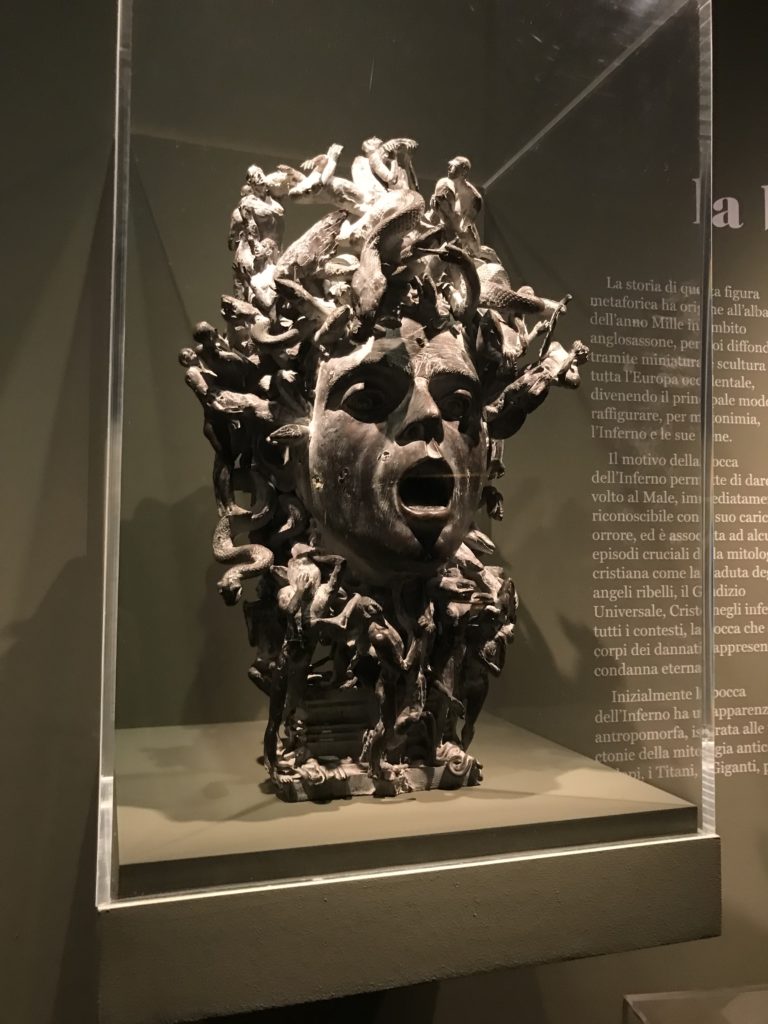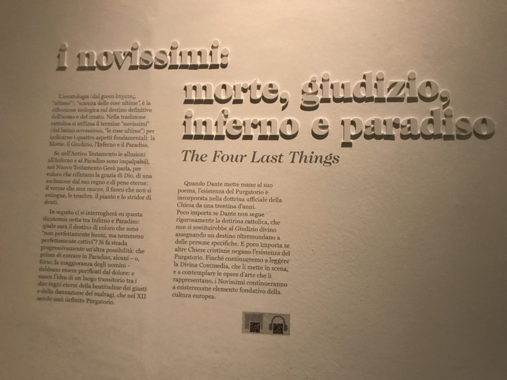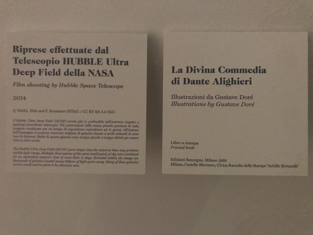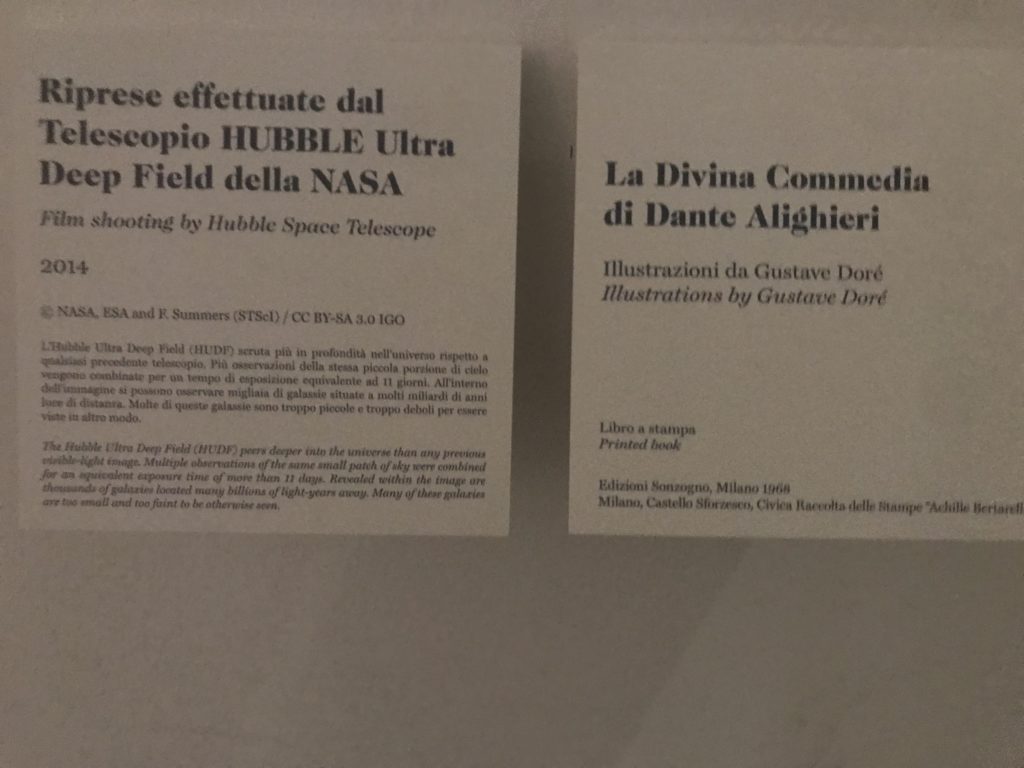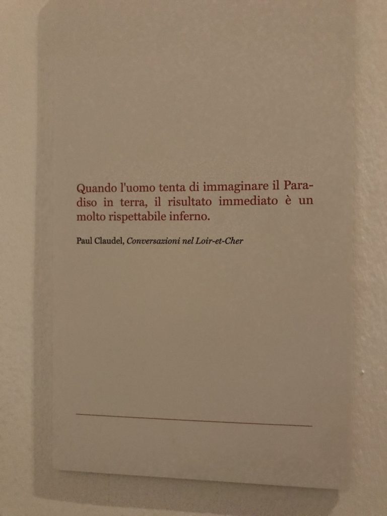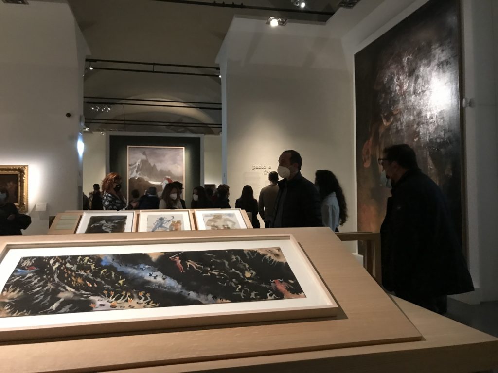 Le sezioni della mostra propongono, per esempio, dal Cristianesimo all’Umanesimo la liberazione poetica, gli incubi, l’Assoluto e Dio, la nuova Umanità. I pezzi esposti e la loro forza nella visione apocalittica. “Convensi dipartir da tanto male” è la frase che Virgilio impartisce a Dante, il viatico dopo l’incontro con Lucifero  prima di salire l’angusta via d’uscita per lasciare l’Inferno, che sancisce il carico di angoscia e prostrazione dei due personaggi. Ma poi lo stesso Dante, nell’epistola a Cangrande della Scala, in un estremo atto di pietas, scrive:” “Strappare l’anima dei viventi dalla condizione di incompiutezza e accompagnarli allo stato di grazia” in uno scatto morale di redenzione che corre in aiuto, anche contro le sue stesse Cantiche, poiché vuole far accedere quelle genti ad una più umana ragione universale di felicità.