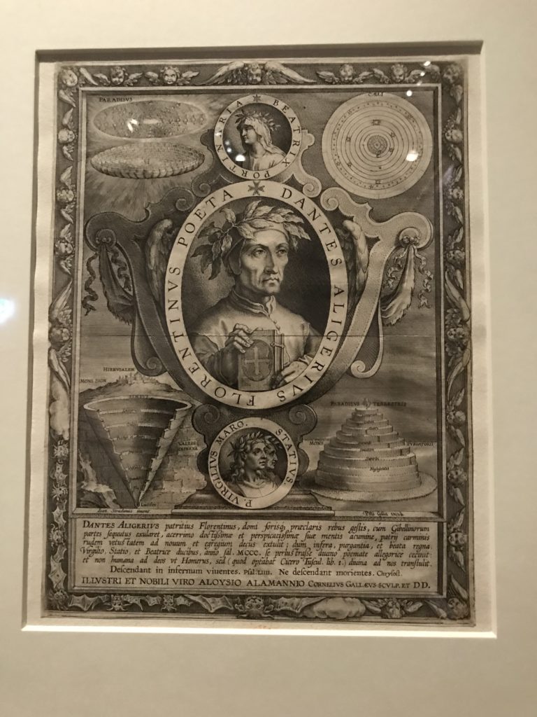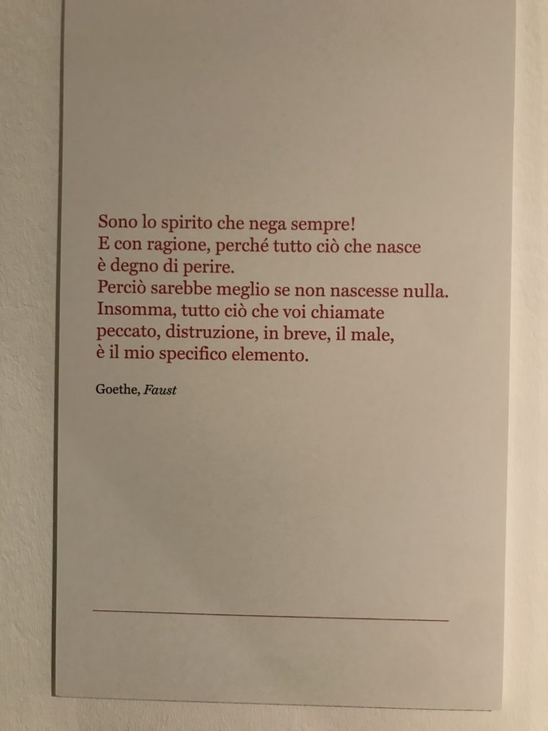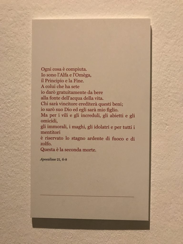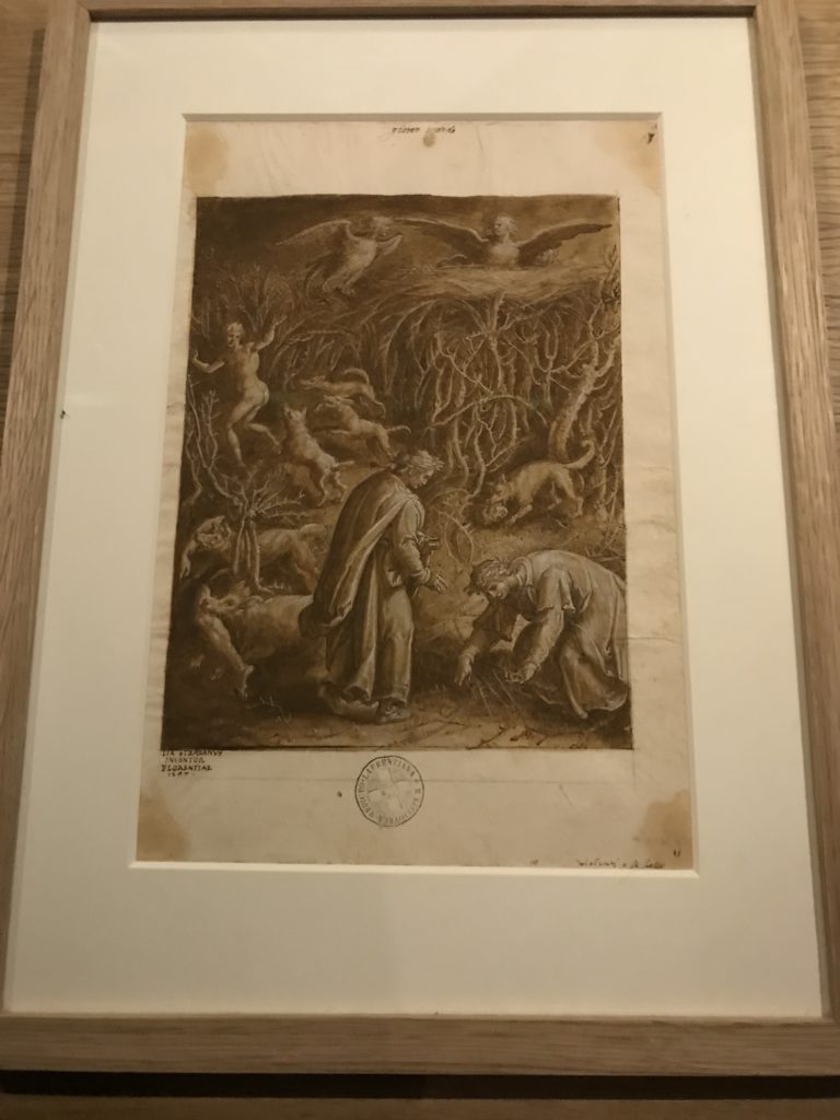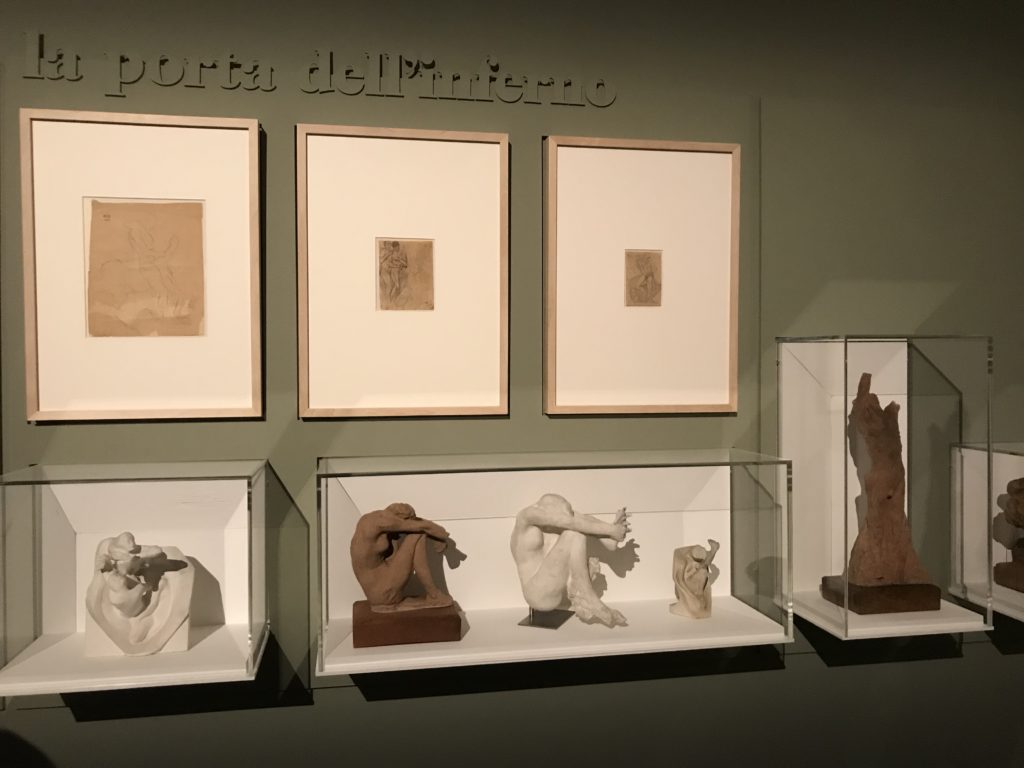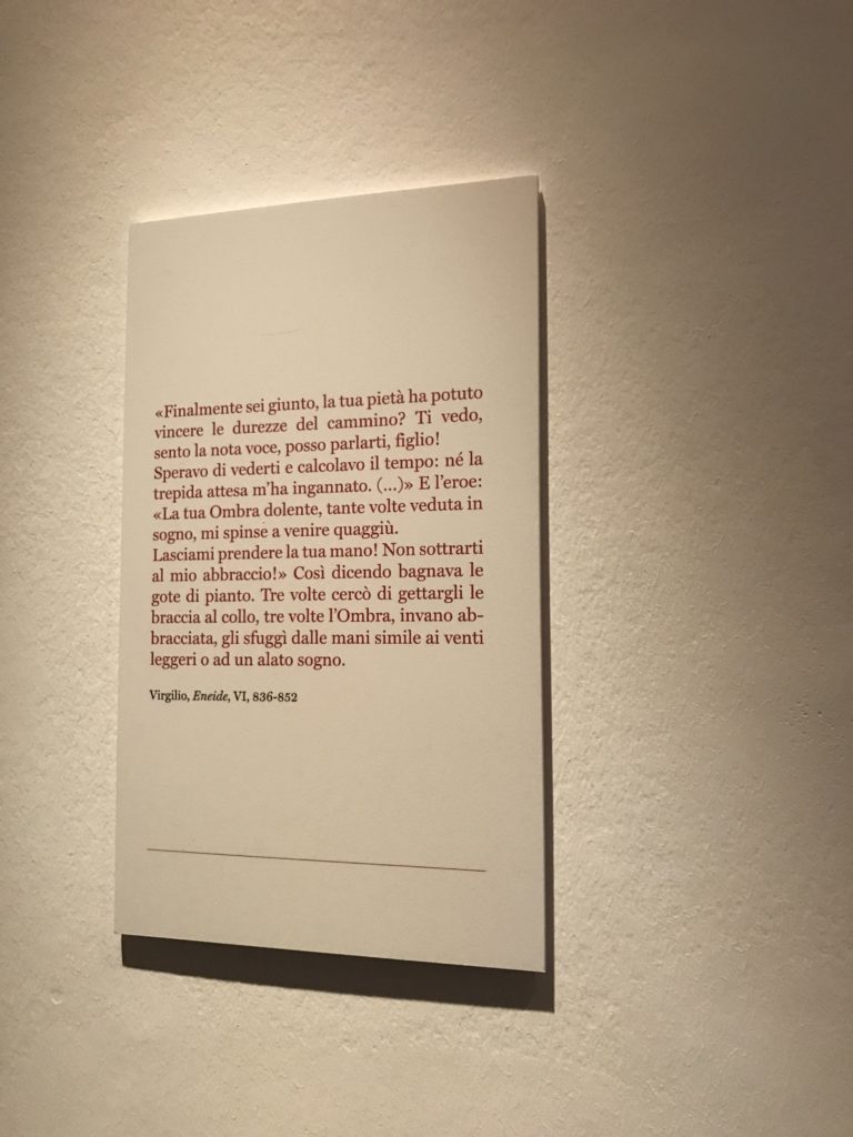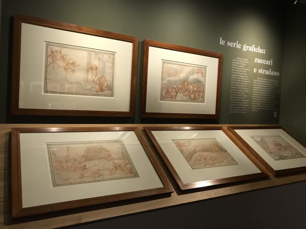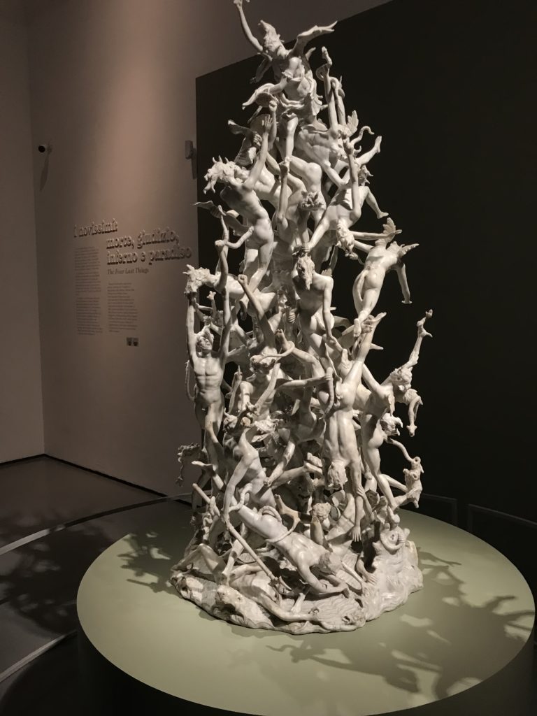 Le sezioni della mostra propongono, per esempio, dal Cristianesimo all’Umanesimo la liberazione poetica, gli incubi, l’Assoluto e Dio, la nuova Umanità. I pezzi esposti e la loro forza nella visione apocalittica. “Convensi dipartir da tanto male” è la frase che Virgilio impartisce a Dante, il viatico dopo l’incontro con Lucifero  prima di salire l’angusta via d’uscita per lasciare l’Inferno, che sancisce il carico di angoscia e prostrazione dei due personaggi. Ma poi lo stesso Dante, nell’epistola a Cangrande della Scala, in un estremo atto di pietas, scrive:” “Strappare l’anima dei viventi dalla condizione di incompiutezza e accompagnarli allo stato di grazia” in uno scatto morale di redenzione che corre in aiuto, anche contro le sue stesse Cantiche, poiché vuole far accedere quelle genti ad una più umana ragione universale di felicità.