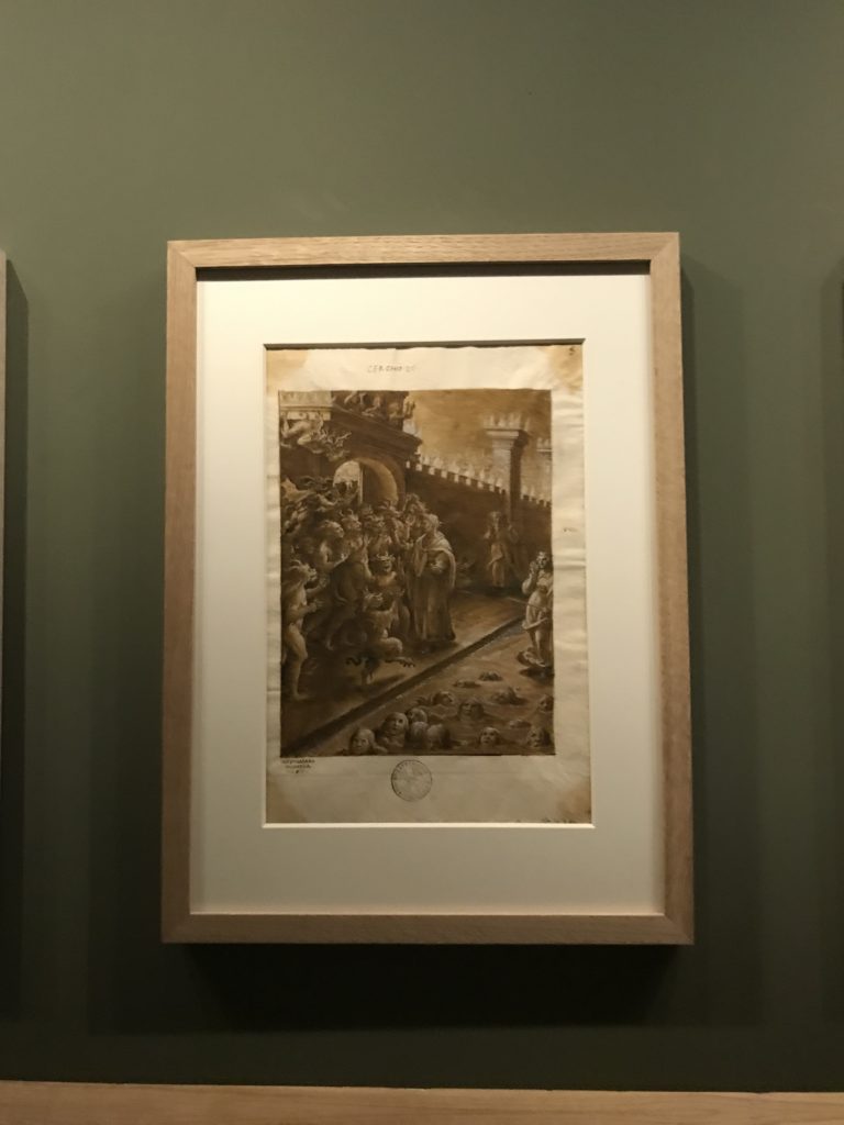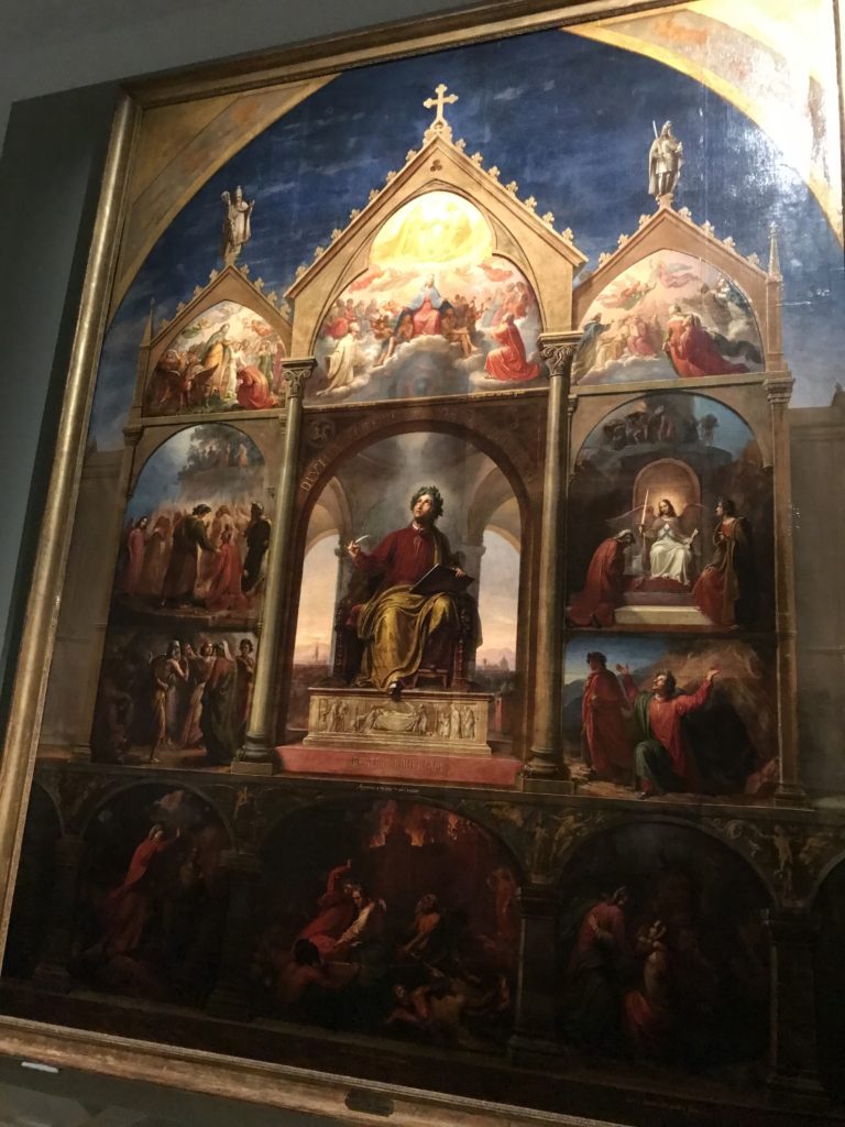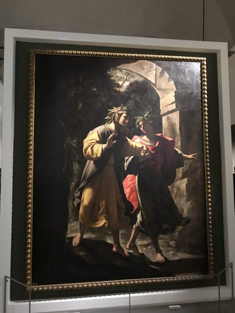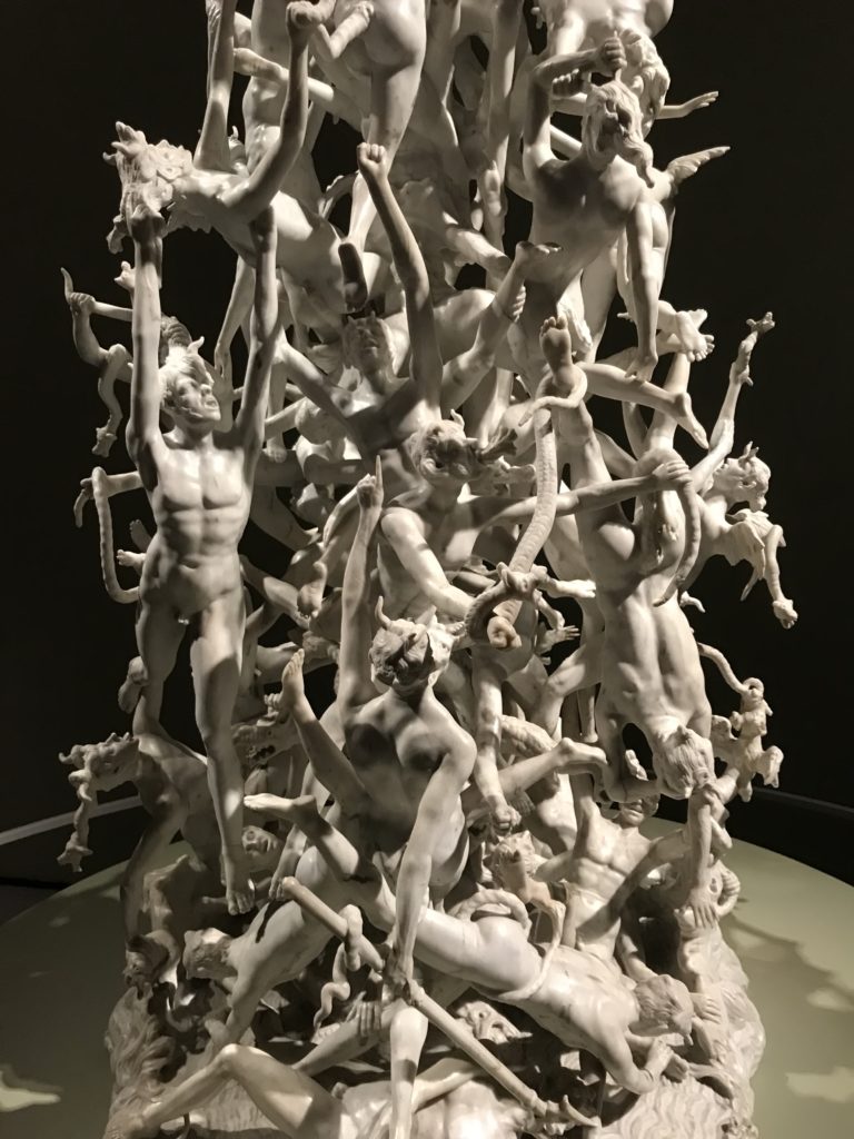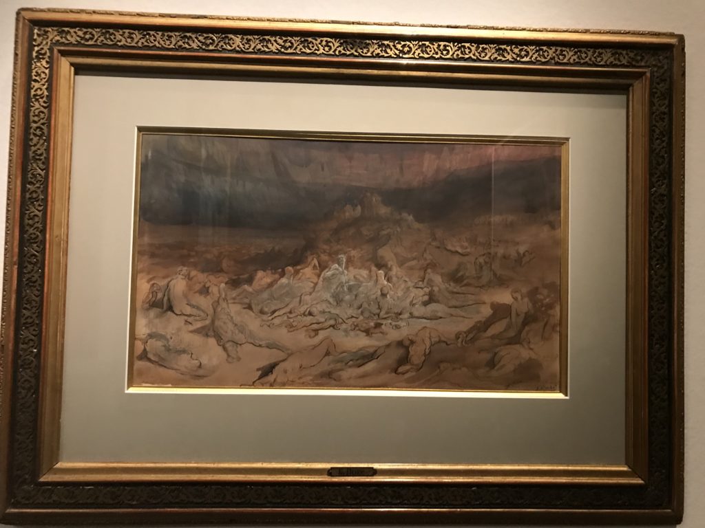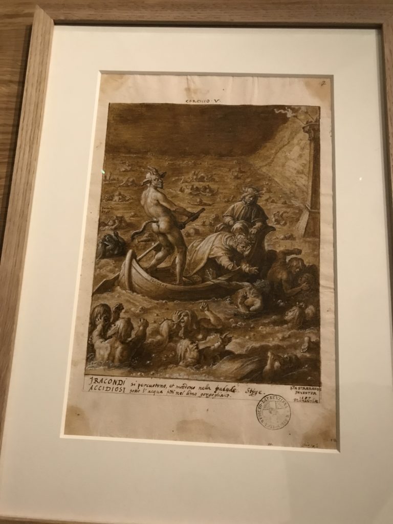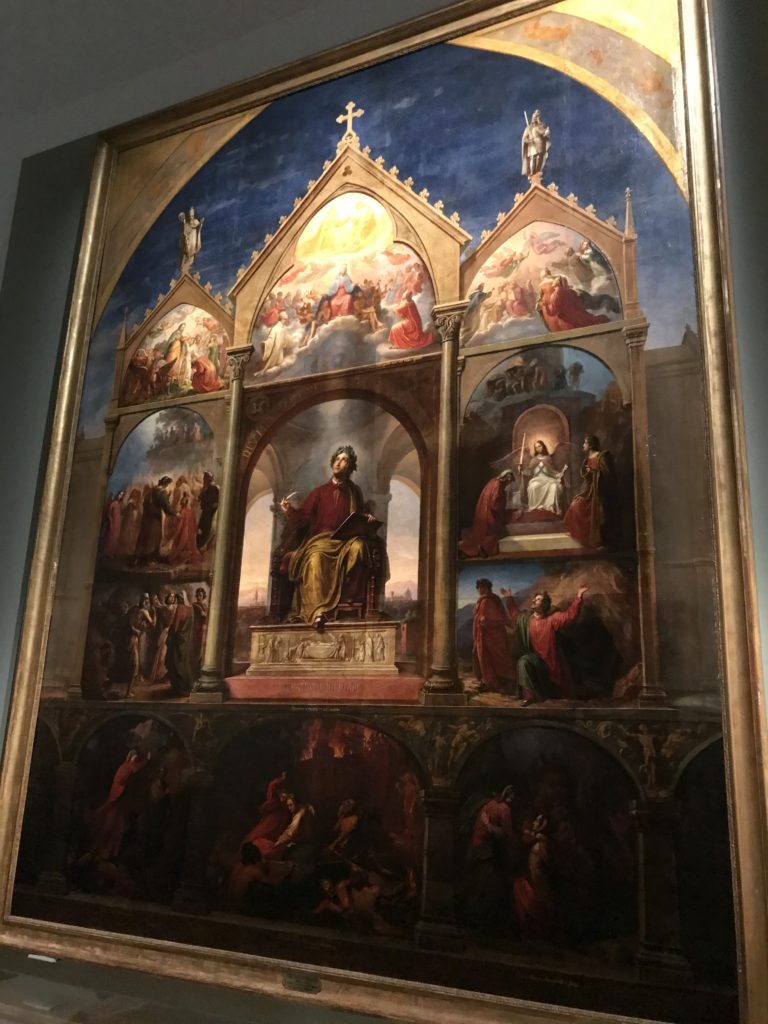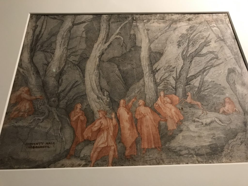 Le sezioni della mostra propongono, per esempio, dal Cristianesimo all’Umanesimo la liberazione poetica, gli incubi, l’Assoluto e Dio, la nuova Umanità. I pezzi esposti e la loro forza nella visione apocalittica. “Convensi dipartir da tanto male” è la frase che Virgilio impartisce a Dante, il viatico dopo l’incontro con Lucifero  prima di salire l’angusta via d’uscita per lasciare l’Inferno, che sancisce il carico di angoscia e prostrazione dei due personaggi. Ma poi lo stesso Dante, nell’epistola a Cangrande della Scala, in un estremo atto di pietas, scrive:” “Strappare l’anima dei viventi dalla condizione di incompiutezza e accompagnarli allo stato di grazia” in uno scatto morale di redenzione che corre in aiuto, anche contro le sue stesse Cantiche, poiché vuole far accedere quelle genti ad una più umana ragione universale di felicità.