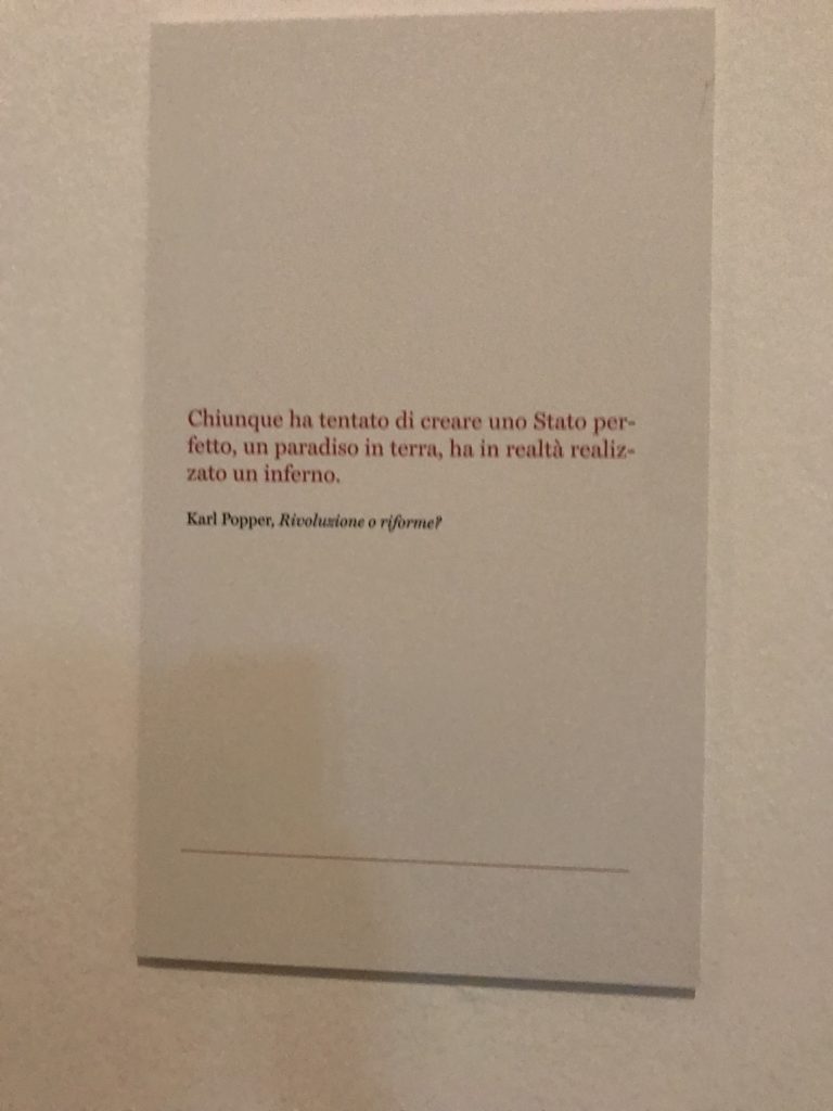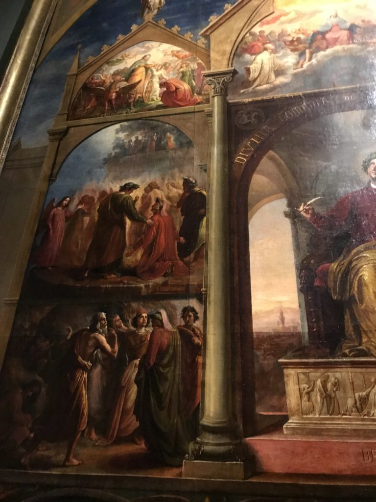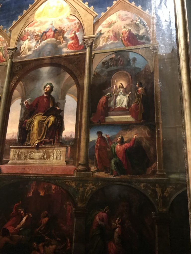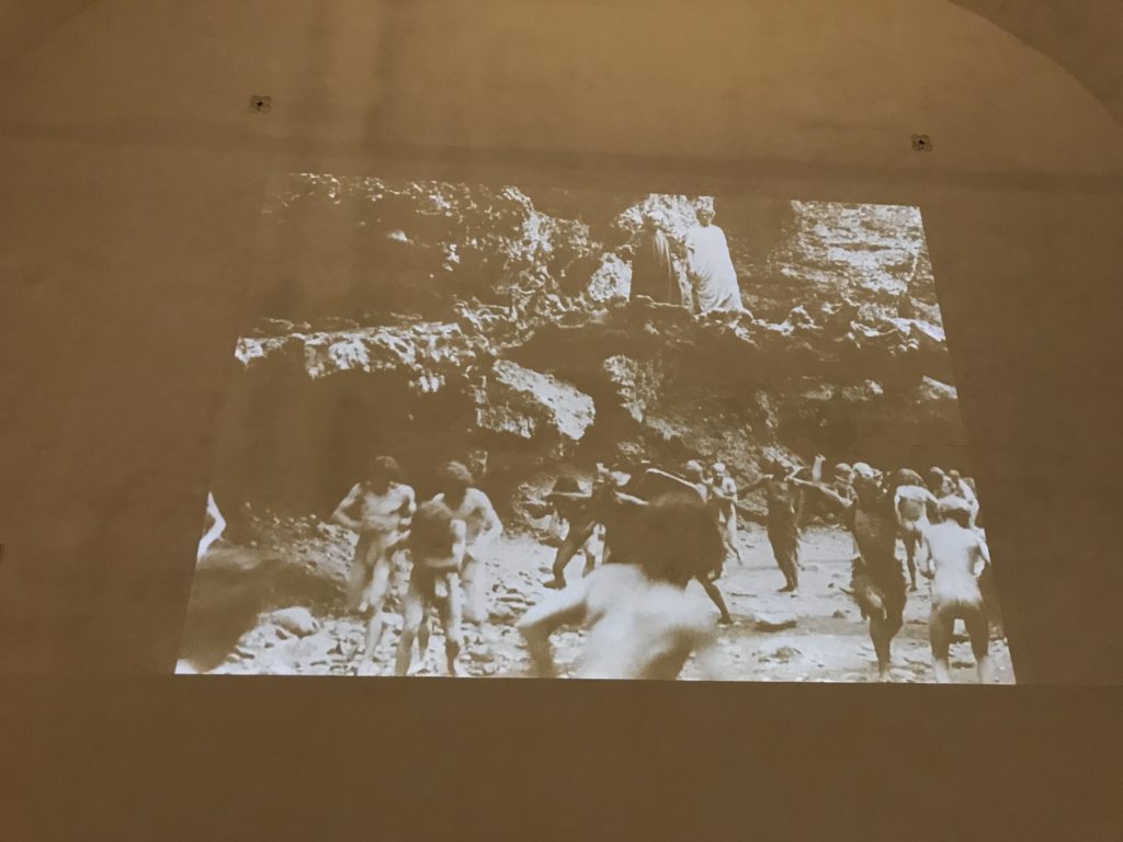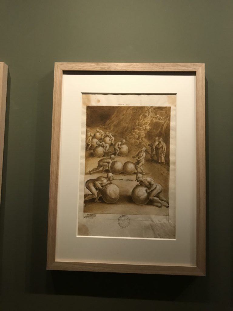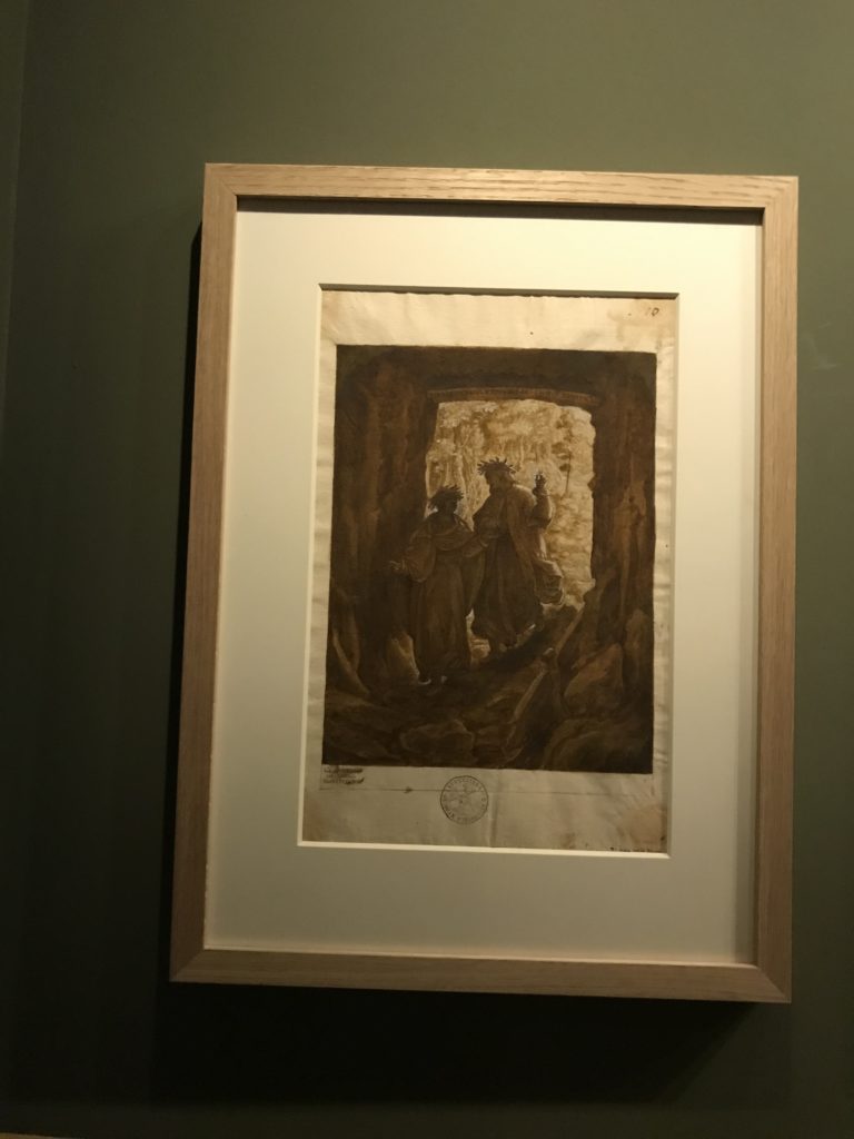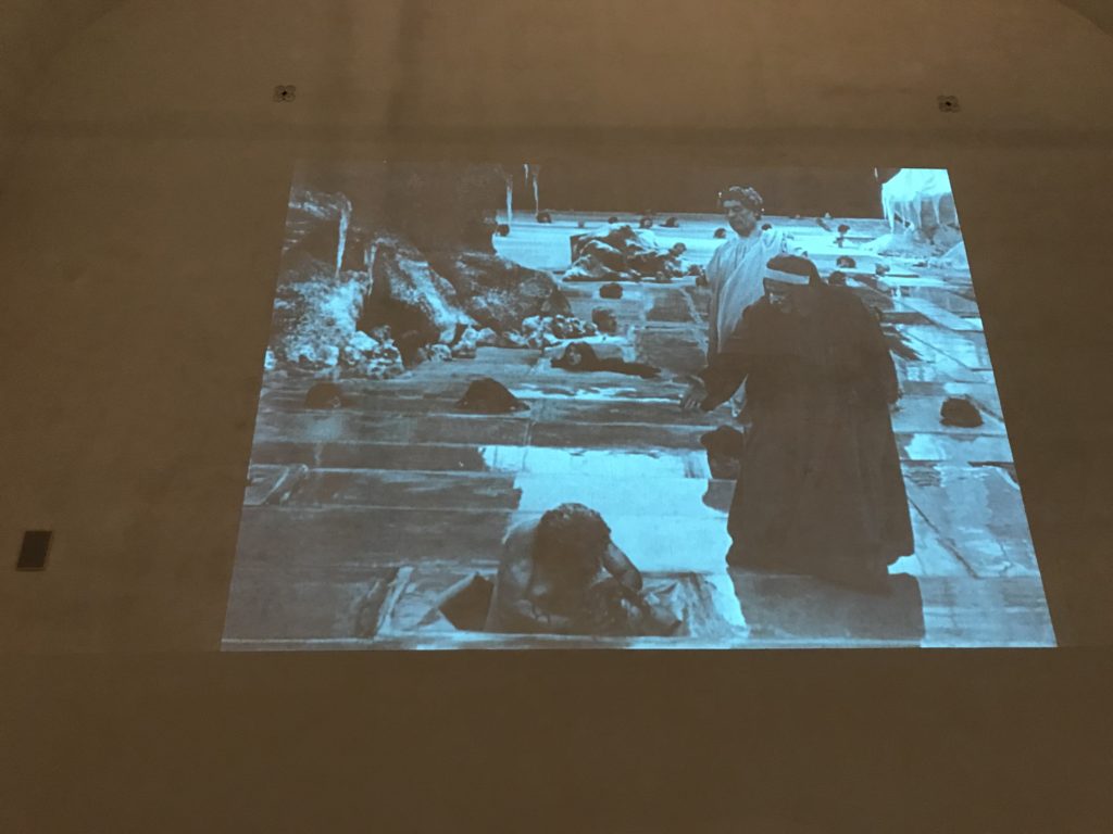 Le sezioni della mostra propongono, per esempio, dal Cristianesimo all’Umanesimo la liberazione poetica, gli incubi, l’Assoluto e Dio, la nuova Umanità. I pezzi esposti e la loro forza nella visione apocalittica. “Convensi dipartir da tanto male” è la frase che Virgilio impartisce a Dante, il viatico dopo l’incontro con Lucifero  prima di salire l’angusta via d’uscita per lasciare l’Inferno, che sancisce il carico di angoscia e prostrazione dei due personaggi. Ma poi lo stesso Dante, nell’epistola a Cangrande della Scala, in un estremo atto di pietas, scrive:” “Strappare l’anima dei viventi dalla condizione di incompiutezza e accompagnarli allo stato di grazia” in uno scatto morale di redenzione che corre in aiuto, anche contro le sue stesse Cantiche, poiché vuole far accedere quelle genti ad una più umana ragione universale di felicità.