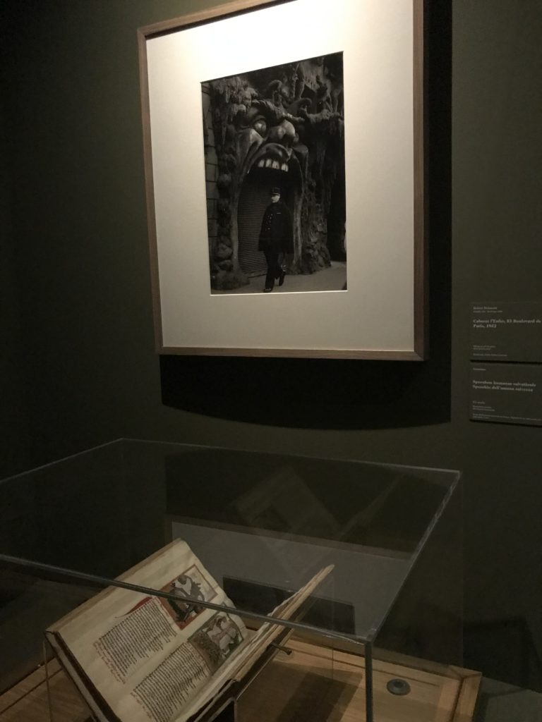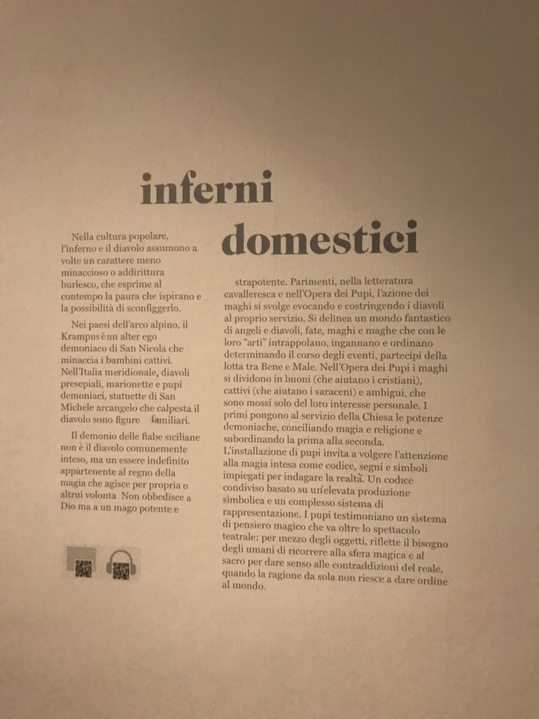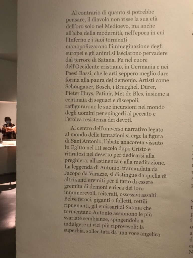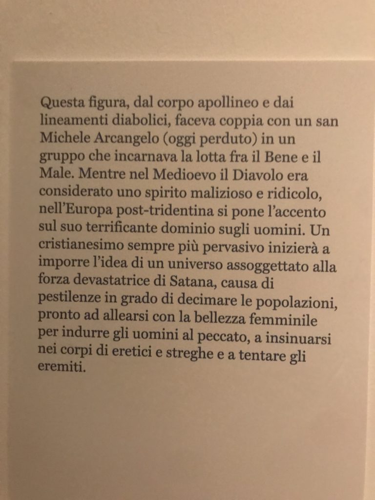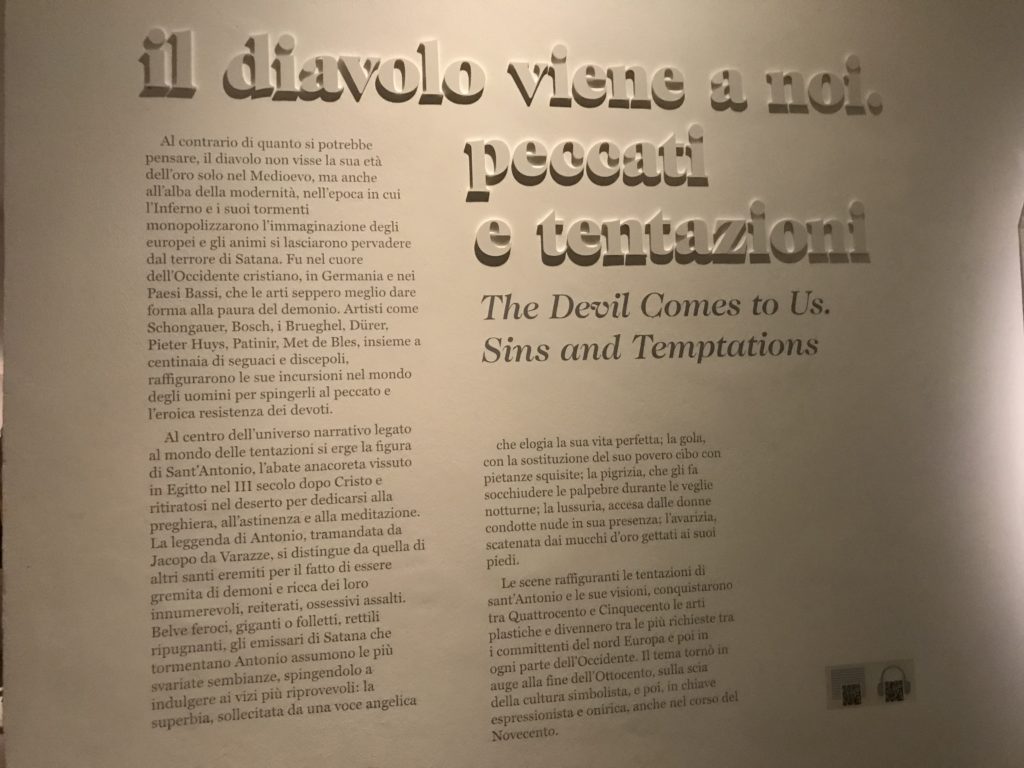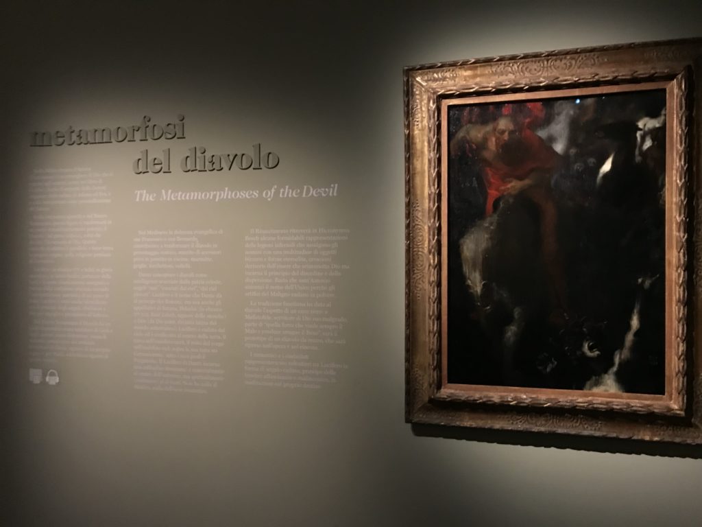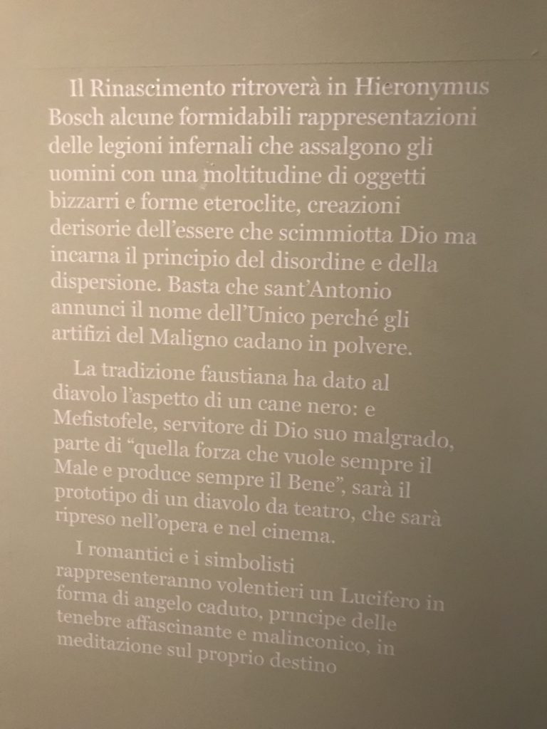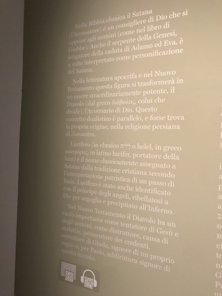 L’incontro con l’universo satanico, l’iconografia infernale, il mondo come lo vediamo e la sua distruzione, sono sintetizzati, nella mostra, nei cupi avvertimenti di cui si fa carico la pittura, la scultura, film, allestimenti, libri e oggetti, miniature medievali, teatrini del male, stampe e grafica fino alle interpretazioni psichiatriche del mistero del Male.