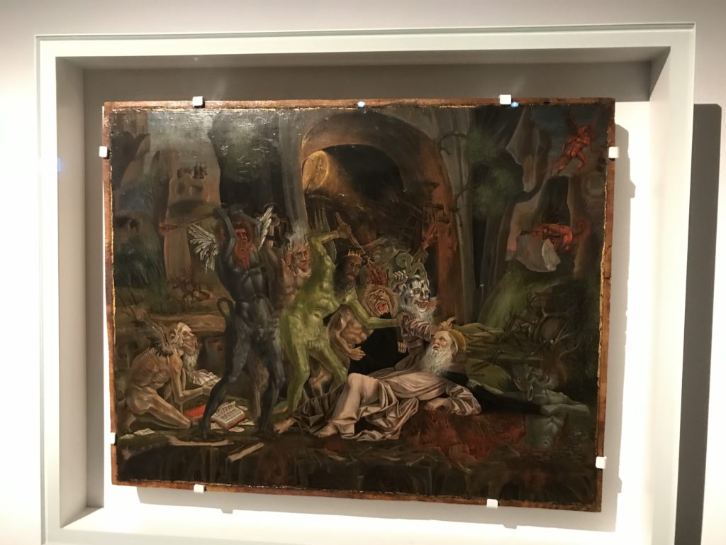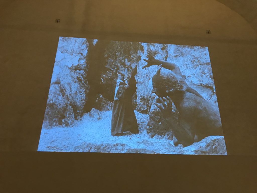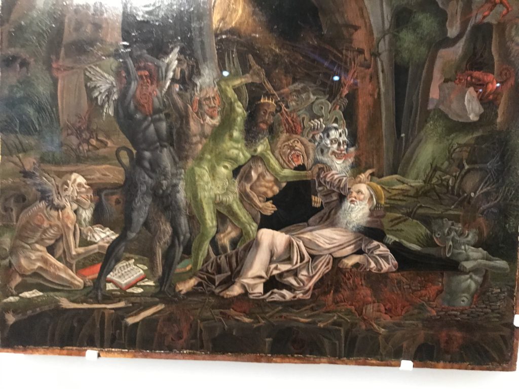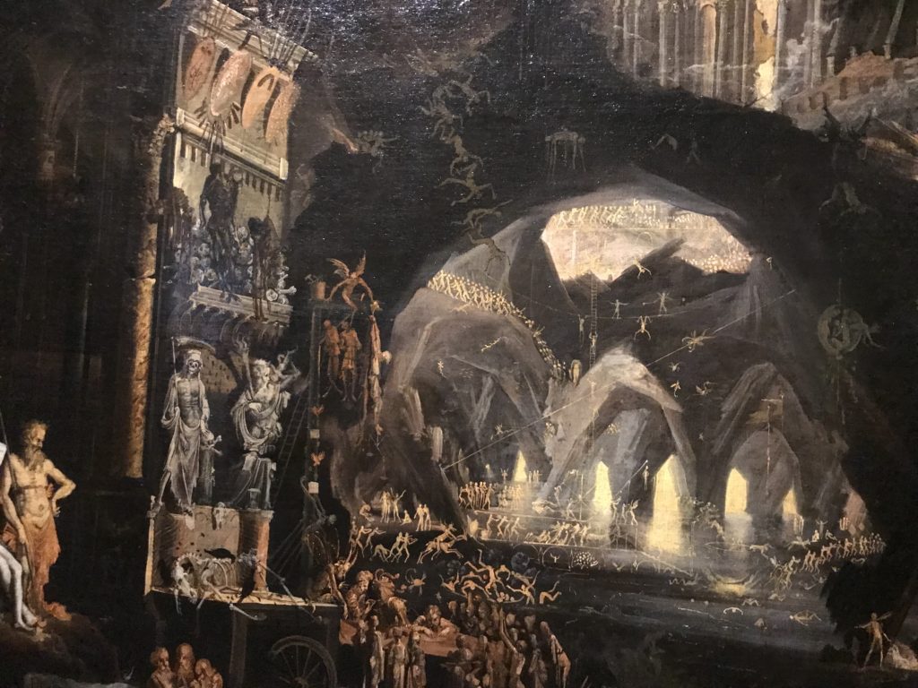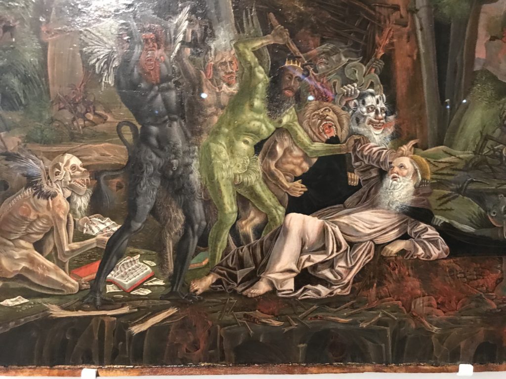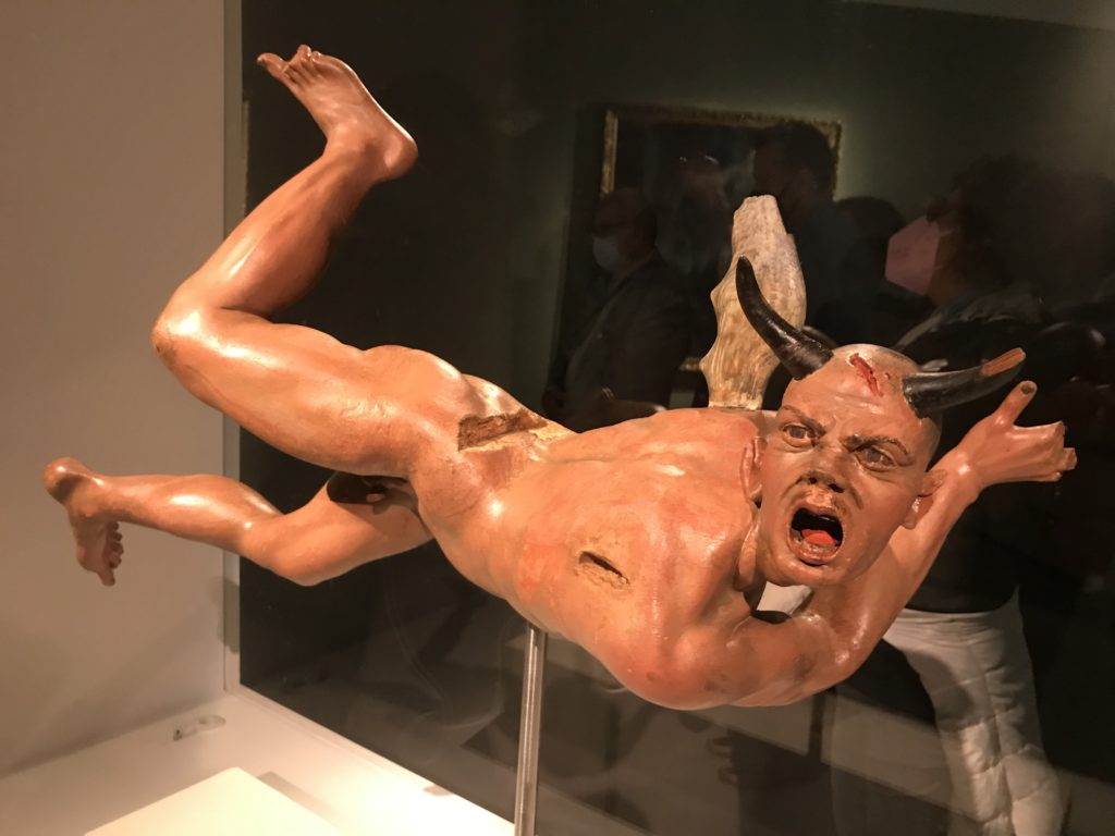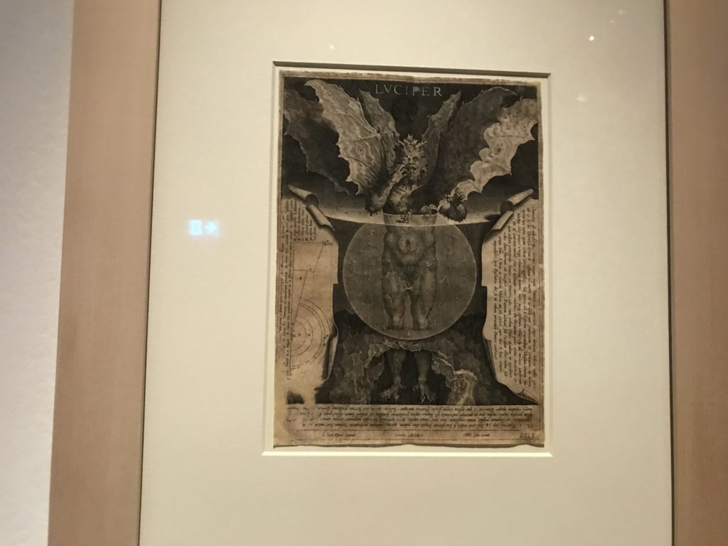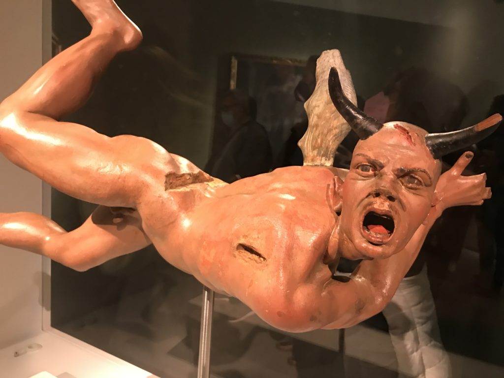 L’incontro con l’universo satanico, l’iconografia infernale, il mondo come lo vediamo e la sua distruzione, sono sintetizzati, nella mostra, nei cupi avvertimenti di cui si fa carico la pittura, la scultura, film, allestimenti, libri e oggetti, miniature medievali, teatrini del male, stampe e grafica fino alle interpretazioni psichiatriche del mistero del Male.