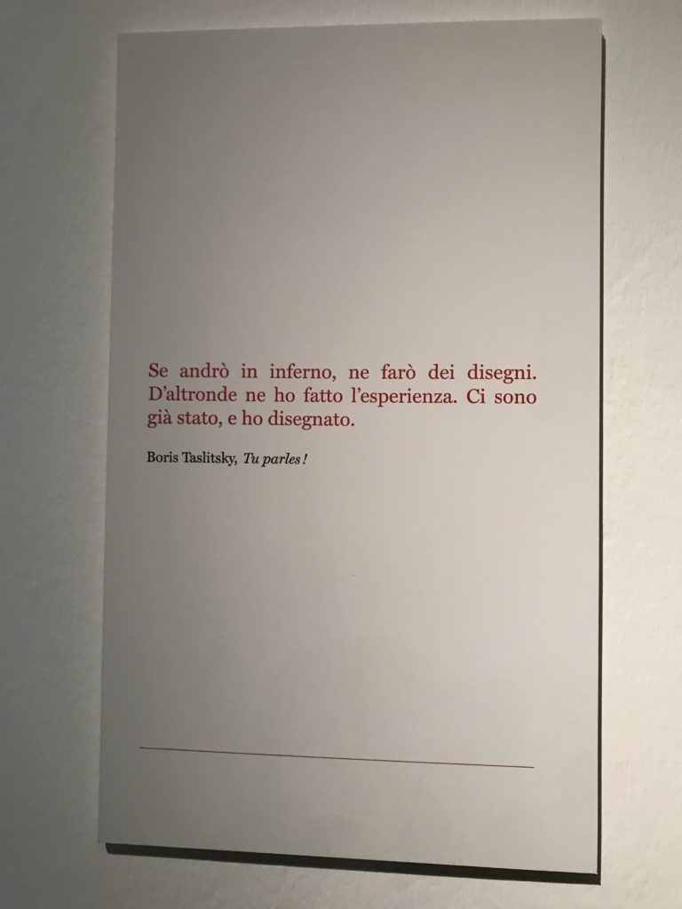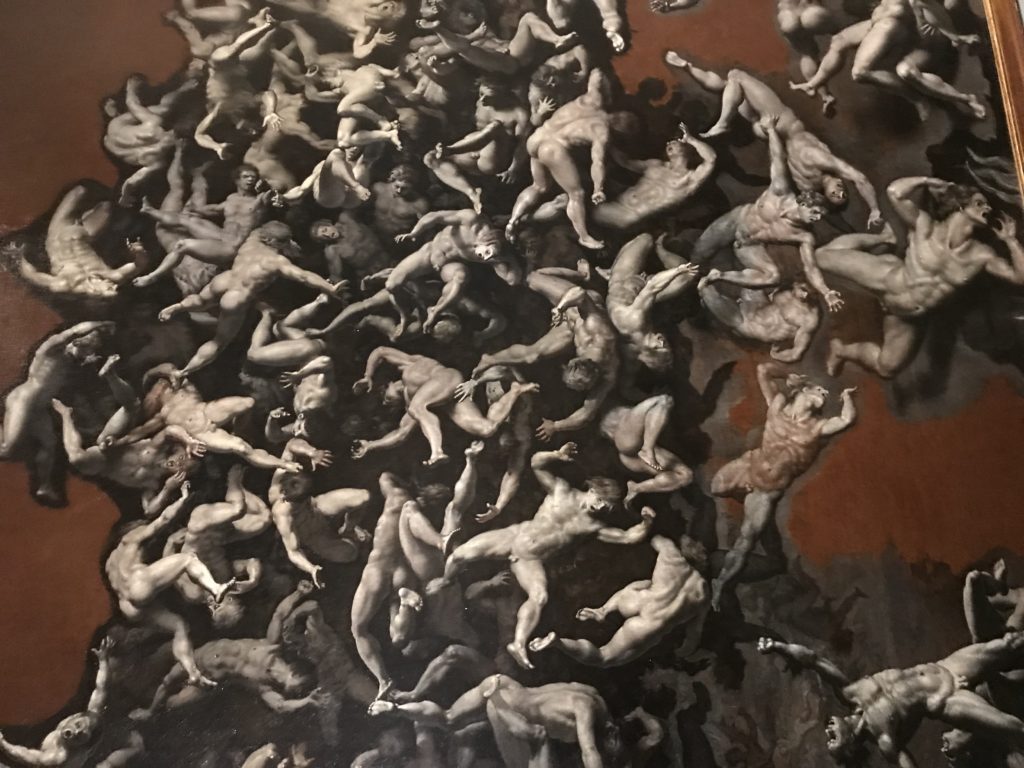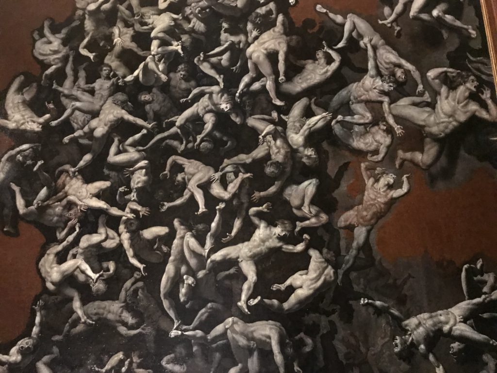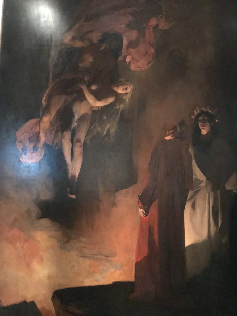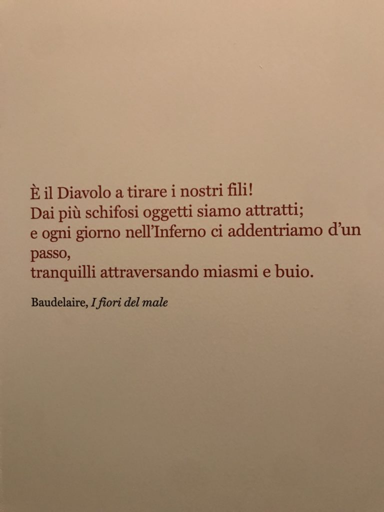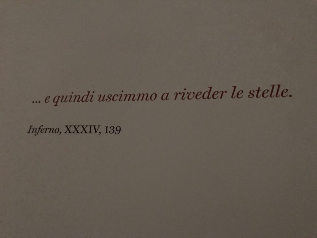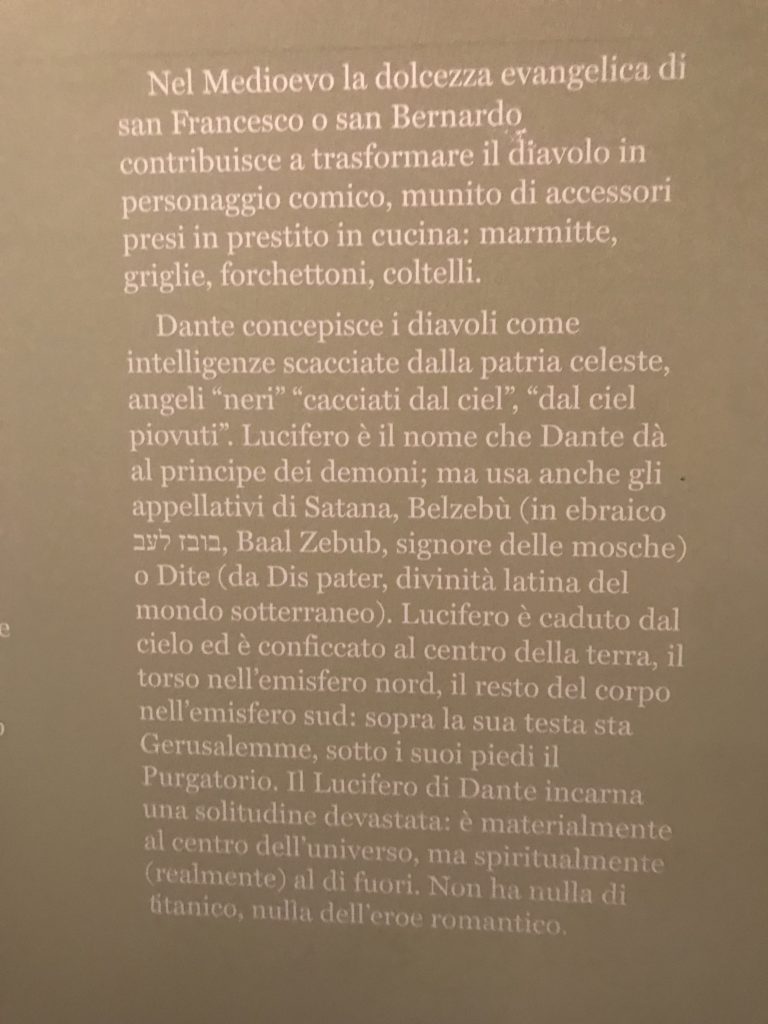 E poi, nelle sale, si avverte un peso emotivo, un’angoscia, una cappa psicologica che non si dissolve, scende e avvolge l’osservatore attento, nell’attraversare e sostare davanti alle opere. Quanto di più drammatico e inusuale (ma soprattutto così riunito iconograficamente) si possa osservare. Il mondo crudele e drammatico dei dannati, dal Medioevo fino ai nostri giorni, in oltre 200 opere provenienti da 80 musei europei e italiani, raccolte pubbliche, collezioni private. Dante, ultraterreno, osserva il grande Male e la sua Condanna, così, la cosmologia del suo pensiero, diviene forma comunicativa nella grande mostra. Tutto sembra convergere nel suo pensiero e le opere esposte – che “inseguono Dante” – ne sono testimonianza. L’inferno, Lucifero, il Giudizio, la Condanna, i Dannati, la topografia, quindi, del cono infernale dipinto, infine, da Sandro Botticelli come nessun altro. La natura mutevole del diavolo, giunge, alla fine delle sale espositive, alla traslazione dell’inferno nelle guerre e negli stermini (adesso intorno a noi), quell’inferno delle devastazioni, le reclusioni, i fronti di combattimento, ma oltre, le fabbriche e il lavoro alienate e tossico, i diritti privati, la dignità, definiti  inferno, e ancora la follia dell’uomo e il buio della malattia, lo sterminio e i campi di concentramento, l’orrore delle torri gemelle, le catastrofi e i terremoti. L’inferno è anche lì, presente, e la mostra se ne fa carico. Ma poi, in questi gironi delle Scuderie del Quirinale che attraversiamo “ insieme” a Dante, quando il Male raggiunge il suo culmine ( e lo vediamo in una serrata e marcata visuale raccapricciante della pittura e della scultura), il poeta affida all’ultimo verso della Cantica il “respiro” che torna normale, non più affannoso per quel che si è visto (ma anche il nostro respiro) : “ E quindi uscimmo a riveder le stelle”, passo mutuato  da Virgilio che Dante accoglie e compendia. Nell’ultima sala, quindi,  le stelle, il cosmo, la galassia, l’astronomia, le sonde spaziali, il nostro sistema solare che allontanano il grande Male della terra e noi, da soli, scopriamo, davanti a questi allestimenti scenici della Nasa, se ce ne fosse bisogno, non siamo nulla nell’infinito e per questo centrali…