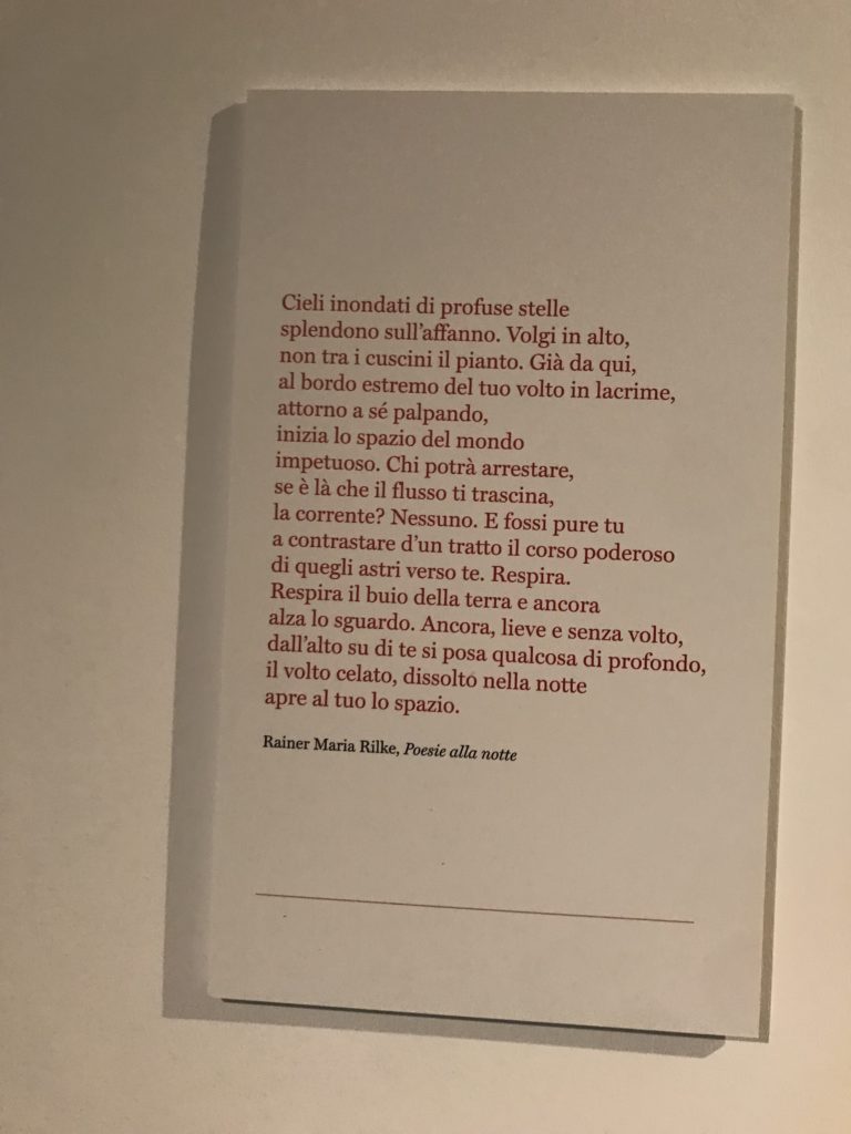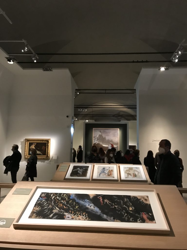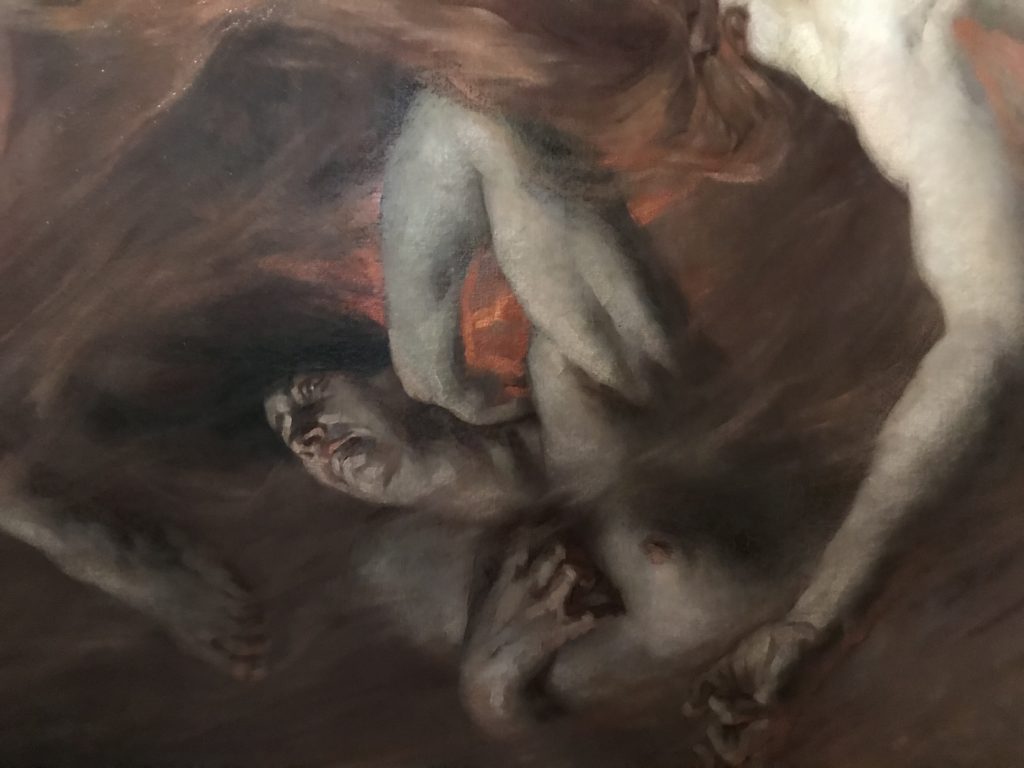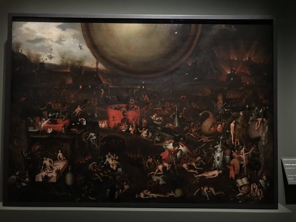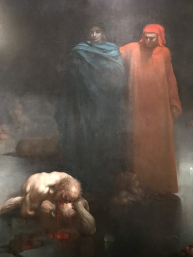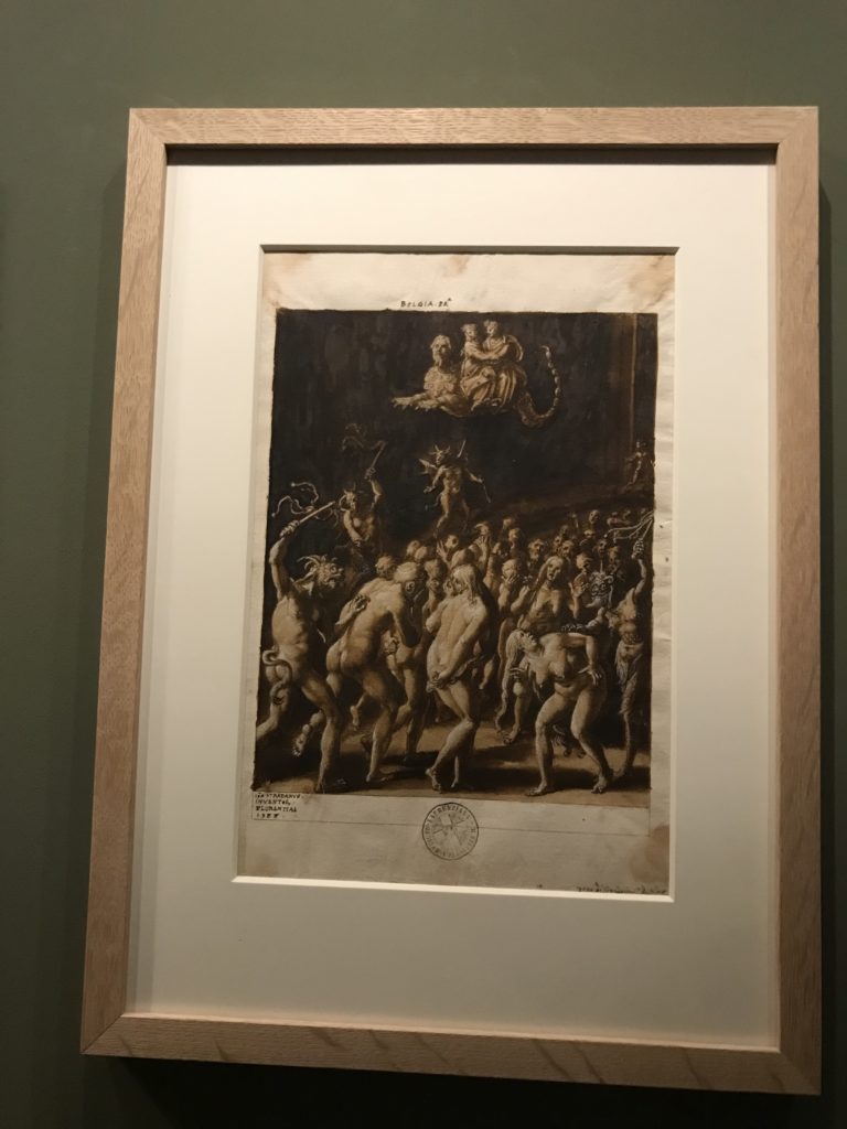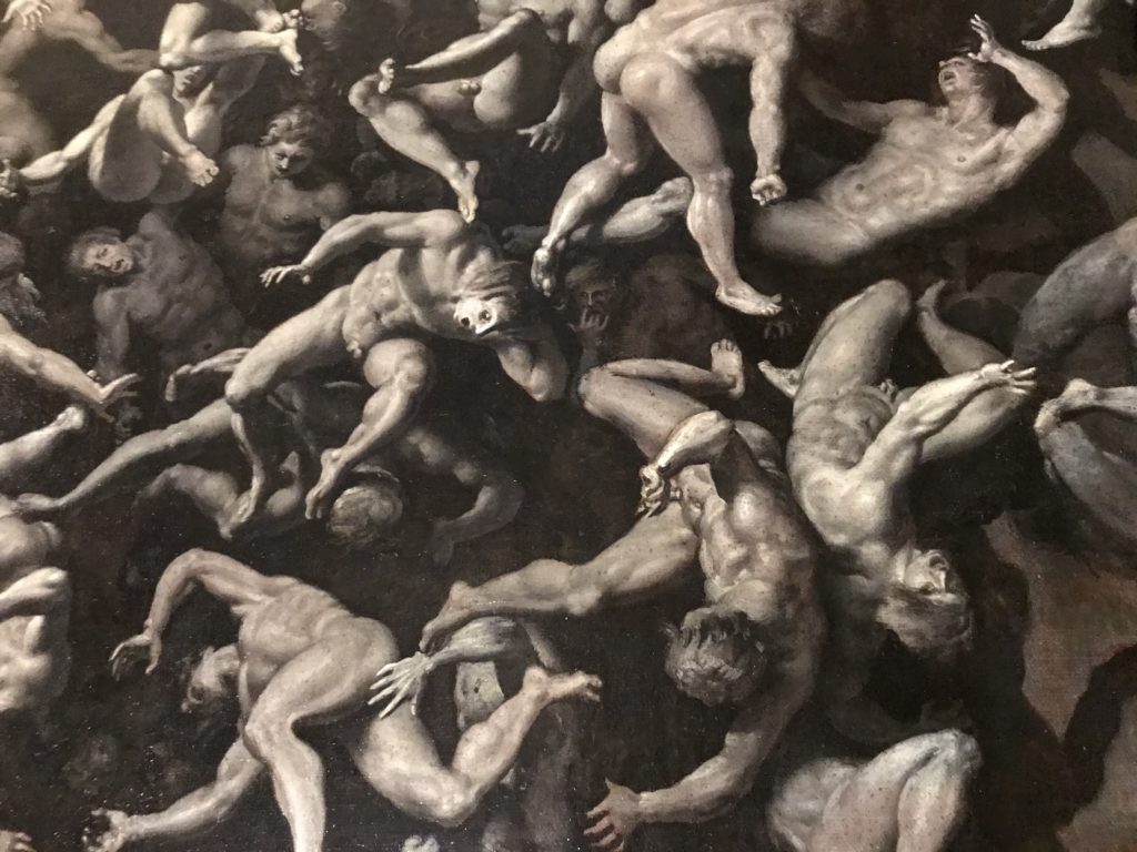 E poi, nelle sale, si avverte un peso emotivo, un’angoscia, una cappa psicologica che non si dissolve, scende e avvolge l’osservatore attento, nell’attraversare e sostare davanti alle opere. Quanto di più drammatico e inusuale (ma soprattutto così riunito iconograficamente) si possa osservare. Il mondo crudele e drammatico dei dannati, dal Medioevo fino ai nostri giorni, in oltre 200 opere provenienti da 80 musei europei e italiani, raccolte pubbliche, collezioni private. Dante, ultraterreno, osserva il grande Male e la sua Condanna, così, la cosmologia del suo pensiero, diviene forma comunicativa nella grande mostra. Tutto sembra convergere nel suo pensiero e le opere esposte – che “inseguono Dante” – ne sono testimonianza. L’inferno, Lucifero, il Giudizio, la Condanna, i Dannati, la topografia, quindi, del cono infernale dipinto, infine, da Sandro Botticelli come nessun altro. La natura mutevole del diavolo, giunge, alla fine delle sale espositive, alla traslazione dell’inferno nelle guerre e negli stermini (adesso intorno a noi), quell’inferno delle devastazioni, le reclusioni, i fronti di combattimento, ma oltre, le fabbriche e il lavoro alienate e tossico, i diritti privati, la dignità, definiti  inferno, e ancora la follia dell’uomo e il buio della malattia, lo sterminio e i campi di concentramento, l’orrore delle torri gemelle, le catastrofi e i terremoti. L’inferno è anche lì, presente, e la mostra se ne fa carico. Ma poi, in questi gironi delle Scuderie del Quirinale che attraversiamo “ insieme” a Dante, quando il Male raggiunge il suo culmine ( e lo vediamo in una serrata e marcata visuale raccapricciante della pittura e della scultura), il poeta affida all’ultimo verso della Cantica il “respiro” che torna normale, non più affannoso per quel che si è visto (ma anche il nostro respiro) : “ E quindi uscimmo a riveder le stelle”, passo mutuato  da Virgilio che Dante accoglie e compendia. Nell’ultima sala, quindi,  le stelle, il cosmo, la galassia, l’astronomia, le sonde spaziali, il nostro sistema solare che allontanano il grande Male della terra e noi, da soli, scopriamo, davanti a questi allestimenti scenici della Nasa, se ce ne fosse bisogno, non siamo nulla nell’infinito e per questo centrali…