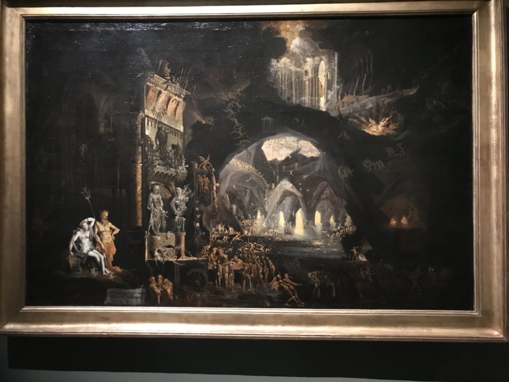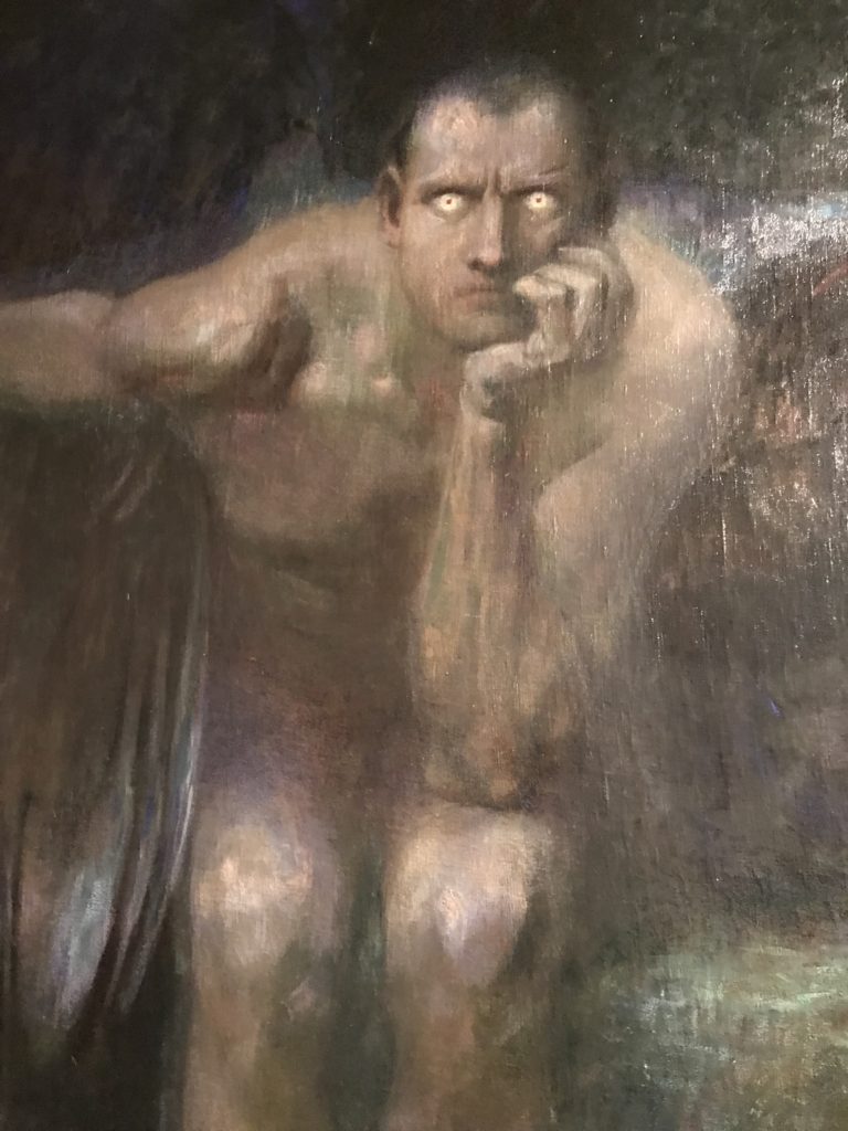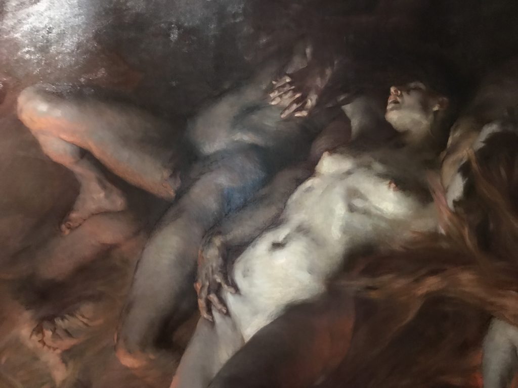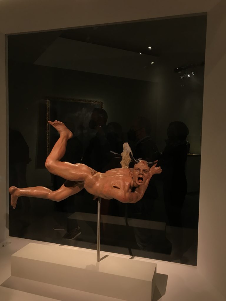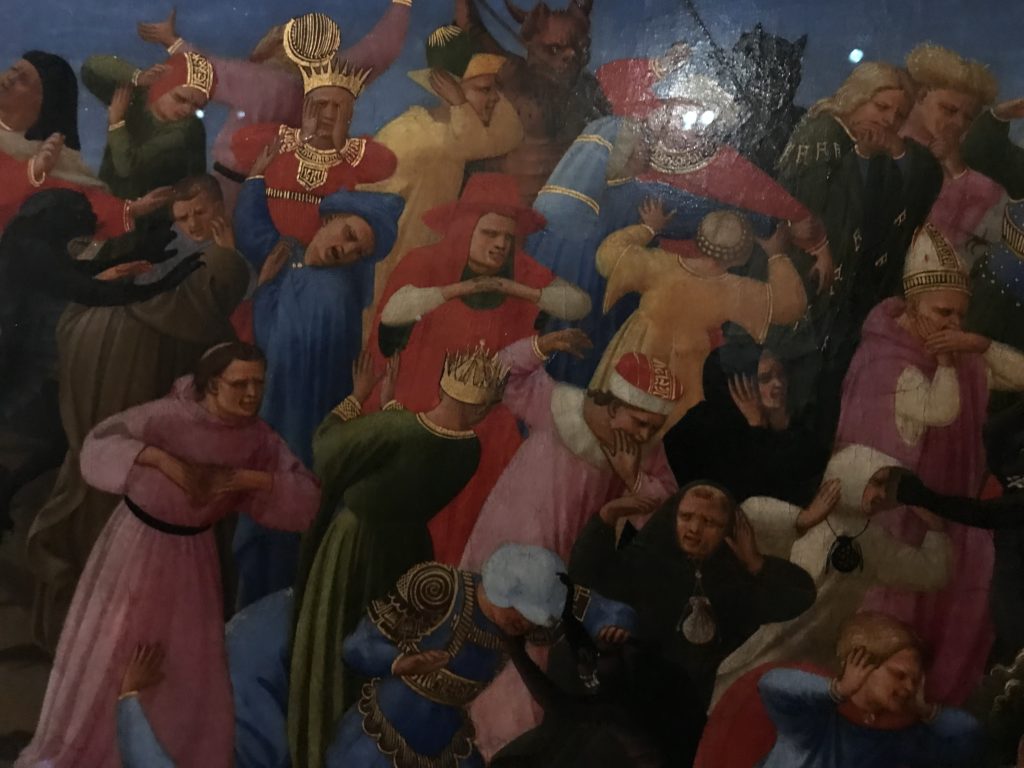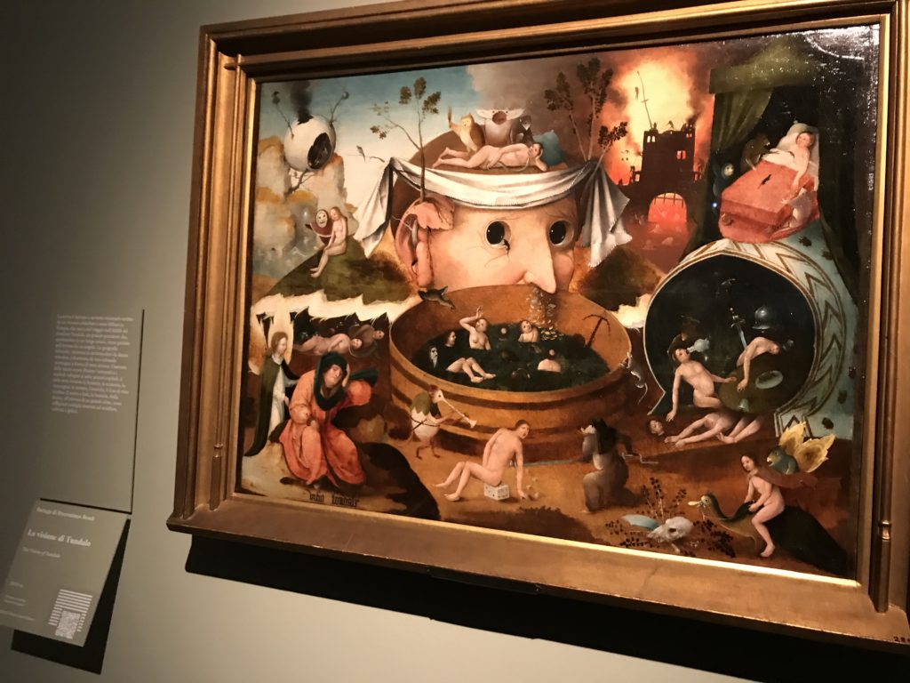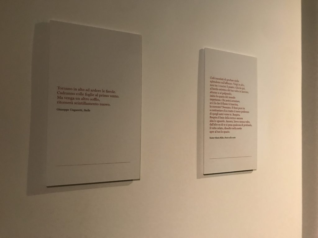 E poi, nelle sale, si avverte un peso emotivo, un’angoscia, una cappa psicologica che non si dissolve, scende e avvolge l’osservatore attento, nell’attraversare e sostare davanti alle opere. Quanto di più drammatico e inusuale (ma soprattutto così riunito iconograficamente) si possa osservare. Il mondo crudele e drammatico dei dannati, dal Medioevo fino ai nostri giorni, in oltre 200 opere provenienti da 80 musei europei e italiani, raccolte pubbliche, collezioni private. Dante, ultraterreno, osserva il grande Male e la sua Condanna, così, la cosmologia del suo pensiero, diviene forma comunicativa nella grande mostra. Tutto sembra convergere nel suo pensiero e le opere esposte – che “inseguono Dante” – ne sono testimonianza. L’inferno, Lucifero, il Giudizio, la Condanna, i Dannati, la topografia, quindi, del cono infernale dipinto, infine, da Sandro Botticelli come nessun altro. La natura mutevole del diavolo, giunge, alla fine delle sale espositive, alla traslazione dell’inferno nelle guerre e negli stermini (adesso intorno a noi), quell’inferno delle devastazioni, le reclusioni, i fronti di combattimento, ma oltre, le fabbriche e il lavoro alienate e tossico, i diritti privati, la dignità, definiti  inferno, e ancora la follia dell’uomo e il buio della malattia, lo sterminio e i campi di concentramento, l’orrore delle torri gemelle, le catastrofi e i terremoti. L’inferno è anche lì, presente, e la mostra se ne fa carico. Ma poi, in questi gironi delle Scuderie del Quirinale che attraversiamo “ insieme” a Dante, quando il Male raggiunge il suo culmine ( e lo vediamo in una serrata e marcata visuale raccapricciante della pittura e della scultura), il poeta affida all’ultimo verso della Cantica il “respiro” che torna normale, non più affannoso per quel che si è visto (ma anche il nostro respiro) : “ E quindi uscimmo a riveder le stelle”, passo mutuato  da Virgilio che Dante accoglie e compendia. Nell’ultima sala, quindi,  le stelle, il cosmo, la galassia, l’astronomia, le sonde spaziali, il nostro sistema solare che allontanano il grande Male della terra e noi, da soli, scopriamo, davanti a questi allestimenti scenici della Nasa, se ce ne fosse bisogno, non siamo nulla nell’infinito e per questo centrali…