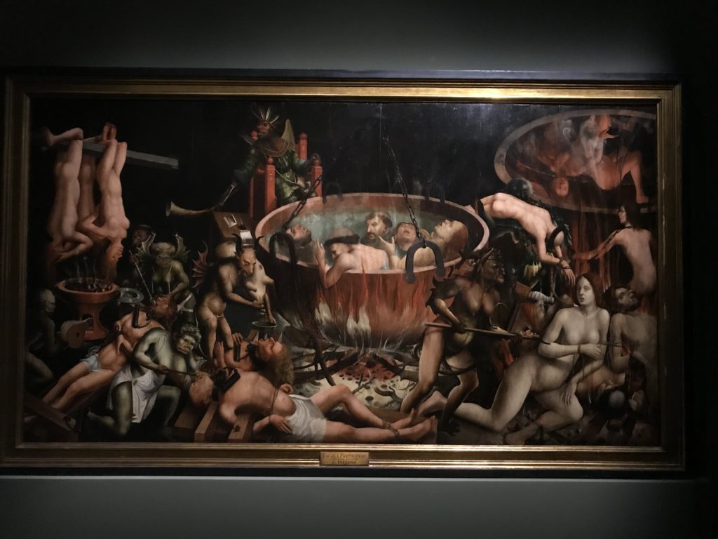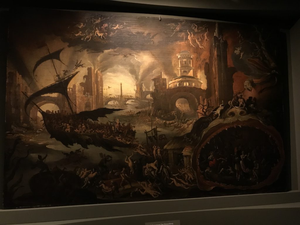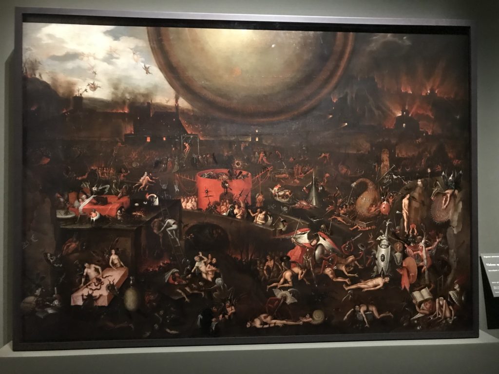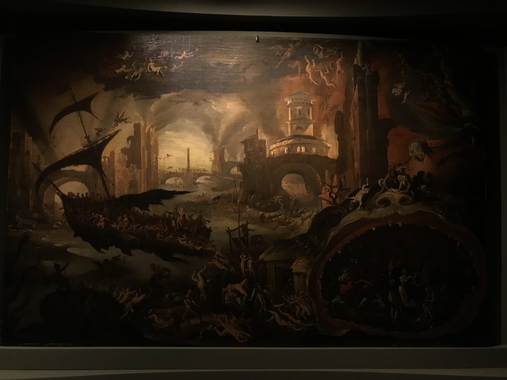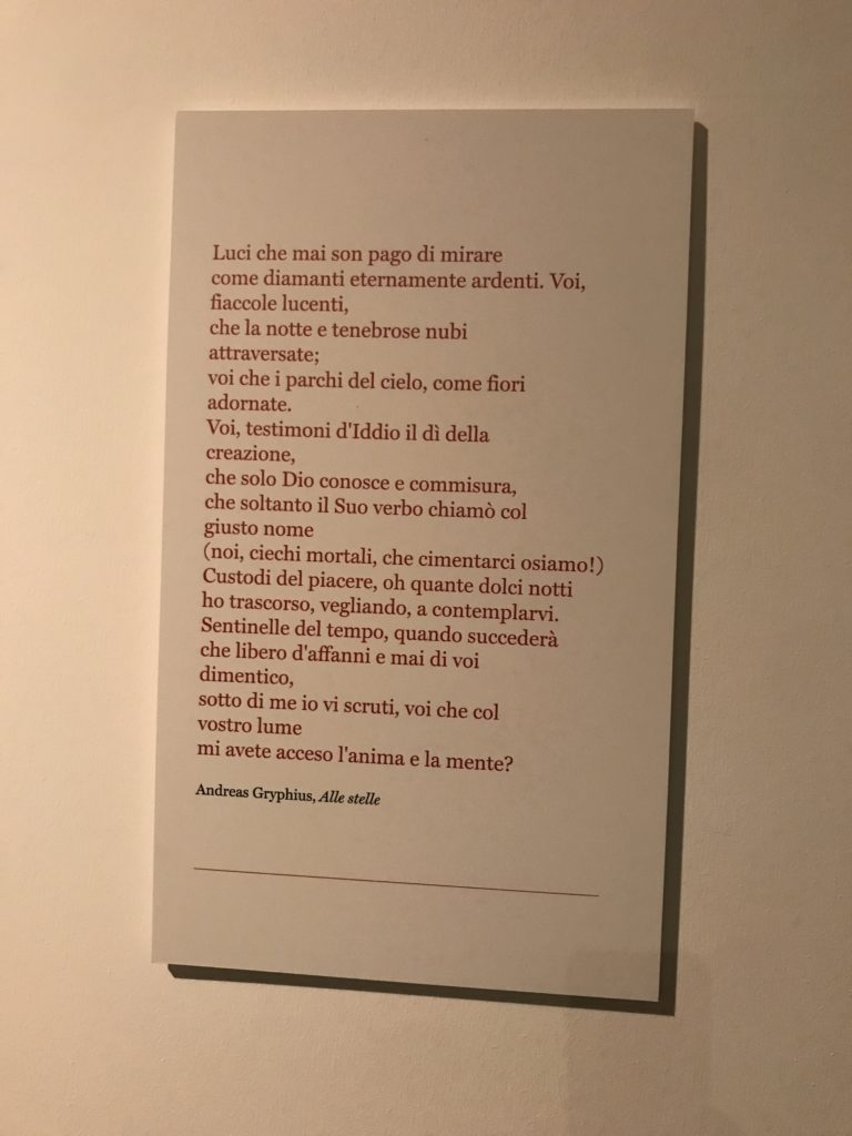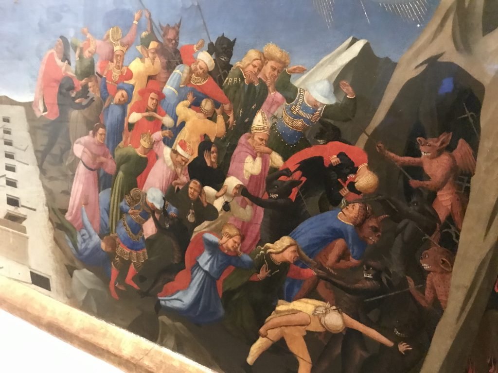 E poi, nelle sale, si avverte un peso emotivo, un’angoscia, una cappa psicologica che non si dissolve, scende e avvolge l’osservatore attento, nell’attraversare e sostare davanti alle opere. Quanto di più drammatico e inusuale (ma soprattutto così riunito iconograficamente) si possa osservare. Il mondo crudele e drammatico dei dannati, dal Medioevo fino ai nostri giorni, in oltre 200 opere provenienti da 80 musei europei e italiani, raccolte pubbliche, collezioni private. Dante, ultraterreno, osserva il grande Male e la sua Condanna, così, la cosmologia del suo pensiero, diviene forma comunicativa nella grande mostra. Tutto sembra convergere nel suo pensiero e le opere esposte – che “inseguono Dante” – ne sono testimonianza. L’inferno, Lucifero, il Giudizio, la Condanna, i Dannati, la topografia, quindi, del cono infernale dipinto, infine, da Sandro Botticelli come nessun altro. La natura mutevole del diavolo, giunge, alla fine delle sale espositive, alla traslazione dell’inferno nelle guerre e negli stermini (adesso intorno a noi), quell’inferno delle devastazioni, le reclusioni, i fronti di combattimento, ma oltre, le fabbriche e il lavoro alienate e tossico, i diritti privati, la dignità, definiti  inferno, e ancora la follia dell’uomo e il buio della malattia, lo sterminio e i campi di concentramento, l’orrore delle torri gemelle, le catastrofi e i terremoti. L’inferno è anche lì, presente, e la mostra se ne fa carico. Ma poi, in questi gironi delle Scuderie del Quirinale che attraversiamo “ insieme” a Dante, quando il Male raggiunge il suo culmine ( e lo vediamo in una serrata e marcata visuale raccapricciante della pittura e della scultura), il poeta affida all’ultimo verso della Cantica il “respiro” che torna normale, non più affannoso per quel che si è visto (ma anche il nostro respiro) : “ E quindi uscimmo a riveder le stelle”, passo mutuato  da Virgilio che Dante accoglie e compendia. Nell’ultima sala, quindi,  le stelle, il cosmo, la galassia, l’astronomia, le sonde spaziali, il nostro sistema solare che allontanano il grande Male della terra e noi, da soli, scopriamo, davanti a questi allestimenti scenici della Nasa, se ce ne fosse bisogno, non siamo nulla nell’infinito e per questo centrali…