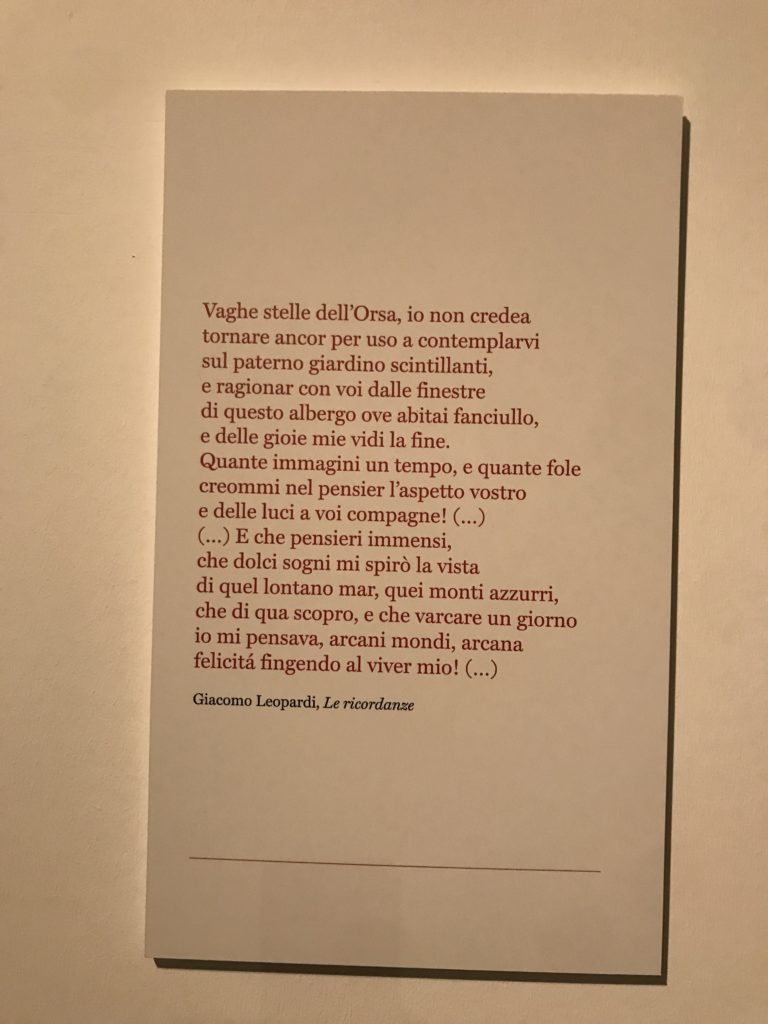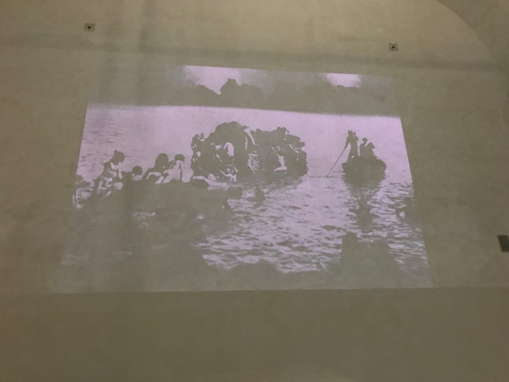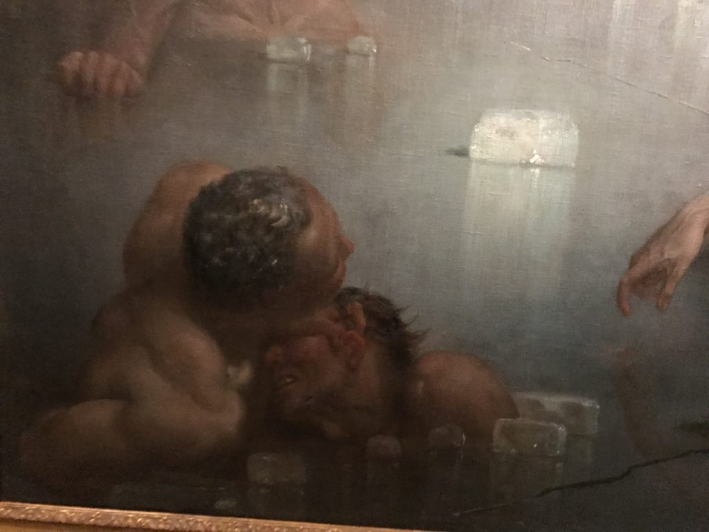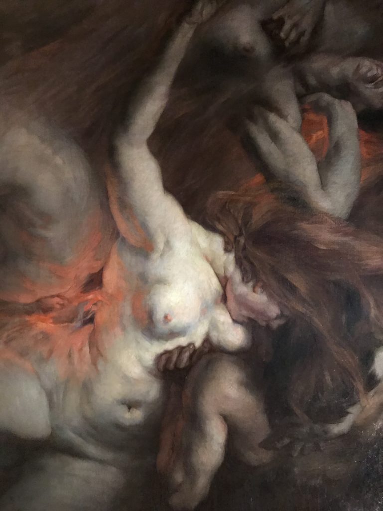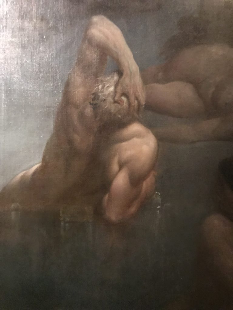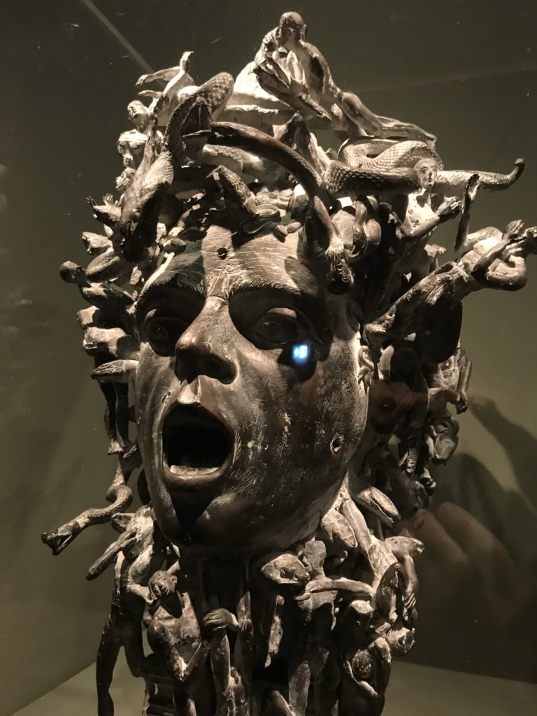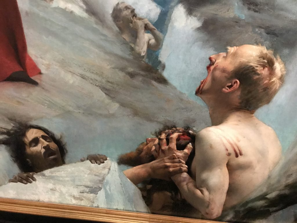 E poi, nelle sale, si avverte un peso emotivo, un’angoscia, una cappa psicologica che non si dissolve, scende e avvolge l’osservatore attento, nell’attraversare e sostare davanti alle opere. Quanto di più drammatico e inusuale (ma soprattutto così riunito iconograficamente) si possa osservare. Il mondo crudele e drammatico dei dannati, dal Medioevo fino ai nostri giorni, in oltre 200 opere provenienti da 80 musei europei e italiani, raccolte pubbliche, collezioni private. Dante, ultraterreno, osserva il grande Male e la sua Condanna, così, la cosmologia del suo pensiero, diviene forma comunicativa nella grande mostra. Tutto sembra convergere nel suo pensiero e le opere esposte – che “inseguono Dante” – ne sono testimonianza. L’inferno, Lucifero, il Giudizio, la Condanna, i Dannati, la topografia, quindi, del cono infernale dipinto, infine, da Sandro Botticelli come nessun altro. La natura mutevole del diavolo, giunge, alla fine delle sale espositive, alla traslazione dell’inferno nelle guerre e negli stermini (adesso intorno a noi), quell’inferno delle devastazioni, le reclusioni, i fronti di combattimento, ma oltre, le fabbriche e il lavoro alienate e tossico, i diritti privati, la dignità, definiti  inferno, e ancora la follia dell’uomo e il buio della malattia, lo sterminio e i campi di concentramento, l’orrore delle torri gemelle, le catastrofi e i terremoti. L’inferno è anche lì, presente, e la mostra se ne fa carico. Ma poi, in questi gironi delle Scuderie del Quirinale che attraversiamo “ insieme” a Dante, quando il Male raggiunge il suo culmine ( e lo vediamo in una serrata e marcata visuale raccapricciante della pittura e della scultura), il poeta affida all’ultimo verso della Cantica il “respiro” che torna normale, non più affannoso per quel che si è visto (ma anche il nostro respiro) : “ E quindi uscimmo a riveder le stelle”, passo mutuato  da Virgilio che Dante accoglie e compendia. Nell’ultima sala, quindi,  le stelle, il cosmo, la galassia, l’astronomia, le sonde spaziali, il nostro sistema solare che allontanano il grande Male della terra e noi, da soli, scopriamo, davanti a questi allestimenti scenici della Nasa, se ce ne fosse bisogno, non siamo nulla nell’infinito e per questo centrali…