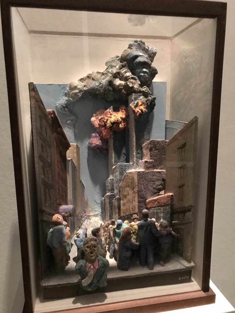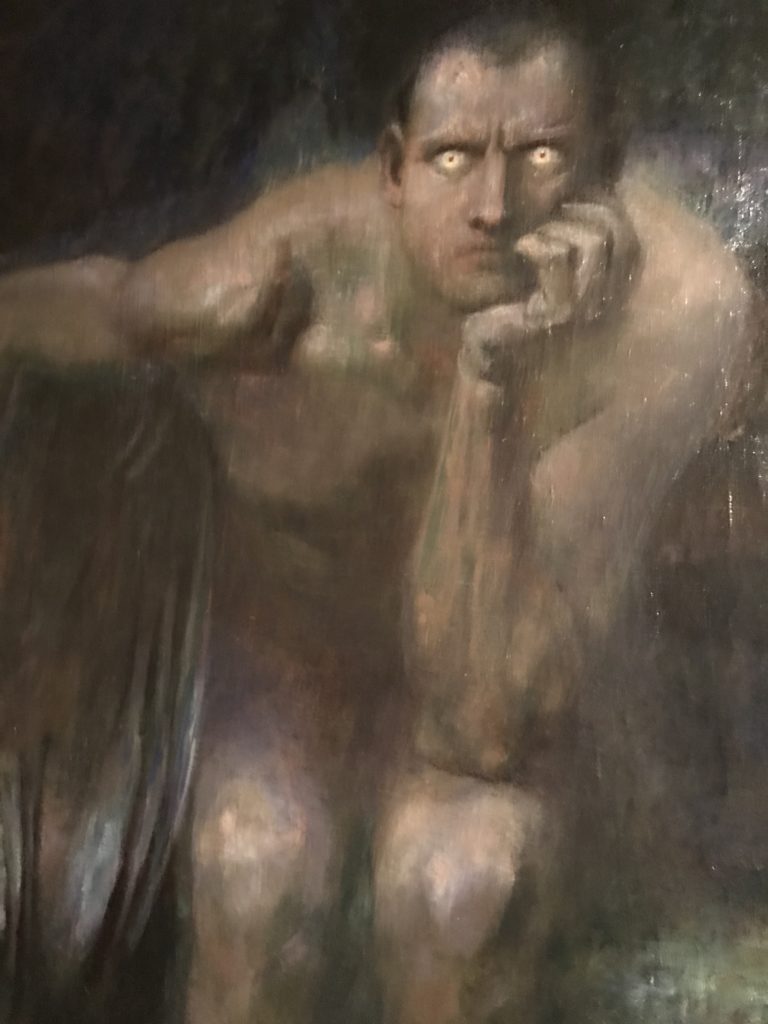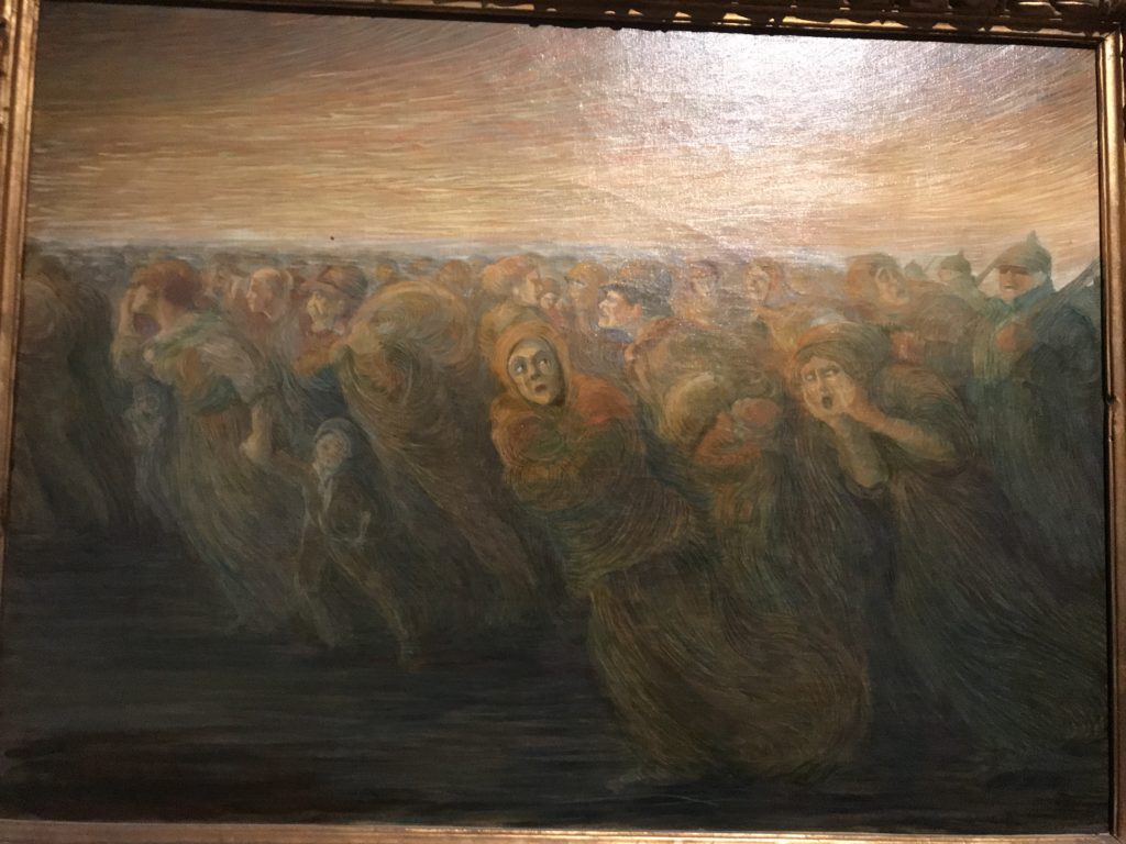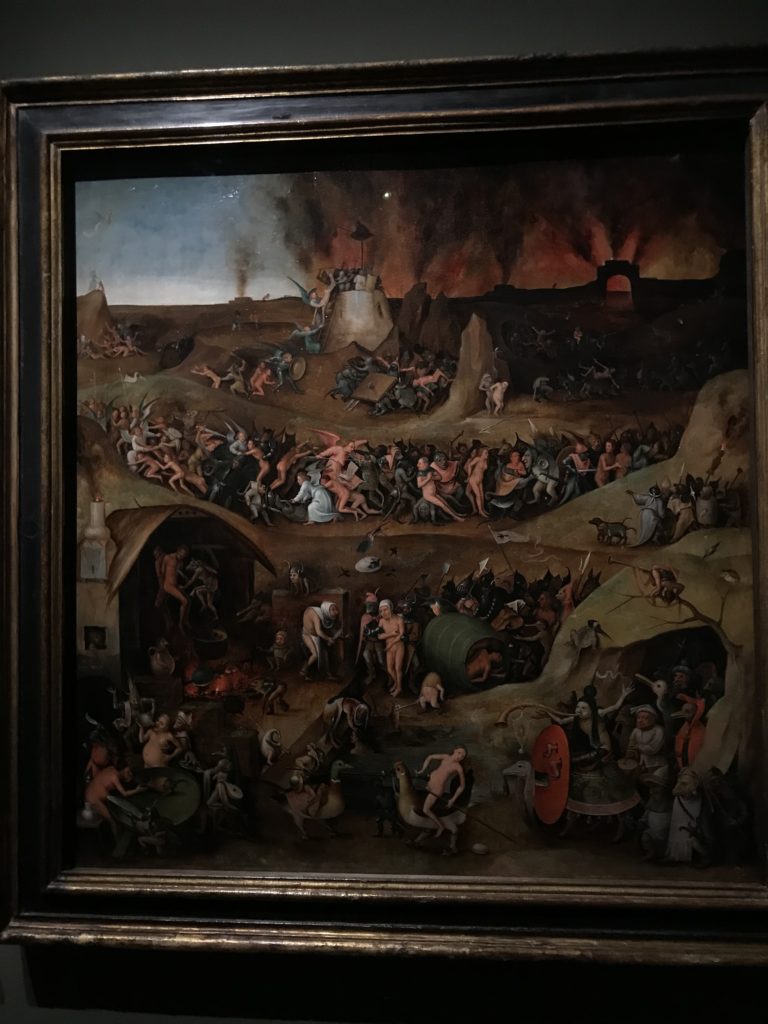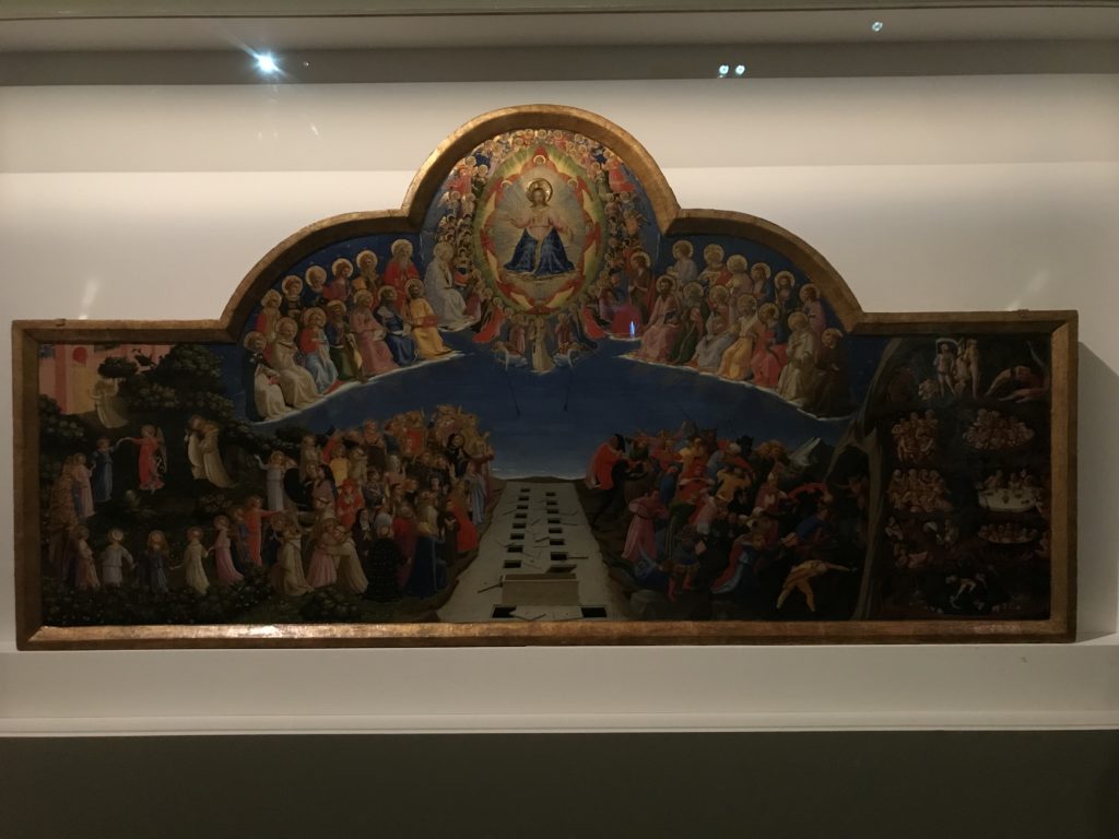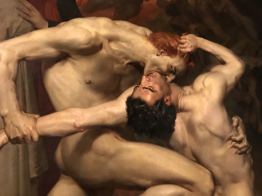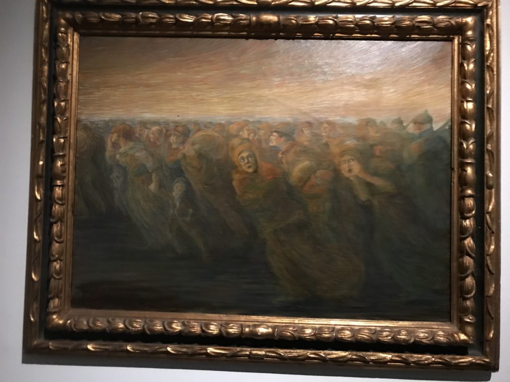 E poi, nelle sale, si avverte un peso emotivo, un’angoscia, una cappa psicologica che non si dissolve, scende e avvolge l’osservatore attento, nell’attraversare e sostare davanti alle opere. Quanto di più drammatico e inusuale (ma soprattutto così riunito iconograficamente) si possa osservare. Il mondo crudele e drammatico dei dannati, dal Medioevo fino ai nostri giorni, in oltre 200 opere provenienti da 80 musei europei e italiani, raccolte pubbliche, collezioni private. Dante, ultraterreno, osserva il grande Male e la sua Condanna, così, la cosmologia del suo pensiero, diviene forma comunicativa nella grande mostra. Tutto sembra convergere nel suo pensiero e le opere esposte – che “inseguono Dante” – ne sono testimonianza. L’inferno, Lucifero, il Giudizio, la Condanna, i Dannati, la topografia, quindi, del cono infernale dipinto, infine, da Sandro Botticelli come nessun altro. La natura mutevole del diavolo, giunge, alla fine delle sale espositive, alla traslazione dell’inferno nelle guerre e negli stermini (adesso intorno a noi), quell’inferno delle devastazioni, le reclusioni, i fronti di combattimento, ma oltre, le fabbriche e il lavoro alienate e tossico, i diritti privati, la dignità, definiti  inferno, e ancora la follia dell’uomo e il buio della malattia, lo sterminio e i campi di concentramento, l’orrore delle torri gemelle, le catastrofi e i terremoti. L’inferno è anche lì, presente, e la mostra se ne fa carico. Ma poi, in questi gironi delle Scuderie del Quirinale che attraversiamo “ insieme” a Dante, quando il Male raggiunge il suo culmine ( e lo vediamo in una serrata e marcata visuale raccapricciante della pittura e della scultura), il poeta affida all’ultimo verso della Cantica il “respiro” che torna normale, non più affannoso per quel che si è visto (ma anche il nostro respiro) : “ E quindi uscimmo a riveder le stelle”, passo mutuato  da Virgilio che Dante accoglie e compendia. Nell’ultima sala, quindi,  le stelle, il cosmo, la galassia, l’astronomia, le sonde spaziali, il nostro sistema solare che allontanano il grande Male della terra e noi, da soli, scopriamo, davanti a questi allestimenti scenici della Nasa, se ce ne fosse bisogno, non siamo nulla nell’infinito e per questo centrali…
