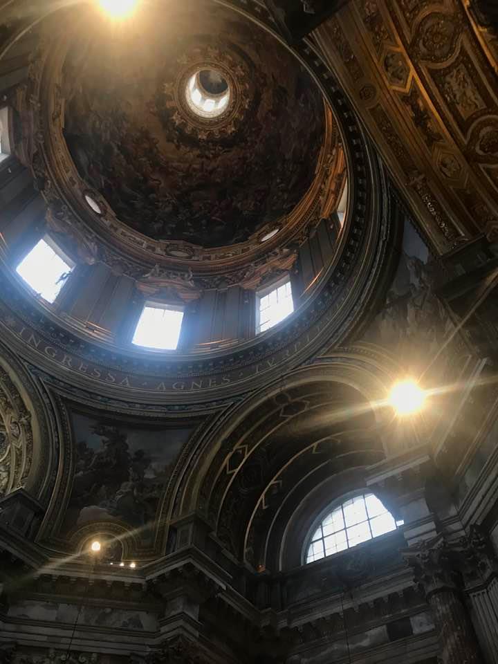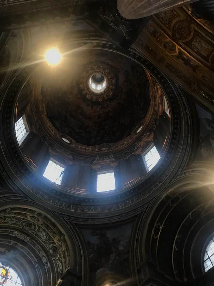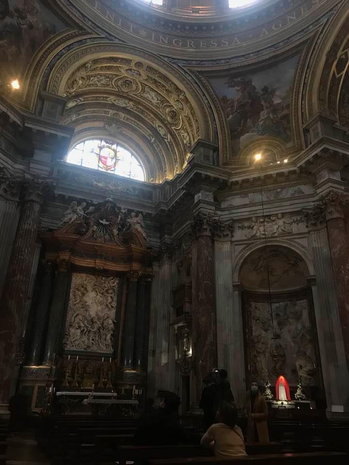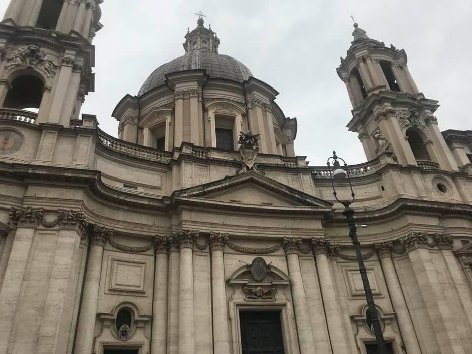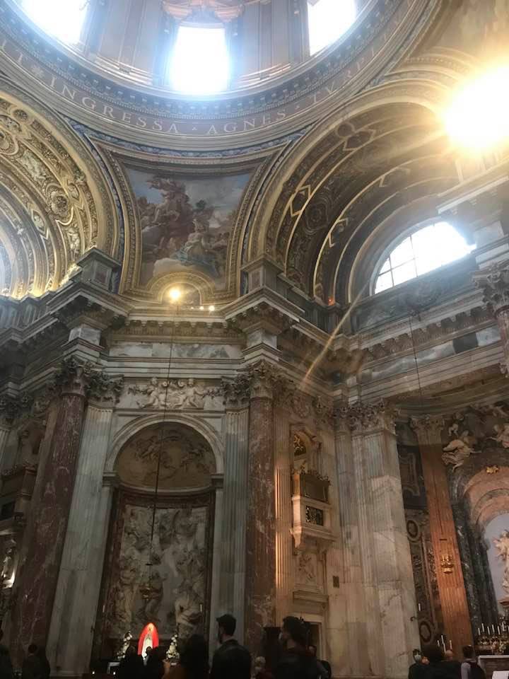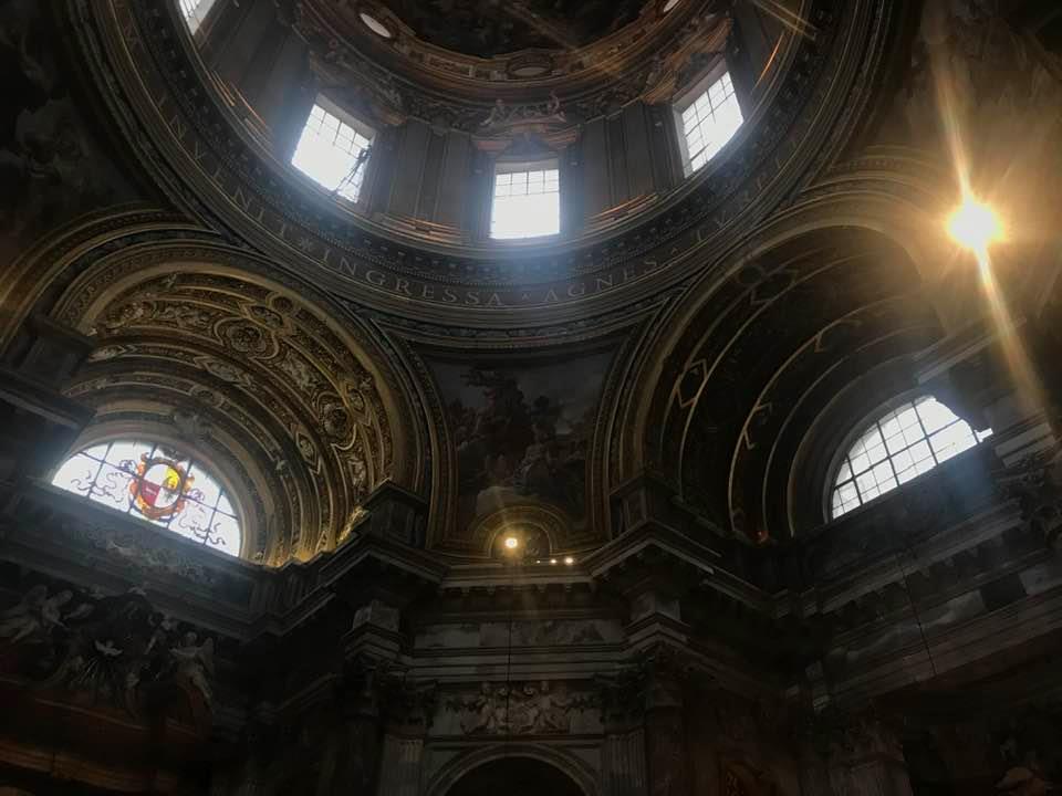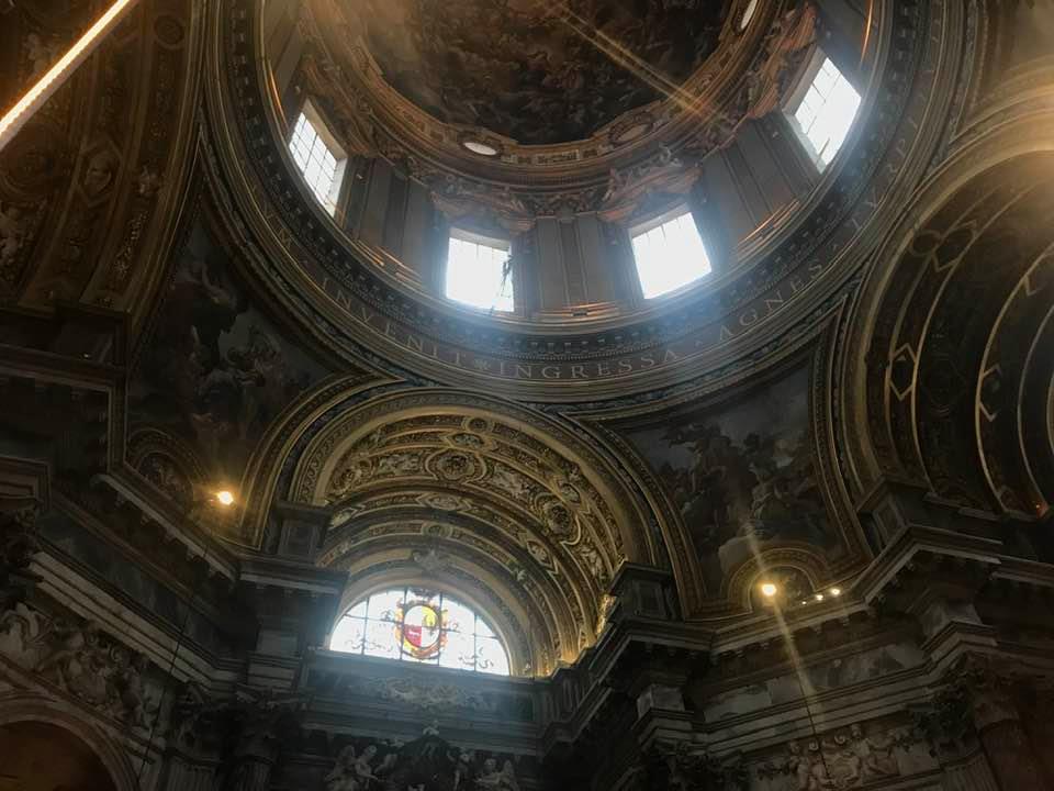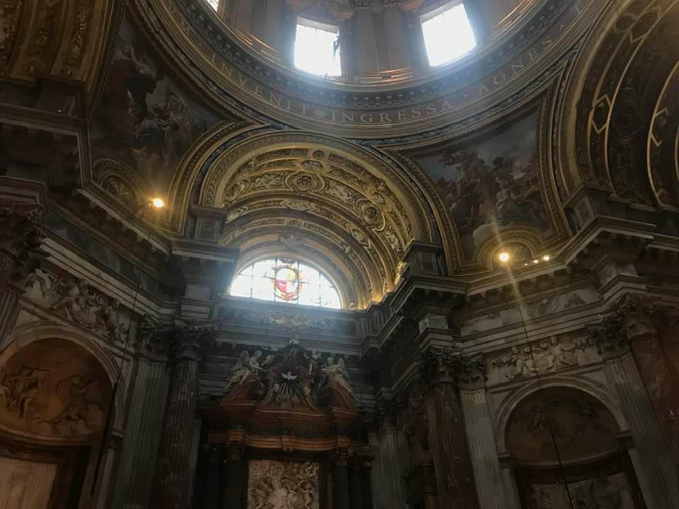 Papa Alessandro VII, successore di Innocenzo X Panphilj ( 1651, sceglie Borromini per edificare il tempio religioso) , revocò l’incarico all’architetto Borromini che si apprestava all’ultimazione architettonica della Basilica di Sant’Agnese a Piazza Navona. Rapporti difficili, dispute, incomprensioni, accuse per gli errori compiuti nel progetto, fino all’abbandono da parte dell’architetto nei lavori quasi ultimati. La chiesa nella sua facciata si caratterizza con curve laterali, al centro due campanili, ghirlande e lesene e tre portali. L’interno ha una pianta a croce greca. I quattro bracci sono sontuosamante decorati come imponeva il barocco nell’epoca. Gli stucchi di eccellente fattura sono presenti nella navata, nell’abside, nei transetti e nelle volte. Quattro altari dedicati ai santi Alessio, Ermenziana, Eustacchio e Cecilia. I transetti sono invece dedicati a Sant’Agnese. L’ altare maggiore ha quattro colonne scanalate in marmo verde antico provenienti dall’Arco di Marco Aurelio al Corso. Di notevole rilevanza la cripta del IV secolo di Sant’Agnese, sito dove fu uccisa la giovane martire. L’apparato decorativo- iconografico si estende sulle pareti affrescate, nelle volte con interventi borrominiani. Colonne e capitelli sorreggono il luogo paleocristiano. Nella Basilica è presente la tomba di Innocenzo X.