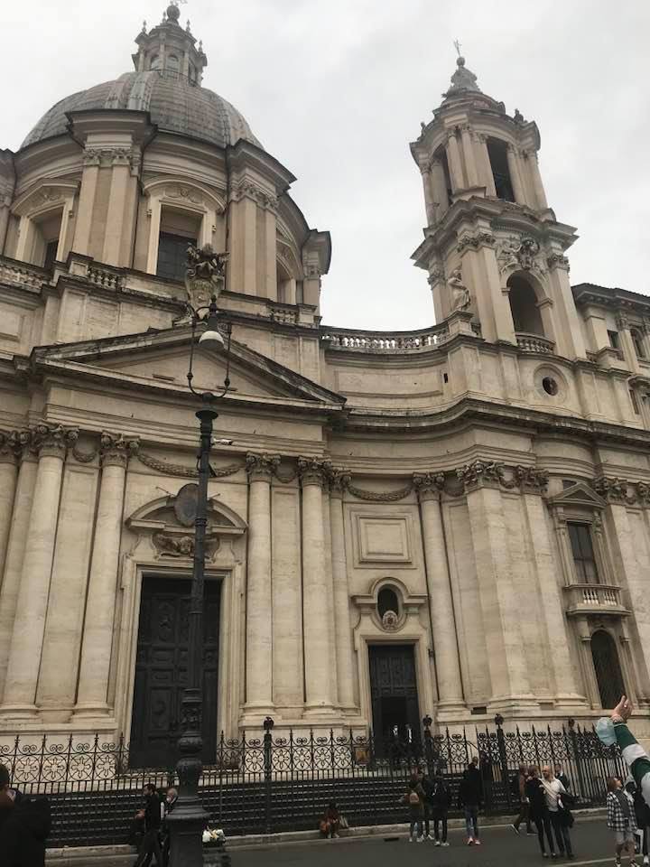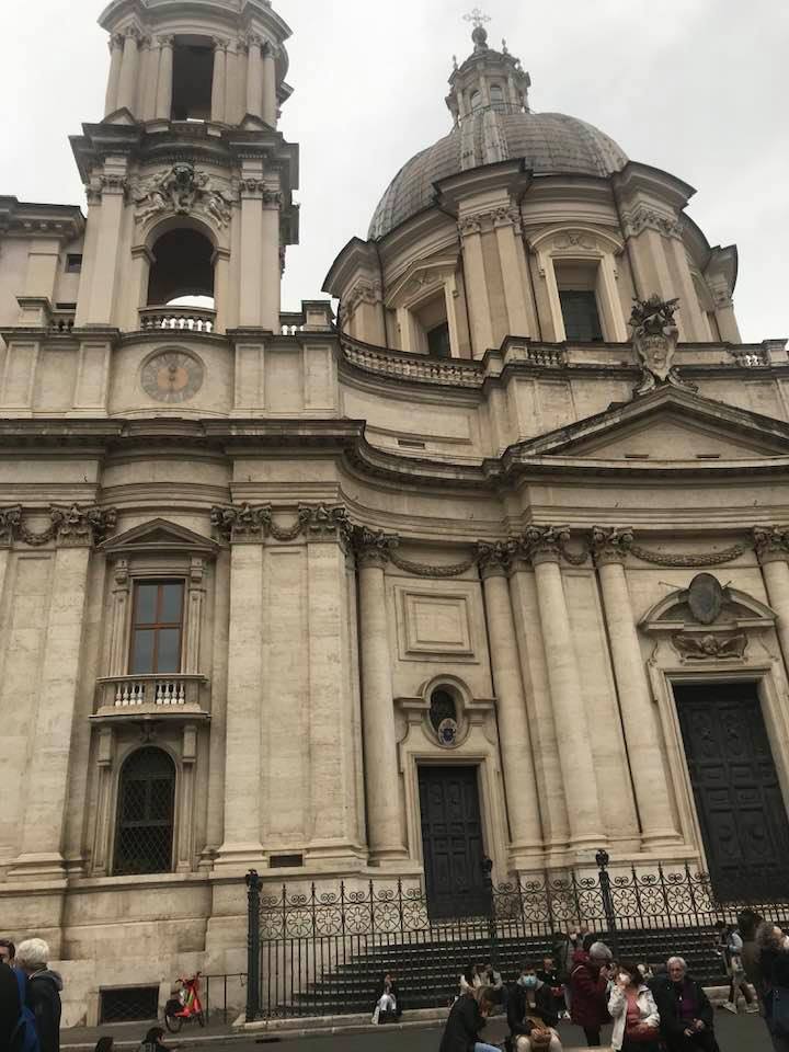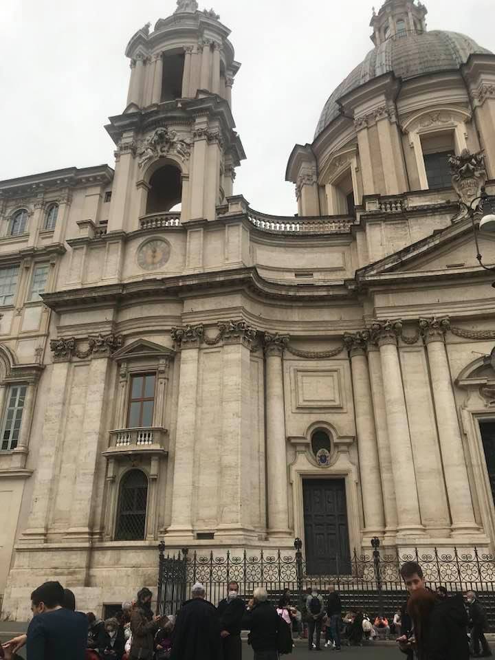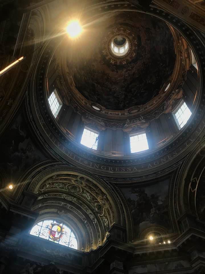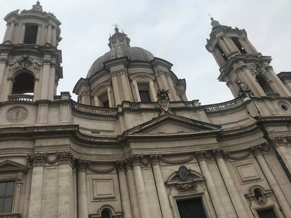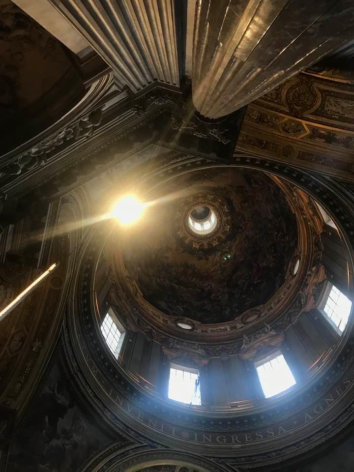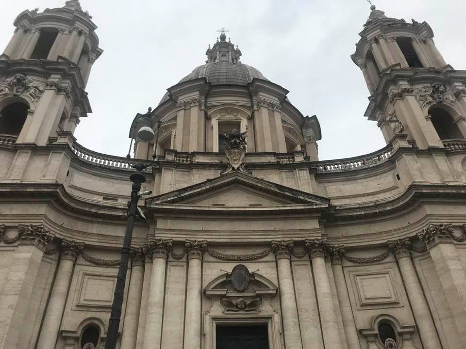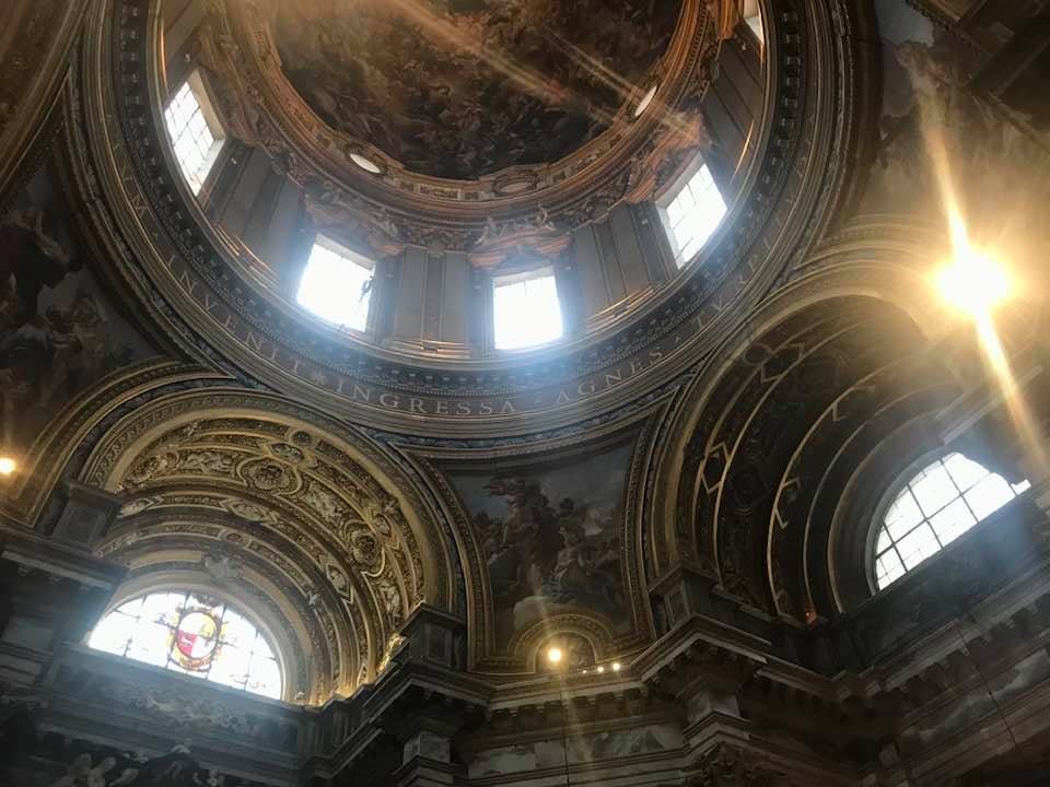 Papa Alessandro VII, successore di Innocenzo X Panphilj ( 1651, sceglie Borromini per edificare il tempio religioso) , revocò l’incarico all’architetto Borromini che si apprestava all’ultimazione architettonica della Basilica di Sant’Agnese a Piazza Navona. Rapporti difficili, dispute, incomprensioni, accuse per gli errori compiuti nel progetto, fino all’abbandono da parte dell’architetto nei lavori quasi ultimati. La chiesa nella sua facciata si caratterizza con curve laterali, al centro due campanili, ghirlande e lesene e tre portali. L’interno ha una pianta a croce greca. I quattro bracci sono sontuosamante decorati come imponeva il barocco nell’epoca. Gli stucchi di eccellente fattura sono presenti nella navata, nell’abside, nei transetti e nelle volte. Quattro altari dedicati ai santi Alessio, Ermenziana, Eustacchio e Cecilia. I transetti sono invece dedicati a Sant’Agnese. L’ altare maggiore ha quattro colonne scanalate in marmo verde antico provenienti dall’Arco di Marco Aurelio al Corso. Di notevole rilevanza la cripta del IV secolo di Sant’Agnese, sito dove fu uccisa la giovane martire. L’apparato decorativo- iconografico si estende sulle pareti affrescate, nelle volte con interventi borrominiani. Colonne e capitelli sorreggono il luogo paleocristiano. Nella Basilica è presente la tomba di Innocenzo X.