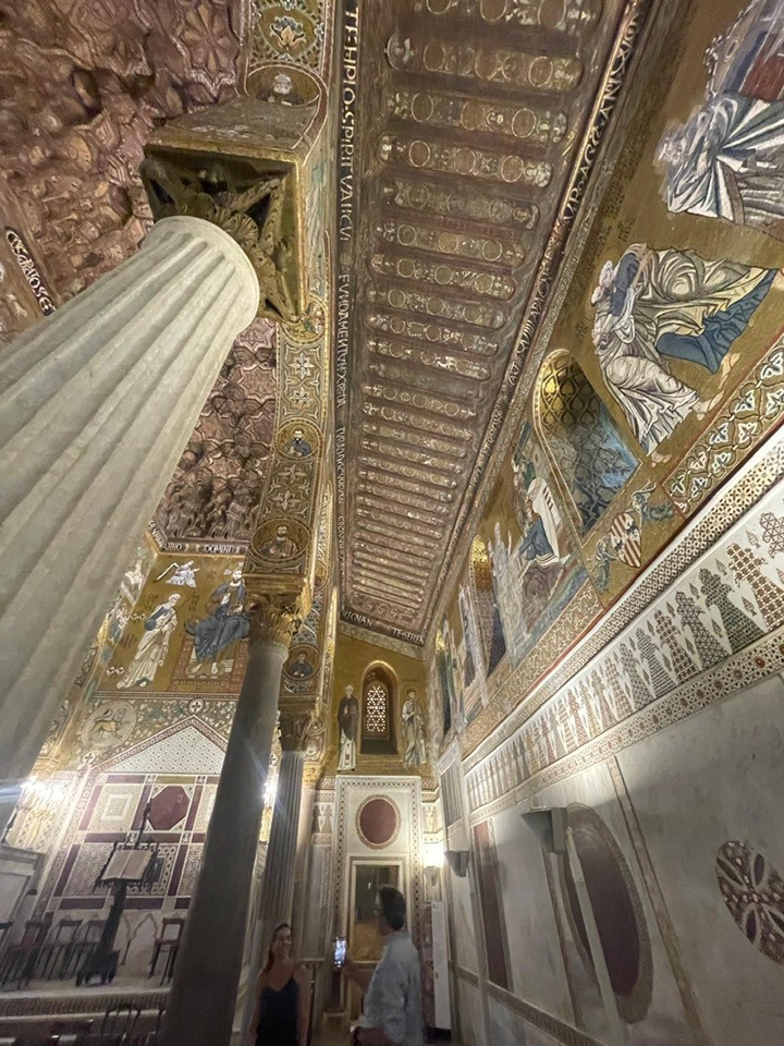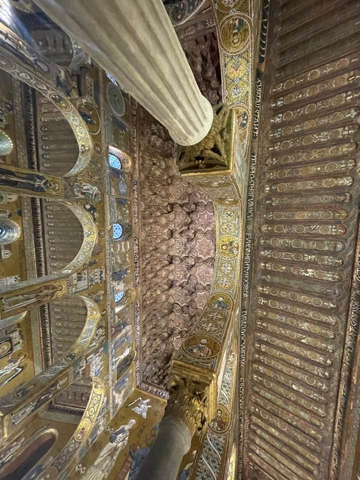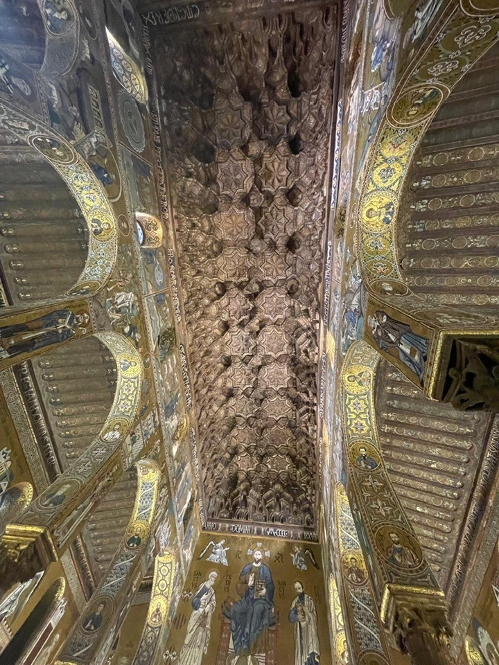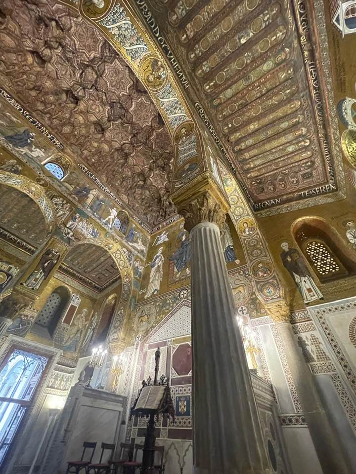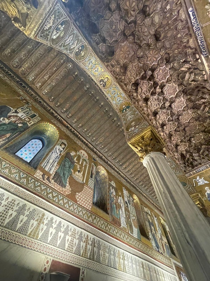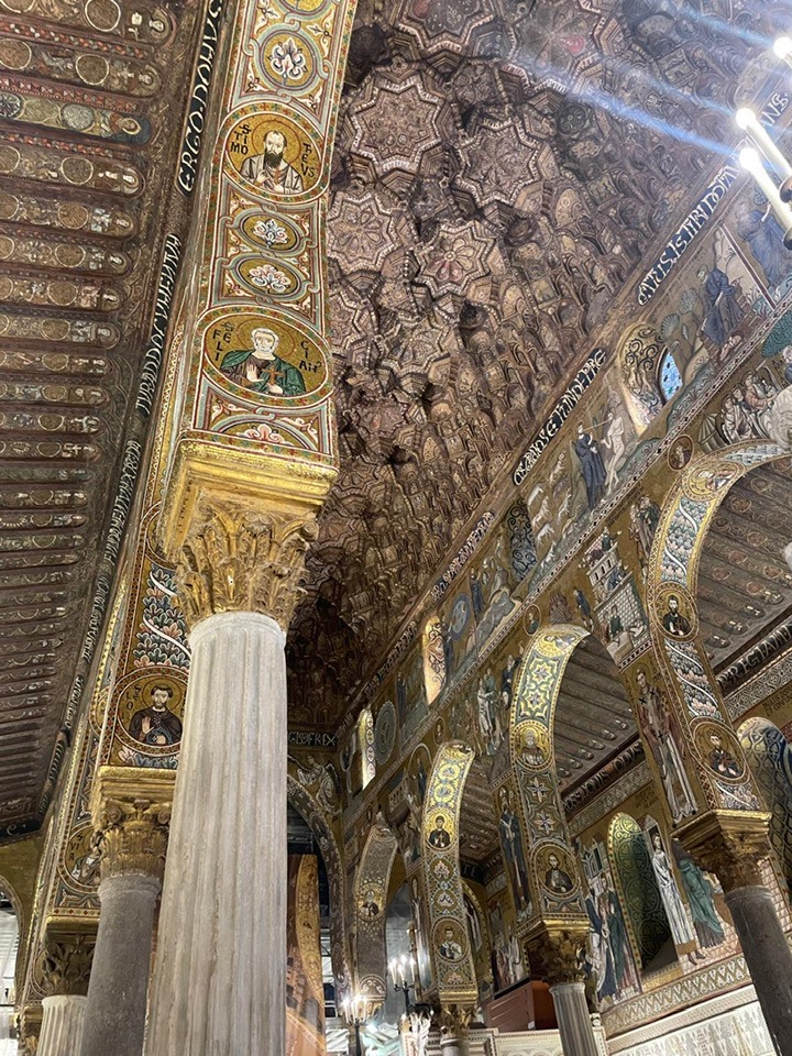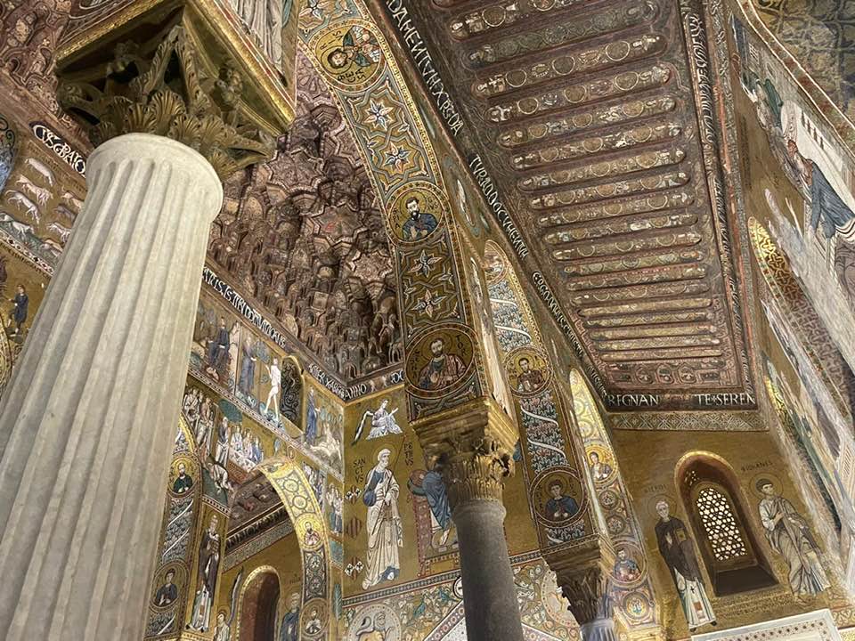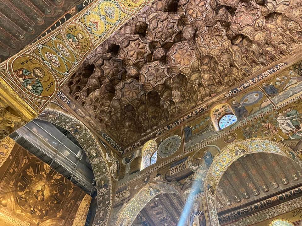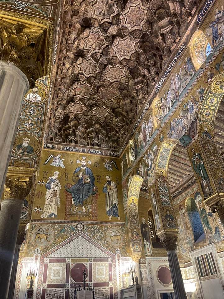 Musulmani ed ebrei, in una corte dedita alle lavorazioni preziose ed uniche, diverse anime si scambiavano informazioni e capacità nella realizzazione della Cappella Palatina. Arte e artigianato colto nelle piccole absidi semicilindriche, con influenze bizantine e islamiche: ogni superficie disponibile è decorata nelle cupole, nelle volte, dentro gli archi e nel soffitto. Tutto l’ambiente è ricoperto di mosaici dorati. I capitelli, mutuati da quelli greci e romani, presentano decorazioni bizantine nelle tre navate. Il soffitto in legno dipinto, realizzato da artisti egiziani in una struttura a nicchie sfaccettate, è pura arte islamica. Il soffitto è segmentato a cassettoni stellati, intervallati da stalattiti in una struttura generale a incastro con nicchie sfaccettate, e scene fantastiche e di vita di corte.