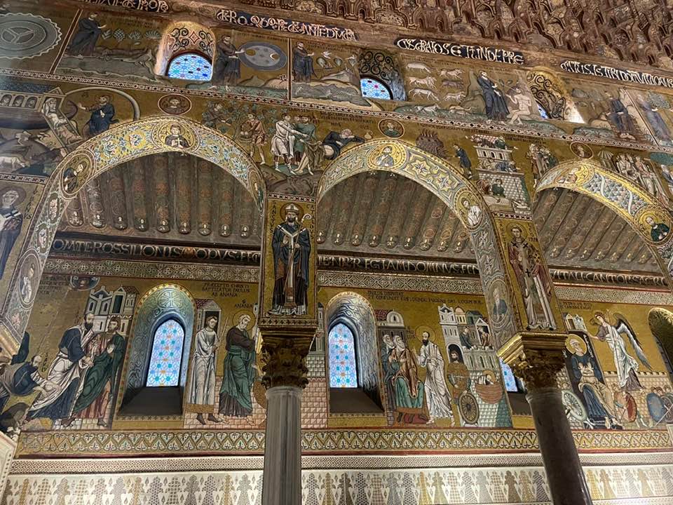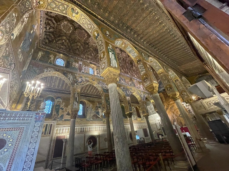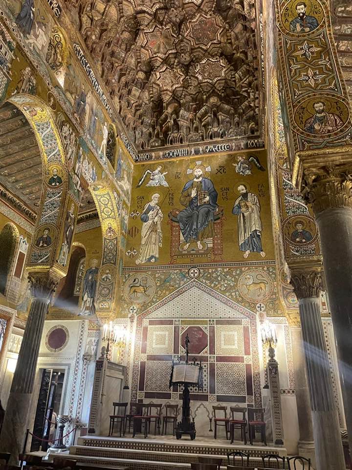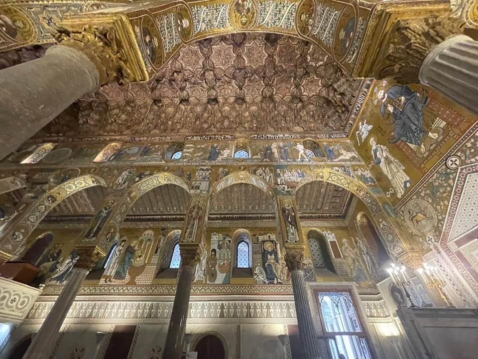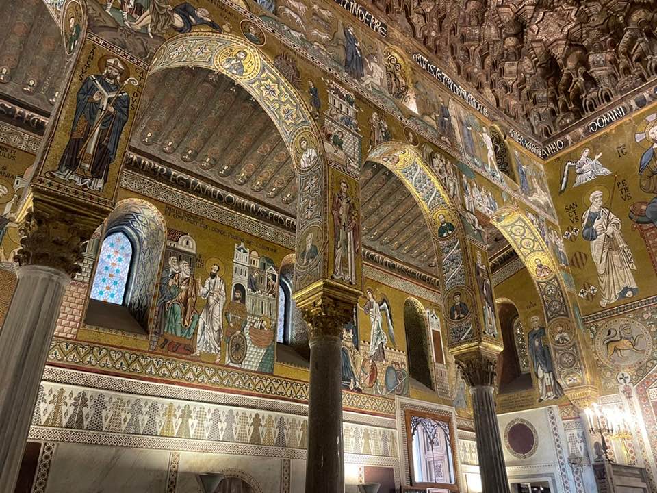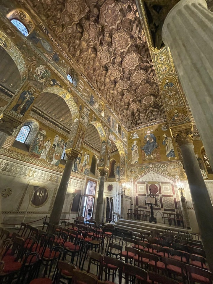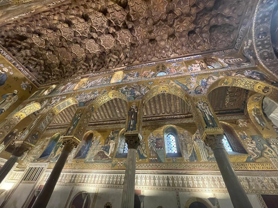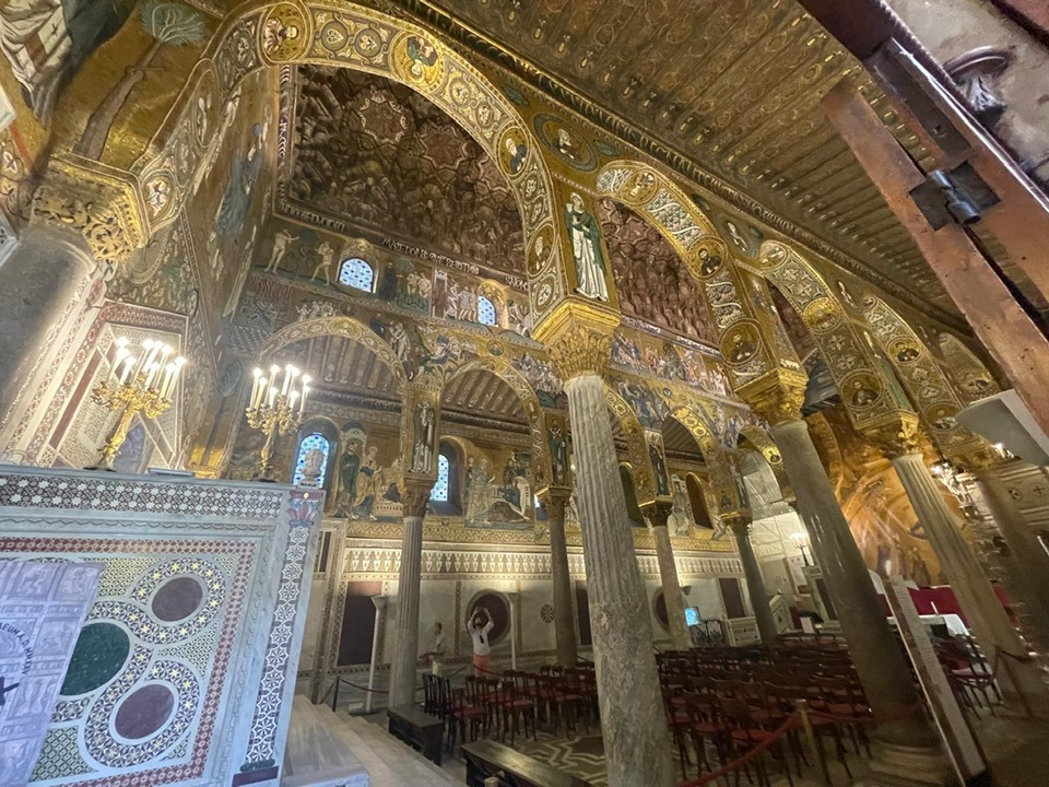 Musulmani ed ebrei, in una corte dedita alle lavorazioni preziose ed uniche, diverse anime si scambiavano informazioni e capacità nella realizzazione della Cappella Palatina. Arte e artigianato colto nelle piccole absidi semicilindriche, con influenze bizantine e islamiche: ogni superficie disponibile è decorata nelle cupole, nelle volte, dentro gli archi e nel soffitto. Tutto l’ambiente è ricoperto di mosaici dorati. I capitelli, mutuati da quelli greci e romani, presentano decorazioni bizantine nelle tre navate. Il soffitto in legno dipinto, realizzato da artisti egiziani in una struttura a nicchie sfaccettate, è pura arte islamica. Il soffitto è segmentato a cassettoni stellati, intervallati da stalattiti in una struttura generale a incastro con nicchie sfaccettate, e scene fantastiche e di vita di corte.