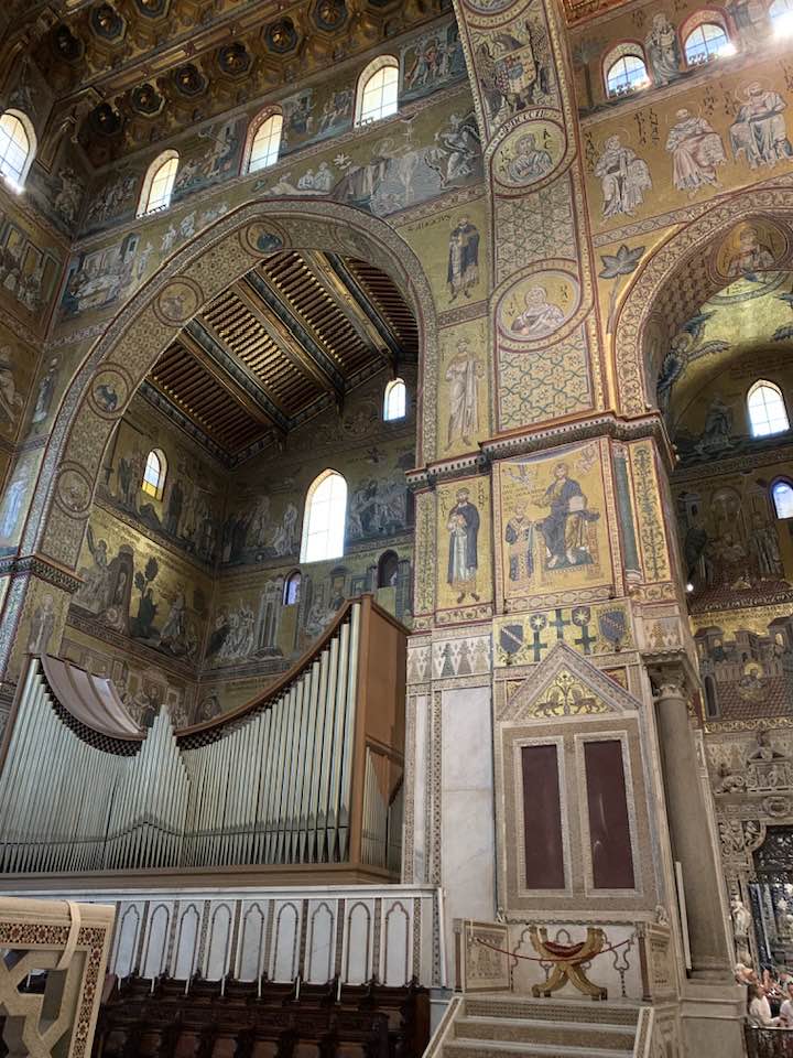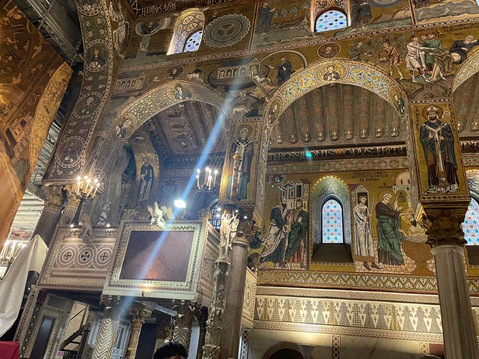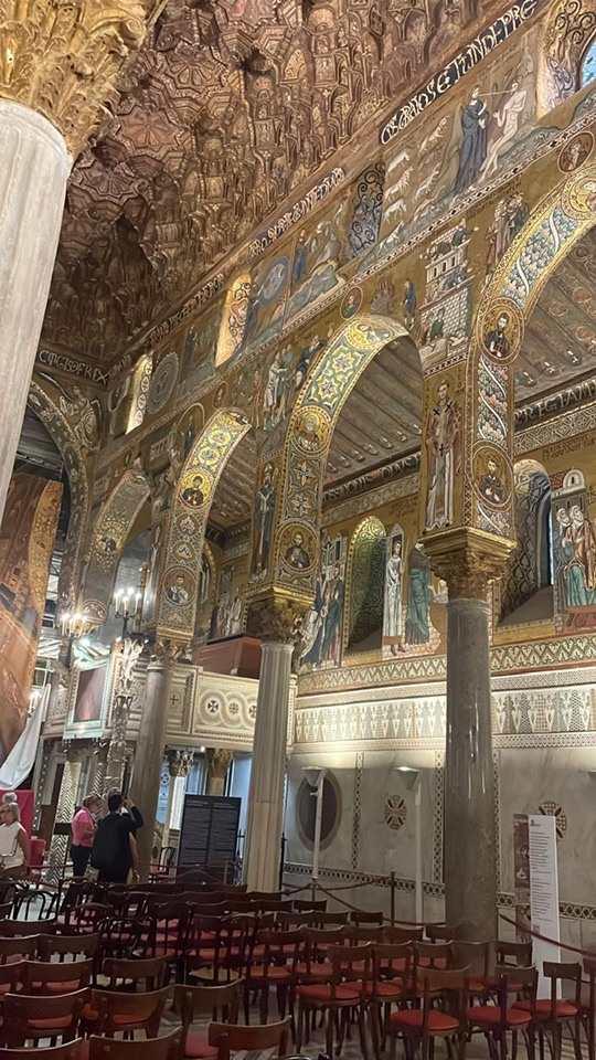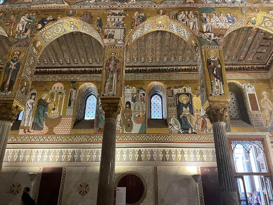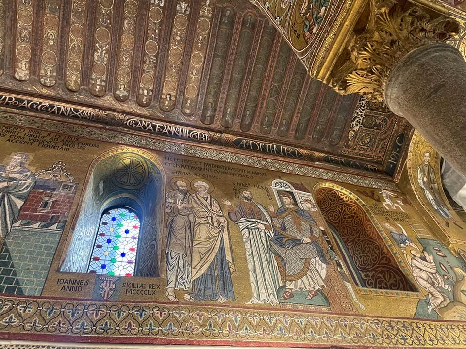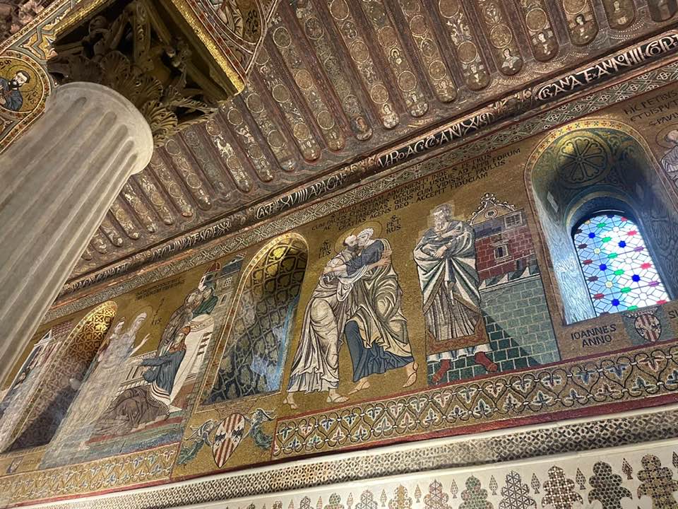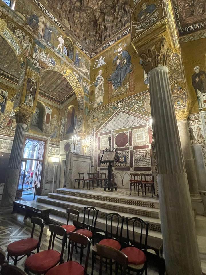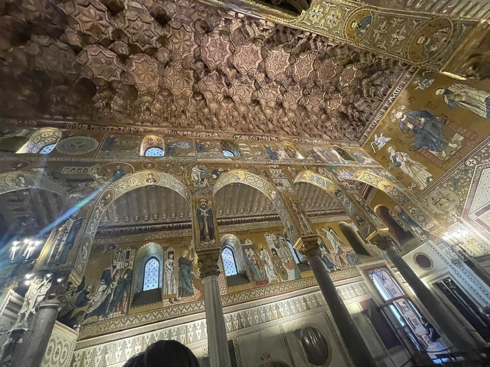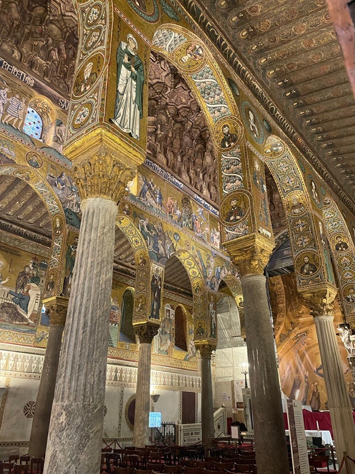 Musulmani ed ebrei, in una corte dedita alle lavorazioni preziose ed uniche, diverse anime si scambiavano informazioni e capacità nella realizzazione della Cappella Palatina. Arte e artigianato colto nelle piccole absidi semicilindriche, con influenze bizantine e islamiche: ogni superficie disponibile è decorata nelle cupole, nelle volte, dentro gli archi e nel soffitto. Tutto l’ambiente è ricoperto di mosaici dorati. I capitelli, mutuati da quelli greci e romani, presentano decorazioni bizantine nelle tre navate. Il soffitto in legno dipinto, realizzato da artisti egiziani in una struttura a nicchie sfaccettate, è pura arte islamica. Il soffitto è segmentato a cassettoni stellati, intervallati da stalattiti in una struttura generale a incastro con nicchie sfaccettate, e scene fantastiche e di vita di corte.