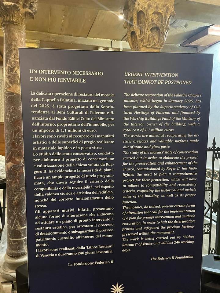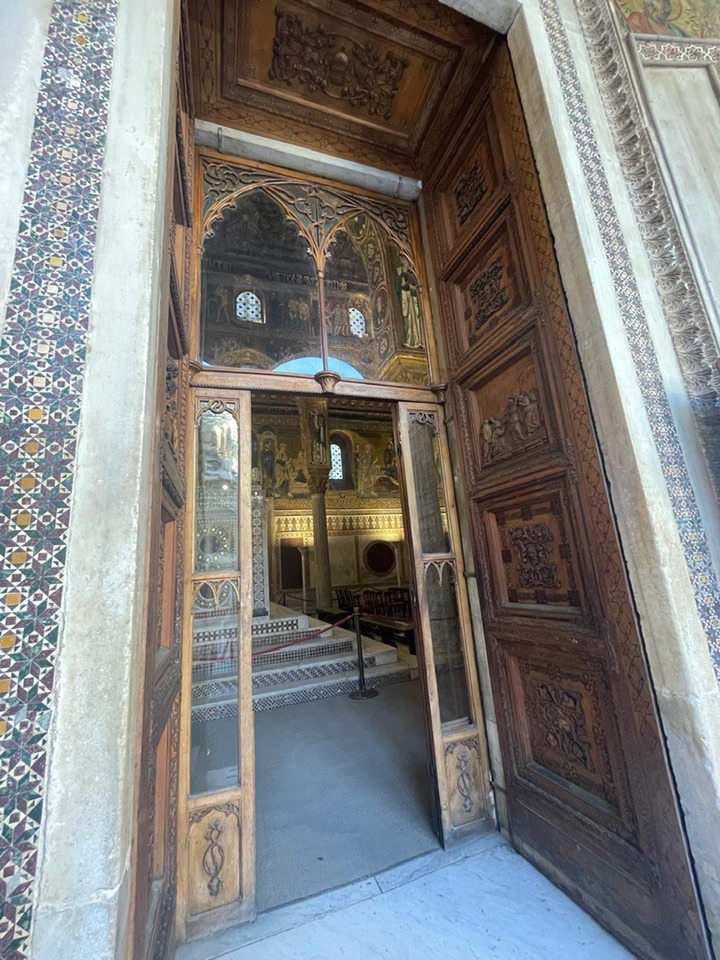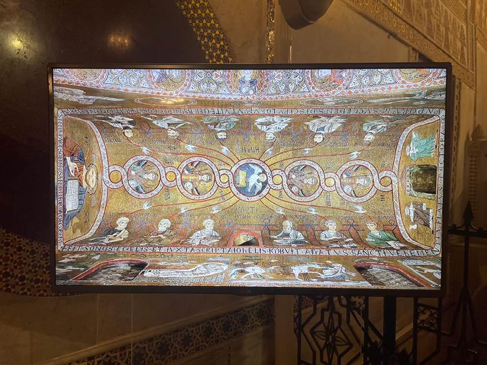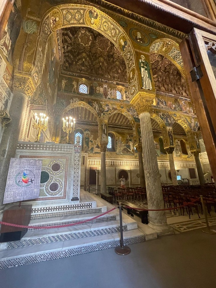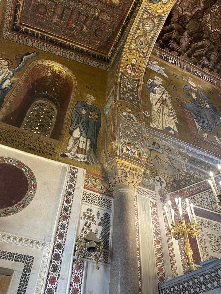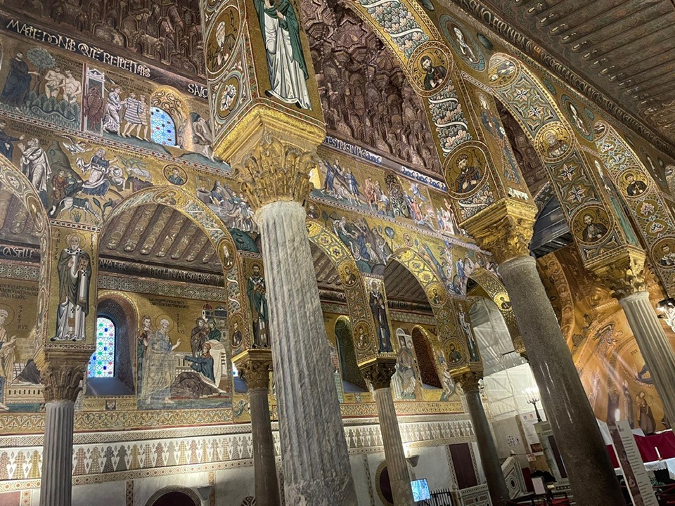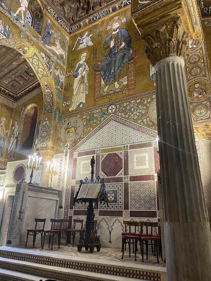 La Cappella Palatina, realizzata per volere di Ruggero II d’Altavilla nel Palazzo Reale di Palermo, è frutto di una ristretta cerchia di maestranze colte, in un’unicità esemplare e preziosa, con allestimenti artigianali artistici irripetibili. I mosaici dorati e i soffitti di scuola araba sono espressioni della cultura appunto arabo-normanna. Il pragmatismo del re e dei suoi dignitari riunì in una scuola cosmopolita ebrei, cristiani e arabi, non solo nell’esercizio della fede, ma soprattutto nelle capacità artigianali.