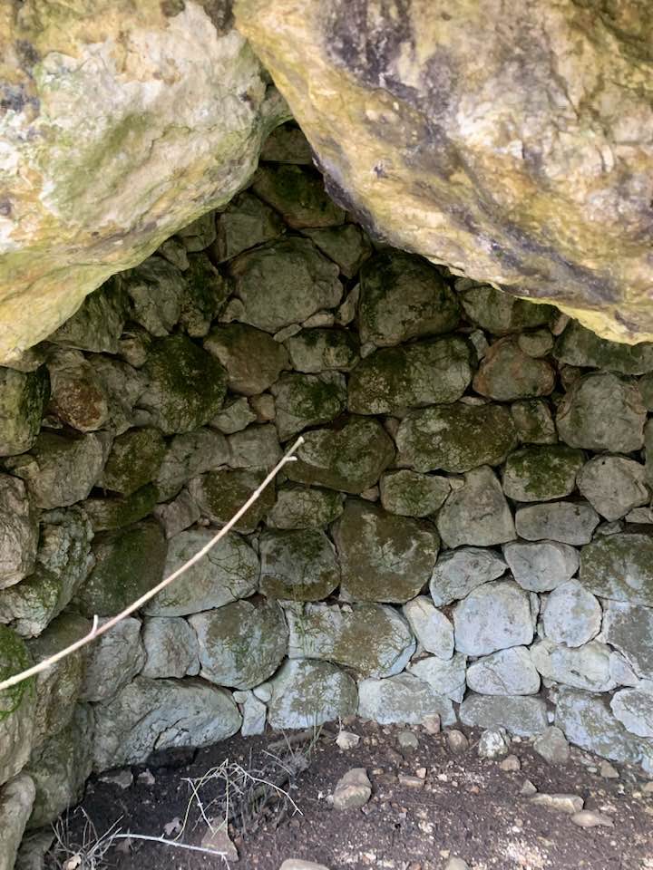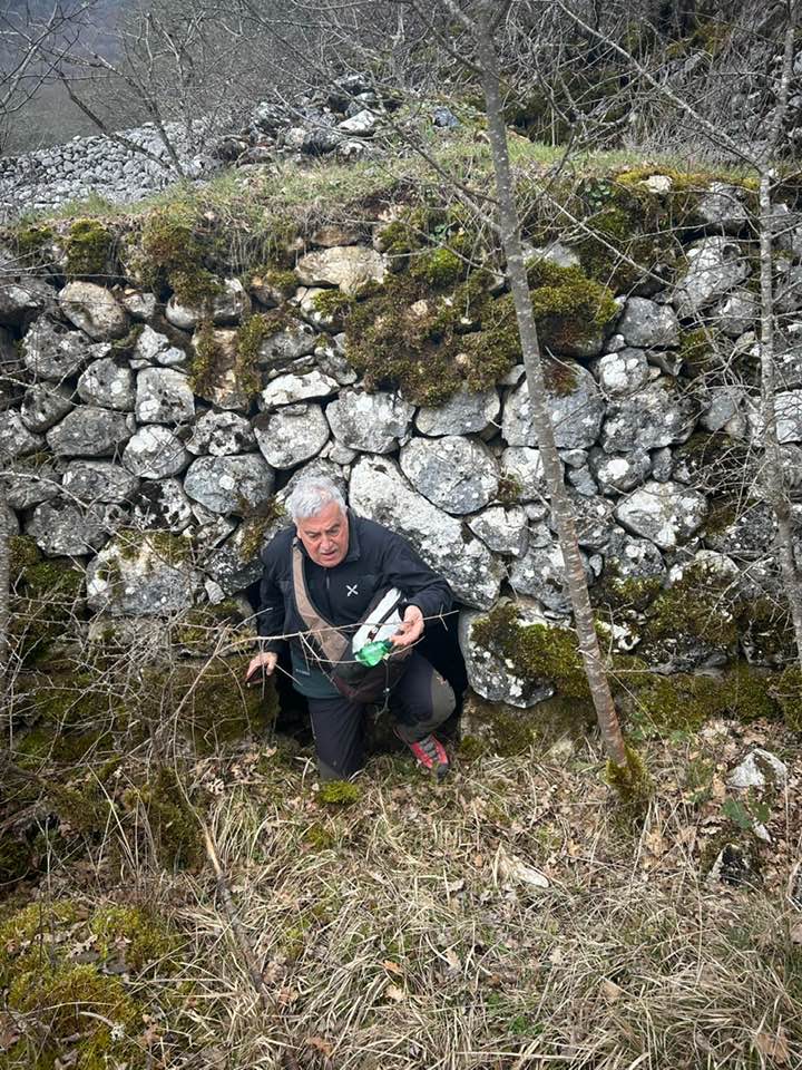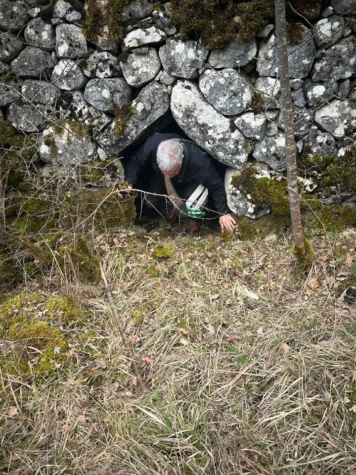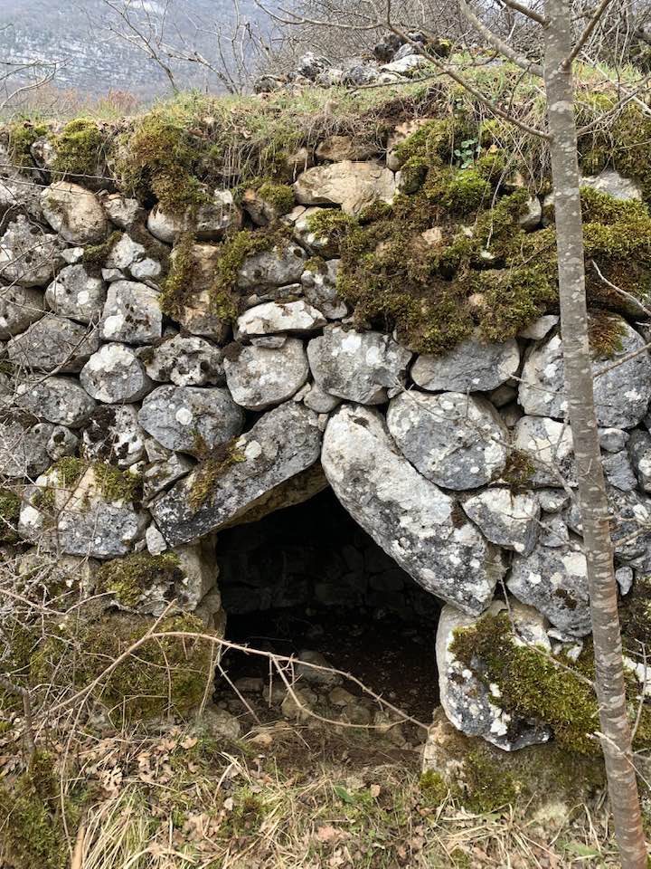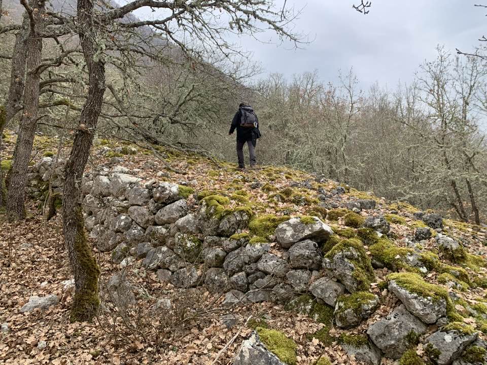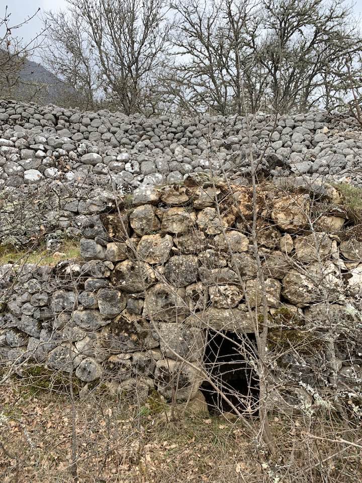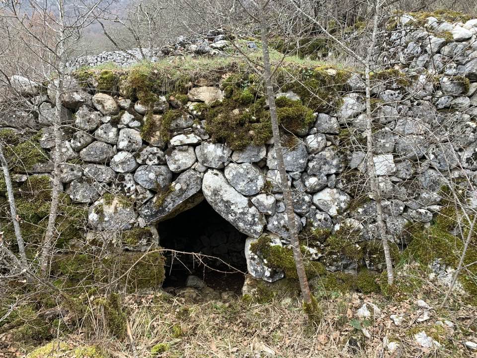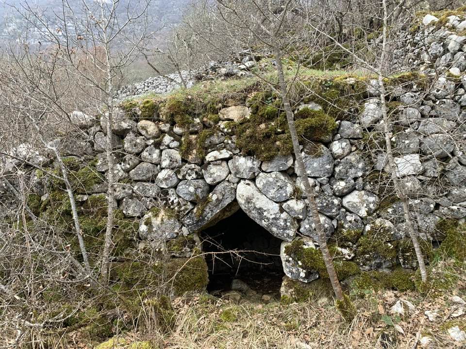 Un lembo di territorio che si appoggia alla riva occidentale del fiume Aterno, area densa di “macerine” e cumuli di pietra, risultato dello spietramento che è proprio di una particolare lavorazione del terreno, eseguita sempre in fase di preparazione del suolo a usi agricoli come le semine. Un lavoro duro, praticato nei decenni trascorsi per il miglioramento fondiario di piccoli appezzamenti, per rimuovere dal terreno pietre e grandi massi per le coltivazioni di cereali e legumi e rendere più agevole la lavorazione del suolo, quindi bonificarlo dalle pietre superficiali che venivano rimosse e accatastate seguendo un ordine ben preciso nel paesaggio agrario diffuso del Solco dell’Aterno, con un’attenzione rivolta a non occupare le aree rese così fertili dallo stesso spietramento. Con le medesime pietre si determinavano e si costruivano le capanne in pietra a cupola, composte manualmente a secco: pietre unite tra loro senza calce, con la giusta inclinazione verso l’interno della capanna che lentamente prendeva forma. La struttura si alzava a forma di cono fino alla chiusura sommitale e, per compressione tra loro, le pietre garantivano la tenuta del manufatto agricolo che non aveva smottamenti. Utilizzate per ripararsi in caso di maltempo oppure come ricovero per la notte per non tornare nelle abitazioni di Fontecchio. Dalle prime ore del giorno (“da stella a stella”, raccontano), dall’alba al tramonto, si lavoravano le terre. L’ingresso della capanna in pietra, nell’esempio osservato e rilevato (la capanna è stata costruita su uno spietramento, ma elevata in altezza), si presenta con grandi pietre che fungono da spalle (cornici e contorni, rivestimento laterale dello stipite) dell’ingresso della struttura. Due massi allungati, e forse questi sgrossati e lavorati con la mazzetta in ferro per dare una forma similare agli stessi massi, formano così una cuspide che, anch’essa per compressione, mantiene l’ingresso ben congiunto, anche con la spinta verso il basso che esercitano le grandi pietre poste sopra le due forme cuspidali citate che si osservano appunto sul frontale della capanna: danno in altezza l’accesso verso l’interno. In altre capanne della zona, l’ingresso è con pietre architravate. La struttura in pietra a secco poteva ospitare anche tre persone che prendevano posto nel perimetro interno della stessa capanna in pietra. La terra e il muschio, infine, hanno rivestito nel corso dei decenni la parte sommitale del ricovero. L’orientamento dell’ingresso della capanna era rivolto verso i campi coltivati. L’interno della capanna presenta le pietre abbastanza livellate tra loro che formano, infine, una cortina ben uniforme. Lo spietramento dei campi era complesso: le pietre venivano ammassate su un fronte che doveva restare compatto e non scivolare sui terreni. I massi venivano incastrati sapientemente e con perizia tra loro, fino a creare un vero muro di sostegno, e poi si procedeva a scaricare i massi sulla sommità che si allargava ed oggi è ricoperta da muschio, mentre il perimetro murario del fronte dello spietramento si allungava e scendeva, seguendo l’andamento inclinato del suolo. I contadini delle aree contigue e confinanti, che coltivavano i campi, scaricavano i massi su un unico spietramento comune, e per questo si osserva una serie di spietramenti su tutto il paesaggio di “Colle Caio”. Lo spietramento, tuttavia, era considerato una pratica manuale comune e diffusa nella rimozione dei massi, storicamente eseguita a mano, estremamente difficoltosa e pesante nel lavoro dei fondi agricoli. Le pietre venivano trasportate con le ceste fino al luogo di deposito oppure a braccia nude, e formavano cumuli che crescevano in altezza ai bordi dei campi coltivati, come si osserva nel territorio alle pendici di “Colle Caio” (Colle Caldo) preso in esame. Vicino a questi terreni, in un fosso scavato, una nicchia con una sorgente rara e preziosa per tutto il versante, ancora adesso, dalla quale prelevavano l’acqua i contadini con un contenitore e una corda che scendeva nel fosso. Fino agli anni ’60 del Novecento, si racconta, l’acqua del fiume Aterno si poteva bere. L’ingresso della capanna in pietra a secco veniva protetto contro gli animali selvatici, soprattutto la notte, con i rovi intrecciati. Infine, il cibo, preparato in una “casetta” nell’immediato borgo di Fontecchio con i prodotti locali, veniva cotto nel fuoco del camino, come vuole la tradizione locale.