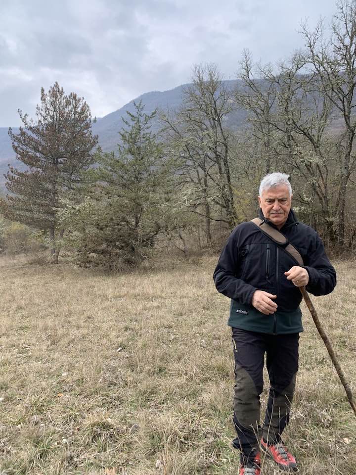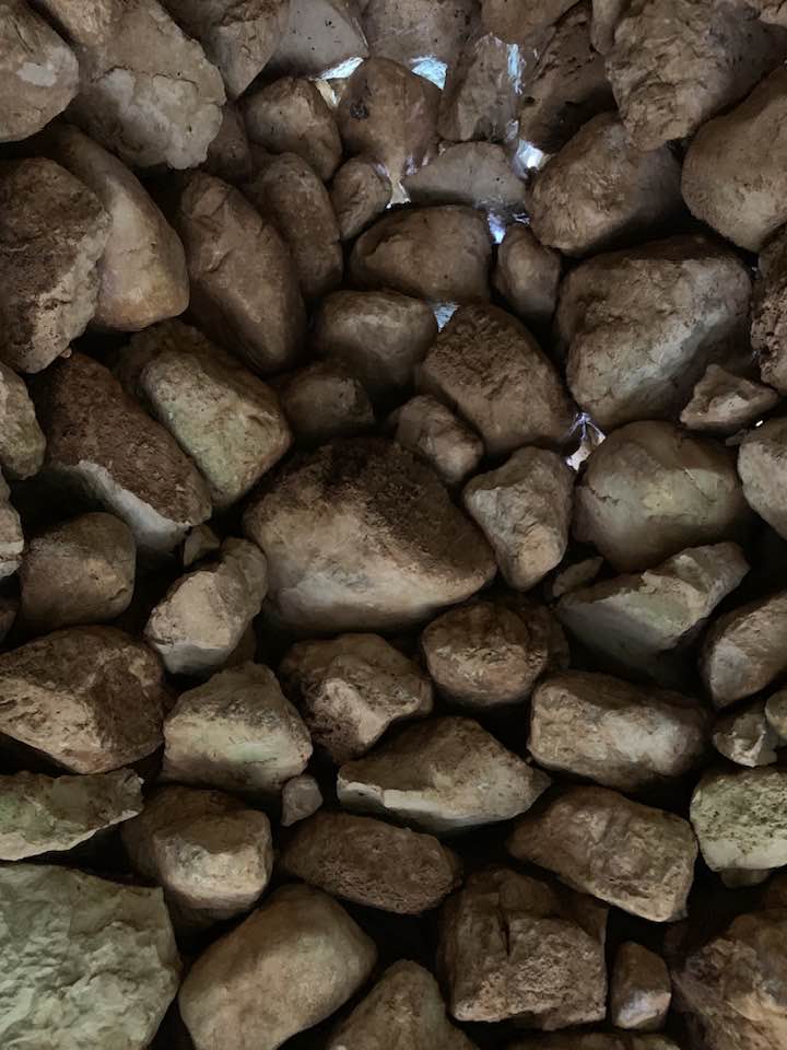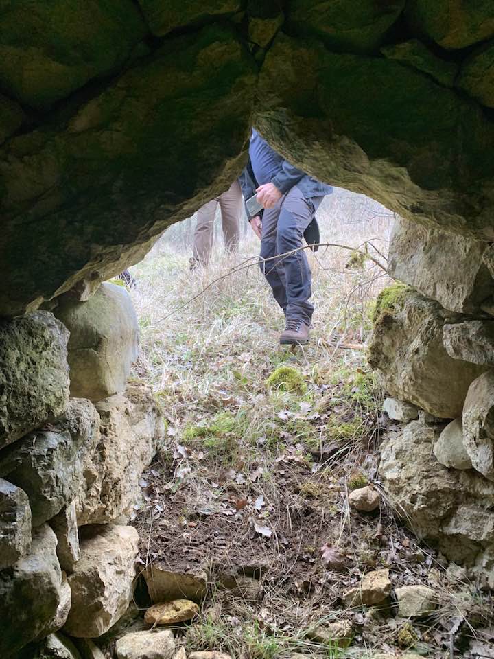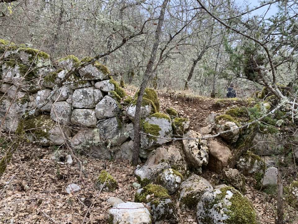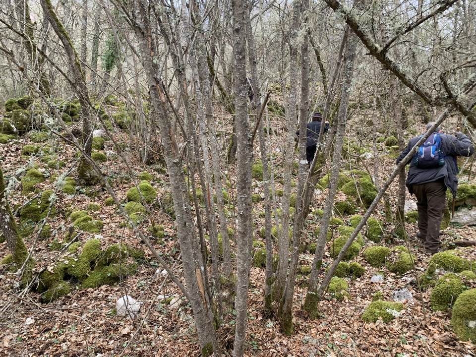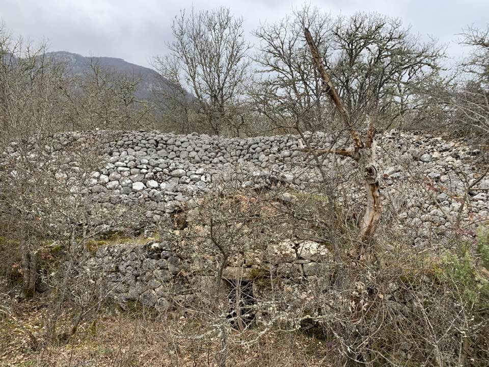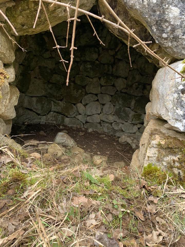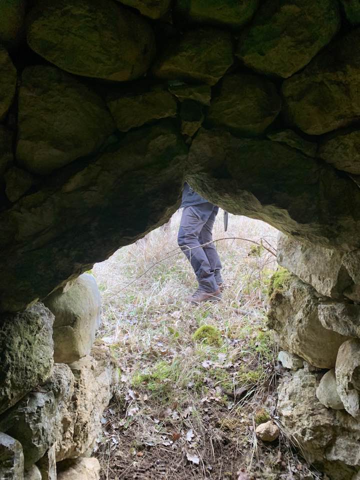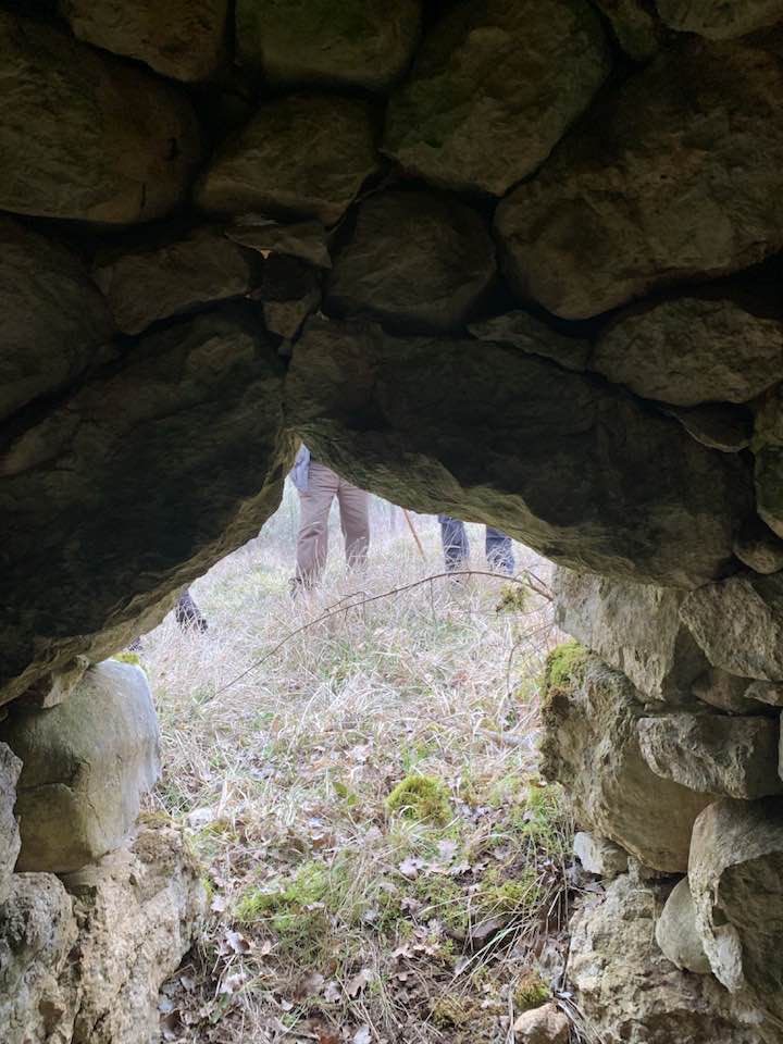 Un lembo di territorio che si appoggia alla riva occidentale del fiume Aterno, area densa di “macerine” e cumuli di pietra, risultato dello spietramento che è proprio di una particolare lavorazione del terreno, eseguita sempre in fase di preparazione del suolo a usi agricoli come le semine. Un lavoro duro, praticato nei decenni trascorsi per il miglioramento fondiario di piccoli appezzamenti, per rimuovere dal terreno pietre e grandi massi per le coltivazioni di cereali e legumi e rendere più agevole la lavorazione del suolo, quindi bonificarlo dalle pietre superficiali che venivano rimosse e accatastate seguendo un ordine ben preciso nel paesaggio agrario diffuso del Solco dell’Aterno, con un’attenzione rivolta a non occupare le aree rese così fertili dallo stesso spietramento. Con le medesime pietre si determinavano e si costruivano le capanne in pietra a cupola, composte manualmente a secco: pietre unite tra loro senza calce, con la giusta inclinazione verso l’interno della capanna che lentamente prendeva forma. La struttura si alzava a forma di cono fino alla chiusura sommitale e, per compressione tra loro, le pietre garantivano la tenuta del manufatto agricolo che non aveva smottamenti. Utilizzate per ripararsi in caso di maltempo oppure come ricovero per la notte per non tornare nelle abitazioni di Fontecchio. Dalle prime ore del giorno (“da stella a stella”, raccontano), dall’alba al tramonto, si lavoravano le terre. L’ingresso della capanna in pietra, nell’esempio osservato e rilevato (la capanna è stata costruita su uno spietramento, ma elevata in altezza), si presenta con grandi pietre che fungono da spalle (cornici e contorni, rivestimento laterale dello stipite) dell’ingresso della struttura. Due massi allungati, e forse questi sgrossati e lavorati con la mazzetta in ferro per dare una forma similare agli stessi massi, formano così una cuspide che, anch’essa per compressione, mantiene l’ingresso ben congiunto, anche con la spinta verso il basso che esercitano le grandi pietre poste sopra le due forme cuspidali citate che si osservano appunto sul frontale della capanna: danno in altezza l’accesso verso l’interno. In altre capanne della zona, l’ingresso è con pietre architravate. La struttura in pietra a secco poteva ospitare anche tre persone che prendevano posto nel perimetro interno della stessa capanna in pietra. La terra e il muschio, infine, hanno rivestito nel corso dei decenni la parte sommitale del ricovero. L’orientamento dell’ingresso della capanna era rivolto verso i campi coltivati. L’interno della capanna presenta le pietre abbastanza livellate tra loro che formano, infine, una cortina ben uniforme. Lo spietramento dei campi era complesso: le pietre venivano ammassate su un fronte che doveva restare compatto e non scivolare sui terreni. I massi venivano incastrati sapientemente e con perizia tra loro, fino a creare un vero muro di sostegno, e poi si procedeva a scaricare i massi sulla sommità che si allargava ed oggi è ricoperta da muschio, mentre il perimetro murario del fronte dello spietramento si allungava e scendeva, seguendo l’andamento inclinato del suolo. I contadini delle aree contigue e confinanti, che coltivavano i campi, scaricavano i massi su un unico spietramento comune, e per questo si osserva una serie di spietramenti su tutto il paesaggio di “Colle Caio”. Lo spietramento, tuttavia, era considerato una pratica manuale comune e diffusa nella rimozione dei massi, storicamente eseguita a mano, estremamente difficoltosa e pesante nel lavoro dei fondi agricoli. Le pietre venivano trasportate con le ceste fino al luogo di deposito oppure a braccia nude, e formavano cumuli che crescevano in altezza ai bordi dei campi coltivati, come si osserva nel territorio alle pendici di “Colle Caio” (Colle Caldo) preso in esame. Vicino a questi terreni, in un fosso scavato, una nicchia con una sorgente rara e preziosa per tutto il versante, ancora adesso, dalla quale prelevavano l’acqua i contadini con un contenitore e una corda che scendeva nel fosso. Fino agli anni ’60 del Novecento, si racconta, l’acqua del fiume Aterno si poteva bere. L’ingresso della capanna in pietra a secco veniva protetto contro gli animali selvatici, soprattutto la notte, con i rovi intrecciati. Infine, il cibo, preparato in una “casetta” nell’immediato borgo di Fontecchio con i prodotti locali, veniva cotto nel fuoco del camino, come vuole la tradizione locale.