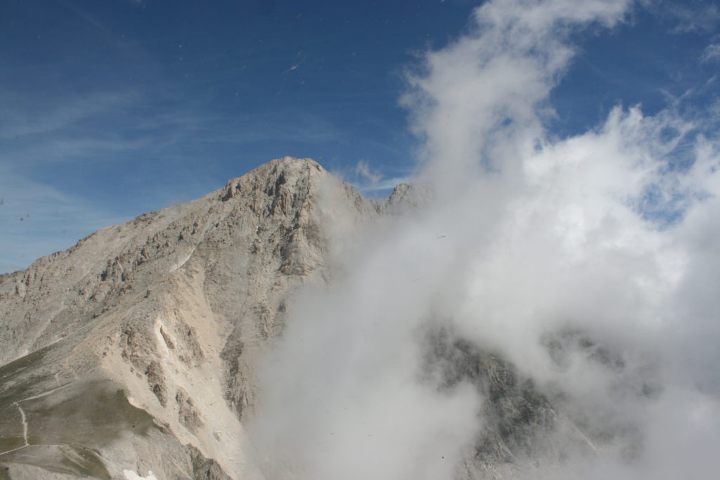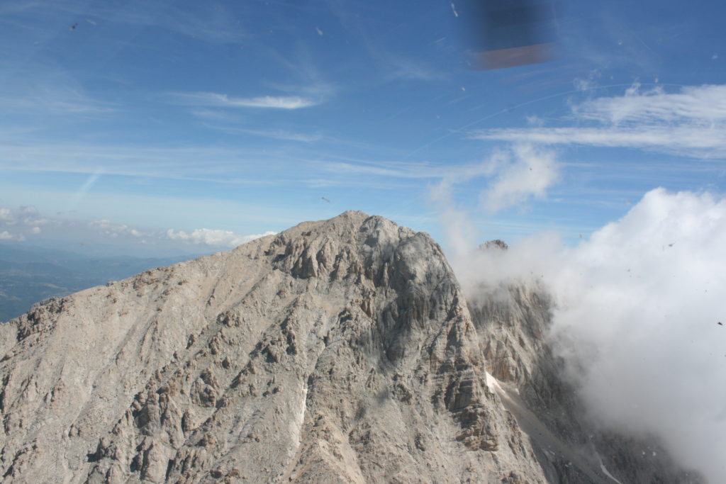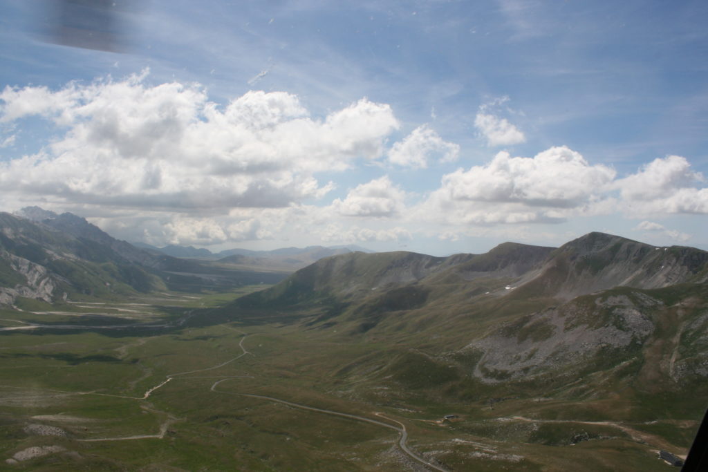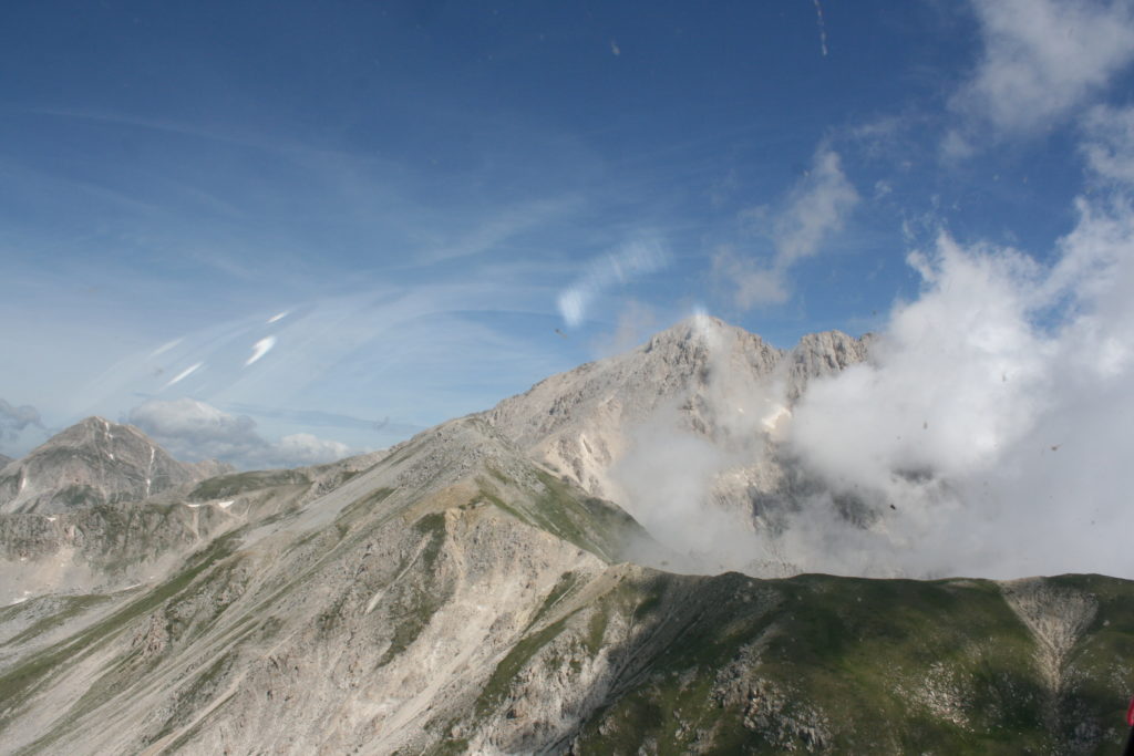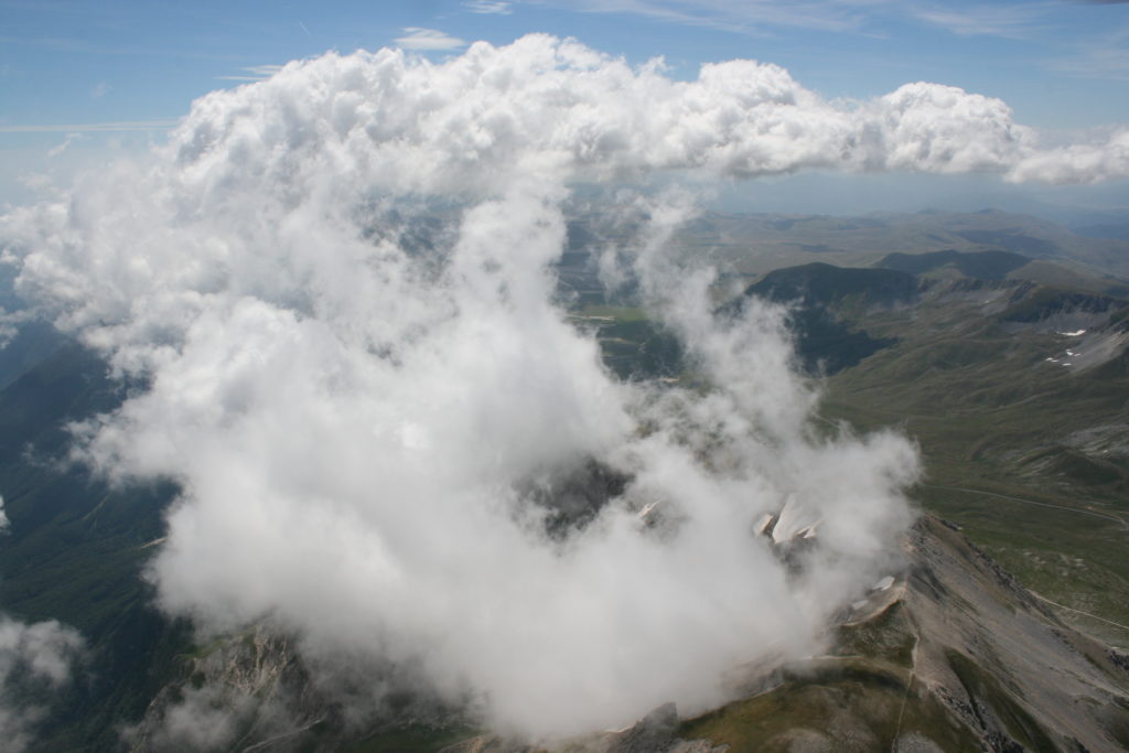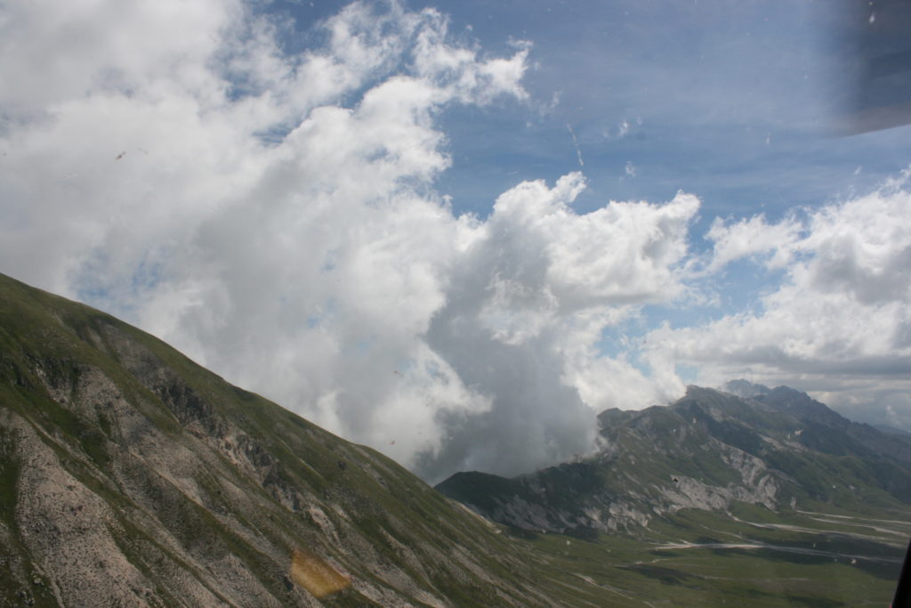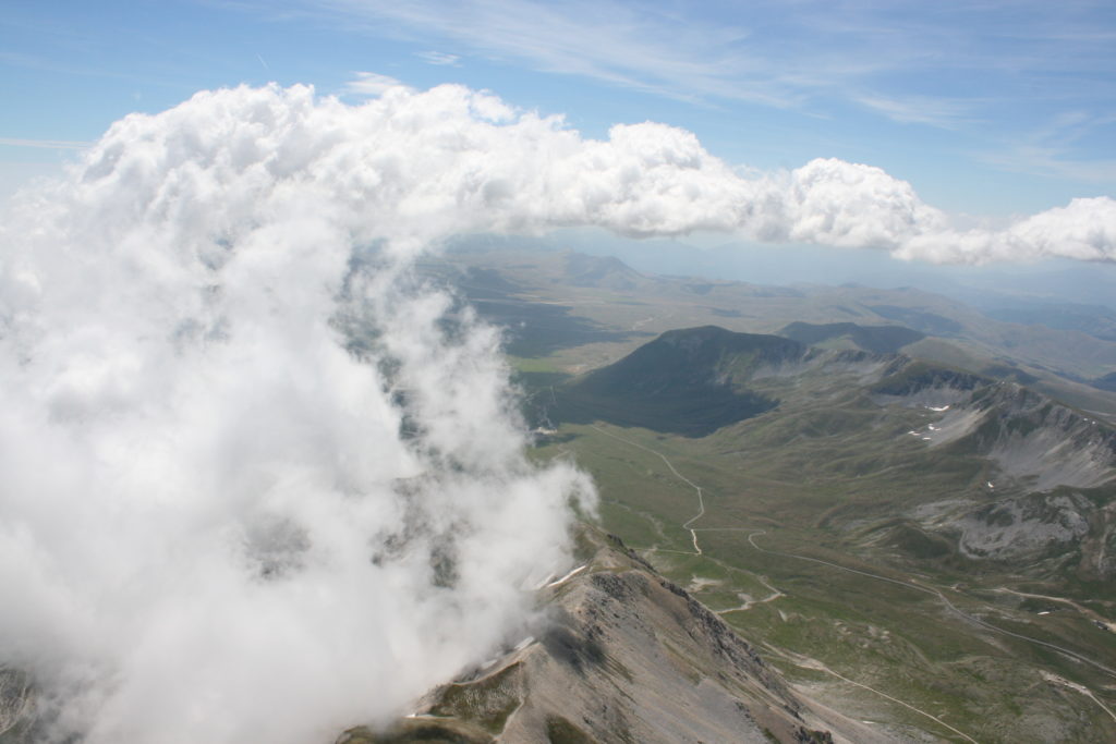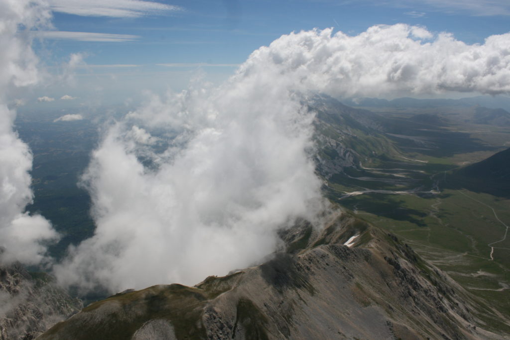 Proviamo a pensare, in sintesi, partendo dagli Illuministi del Grand Tour che scendono per la Via degli Abruzzi e da Roma per la Tiburtina Valeria ( rampolli delle famiglie bene, prelati, colti esploratori, nobili decadenti ) – viaggiatori stranieri in cerca di sensazioni per i loro taccuini, nell’ Ottocento poi – il quadro cambia- l’esplorazione a fini scientifici e il Novecento letterario della narrazione: L’Aquila e il massiccio del Gran Sasso d’Italia sono stati sempre un binomio perfetto, in stretto rapporto, una combinazione non solo geografica che muta, sì, ha vestito i destini sì, ma ha indossato il rito del paesaggio urbano prima e poi montano delle vette, interfacciati, esaltando la muta bellezza, quasi fosse una fase di “passaggio”, sappiamo, secolare, viaggiare dalla città, per terminare davanti al suo Totem profetico avvolto dalle nuvole, inviolabile, il Gran Sasso aspro e erto, che non smette mai di svelare i nostri limiti, e se hai le capacità, puoi anche ascoltarlo. E noi, lo sappiamo, siamo diretti proprio nel ventre della grande montagna, dalla città dell’Aquila in un viaggio altro, diverso, per certi aspetti subliminale lì, dove s’incontrano le nuvole, esclusivo “tour” del massiccio, e della sua solitudine geologica, per poterlo osservare sotto un profilo inconsueto, e scriverne. Dall’aeroporto di Preturo ci alziamo con l’elicottero in codice in VDS i – Ciarli 103. “Yo – yo” , serie 1, pilota Davide Zecca titolare dell’azienda (istruttore, collaudatore e costruttore di elicotteri), figlio di Giorgio Zecca uno dei fautori della pista di volo quando fu ideata (il management dell’aeroporto dovrebbe ricordarlo con una intitolazione nella struttura). Dal Parco Nazionale Gran Sasso e Monti della Laga le autorizzazioni al volo, i protocolli da rispettare, le aree interdette. Il volo. L’Aquila lentamente si avvicina con il suo skyline, da nord -ovest, “luccicante”, città nova, e poi si apre e dispiega il suo involucro urbanistico impattante, dentro un periplo l’elicottero sorvola, trasla e vira in un grande cerchio, compie una rotazione e sotto la città ( Davide ha tolto il finestrino per osservare meglio e farmi fotografare ) nel suo primo disegno costitutivo dello sforzo edificatorio sulle rocce ancora visibile, permanente, primitivo e fondativo della città nova Aquila, ma lentamente nel tempo fagocitato dai palazzinari, dalle politiche portatrici del disprezzo del Bene comune, dai profitti ad ogni costo, dagli insensati sventramenti e distruzioni di storici edifici o di traccia di questi, per erigere lì quanto di più insulso e devastante, e soprattutto contro il principio di bellezza della città storica, bene materiale e capitale culturale. Il volo prosegue. Ottime condizioni metereologiche nonostante l’elevata temperatura, lentamente ci alziamo a diecimila piedi (tremila metri) frontale ma a distanza Corno Grande. Eccezionale attività in dinamica, ascendenza che sfrutta le pendici delle montagne in avvicinamento al nostro obiettivo, i costoni certo, il vento e le correnti ascensionali che intercettiamo. La cima di Corno Grande, l’aria rarefatta, stabili i parametri di volo, non è facile portare lì l’elicottero in una velocità costante nei limiti di sicurezza, nella misura del vento a quelle quote. “Come gli uccelli” mi dice Davide, per un elicottero piccolo le difficoltà aumentano, hanno protocolli molto stretti e l’abilità del pilota è starne dentro con lucidità, freddezza e temperanza. Corno Grande, direzione 360°, una serie, larga, di manovre per stare dentro le correnti e moderare il volo. Corno Grande: dove s’incontrano le nuvole… Eccole!