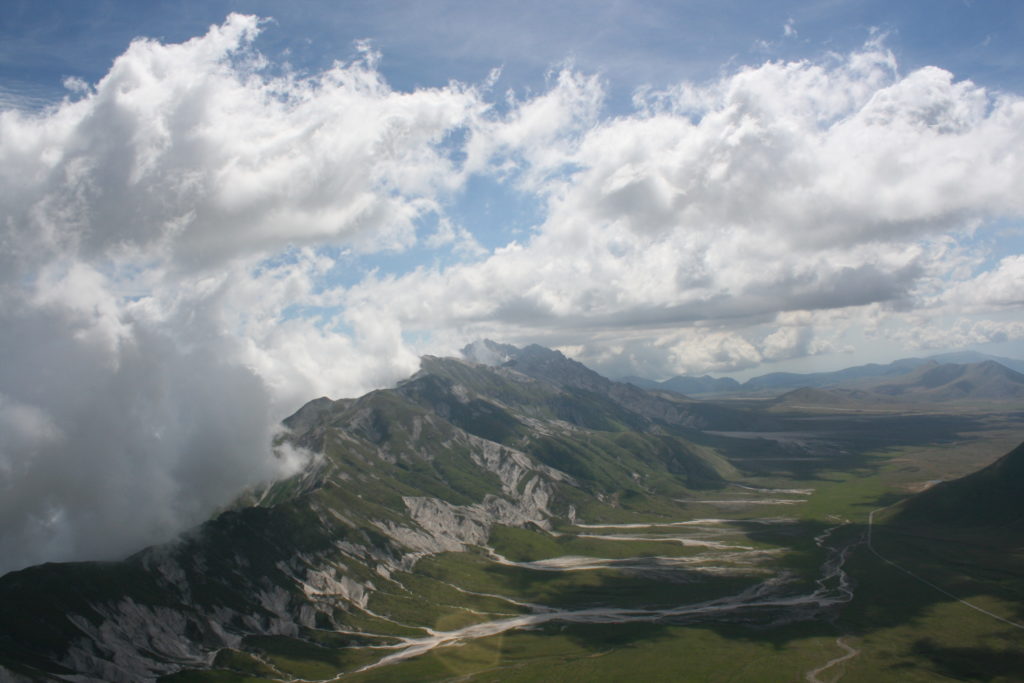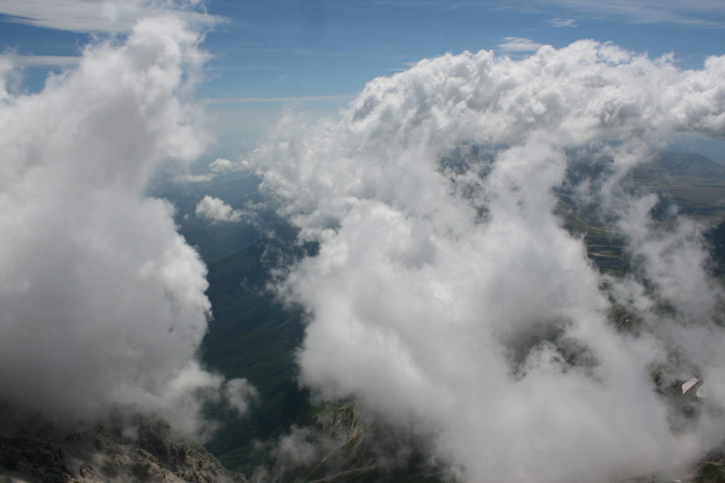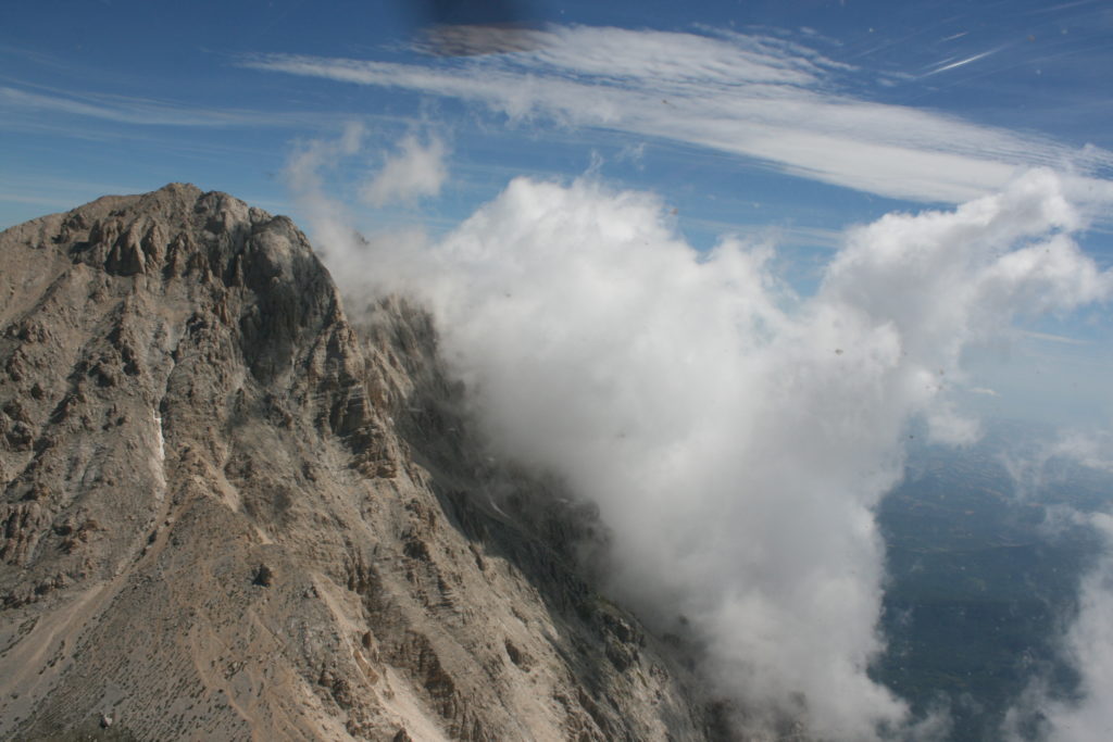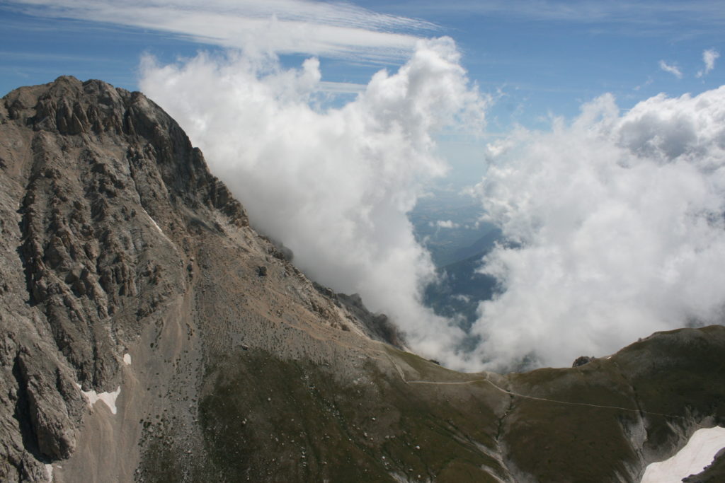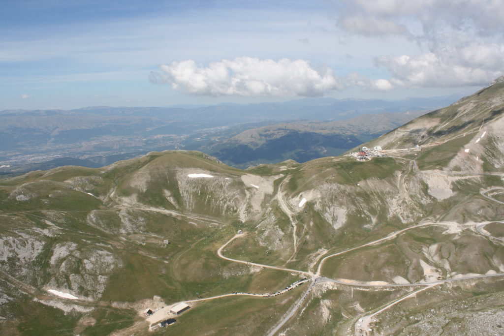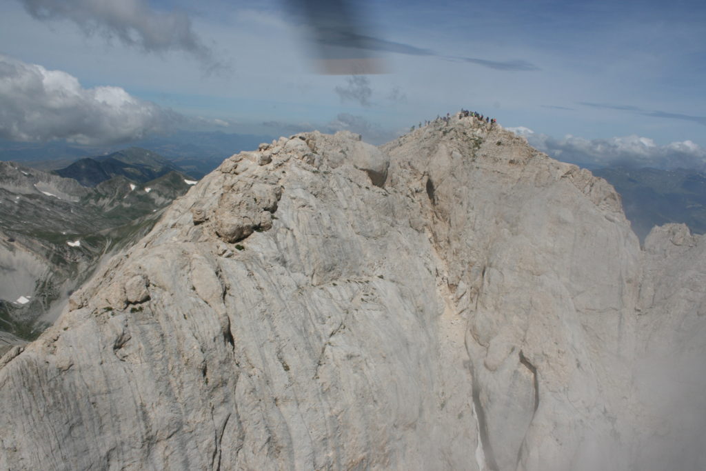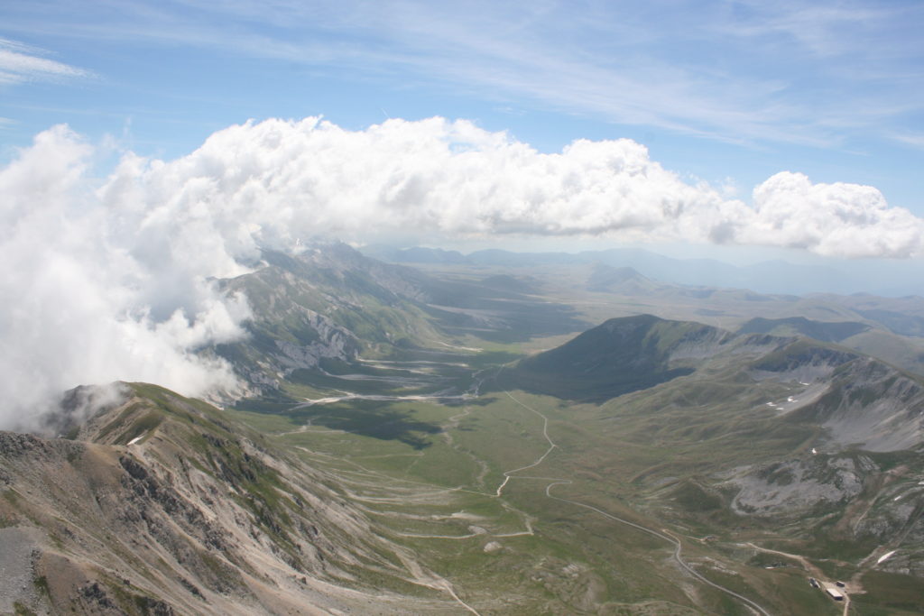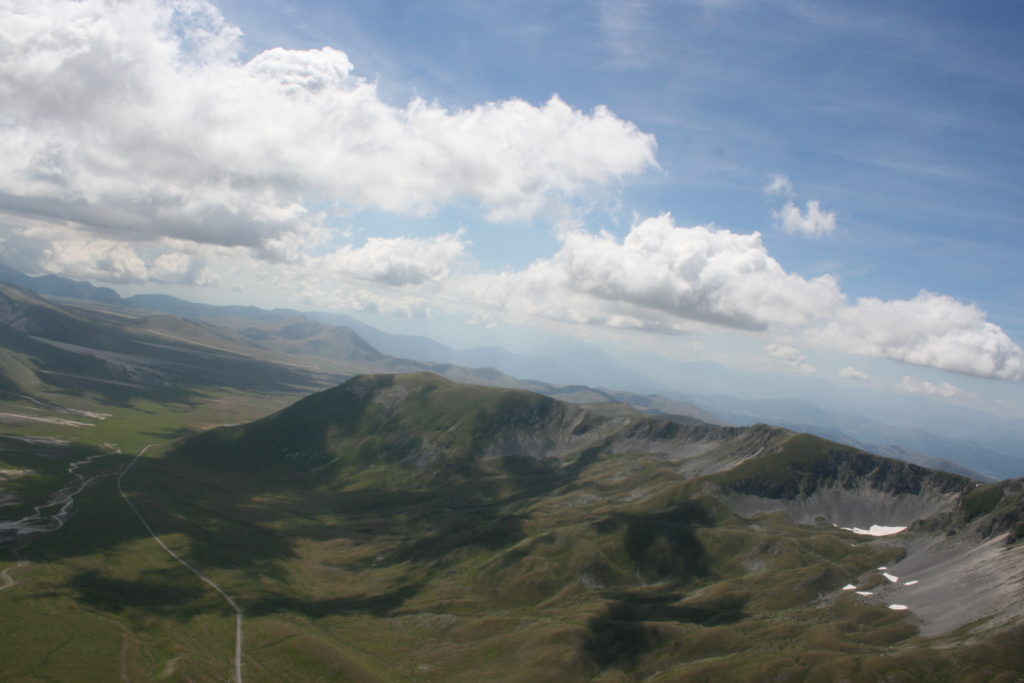 Proviamo a pensare, in sintesi, partendo dagli Illuministi del Grand Tour che scendono per la Via degli Abruzzi e da Roma per la Tiburtina Valeria ( rampolli delle famiglie bene, prelati, colti esploratori, nobili decadenti ) – viaggiatori stranieri in cerca di sensazioni per i loro taccuini, nell’ Ottocento poi – il quadro cambia- l’esplorazione a fini scientifici e il Novecento letterario della narrazione: L’Aquila e il massiccio del Gran Sasso d’Italia sono stati sempre un binomio perfetto, in stretto rapporto, una combinazione non solo geografica che muta, sì, ha vestito i destini sì, ma ha indossato il rito del paesaggio urbano prima e poi montano delle vette, interfacciati, esaltando la muta bellezza, quasi fosse una fase di “passaggio”, sappiamo, secolare, viaggiare dalla città, per terminare davanti al suo Totem profetico avvolto dalle nuvole, inviolabile, il Gran Sasso aspro e erto, che non smette mai di svelare i nostri limiti, e se hai le capacità, puoi anche ascoltarlo. E noi, lo sappiamo, siamo diretti proprio nel ventre della grande montagna, dalla città dell’Aquila in un viaggio altro, diverso, per certi aspetti subliminale lì, dove s’incontrano le nuvole, esclusivo “tour” del massiccio, e della sua solitudine geologica, per poterlo osservare sotto un profilo inconsueto, e scriverne. Dall’aeroporto di Preturo ci alziamo con l’elicottero in codice in VDS i – Ciarli 103. “Yo – yo” , serie 1, pilota Davide Zecca titolare dell’azienda (istruttore, collaudatore e costruttore di elicotteri), figlio di Giorgio Zecca uno dei fautori della pista di volo quando fu ideata (il management dell’aeroporto dovrebbe ricordarlo con una intitolazione nella struttura). Dal Parco Nazionale Gran Sasso e Monti della Laga le autorizzazioni al volo, i protocolli da rispettare, le aree interdette. Il volo. L’Aquila lentamente si avvicina con il suo skyline, da nord -ovest, “luccicante”, città nova, e poi si apre e dispiega il suo involucro urbanistico impattante, dentro un periplo l’elicottero sorvola, trasla e vira in un grande cerchio, compie una rotazione e sotto la città ( Davide ha tolto il finestrino per osservare meglio e farmi fotografare ) nel suo primo disegno costitutivo dello sforzo edificatorio sulle rocce ancora visibile, permanente, primitivo e fondativo della città nova Aquila, ma lentamente nel tempo fagocitato dai palazzinari, dalle politiche portatrici del disprezzo del Bene comune, dai profitti ad ogni costo, dagli insensati sventramenti e distruzioni di storici edifici o di traccia di questi, per erigere lì quanto di più insulso e devastante, e soprattutto contro il principio di bellezza della città storica, bene materiale e capitale culturale. Il volo prosegue. Ottime condizioni metereologiche nonostante l’elevata temperatura, lentamente ci alziamo a diecimila piedi (tremila metri) frontale ma a distanza Corno Grande. Eccezionale attività in dinamica, ascendenza che sfrutta le pendici delle montagne in avvicinamento al nostro obiettivo, i costoni certo, il vento e le correnti ascensionali che intercettiamo. La cima di Corno Grande, l’aria rarefatta, stabili i parametri di volo, non è facile portare lì l’elicottero in una velocità costante nei limiti di sicurezza, nella misura del vento a quelle quote. “Come gli uccelli” mi dice Davide, per un elicottero piccolo le difficoltà aumentano, hanno protocolli molto stretti e l’abilità del pilota è starne dentro con lucidità, freddezza e temperanza. Corno Grande, direzione 360°, una serie, larga, di manovre per stare dentro le correnti e moderare il volo. Corno Grande: dove s’incontrano le nuvole… Eccole!