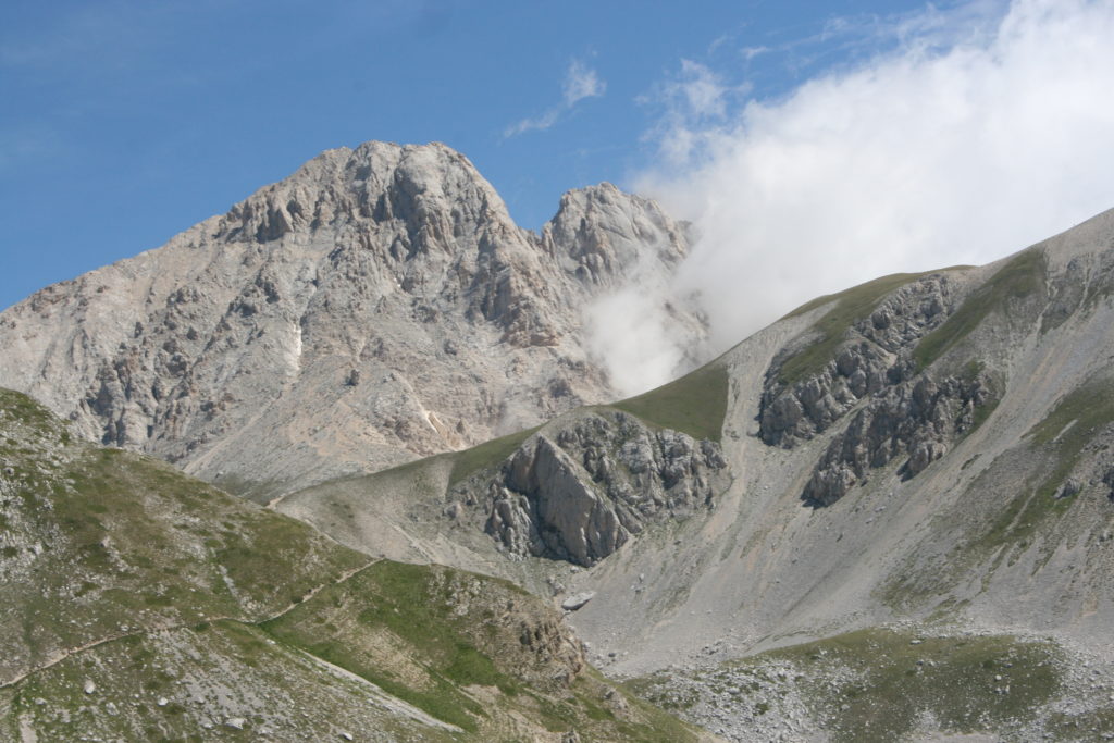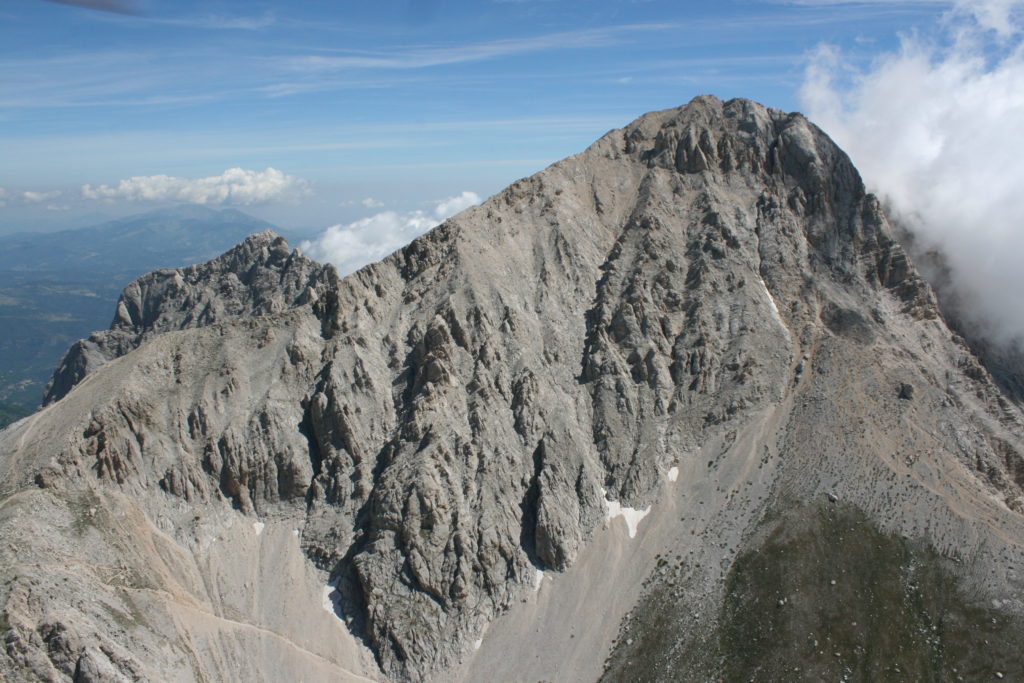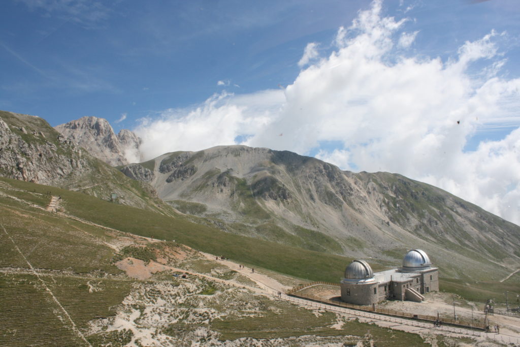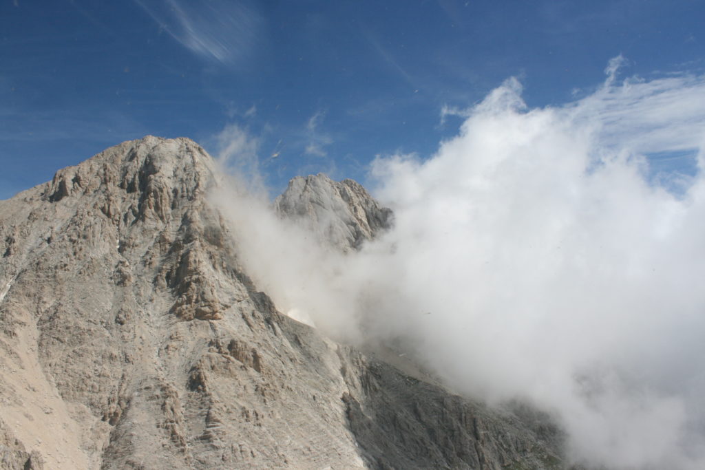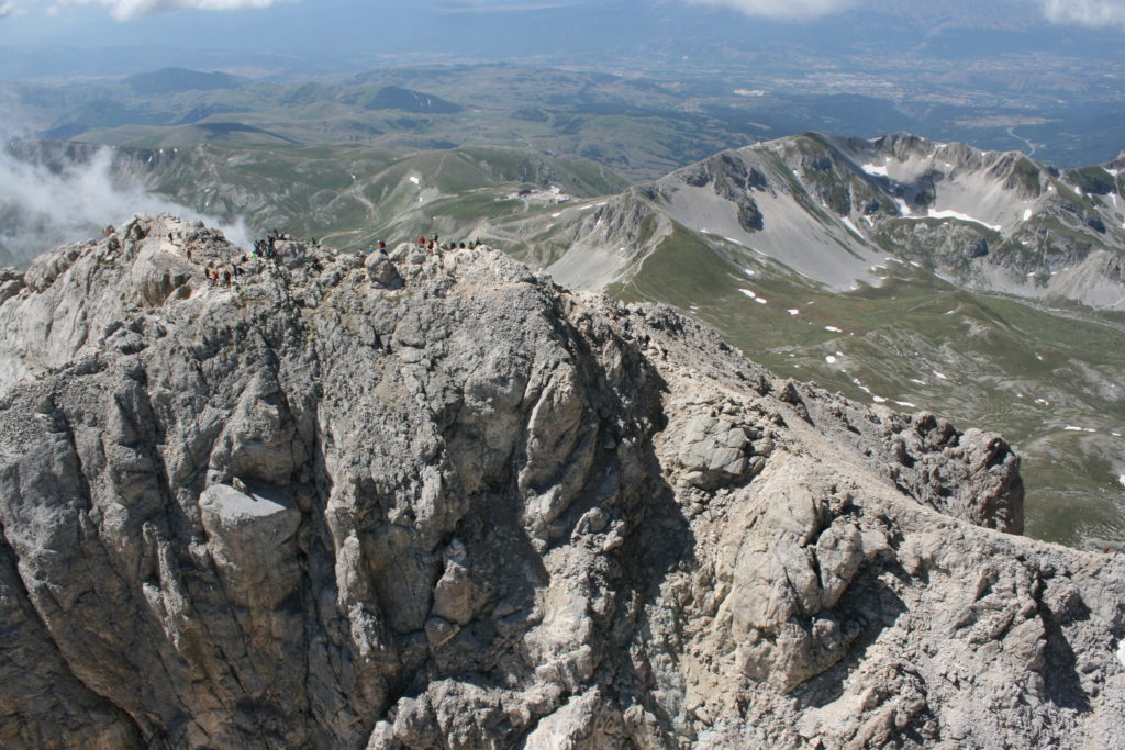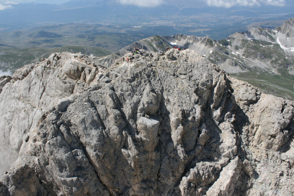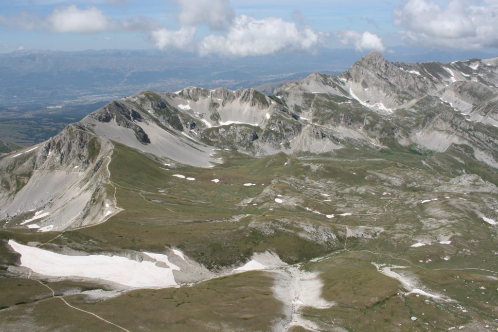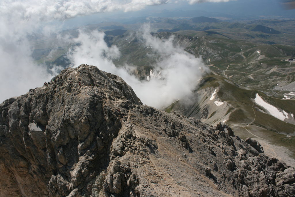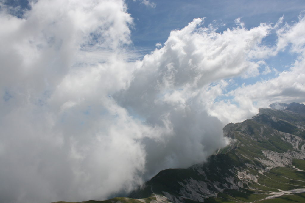 Proviamo a pensare, in sintesi, partendo dagli Illuministi del Grand Tour che scendono per la Via degli Abruzzi e da Roma per la Tiburtina Valeria ( rampolli delle famiglie bene, prelati, colti esploratori, nobili decadenti ) – viaggiatori stranieri in cerca di sensazioni per i loro taccuini, nell’ Ottocento poi – il quadro cambia- l’esplorazione a fini scientifici e il Novecento letterario della narrazione: L’Aquila e il massiccio del Gran Sasso d’Italia sono stati sempre un binomio perfetto, in stretto rapporto, una combinazione non solo geografica che muta, sì, ha vestito i destini sì, ma ha indossato il rito del paesaggio urbano prima e poi montano delle vette, interfacciati, esaltando la muta bellezza, quasi fosse una fase di “passaggio”, sappiamo, secolare, viaggiare dalla città, per terminare davanti al suo Totem profetico avvolto dalle nuvole, inviolabile, il Gran Sasso aspro e erto, che non smette mai di svelare i nostri limiti, e se hai le capacità, puoi anche ascoltarlo. E noi, lo sappiamo, siamo diretti proprio nel ventre della grande montagna, dalla città dell’Aquila in un viaggio altro, diverso, per certi aspetti subliminale lì, dove s’incontrano le nuvole, esclusivo “tour” del massiccio, e della sua solitudine geologica, per poterlo osservare sotto un profilo inconsueto, e scriverne. Dall’aeroporto di Preturo ci alziamo con l’elicottero in codice in VDS i – Ciarli 103. “Yo – yo” , serie 1, pilota Davide Zecca titolare dell’azienda (istruttore, collaudatore e costruttore di elicotteri), figlio di Giorgio Zecca uno dei fautori della pista di volo quando fu ideata (il management dell’aeroporto dovrebbe ricordarlo con una intitolazione nella struttura). Dal Parco Nazionale Gran Sasso e Monti della Laga le autorizzazioni al volo, i protocolli da rispettare, le aree interdette. Il volo. L’Aquila lentamente si avvicina con il suo skyline, da nord -ovest, “luccicante”, città nova, e poi si apre e dispiega il suo involucro urbanistico impattante, dentro un periplo l’elicottero sorvola, trasla e vira in un grande cerchio, compie una rotazione e sotto la città ( Davide ha tolto il finestrino per osservare meglio e farmi fotografare ) nel suo primo disegno costitutivo dello sforzo edificatorio sulle rocce ancora visibile, permanente, primitivo e fondativo della città nova Aquila, ma lentamente nel tempo fagocitato dai palazzinari, dalle politiche portatrici del disprezzo del Bene comune, dai profitti ad ogni costo, dagli insensati sventramenti e distruzioni di storici edifici o di traccia di questi, per erigere lì quanto di più insulso e devastante, e soprattutto contro il principio di bellezza della città storica, bene materiale e capitale culturale. Il volo prosegue. Ottime condizioni metereologiche nonostante l’elevata temperatura, lentamente ci alziamo a diecimila piedi (tremila metri) frontale ma a distanza Corno Grande. Eccezionale attività in dinamica, ascendenza che sfrutta le pendici delle montagne in avvicinamento al nostro obiettivo, i costoni certo, il vento e le correnti ascensionali che intercettiamo. La cima di Corno Grande, l’aria rarefatta, stabili i parametri di volo, non è facile portare lì l’elicottero in una velocità costante nei limiti di sicurezza, nella misura del vento a quelle quote. “Come gli uccelli” mi dice Davide, per un elicottero piccolo le difficoltà aumentano, hanno protocolli molto stretti e l’abilità del pilota è starne dentro con lucidità, freddezza e temperanza. Corno Grande, direzione 360°, una serie, larga, di manovre per stare dentro le correnti e moderare il volo. Corno Grande: dove s’incontrano le nuvole… Eccole!