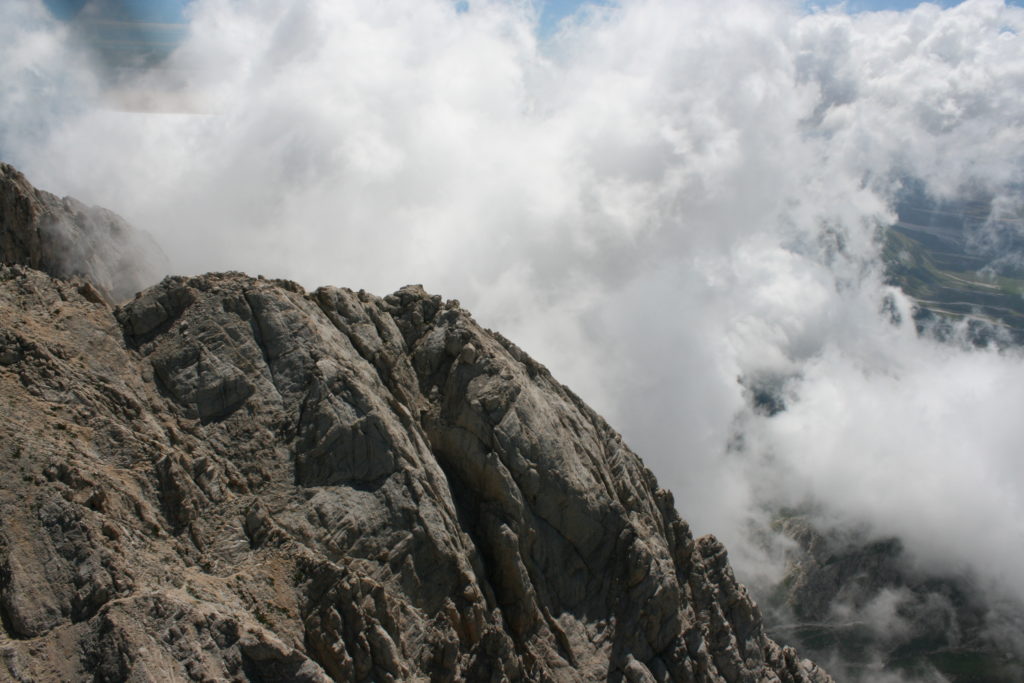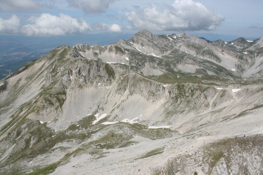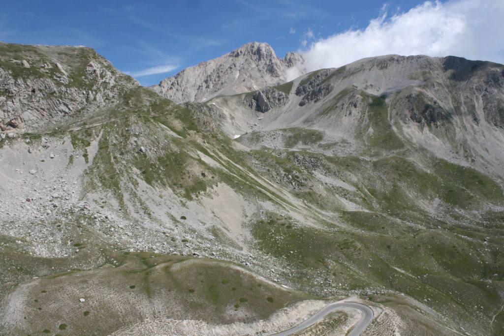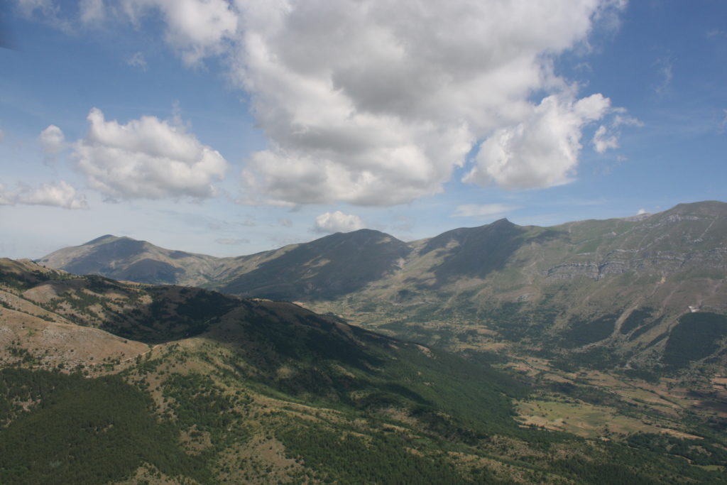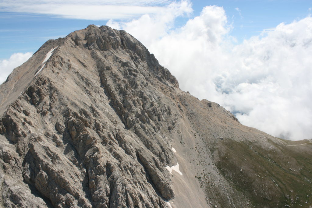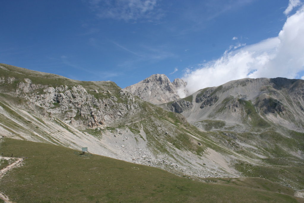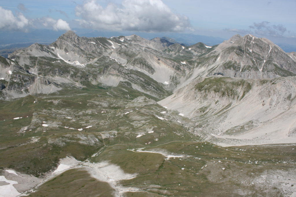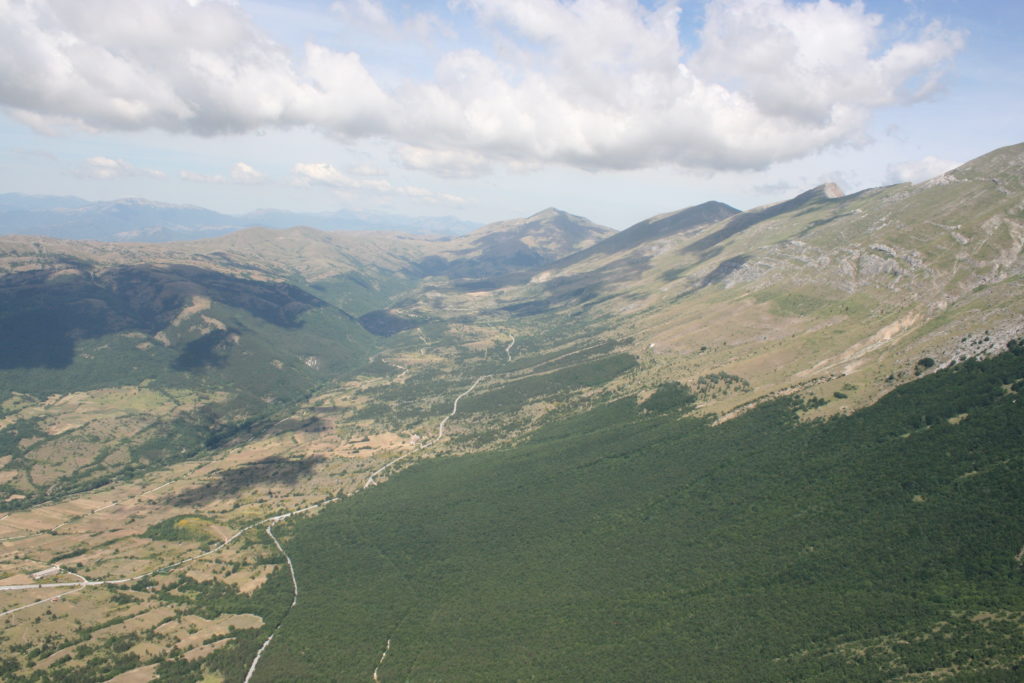 Proviamo a pensare, in sintesi, partendo dagli Illuministi del Grand Tour che scendono per la Via degli Abruzzi e da Roma per la Tiburtina Valeria ( rampolli delle famiglie bene, prelati, colti esploratori, nobili decadenti ) – viaggiatori stranieri in cerca di sensazioni per i loro taccuini, nell’ Ottocento poi – il quadro cambia- l’esplorazione a fini scientifici e il Novecento letterario della narrazione: L’Aquila e il massiccio del Gran Sasso d’Italia sono stati sempre un binomio perfetto, in stretto rapporto, una combinazione non solo geografica che muta, sì, ha vestito i destini sì, ma ha indossato il rito del paesaggio urbano prima e poi montano delle vette, interfacciati, esaltando la muta bellezza, quasi fosse una fase di “passaggio”, sappiamo, secolare, viaggiare dalla città, per terminare davanti al suo Totem profetico avvolto dalle nuvole, inviolabile, il Gran Sasso aspro e erto, che non smette mai di svelare i nostri limiti, e se hai le capacità, puoi anche ascoltarlo. E noi, lo sappiamo, siamo diretti proprio nel ventre della grande montagna, dalla città dell’Aquila in un viaggio altro, diverso, per certi aspetti subliminale lì, dove s’incontrano le nuvole, esclusivo “tour” del massiccio, e della sua solitudine geologica, per poterlo osservare sotto un profilo inconsueto, e scriverne. Dall’aeroporto di Preturo ci alziamo con l’elicottero in codice in VDS i – Ciarli 103. “Yo – yo” , serie 1, pilota Davide Zecca titolare dell’azienda (istruttore, collaudatore e costruttore di elicotteri), figlio di Giorgio Zecca uno dei fautori della pista di volo quando fu ideata (il management dell’aeroporto dovrebbe ricordarlo con una intitolazione nella struttura). Dal Parco Nazionale Gran Sasso e Monti della Laga le autorizzazioni al volo, i protocolli da rispettare, le aree interdette. Il volo. L’Aquila lentamente si avvicina con il suo skyline, da nord -ovest, “luccicante”, città nova, e poi si apre e dispiega il suo involucro urbanistico impattante, dentro un periplo l’elicottero sorvola, trasla e vira in un grande cerchio, compie una rotazione e sotto la città ( Davide ha tolto il finestrino per osservare meglio e farmi fotografare ) nel suo primo disegno costitutivo dello sforzo edificatorio sulle rocce ancora visibile, permanente, primitivo e fondativo della città nova Aquila, ma lentamente nel tempo fagocitato dai palazzinari, dalle politiche portatrici del disprezzo del Bene comune, dai profitti ad ogni costo, dagli insensati sventramenti e distruzioni di storici edifici o di traccia di questi, per erigere lì quanto di più insulso e devastante, e soprattutto contro il principio di bellezza della città storica, bene materiale e capitale culturale. Il volo prosegue. Ottime condizioni metereologiche nonostante l’elevata temperatura, lentamente ci alziamo a diecimila piedi (tremila metri) frontale ma a distanza Corno Grande. Eccezionale attività in dinamica, ascendenza che sfrutta le pendici delle montagne in avvicinamento al nostro obiettivo, i costoni certo, il vento e le correnti ascensionali che intercettiamo. La cima di Corno Grande, l’aria rarefatta, stabili i parametri di volo, non è facile portare lì l’elicottero in una velocità costante nei limiti di sicurezza, nella misura del vento a quelle quote. “Come gli uccelli” mi dice Davide, per un elicottero piccolo le difficoltà aumentano, hanno protocolli molto stretti e l’abilità del pilota è starne dentro con lucidità, freddezza e temperanza. Corno Grande, direzione 360°, una serie, larga, di manovre per stare dentro le correnti e moderare il volo. Corno Grande: dove s’incontrano le nuvole… Eccole!
