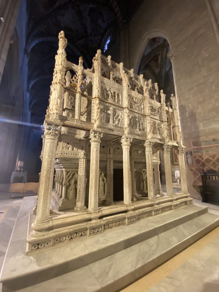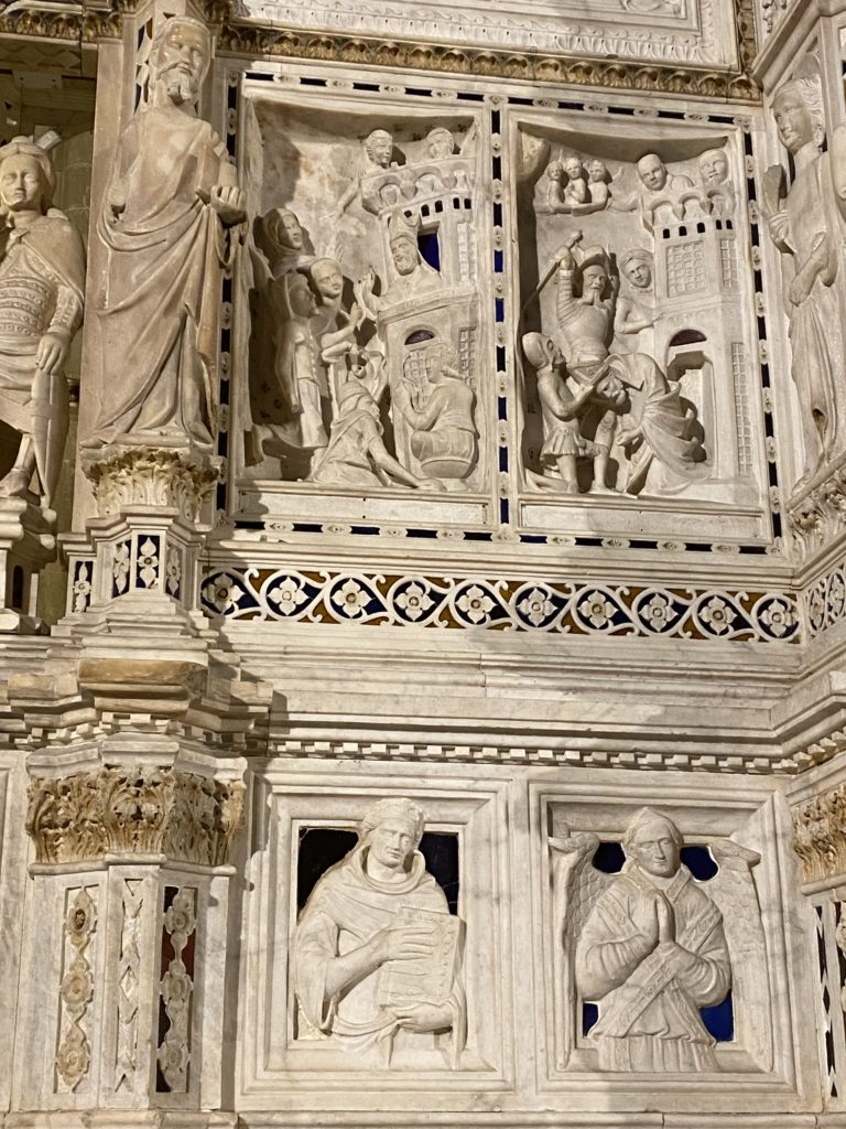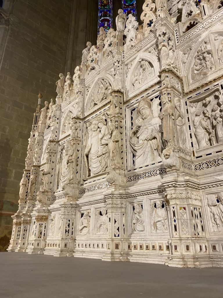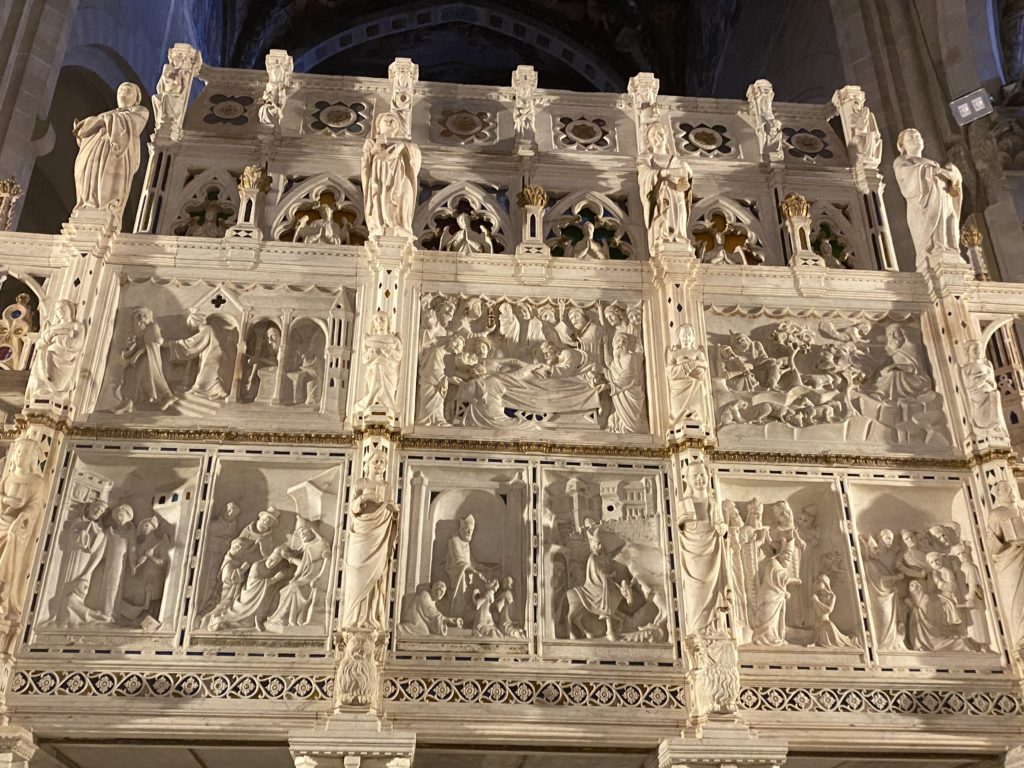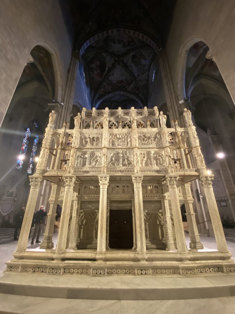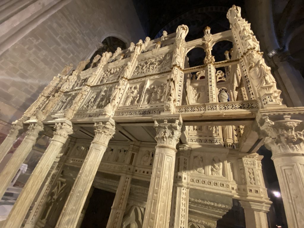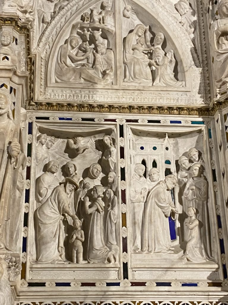 L’ Arca di San Donato, opera marmorea del 1362, realizzata in due fasi, in due momenti complementari. Per onorare il vescovo Donato, martire e patrono di Arezzo, l’urna è sorretta da 12 pilastri con guglie sommitali e pinnacoli gotici. Il marmo è materia viva, comunica, con il suo moto ascendente la forma e il prestigio della scultura gotica è affermato, verticale e austero. Colonne e losanghe lobate iscritte dentro archi cuspidali sorreggono l’altare. La Madonna con il braccio il Bambino è centrale nella struttura progettata su più livelli appunto dell’Arca. Nei riquadri le scene in altorilievo, d’ispirazione prima romana e poi romanica, rappresentano la vita leggendaria di San Donato: i miracoli, la quotidianità e gli incontri, le intercessioni per sconfiggere il male e poi il suo supplizio. Nelle nicchie cuspidali gli episodi del Vangelo, gli Arcangeli in un registro e gli apostoli scolpiti e allungati secondo il principio gotico, a difesa di tutto il blocco narrativo e compositivo di un nuovo linguaggio che vede l’altare protagonista. Alla realizzazione parteciparono diversi artisti senesi, fiorentini e aretini. Agostino di Giovanni e Agnolo di Ventura (prima metà del Trecento) nella fascia bassa. In quella superiore, un tempo dipinta a tempera sul marmo concorsero Giovanni di Francesco e Betto di Francesco. Marmi levigati quindi, inserti vitrei di un’opera raffinata tra arte e artigianato colto dove riecheggia la Bibbia e Mosè.