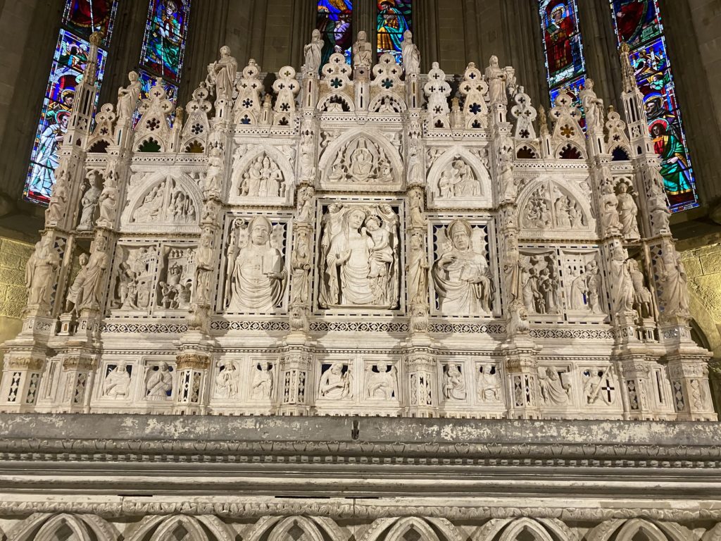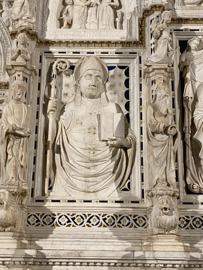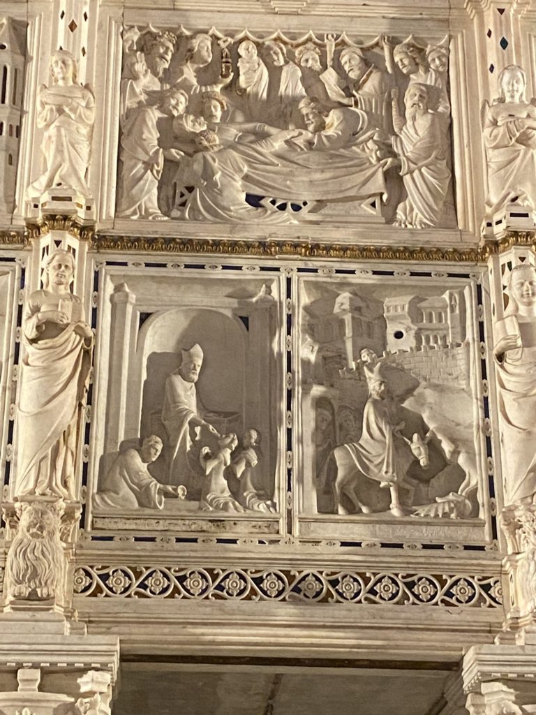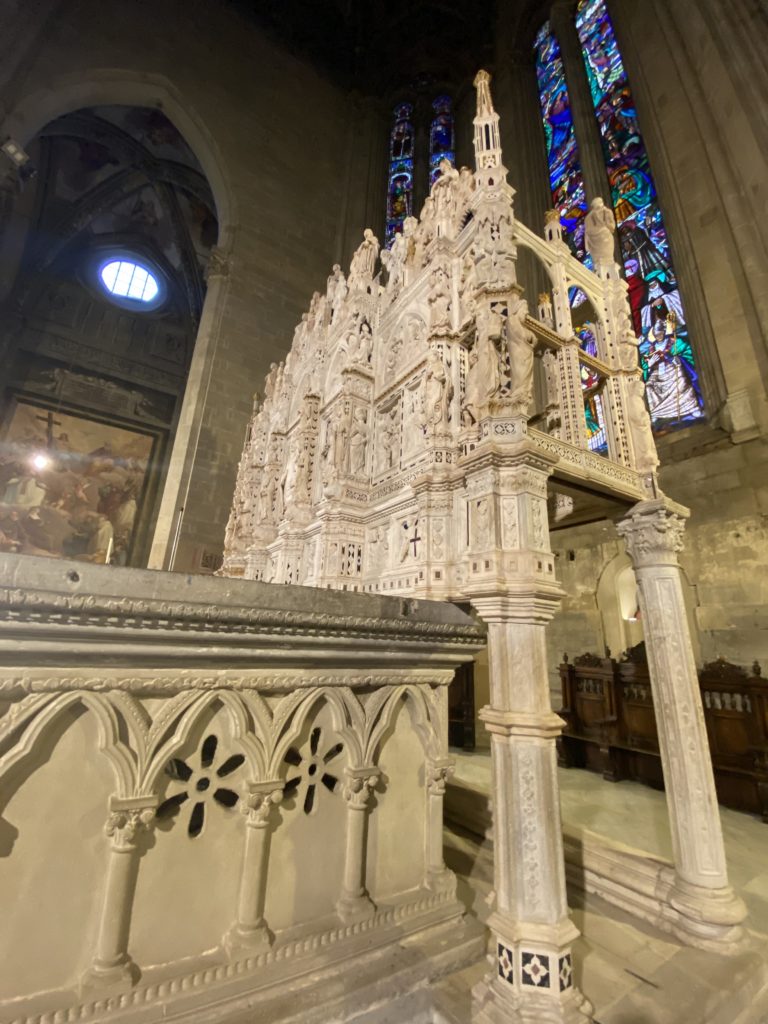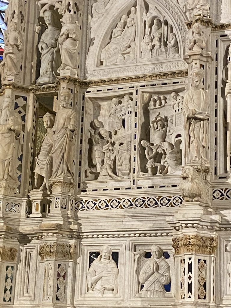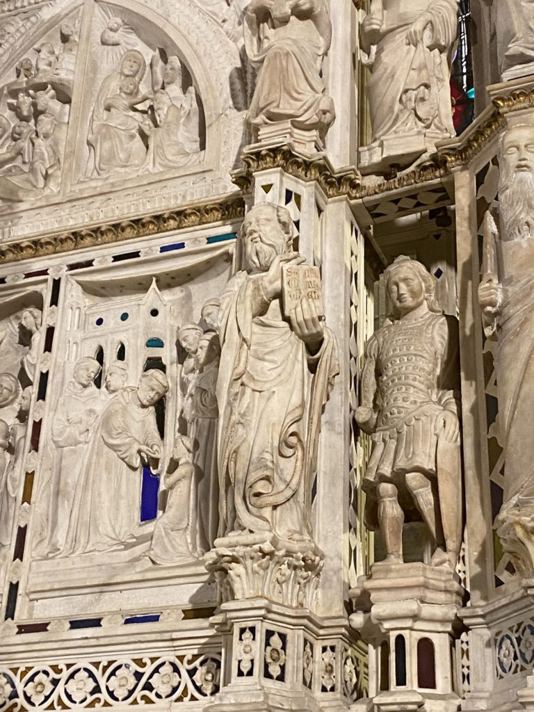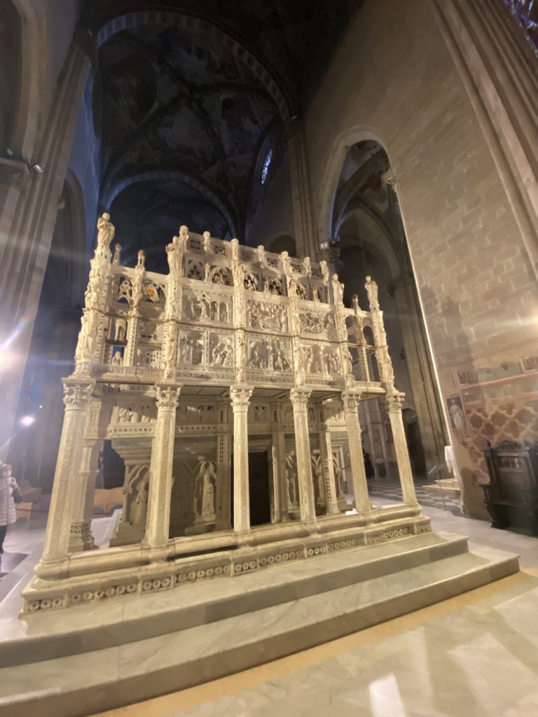 L’ Arca di San Donato, opera marmorea del 1362, realizzata in due fasi, in due momenti complementari. Per onorare il vescovo Donato, martire e patrono di Arezzo, l’urna è sorretta da 12 pilastri con guglie sommitali e pinnacoli gotici. Il marmo è materia viva, comunica, con il suo moto ascendente la forma e il prestigio della scultura gotica è affermato, verticale e austero. Colonne e losanghe lobate iscritte dentro archi cuspidali sorreggono l’altare. La Madonna con il braccio il Bambino è centrale nella struttura progettata su più livelli appunto dell’Arca. Nei riquadri le scene in altorilievo, d’ispirazione prima romana e poi romanica, rappresentano la vita leggendaria di San Donato: i miracoli, la quotidianità e gli incontri, le intercessioni per sconfiggere il male e poi il suo supplizio. Nelle nicchie cuspidali gli episodi del Vangelo, gli Arcangeli in un registro e gli apostoli scolpiti e allungati secondo il principio gotico, a difesa di tutto il blocco narrativo e compositivo di un nuovo linguaggio che vede l’altare protagonista. Alla realizzazione parteciparono diversi artisti senesi, fiorentini e aretini. Agostino di Giovanni e Agnolo di Ventura (prima metà del Trecento) nella fascia bassa. In quella superiore, un tempo dipinta a tempera sul marmo concorsero Giovanni di Francesco e Betto di Francesco. Marmi levigati quindi, inserti vitrei di un’opera raffinata tra arte e artigianato colto dove riecheggia la Bibbia e Mosè.