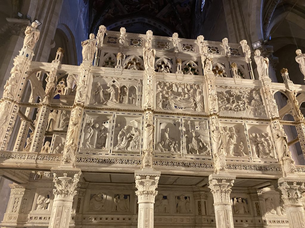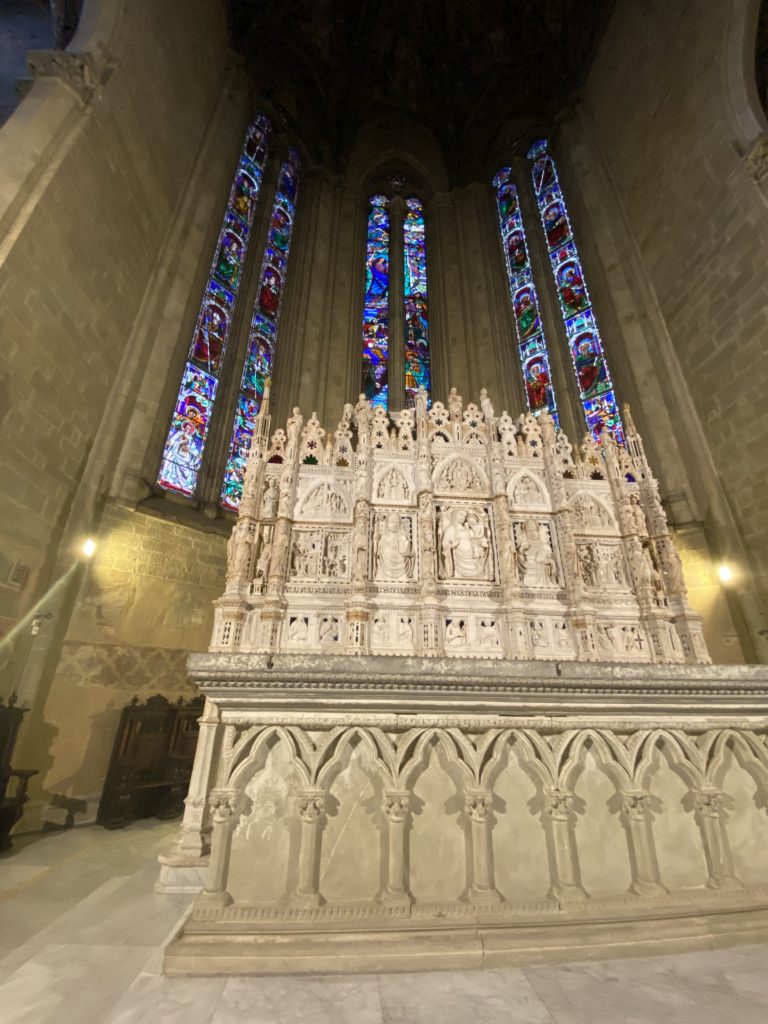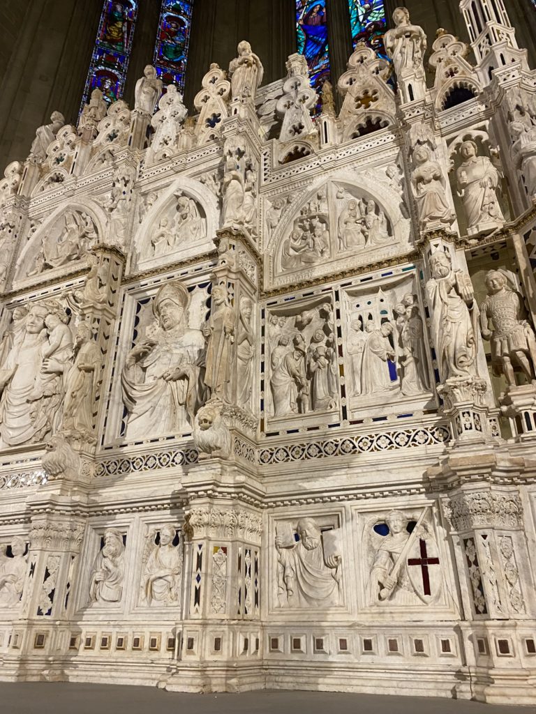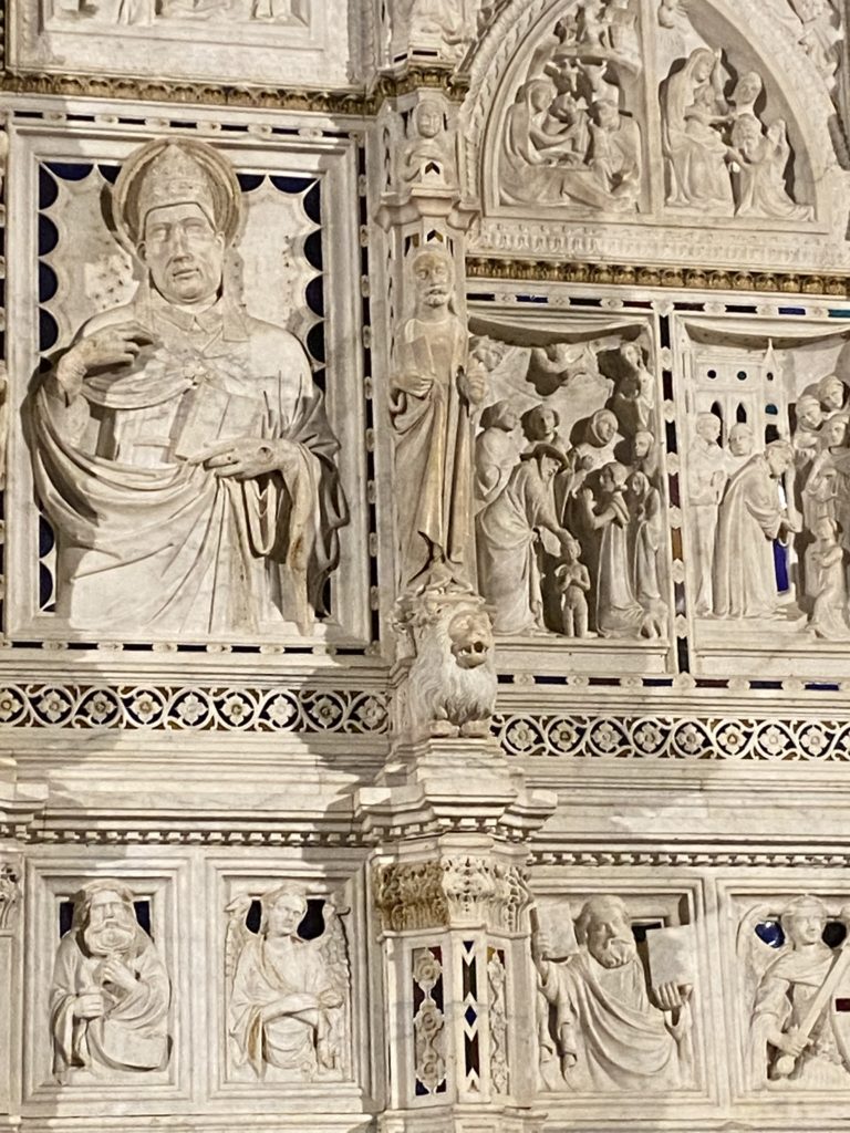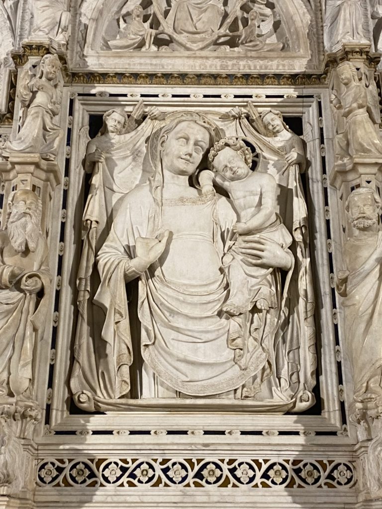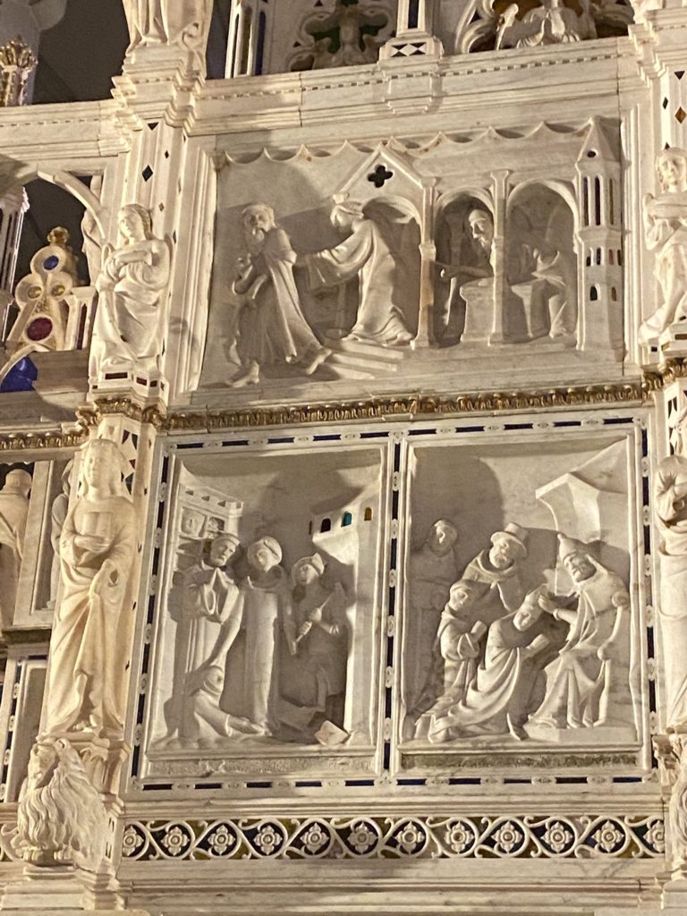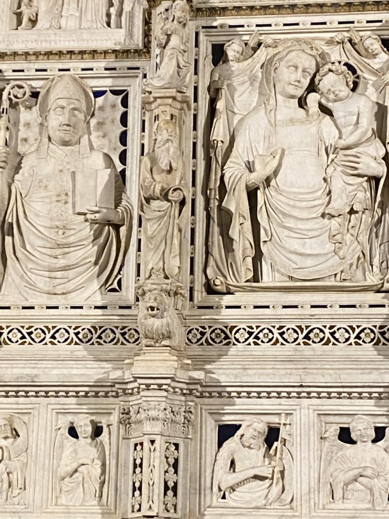 L’ Arca di San Donato, opera marmorea del 1362, realizzata in due fasi, in due momenti complementari. Per onorare il vescovo Donato, martire e patrono di Arezzo, l’urna è sorretta da 12 pilastri con guglie sommitali e pinnacoli gotici. Il marmo è materia viva, comunica, con il suo moto ascendente la forma e il prestigio della scultura gotica è affermato, verticale e austero. Colonne e losanghe lobate iscritte dentro archi cuspidali sorreggono l’altare. La Madonna con il braccio il Bambino è centrale nella struttura progettata su più livelli appunto dell’Arca. Nei riquadri le scene in altorilievo, d’ispirazione prima romana e poi romanica, rappresentano la vita leggendaria di San Donato: i miracoli, la quotidianità e gli incontri, le intercessioni per sconfiggere il male e poi il suo supplizio. Nelle nicchie cuspidali gli episodi del Vangelo, gli Arcangeli in un registro e gli apostoli scolpiti e allungati secondo il principio gotico, a difesa di tutto il blocco narrativo e compositivo di un nuovo linguaggio che vede l’altare protagonista. Alla realizzazione parteciparono diversi artisti senesi, fiorentini e aretini. Agostino di Giovanni e Agnolo di Ventura (prima metà del Trecento) nella fascia bassa. In quella superiore, un tempo dipinta a tempera sul marmo concorsero Giovanni di Francesco e Betto di Francesco. Marmi levigati quindi, inserti vitrei di un’opera raffinata tra arte e artigianato colto dove riecheggia la Bibbia e Mosè.