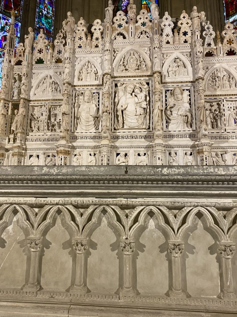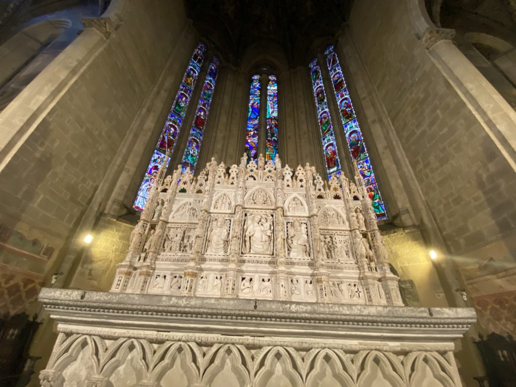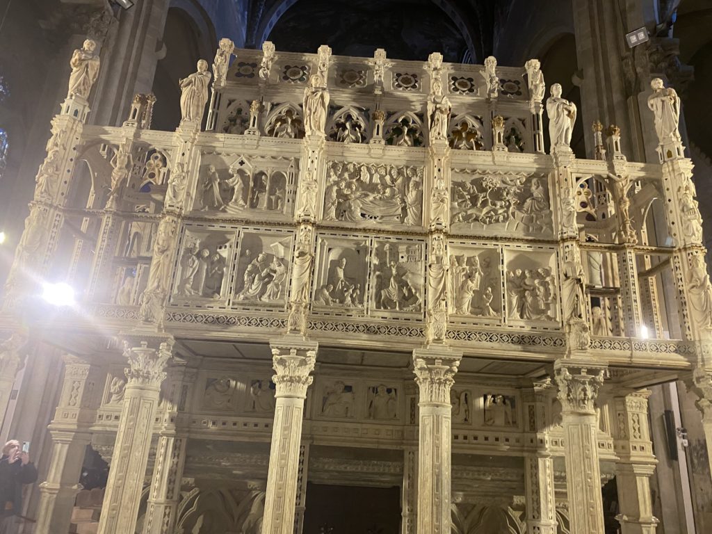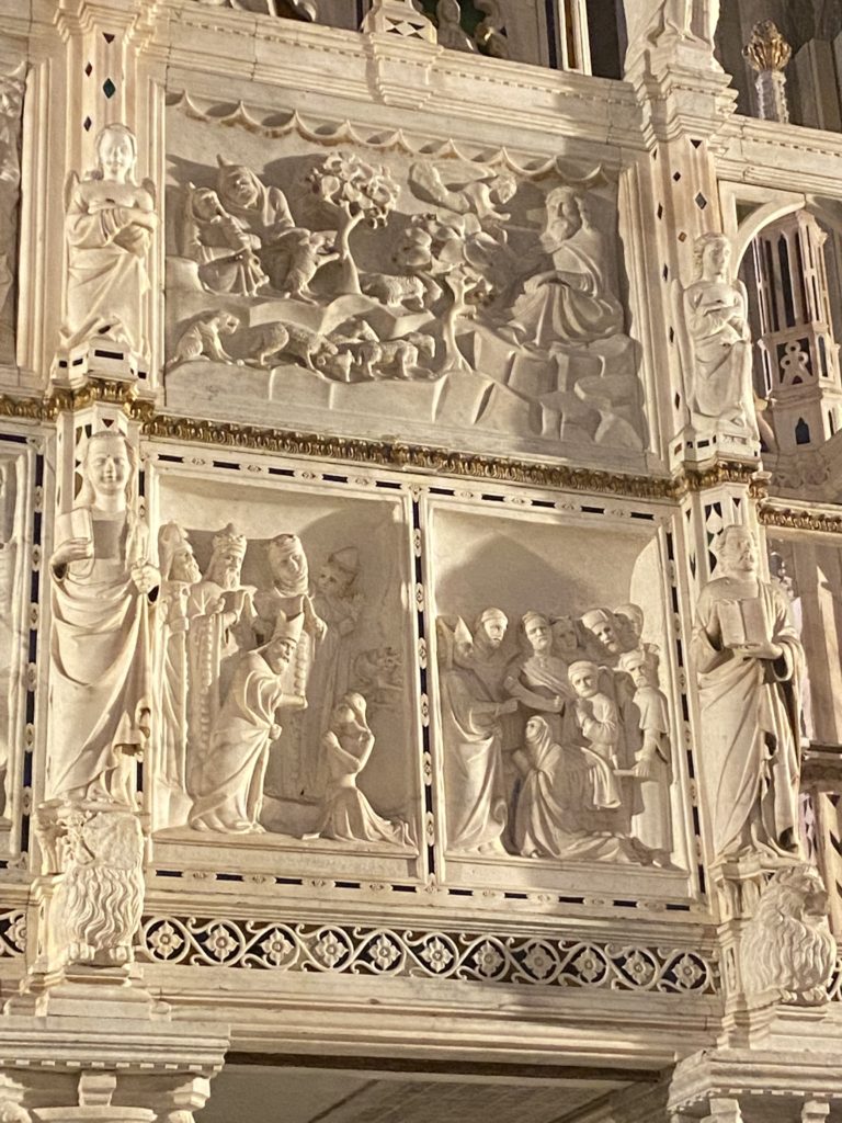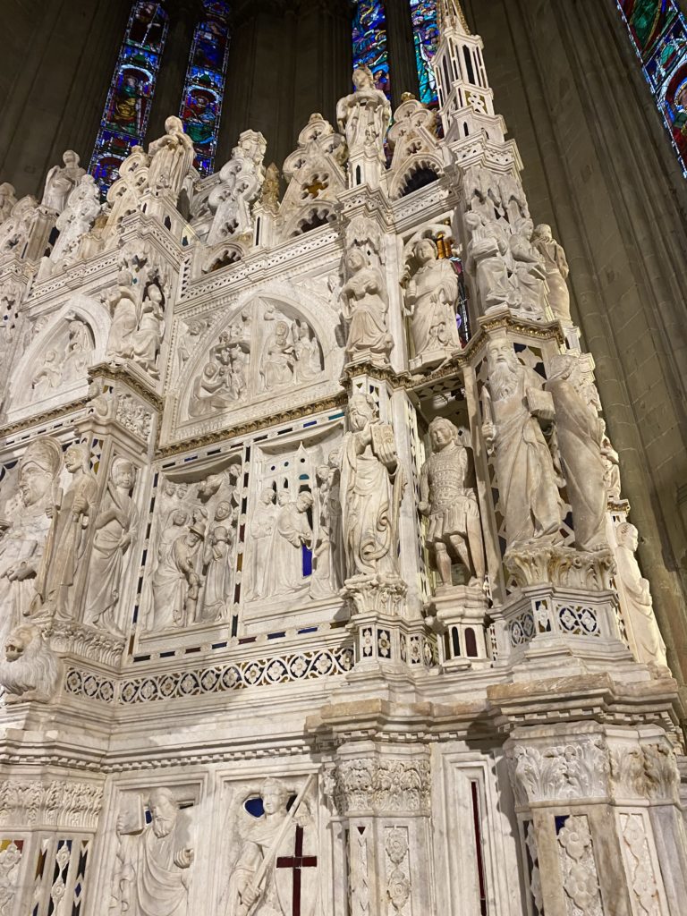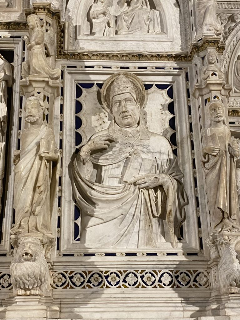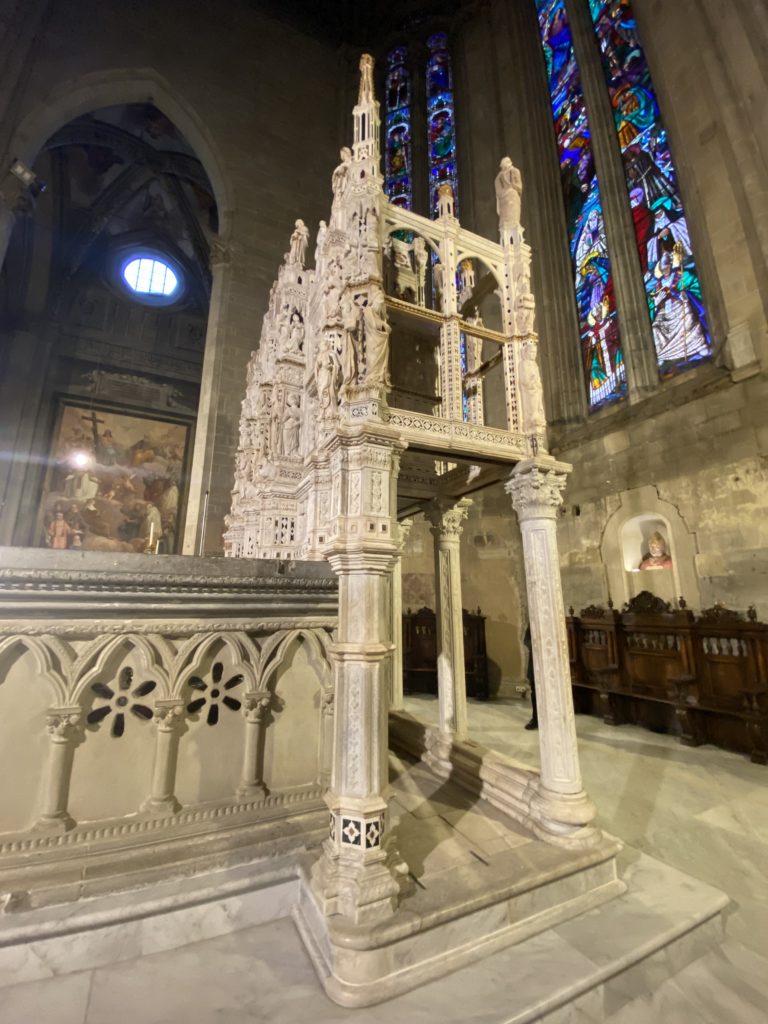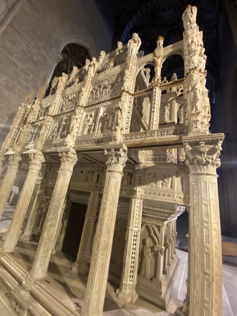 L’ Arca di San Donato, opera marmorea del 1362, realizzata in due fasi, in due momenti complementari. Per onorare il vescovo Donato, martire e patrono di Arezzo, l’urna è sorretta da 12 pilastri con guglie sommitali e pinnacoli gotici. Il marmo è materia viva, comunica, con il suo moto ascendente la forma e il prestigio della scultura gotica è affermato, verticale e austero. Colonne e losanghe lobate iscritte dentro archi cuspidali sorreggono l’altare. La Madonna con il braccio il Bambino è centrale nella struttura progettata su più livelli appunto dell’Arca. Nei riquadri le scene in altorilievo, d’ispirazione prima romana e poi romanica, rappresentano la vita leggendaria di San Donato: i miracoli, la quotidianità e gli incontri, le intercessioni per sconfiggere il male e poi il suo supplizio. Nelle nicchie cuspidali gli episodi del Vangelo, gli Arcangeli in un registro e gli apostoli scolpiti e allungati secondo il principio gotico, a difesa di tutto il blocco narrativo e compositivo di un nuovo linguaggio che vede l’altare protagonista. Alla realizzazione parteciparono diversi artisti senesi, fiorentini e aretini. Agostino di Giovanni e Agnolo di Ventura (prima metà del Trecento) nella fascia bassa. In quella superiore, un tempo dipinta a tempera sul marmo concorsero Giovanni di Francesco e Betto di Francesco. Marmi levigati quindi, inserti vitrei di un’opera raffinata tra arte e artigianato colto dove riecheggia la Bibbia e Mosè.
