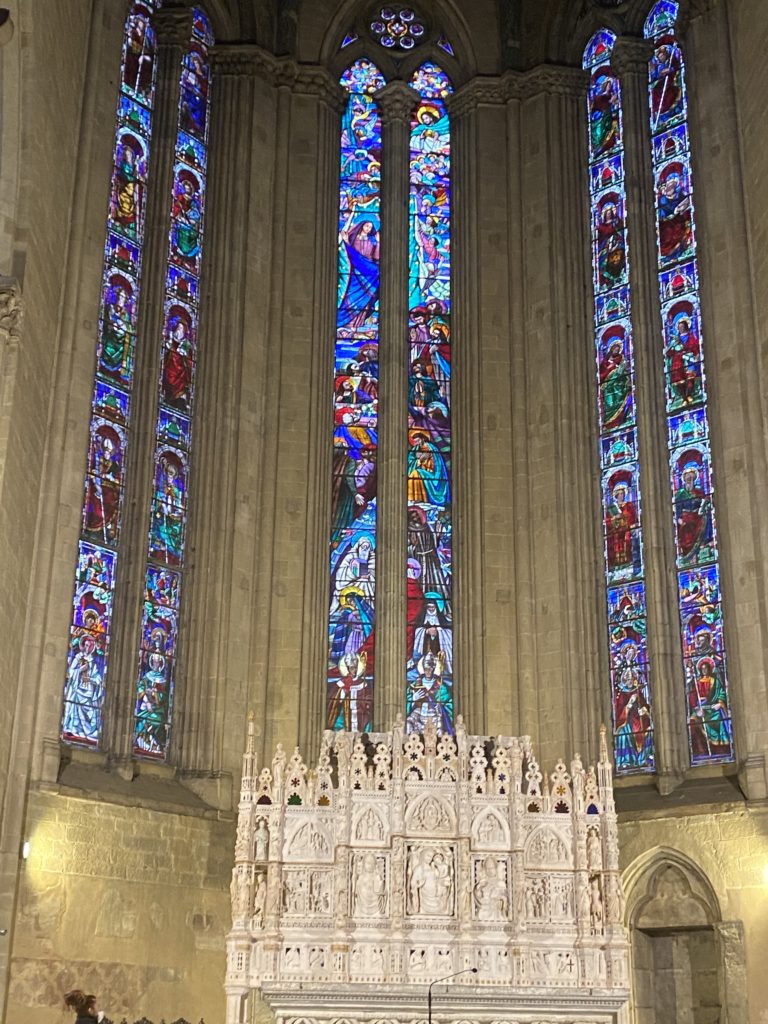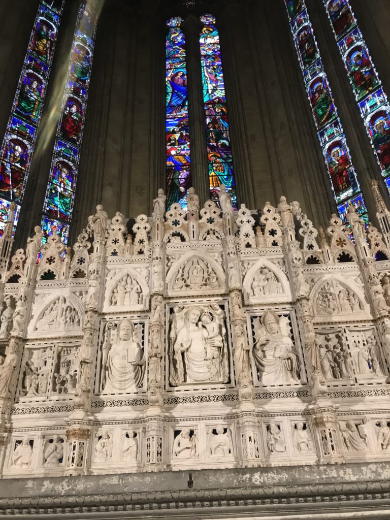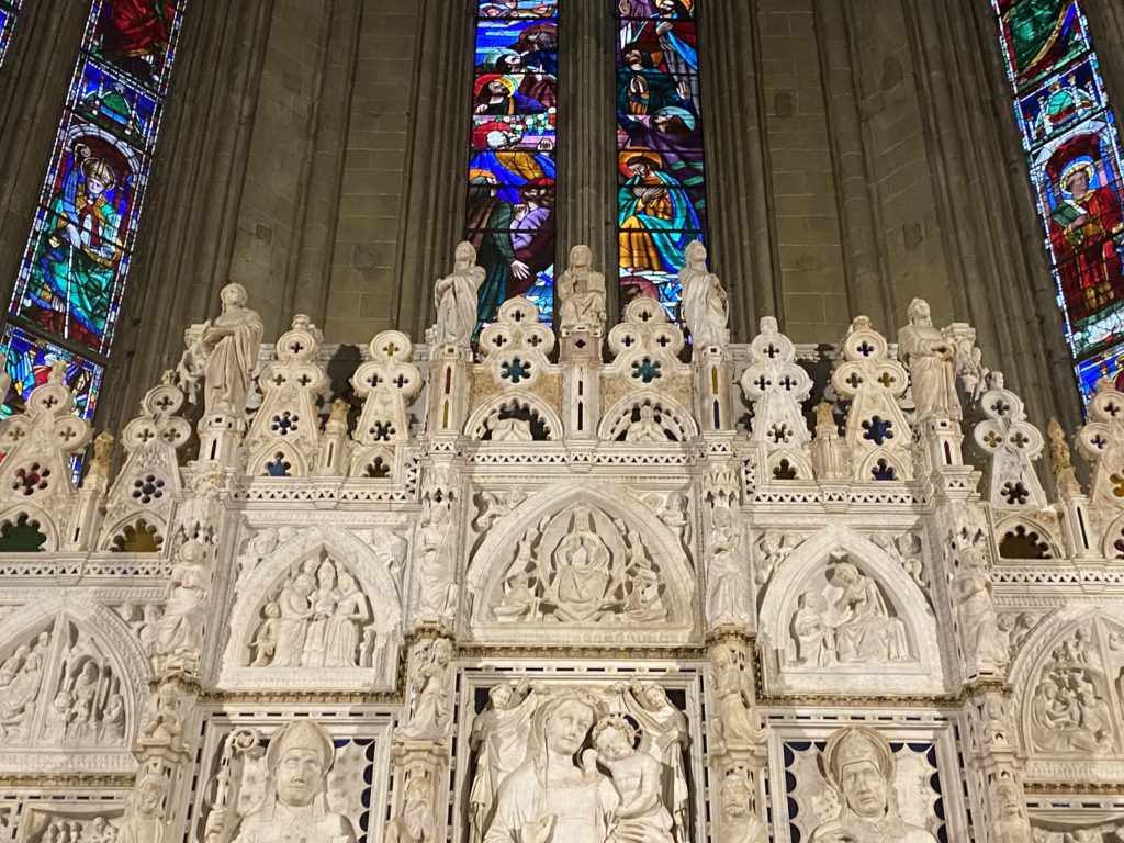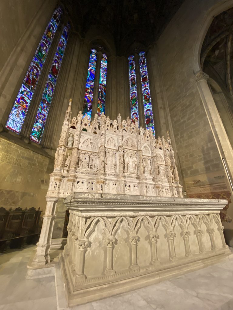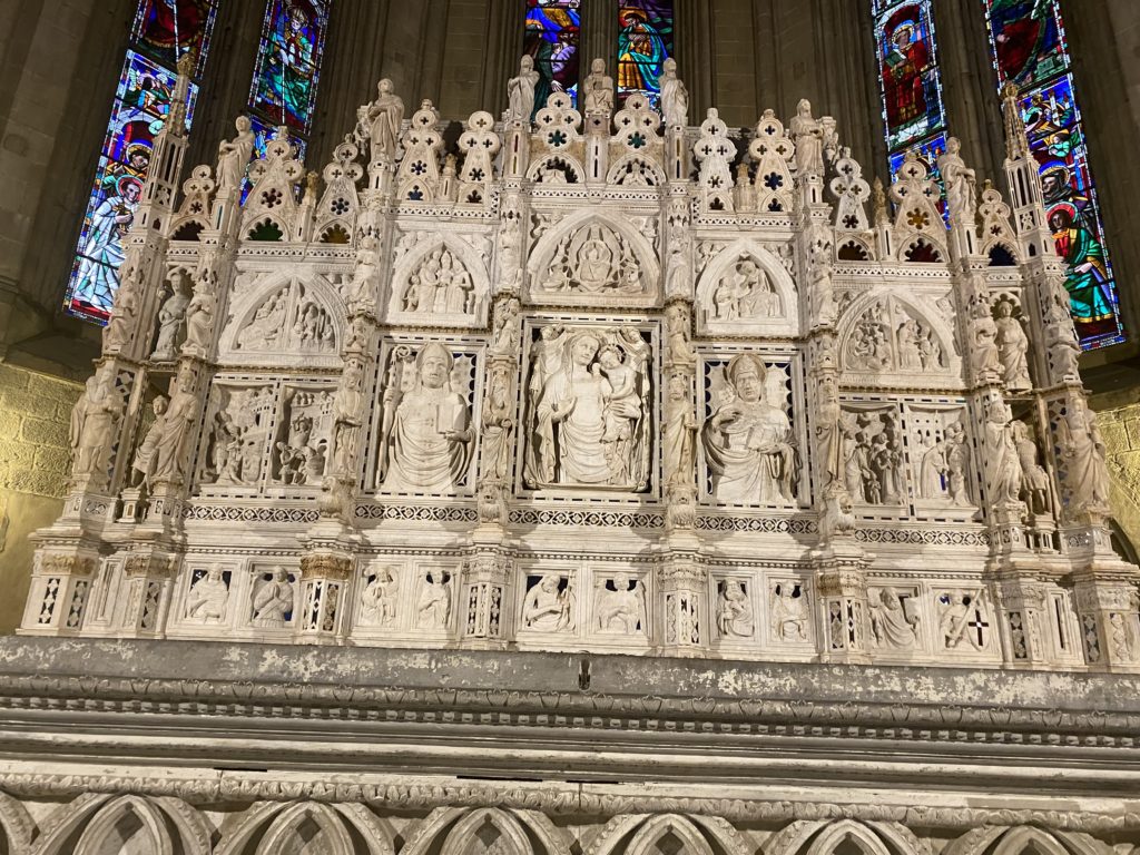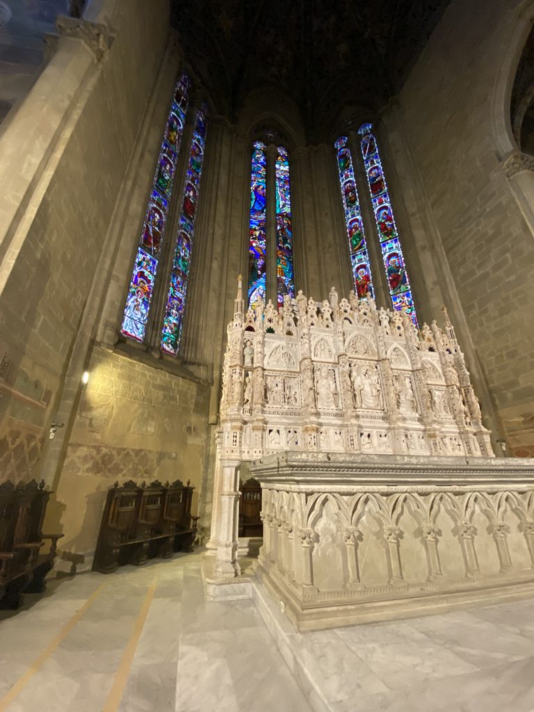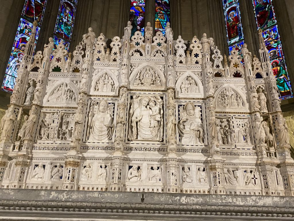 L’ Arca di San Donato, opera marmorea del 1362, realizzata in due fasi, in due momenti complementari. Per onorare il vescovo Donato, martire e patrono di Arezzo, l’urna è sorretta da 12 pilastri con guglie sommitali e pinnacoli gotici. Il marmo è materia viva, comunica, con il suo moto ascendente la forma e il prestigio della scultura gotica è affermato, verticale e austero. Colonne e losanghe lobate iscritte dentro archi cuspidali sorreggono l’altare. La Madonna con il braccio il Bambino è centrale nella struttura progettata su più livelli appunto dell’Arca. Nei riquadri le scene in altorilievo, d’ispirazione prima romana e poi romanica, rappresentano la vita leggendaria di San Donato: i miracoli, la quotidianità e gli incontri, le intercessioni per sconfiggere il male e poi il suo supplizio. Nelle nicchie cuspidali gli episodi del Vangelo, gli Arcangeli in un registro e gli apostoli scolpiti e allungati secondo il principio gotico, a difesa di tutto il blocco narrativo e compositivo di un nuovo linguaggio che vede l’altare protagonista. Alla realizzazione parteciparono diversi artisti senesi, fiorentini e aretini. Agostino di Giovanni e Agnolo di Ventura (prima metà del Trecento) nella fascia bassa. In quella superiore, un tempo dipinta a tempera sul marmo concorsero Giovanni di Francesco e Betto di Francesco. Marmi levigati quindi, inserti vitrei di un’opera raffinata tra arte e artigianato colto dove riecheggia la Bibbia e Mosè.