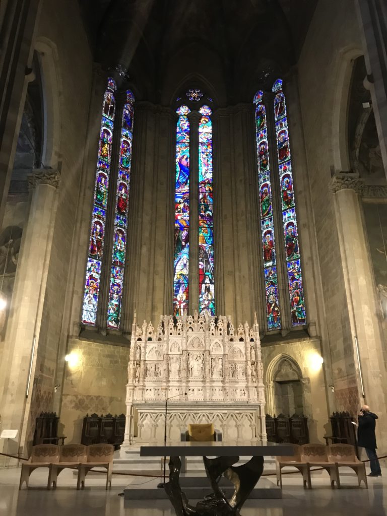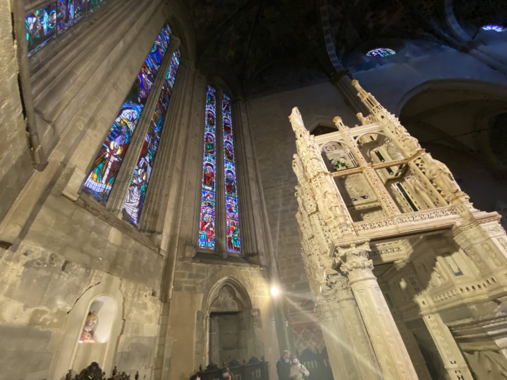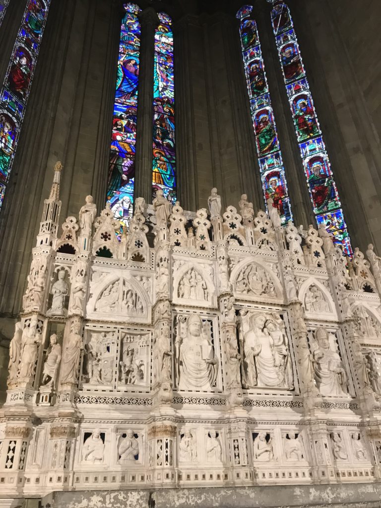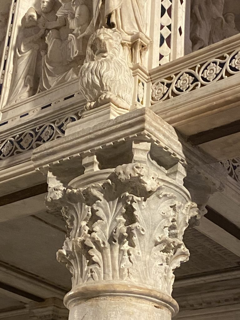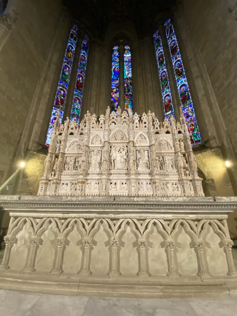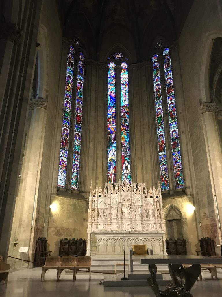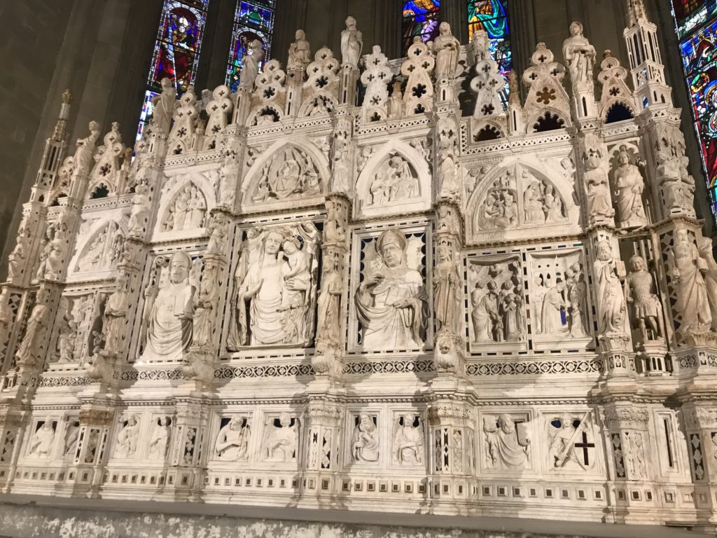 L’ Arca di San Donato, opera marmorea del 1362, realizzata in due fasi, in due momenti complementari. Per onorare il vescovo Donato, martire e patrono di Arezzo, l’urna è sorretta da 12 pilastri con guglie sommitali e pinnacoli gotici. Il marmo è materia viva, comunica, con il suo moto ascendente la forma e il prestigio della scultura gotica è affermato, verticale e austero. Colonne e losanghe lobate iscritte dentro archi cuspidali sorreggono l’altare. La Madonna con il braccio il Bambino è centrale nella struttura progettata su più livelli appunto dell’Arca. Nei riquadri le scene in altorilievo, d’ispirazione prima romana e poi romanica, rappresentano la vita leggendaria di San Donato: i miracoli, la quotidianità e gli incontri, le intercessioni per sconfiggere il male e poi il suo supplizio. Nelle nicchie cuspidali gli episodi del Vangelo, gli Arcangeli in un registro e gli apostoli scolpiti e allungati secondo il principio gotico, a difesa di tutto il blocco narrativo e compositivo di un nuovo linguaggio che vede l’altare protagonista. Alla realizzazione parteciparono diversi artisti senesi, fiorentini e aretini. Agostino di Giovanni e Agnolo di Ventura (prima metà del Trecento) nella fascia bassa. In quella superiore, un tempo dipinta a tempera sul marmo concorsero Giovanni di Francesco e Betto di Francesco. Marmi levigati quindi, inserti vitrei di un’opera raffinata tra arte e artigianato colto dove riecheggia la Bibbia e Mosè.