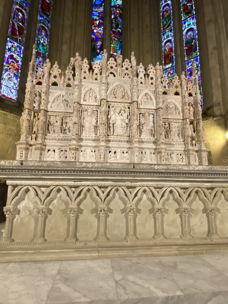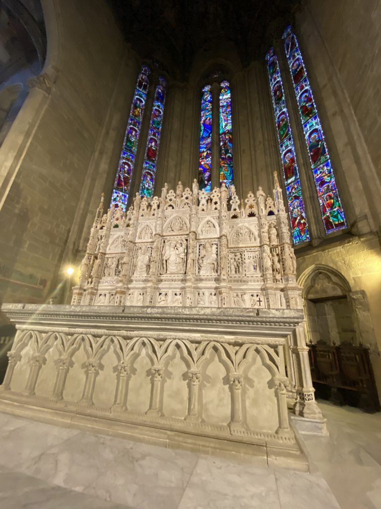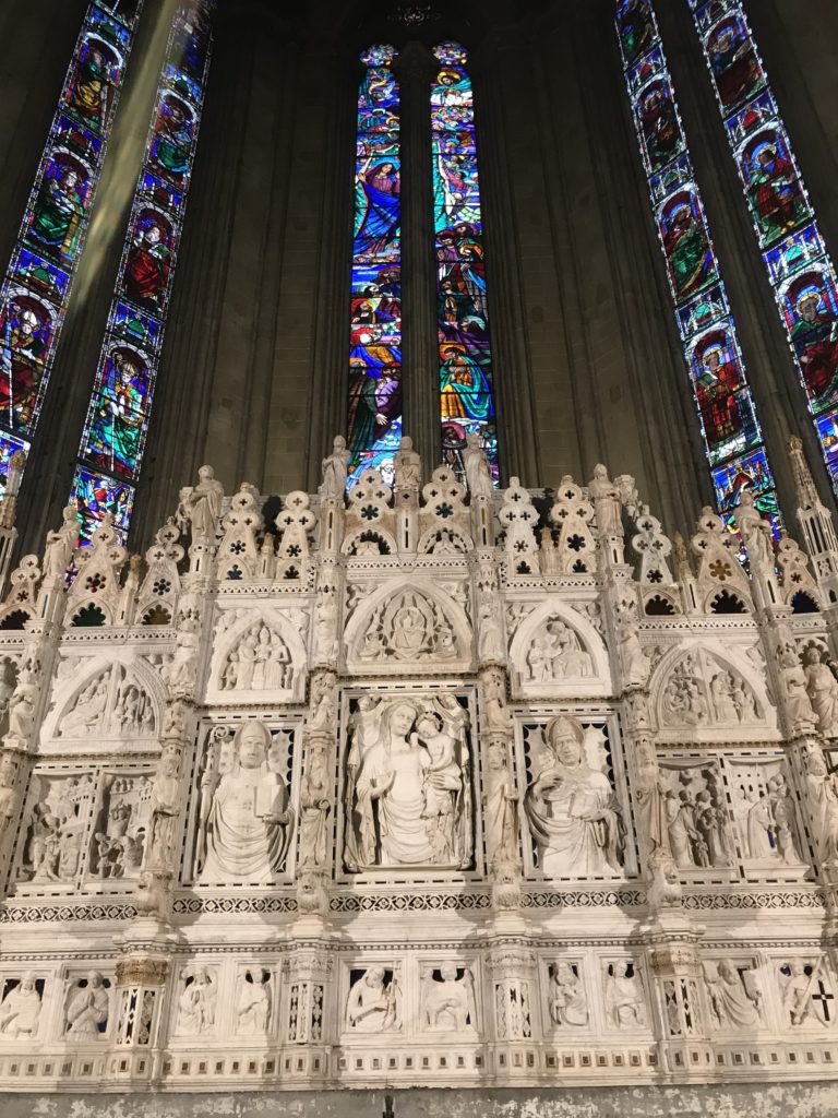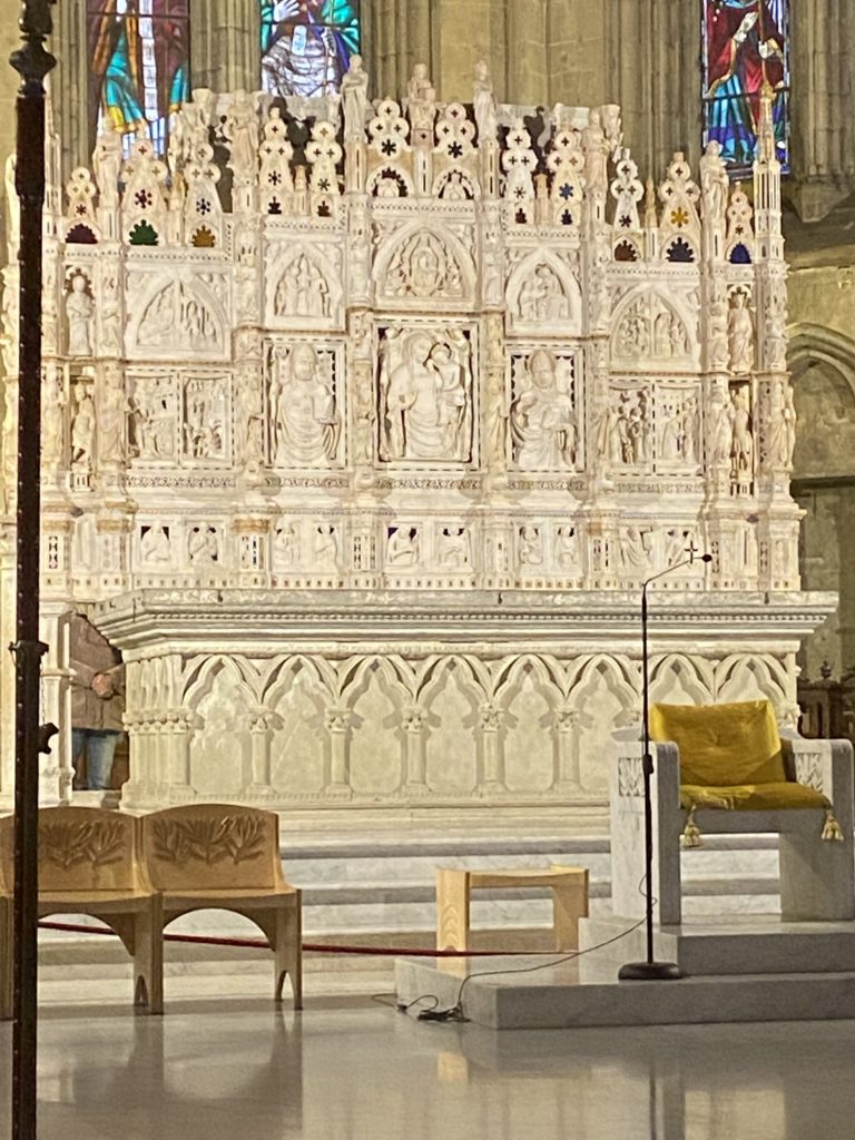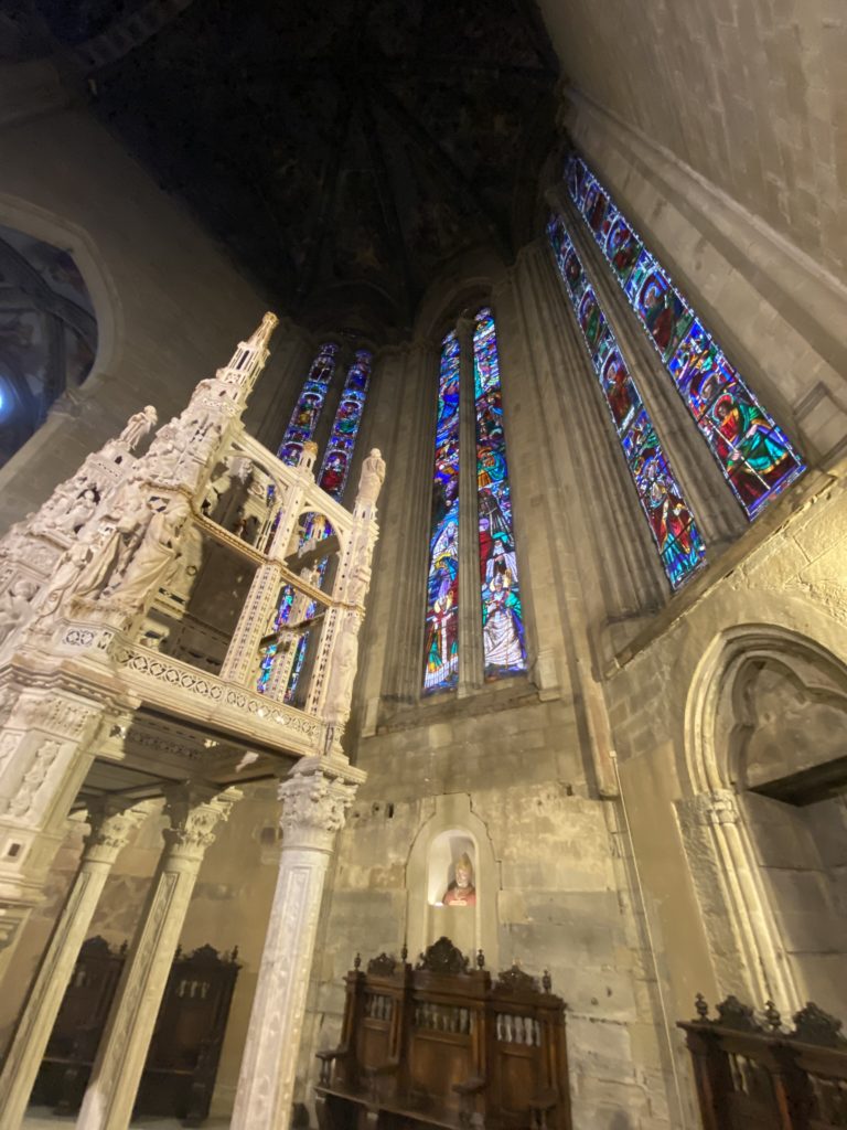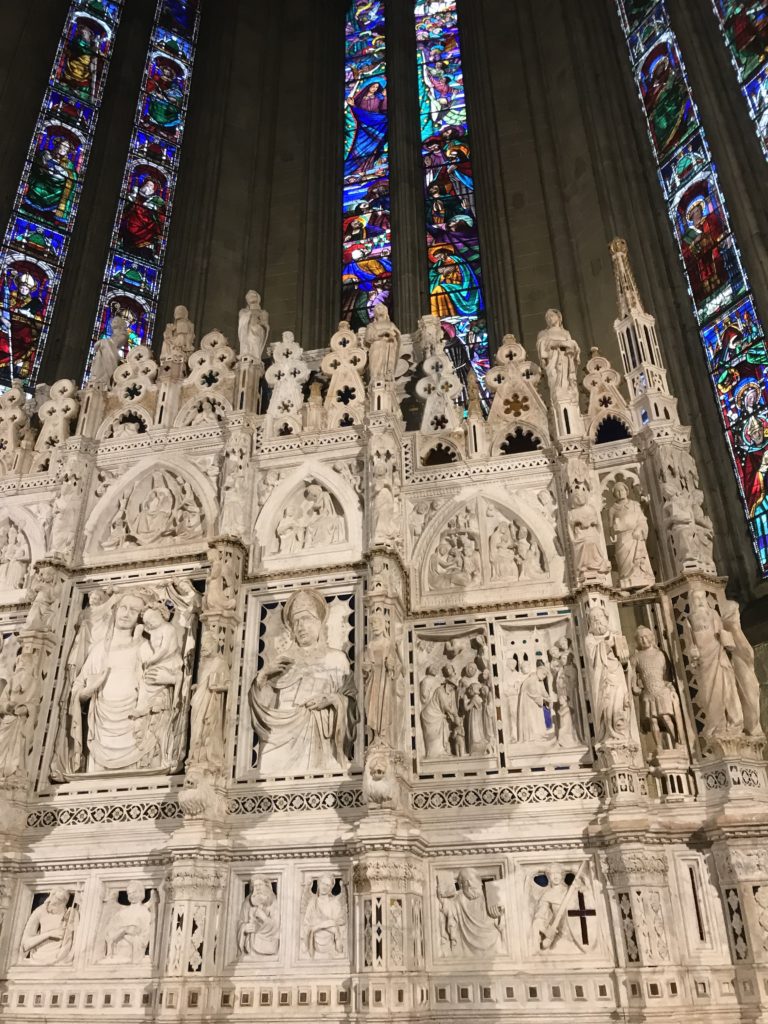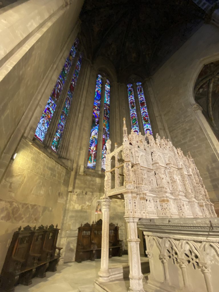 L’ Arca di San Donato, opera marmorea del 1362, realizzata in due fasi, in due momenti complementari. Per onorare il vescovo Donato, martire e patrono di Arezzo, l’urna è sorretta da 12 pilastri con guglie sommitali e pinnacoli gotici. Il marmo è materia viva, comunica, con il suo moto ascendente la forma e il prestigio della scultura gotica è affermato, verticale e austero. Colonne e losanghe lobate iscritte dentro archi cuspidali sorreggono l’altare. La Madonna con il braccio il Bambino è centrale nella struttura progettata su più livelli appunto dell’Arca. Nei riquadri le scene in altorilievo, d’ispirazione prima romana e poi romanica, rappresentano la vita leggendaria di San Donato: i miracoli, la quotidianità e gli incontri, le intercessioni per sconfiggere il male e poi il suo supplizio. Nelle nicchie cuspidali gli episodi del Vangelo, gli Arcangeli in un registro e gli apostoli scolpiti e allungati secondo il principio gotico, a difesa di tutto il blocco narrativo e compositivo di un nuovo linguaggio che vede l’altare protagonista. Alla realizzazione parteciparono diversi artisti senesi, fiorentini e aretini. Agostino di Giovanni e Agnolo di Ventura (prima metà del Trecento) nella fascia bassa. In quella superiore, un tempo dipinta a tempera sul marmo concorsero Giovanni di Francesco e Betto di Francesco. Marmi levigati quindi, inserti vitrei di un’opera raffinata tra arte e artigianato colto dove riecheggia la Bibbia e Mosè.