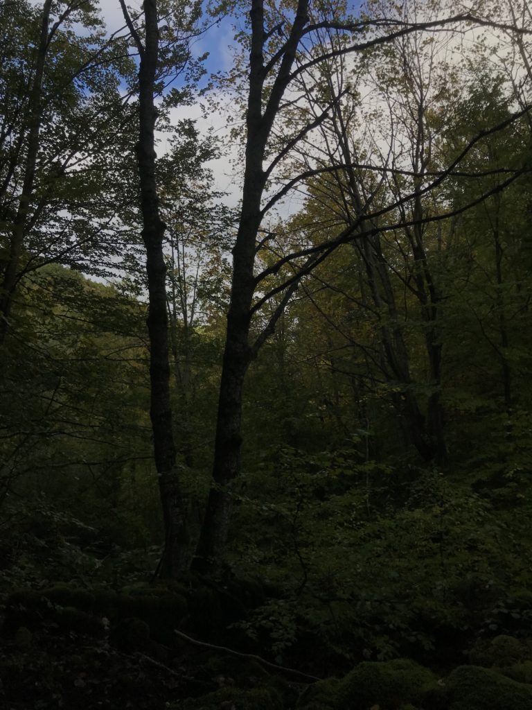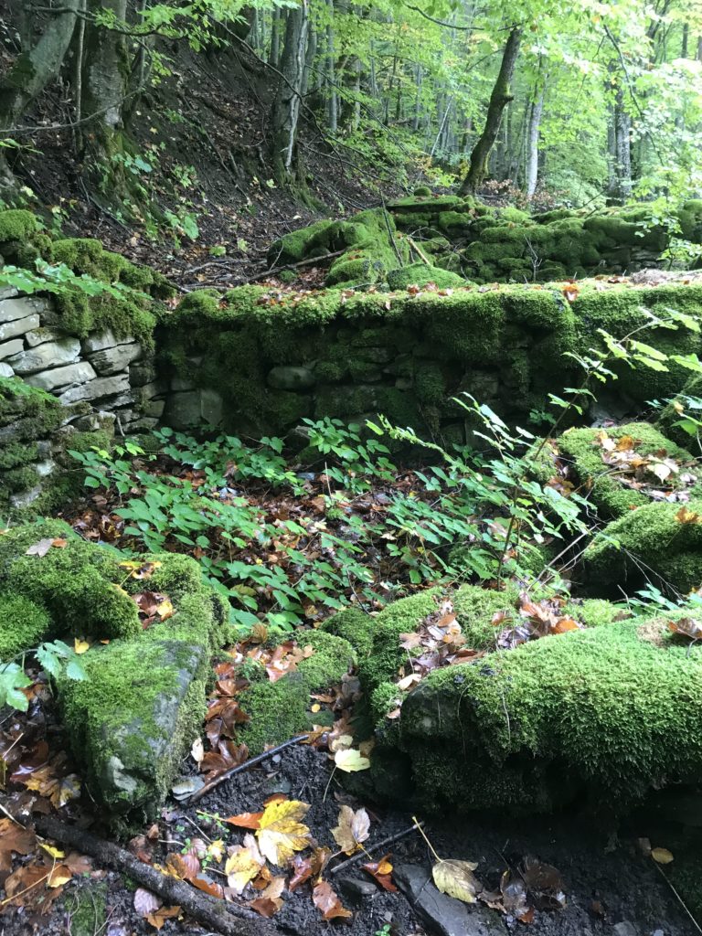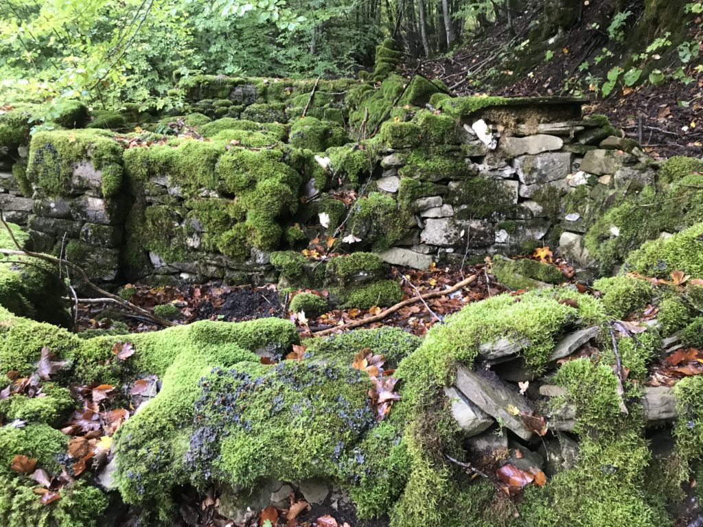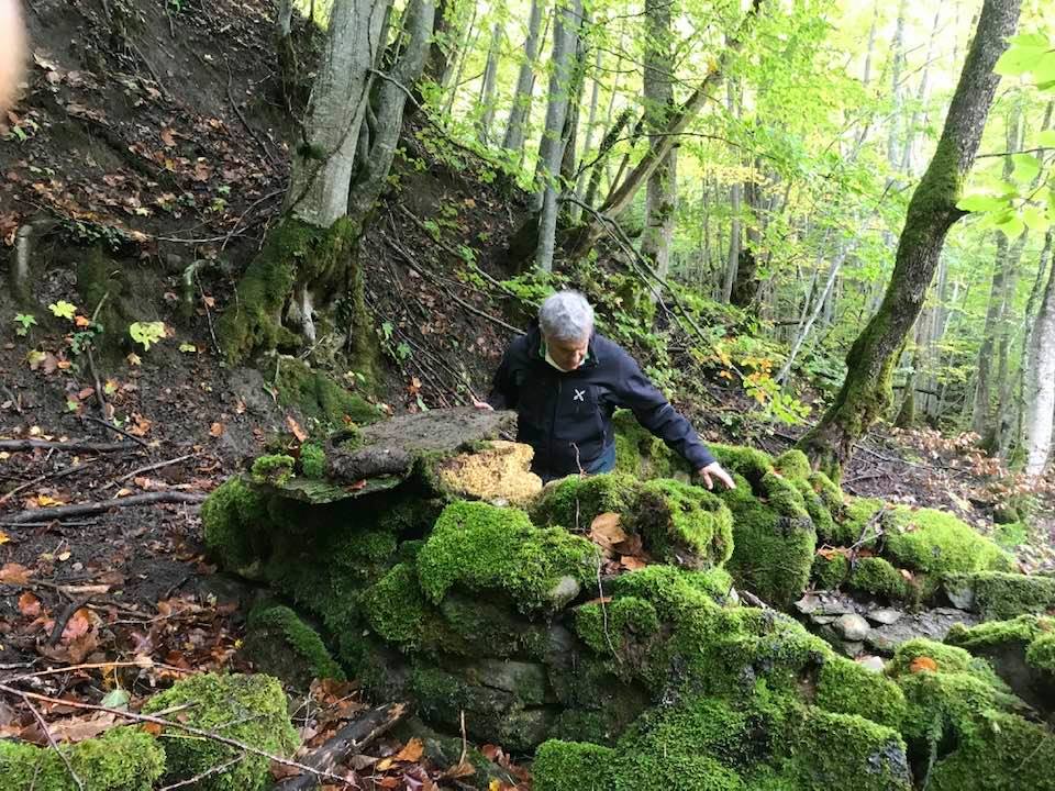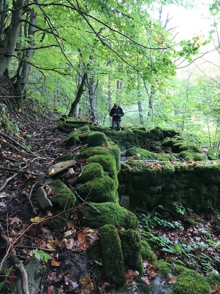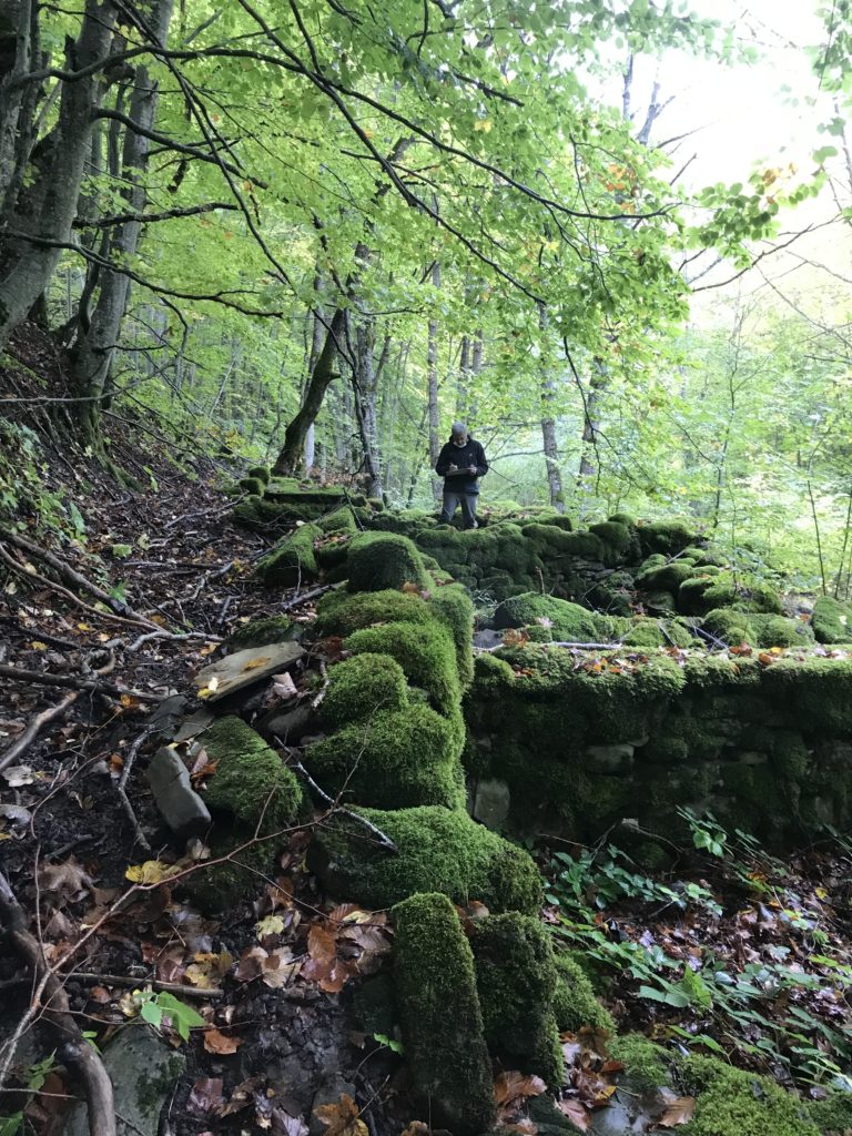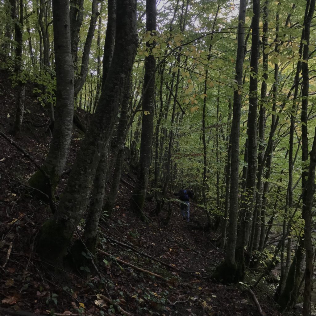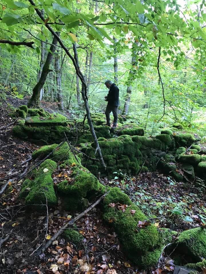 Per trovare il villaggio degli arcari, le tracce di un antico mestiere di nicchia estinto e rituale del Gran Sasso, bisogna forse varcare la “porta” del bosco (spazio archetipo di miti e fiabe, nella letteratura romanza i cavalier vi si addentrano per superare le prove e ritrovare se stessi), entrare quindi in una dimensione visionaria e irreale della vegetazione nel dominio degli alberi, che sovrasta, per la gamma cromatica dei colori che è inutile cercare in un catalogo. Il ruolo del bosco, ambiguo e misterioso come nella foresta del medioevo, in quella spirale di vegetazione bassa e avvolgente, un crocevia la macchia enigmatica dove abitano le leggende mai scritte, fino a giungere alle costruzioni in pietra a secco di arenaria, roccia sedimentaria: le capanne a secco. Tutt’intorno una foresta” tropicale” e con grandi foglie irreali, vegetazione fittissima, impenetrabile, il suolo umido e pluviale, impregnato d’acqua fino a sprofondare alle caviglie, banchi di roccia che si abbattono e scendono dalle pareti e tutt’intorno corsi d’acqua: un bioma per la massima biodiversità, e gli alberi di alto fusto che superano anche i 30 metri. Se non conosci l’odore del bosco, chi te lo potrà mai raccontare…