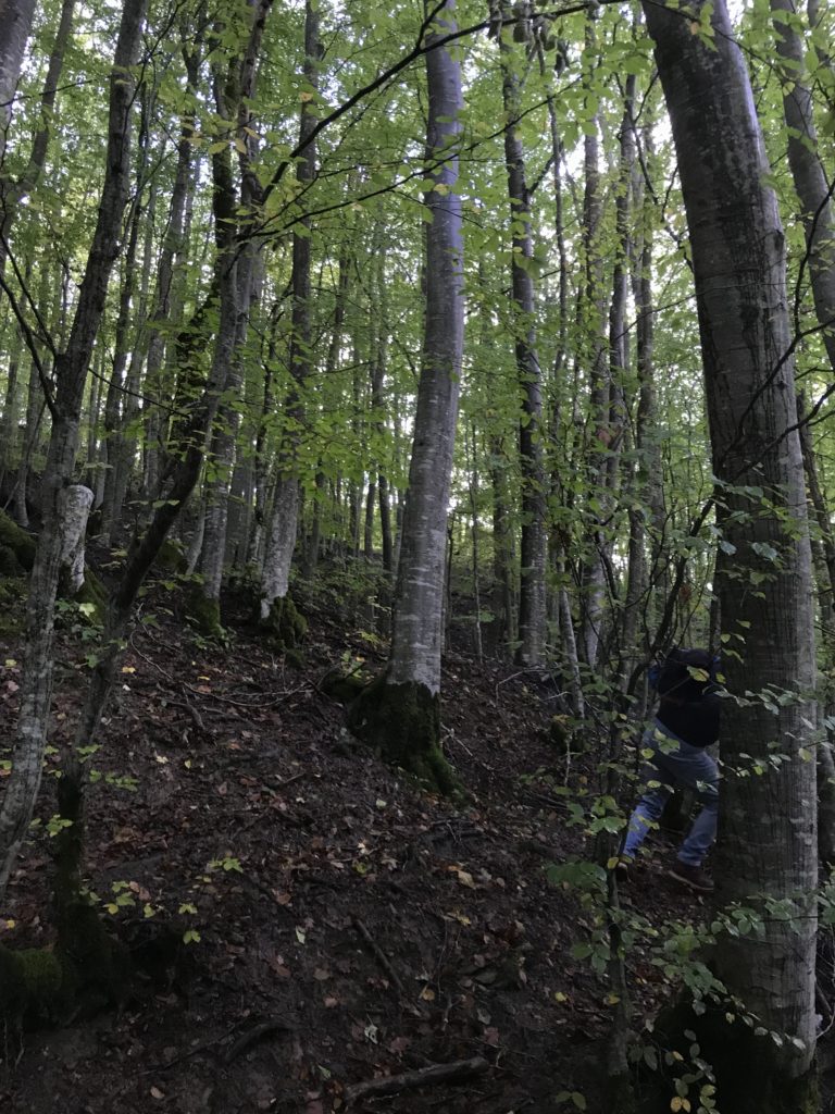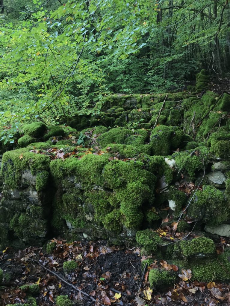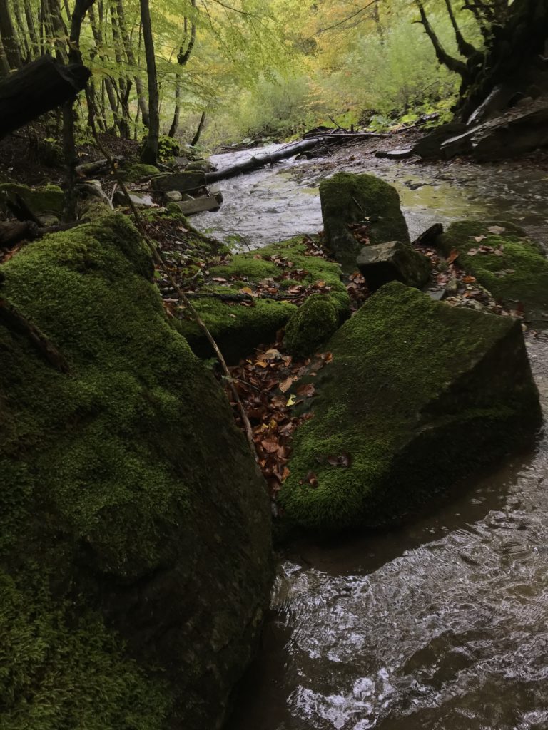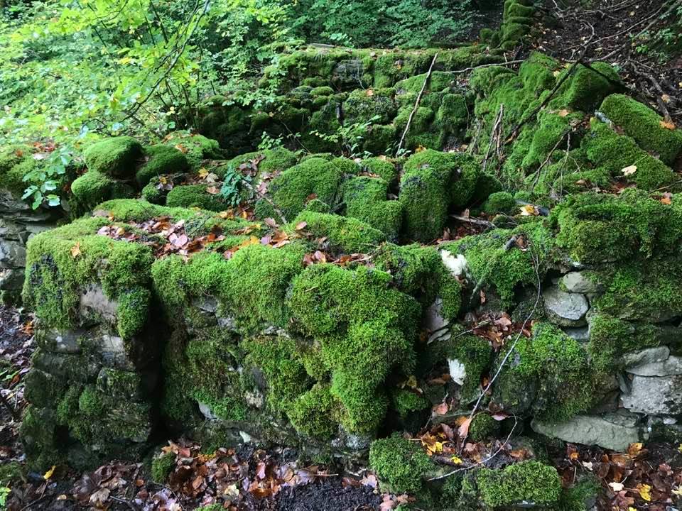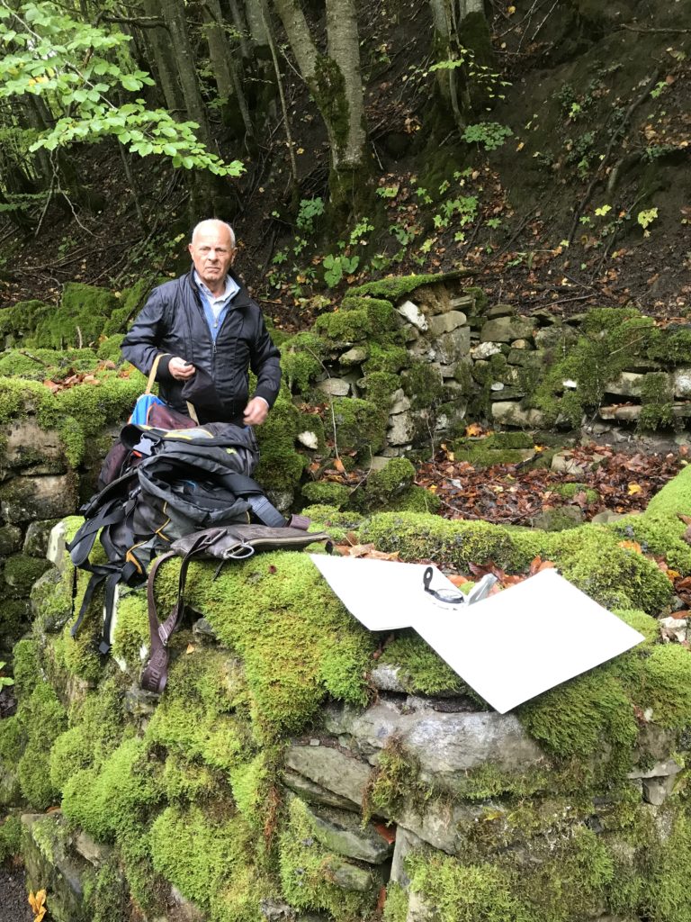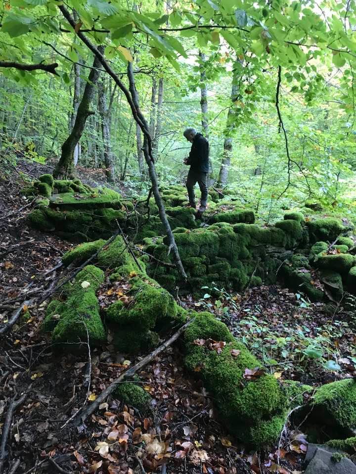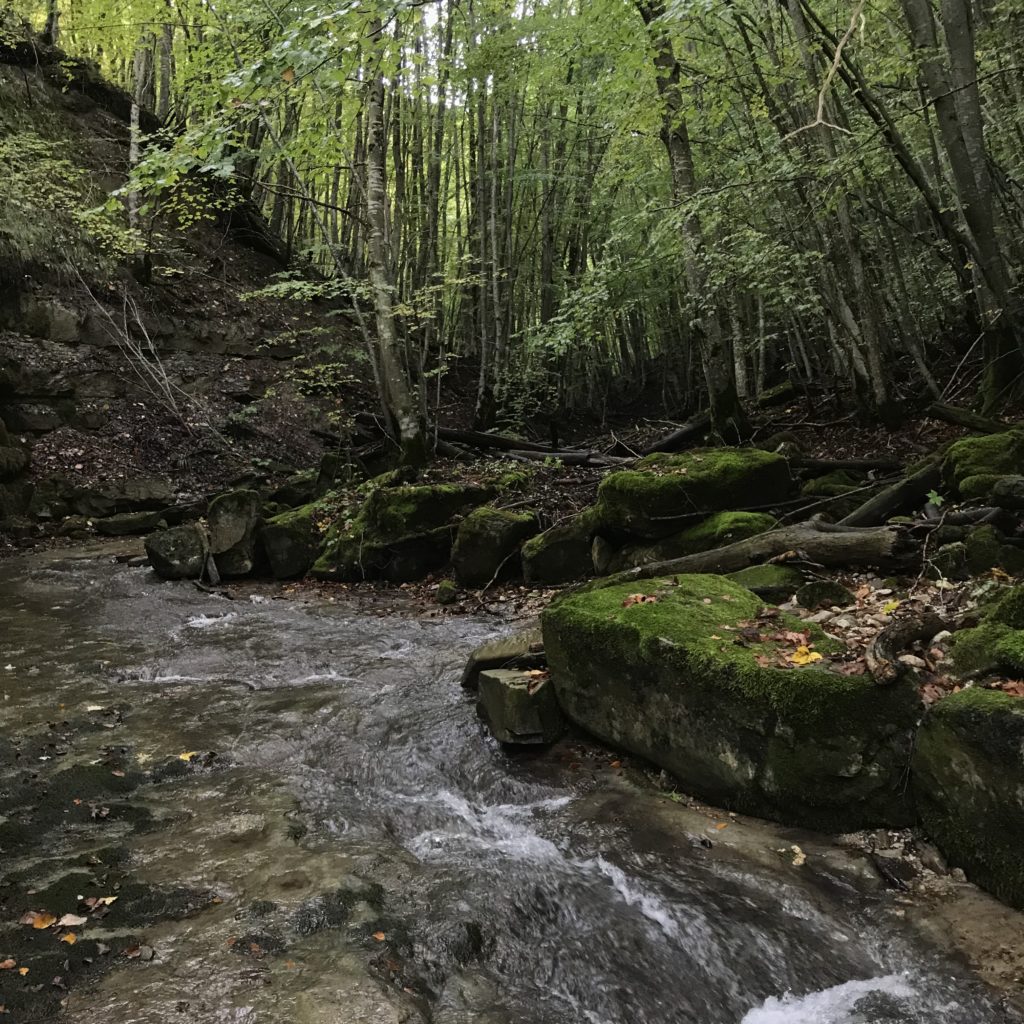 Per trovare il villaggio degli arcari, le tracce di un antico mestiere di nicchia estinto e rituale del Gran Sasso, bisogna forse varcare la “porta” del bosco (spazio archetipo di miti e fiabe, nella letteratura romanza i cavalier vi si addentrano per superare le prove e ritrovare se stessi), entrare quindi in una dimensione visionaria e irreale della vegetazione nel dominio degli alberi, che sovrasta, per la gamma cromatica dei colori che è inutile cercare in un catalogo. Il ruolo del bosco, ambiguo e misterioso come nella foresta del medioevo, in quella spirale di vegetazione bassa e avvolgente, un crocevia la macchia enigmatica dove abitano le leggende mai scritte, fino a giungere alle costruzioni in pietra a secco di arenaria, roccia sedimentaria: le capanne a secco. Tutt’intorno una foresta” tropicale” e con grandi foglie irreali, vegetazione fittissima, impenetrabile, il suolo umido e pluviale, impregnato d’acqua fino a sprofondare alle caviglie, banchi di roccia che si abbattono e scendono dalle pareti e tutt’intorno corsi d’acqua: un bioma per la massima biodiversità, e gli alberi di alto fusto che superano anche i 30 metri. Se non conosci l’odore del bosco, chi te lo potrà mai raccontare…