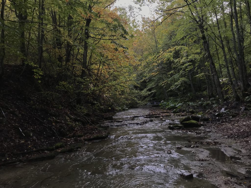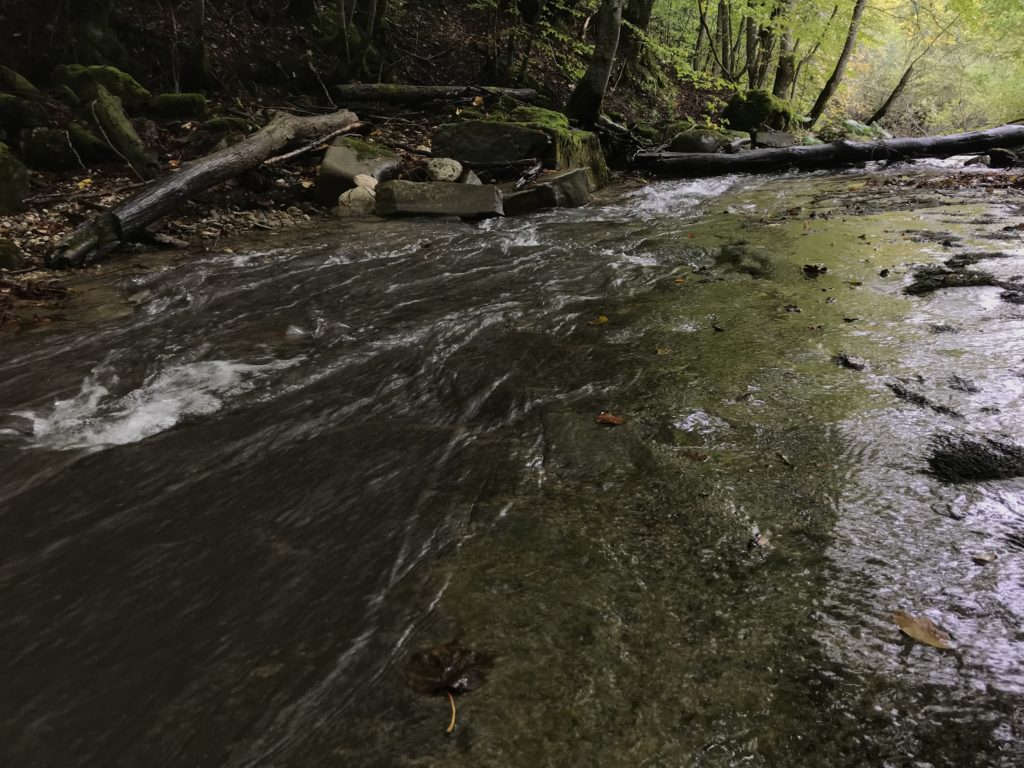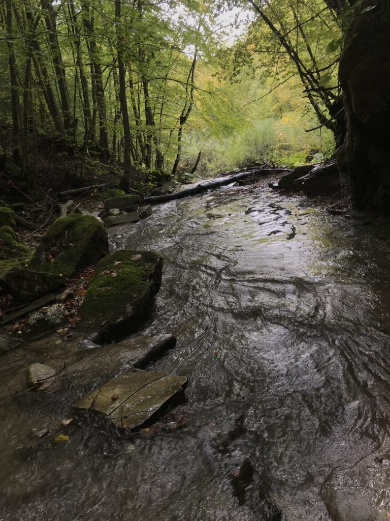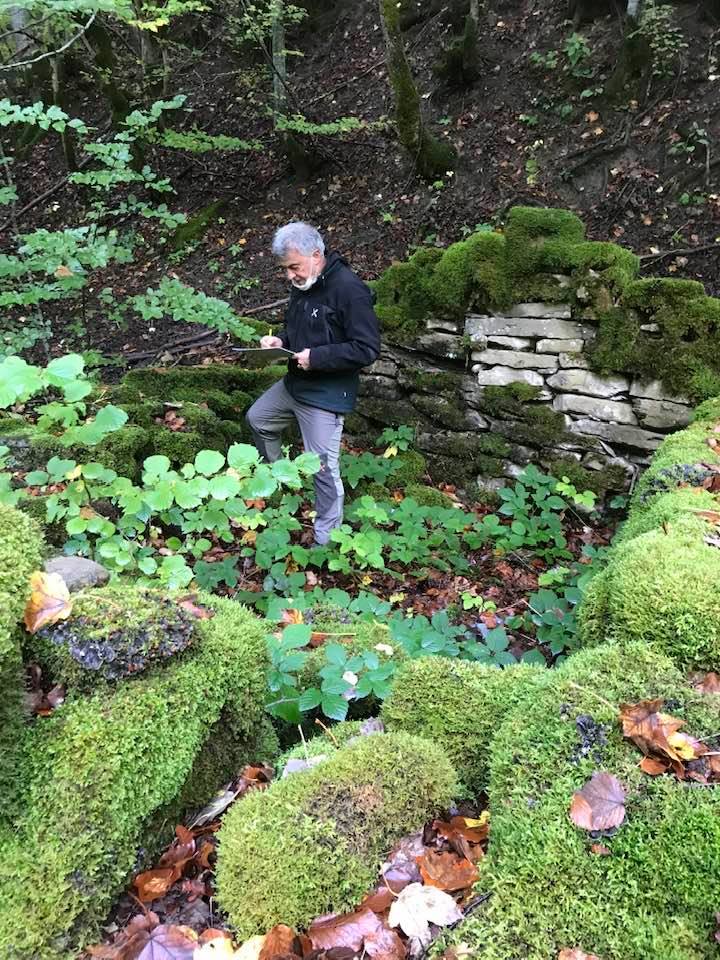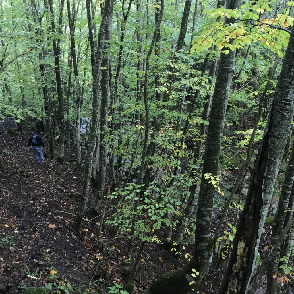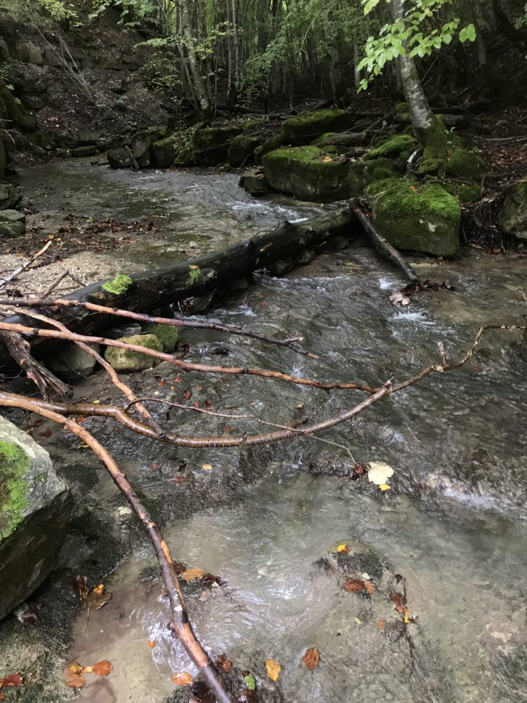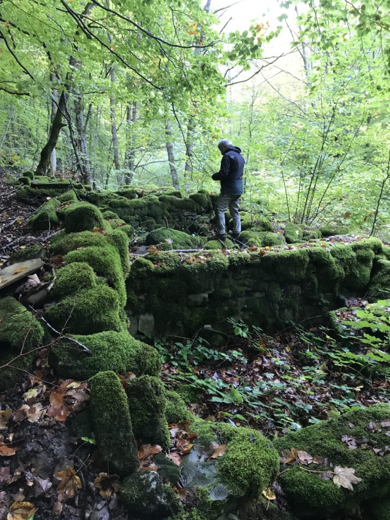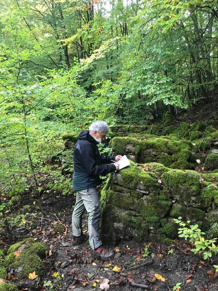 Per trovare il villaggio degli arcari, le tracce di un antico mestiere di nicchia estinto e rituale del Gran Sasso, bisogna forse varcare la “porta” del bosco (spazio archetipo di miti e fiabe, nella letteratura romanza i cavalier vi si addentrano per superare le prove e ritrovare se stessi), entrare quindi in una dimensione visionaria e irreale della vegetazione nel dominio degli alberi, che sovrasta, per la gamma cromatica dei colori che è inutile cercare in un catalogo. Il ruolo del bosco, ambiguo e misterioso come nella foresta del medioevo, in quella spirale di vegetazione bassa e avvolgente, un crocevia la macchia enigmatica dove abitano le leggende mai scritte, fino a giungere alle costruzioni in pietra a secco di arenaria, roccia sedimentaria: le capanne a secco. Tutt’intorno una foresta” tropicale” e con grandi foglie irreali, vegetazione fittissima, impenetrabile, il suolo umido e pluviale, impregnato d’acqua fino a sprofondare alle caviglie, banchi di roccia che si abbattono e scendono dalle pareti e tutt’intorno corsi d’acqua: un bioma per la massima biodiversità, e gli alberi di alto fusto che superano anche i 30 metri. Se non conosci l’odore del bosco, chi te lo potrà mai raccontare…