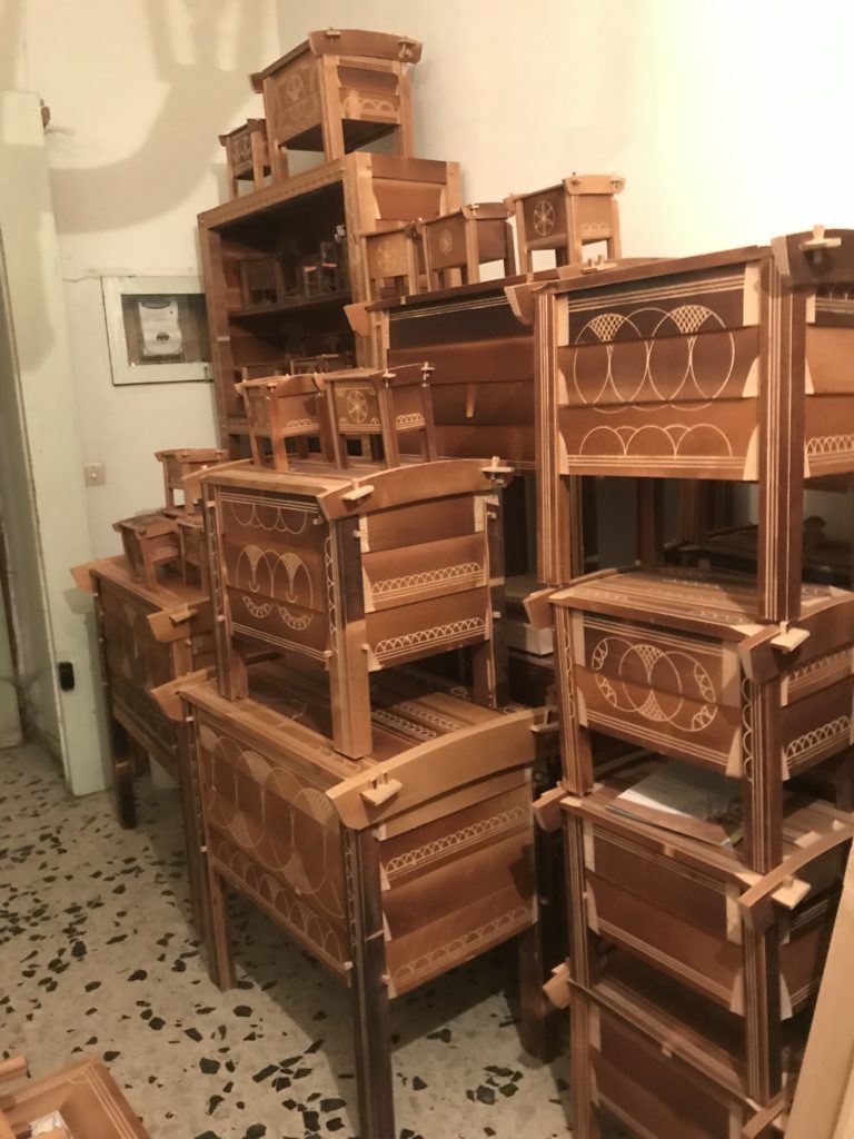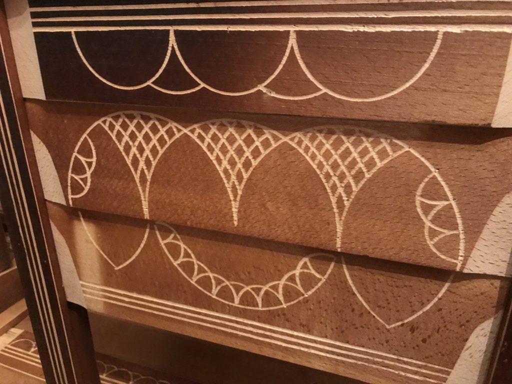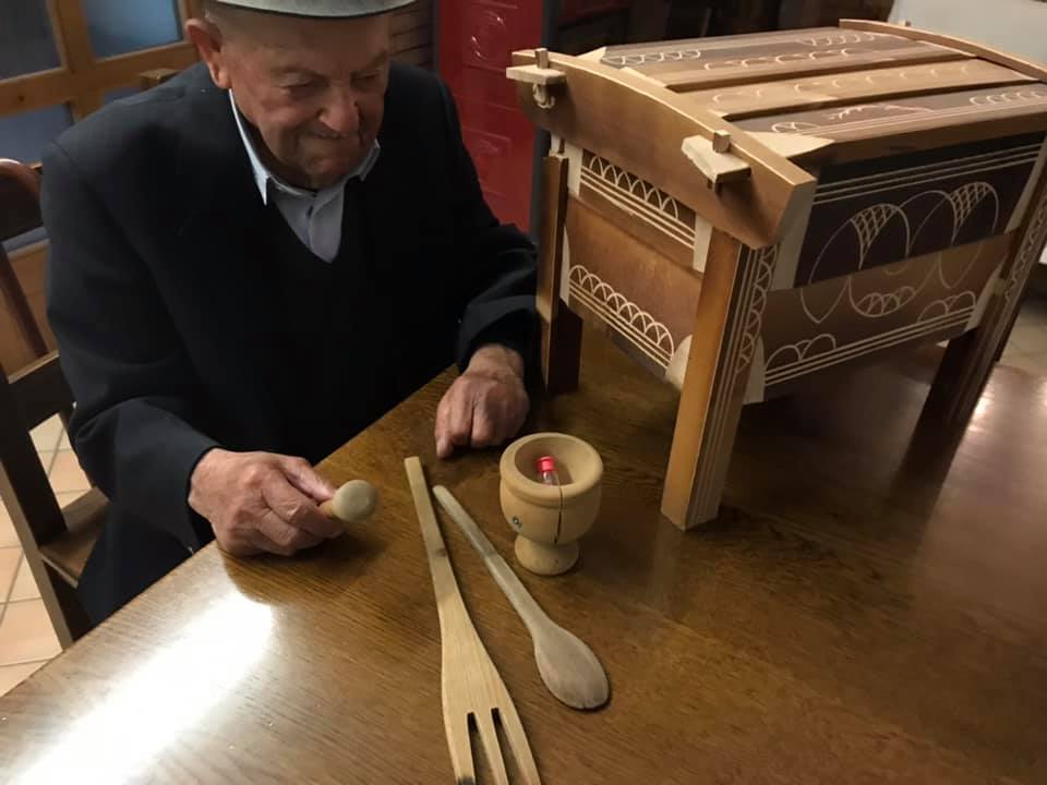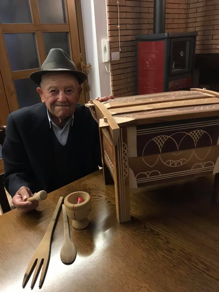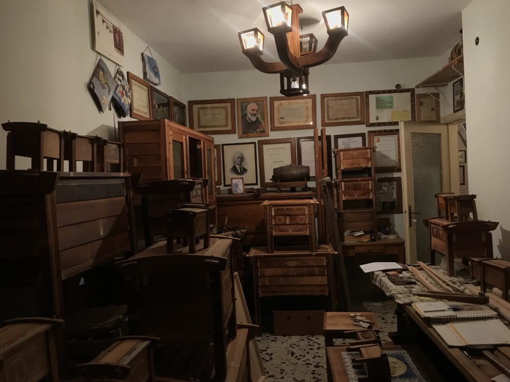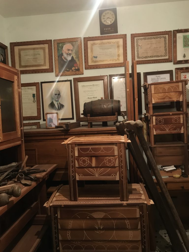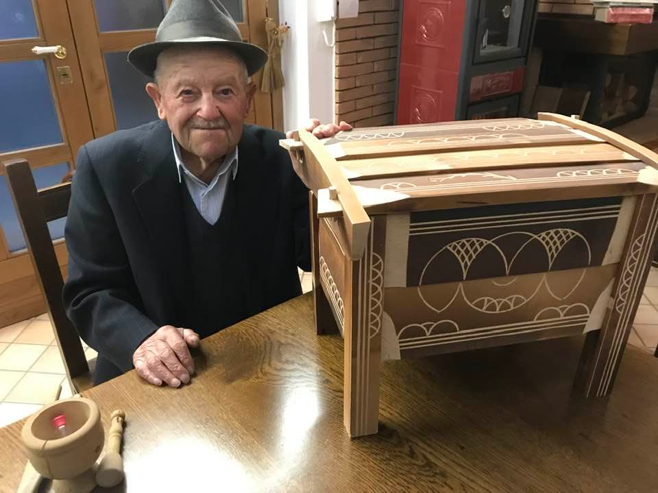 All’alba uscivano dalle capanne per trovare i faggi migliori, alti. Si sondavano con il “tasto” alla corteccia, toglievano un tassello al tronco. Per vedere poi se aveva gli “striscetti” lunghi ed erano buoni, viceversa con gli “striscetti” corti si passava ad altra pianta. Gli “striscetti” lunghi. Con l’accetta si tagliava la corteccia e la lacrima del faggio scendeva, dritta, sul fusto della pianta di faggio: un indicatore per l’umidità della pianta. Era utilizzabile. Due persone, poi, tagliavano il tronco di 60 centimetri di spessore, alto sette, otto metri. Il tronco cadeva, e con il segaccio si tagliava a pezzi, a misura, in quattro parti: per le arche, le sedie, le travi, i telai della tessitura, le pale del mulino ad acqua. I pezzi più piccoli rimanenti per le posate, cucchiai, forchette, porta sale, mortale. Un tronco così stimato poteva produrre una quantità di tavole che sempre nel bosco venivano tagliate da due persone con il segaccio. Infine si portavano con i muli all’imposta di Ortolano, e con il carretto ad Arischia e lì si lavoravano le arche che non avevano chiodi se non di legno. Le tavole incastrate tra loro formavano l’arca nei quattro lati, il coperchio, il piano di carico sul fondo del mobile e i piedi di sostegno del mobile. Si annerivano con il fuoco della segatura di faggio per far stagionare il legno. Una volta finite lì dentro andava il pane, la pasta (alcune arche avevano il piano in legno che si estraeva e si allungava per ammassare la pasta), ma anche la biancheria della dote, poiché ogni casa ne aveva due. Le arche si barattavano con i prodotti alimentari: grano, lenticchie, noci, mandorle, formaggi. Venivano siglate e incise sul coperchio, firmate con un segno identificativo dell’autore del manufatto: ogni generazione di arcari aveva un codice di riconoscimento tramandato, ed ancora oggi è possibile risalire all’autore e alla famiglia di appartenenza. L’ultima concessione delle arche era l’arte Naif, popolare, non accademica, da autodidatta: le incisioni decorative sul legno di faggio brunito dal fuoco: rosette aquilane stilizzate (presenti nelle chiavi d’imposta dei portoni o sugli architravi), le volute, intrecci e losanghe (d’ispirazione Romaniche), i decori con un compasso artigianale realizzati dagli stessi arcari. Una concessione estetica, questa, al mobile divenuto un reperto, oggi, “dell’Industria del bosco…”.