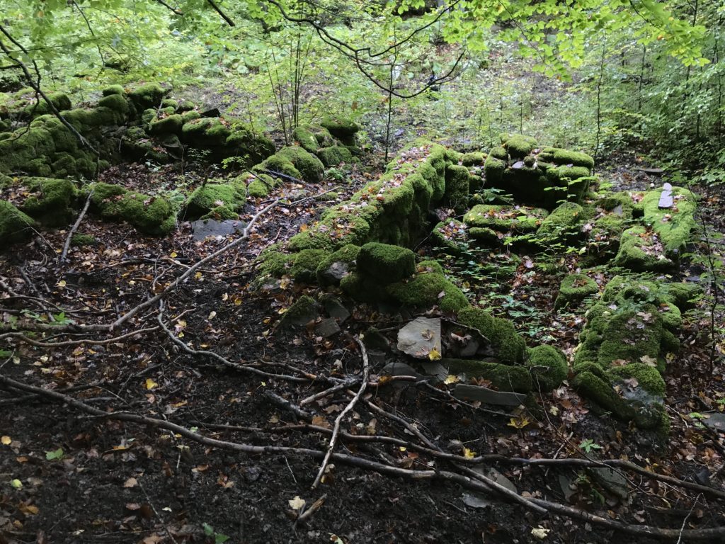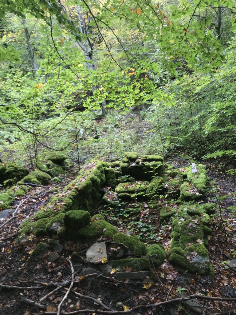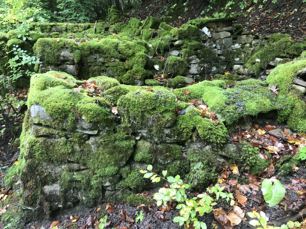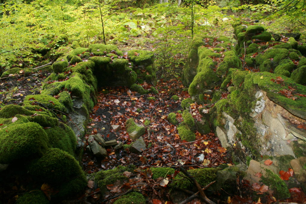 Nella località “Due fossi” si scende di quota, quindi le casette degli arcari appaiono quasi fosse un incantesimo, nella confluenza del torrente del Chiarino e torrente “Giardino” (accoglieva le acque dei rivoli di Pescine, Chiarinello, Acqua Rossa – risalivano le trote, deponevano le uova). Nella lingua di terra imprigionata e serrata dai due larghi corsi d’acqua che lì si congiungono, con salti e cascate d’acqua e le alte pareti di roccia di blocchi di arenaria che precipitano sopra i torrenti, tanto che l’acqua (si può bere) ha eroso e levigato la pietra del letto del fiume. Allineate tra loro come mattoncini Lego, avvolte e rivestite dalla vegetazione e dal muschio che le ha ricoperte quasi fossero un santuario Inca, le capanne in pietra si alzano dal suolo, costruite dai blocchi di pietra. Alle loro spalle una scarpata (sito appositamente scelto) si alza per proteggerle. Tre i nuclei insediativi, gli alloggi, in un perimetro rettangolare ciascuno di tre metri e mezzo per sei, rialzato per circa un metro, di enormi blocchi pietra arenaria (sedimento sabbioso) prelevati dalle falesie o dal suolo lì intorno. Gli ingressi sono rivolti al torrente (nord- ovest), hanno pietre squadrate, lavorate negli angoli. Un’altra casetta in pietra è isolata e defilata dalle tre: cucina e dispensa, la rimessa degli attrezzi per il taglio degli alberi. La parete di fondo della casetta è a gradoni per poggiare le travi di faggio che via via salgono e armano il tetto, la copertura – ci dice Capannolo – doveva avere un’altezza, uno spiovente, una pendenza calcolata e proporzionata per proteggersi dalla pioggia. Si usava la “scopiglia”, una ginestra alla sommità del tetto, lunghi filamenti di erba che scendevano e rivestivano la casa del bosco. Dentro la capanna due o tre “rapazzole”, letti in telai di legno rialzati, accoglievano cinque o sei persone. Nella radura delle casette i muli “impastoiati” per non farli allontanare.